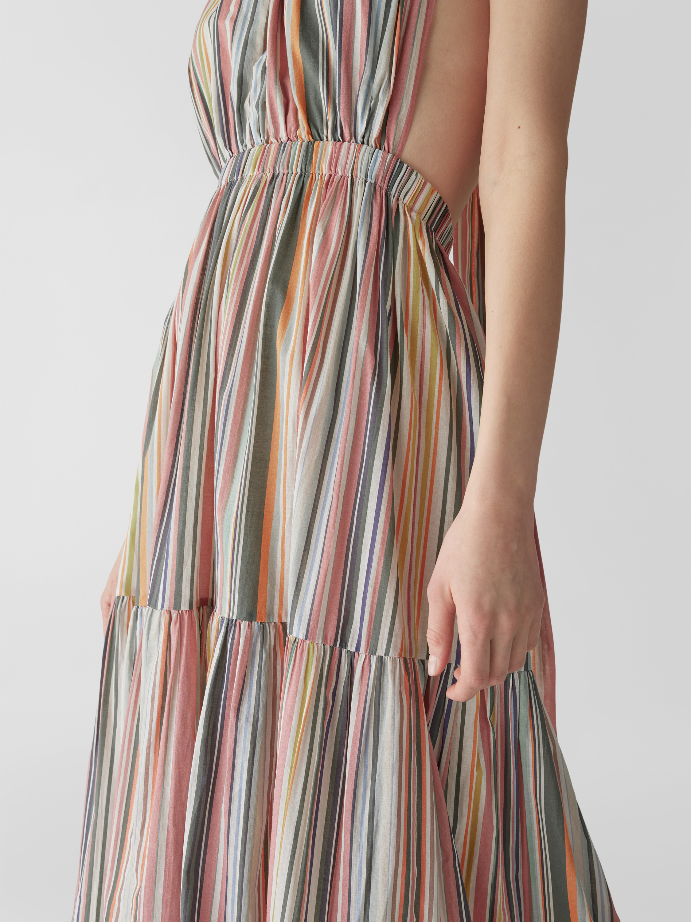 Das Maxikleid von Hannah Artwear aus reiner Baumwolle bringt durch das Streifenmuster und den Stufen-Look frische Akzente in den Alltag. Die taillierte Passform betont die Silhouette, während das ärmellose Design angenehme Bewegungsfreiheit ermöglicht. So lässt sich ein luftiger Stil unkompliziert umsetzen.
