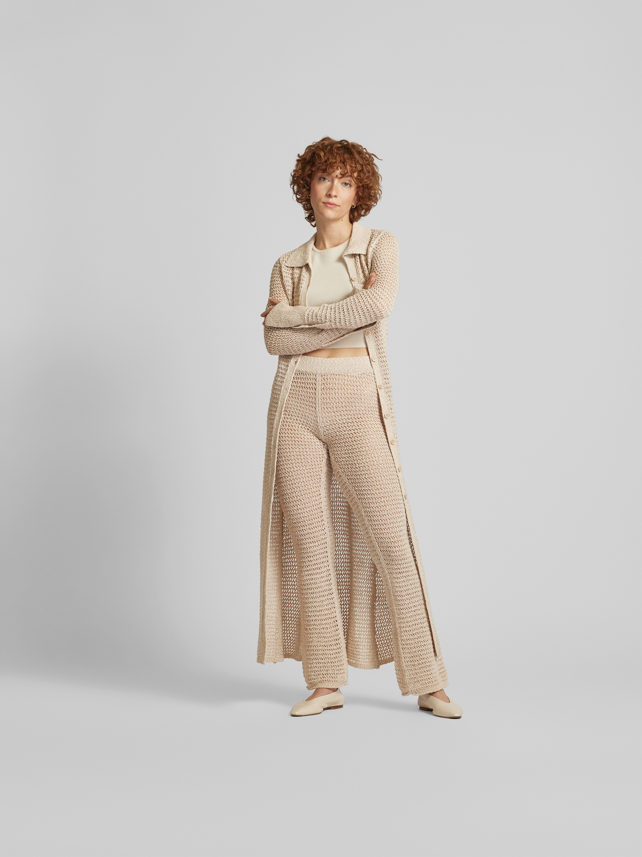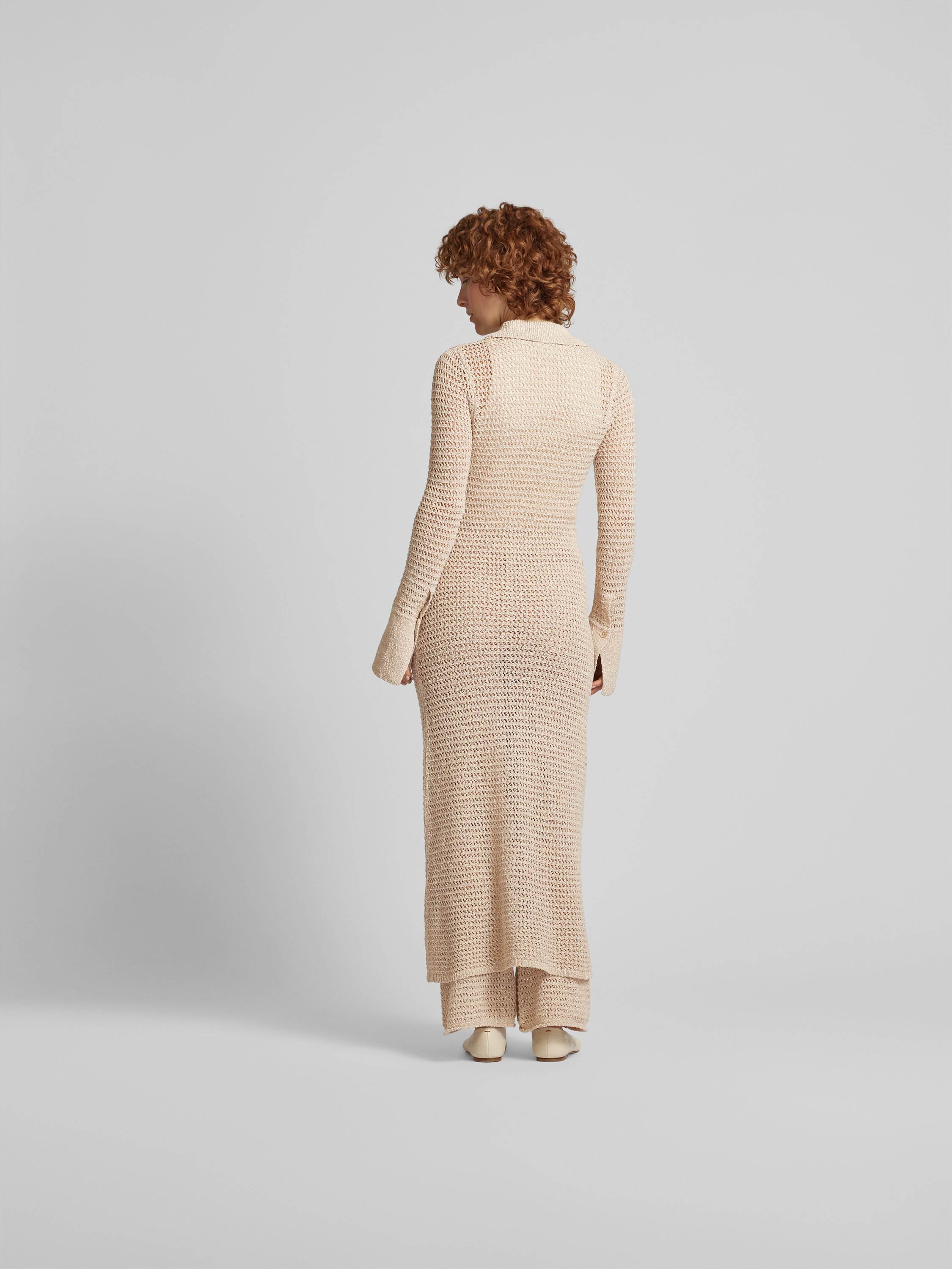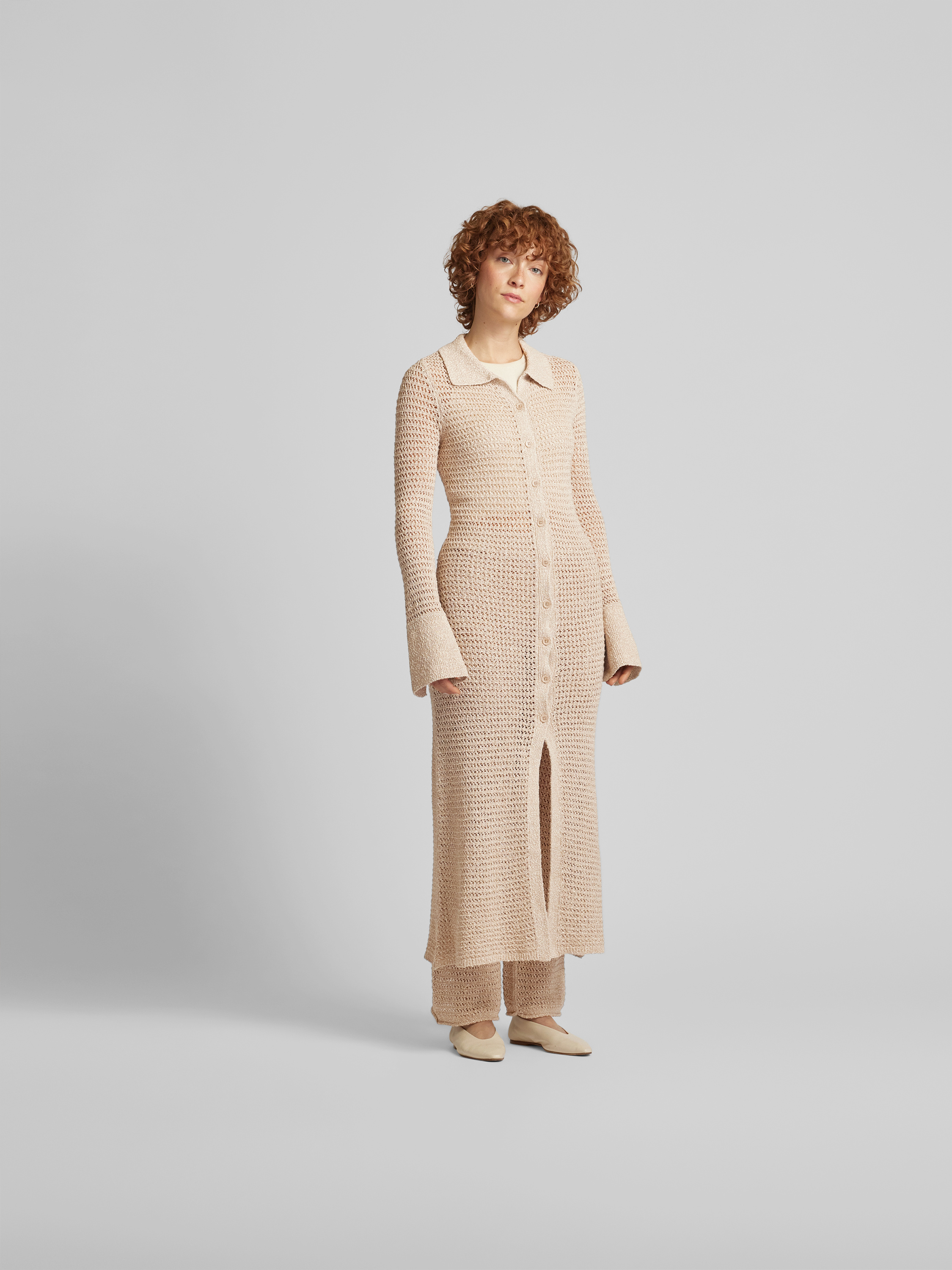 Das Maxikleid mit Knopfleiste von Holzweiler aus reiner Baumwolle legt sich angenehm an die Silhouette und bringt mit seiner Strick-Optik samt Lochmuster Abwechslung in den Alltag. Die langen Trompetenärmel verleihen dem Schnitt eine besondere Note. Durch die körpernahe Form entsteht ein harmonischer Gesamteindruck.