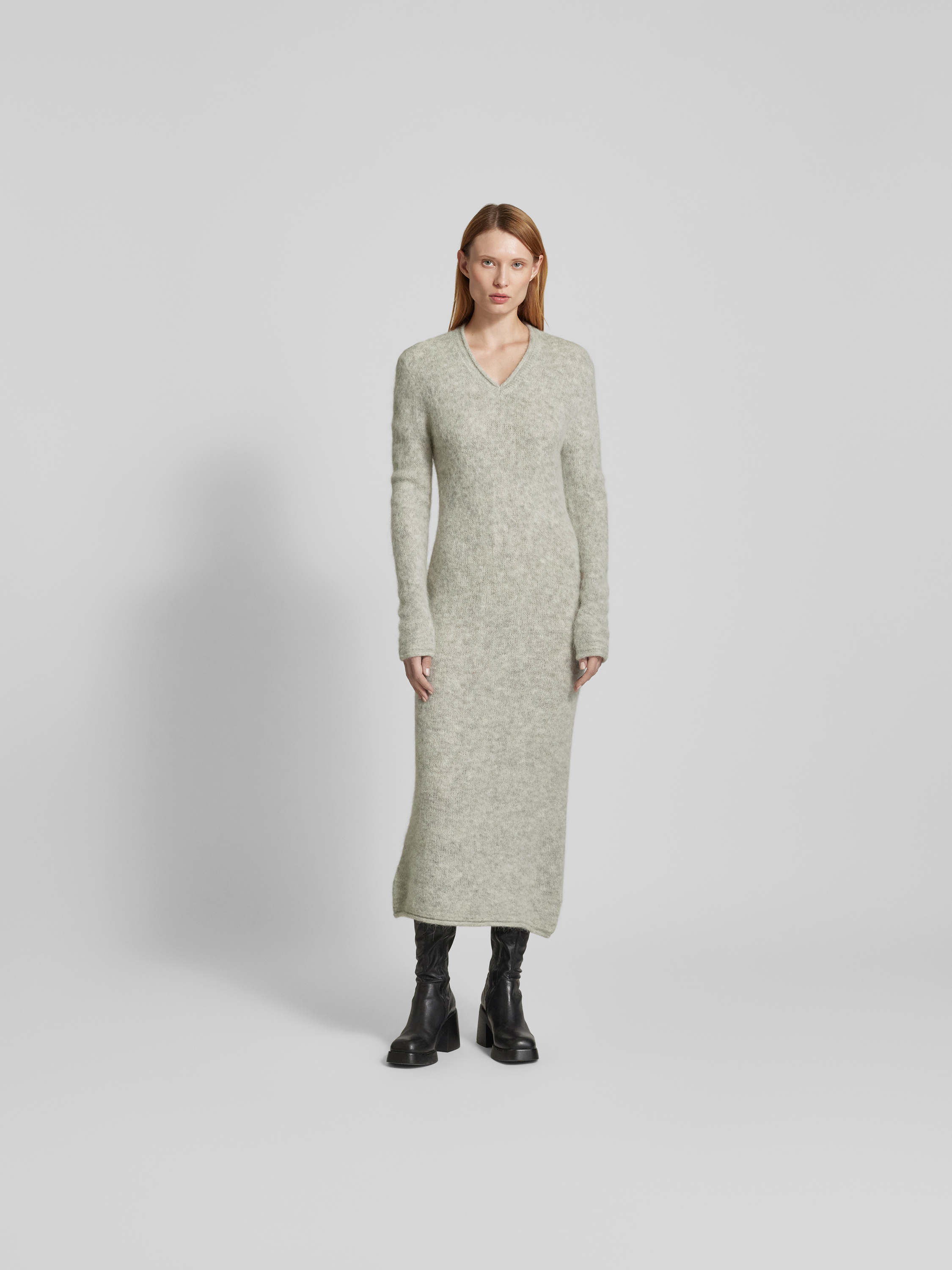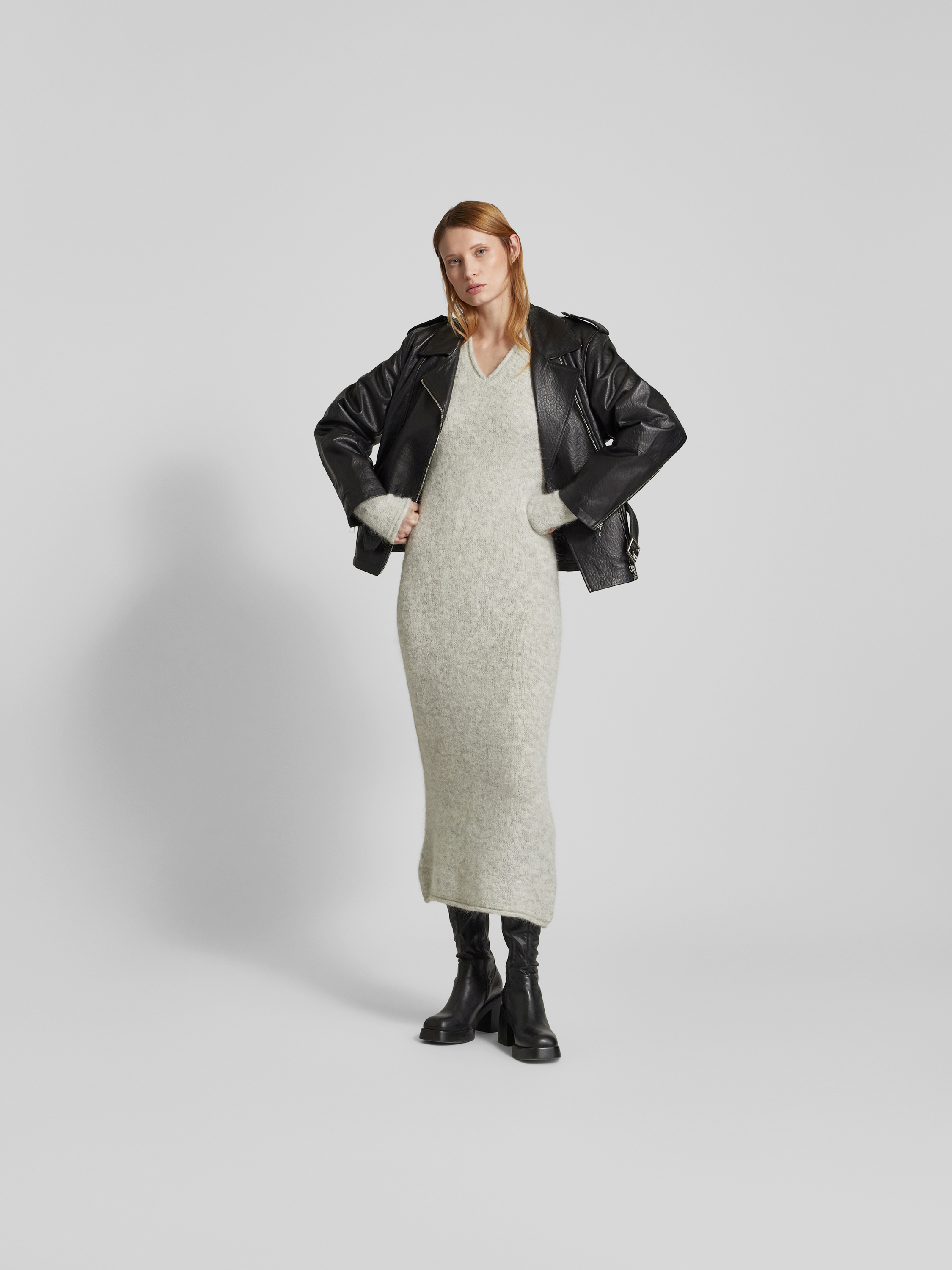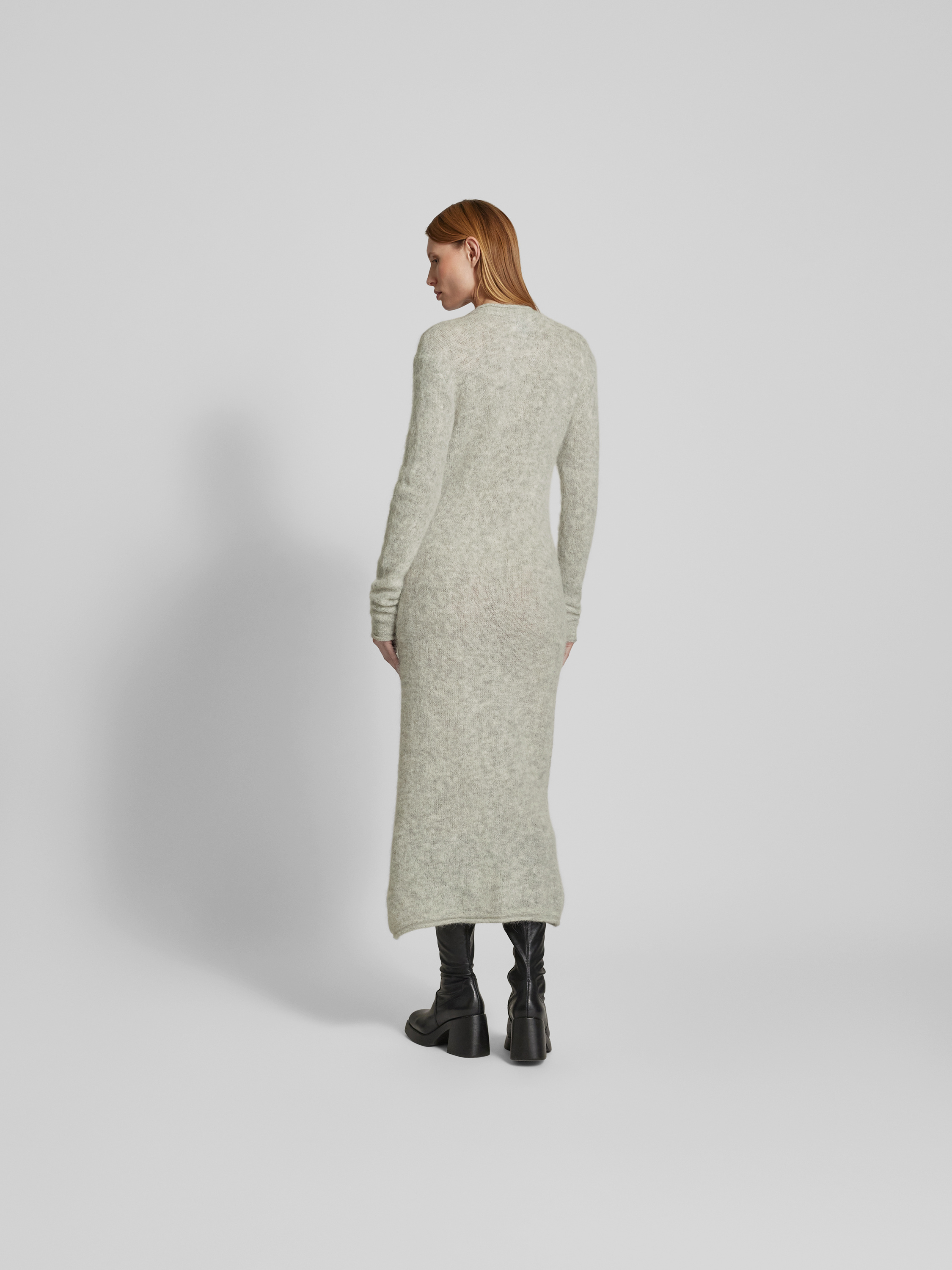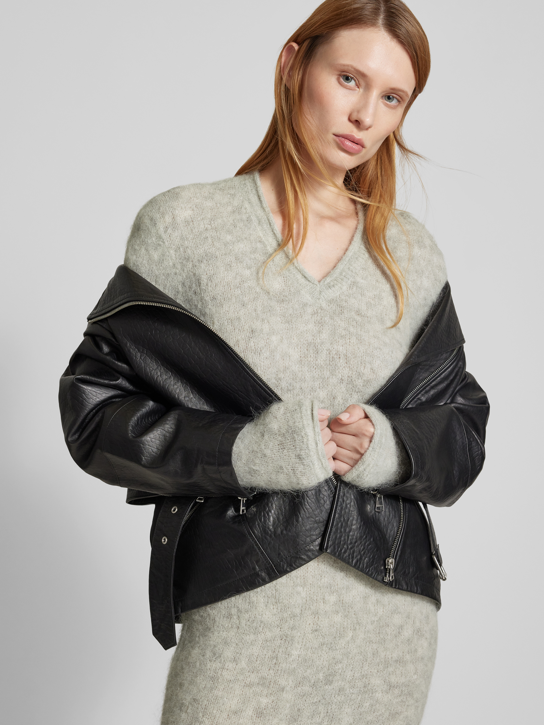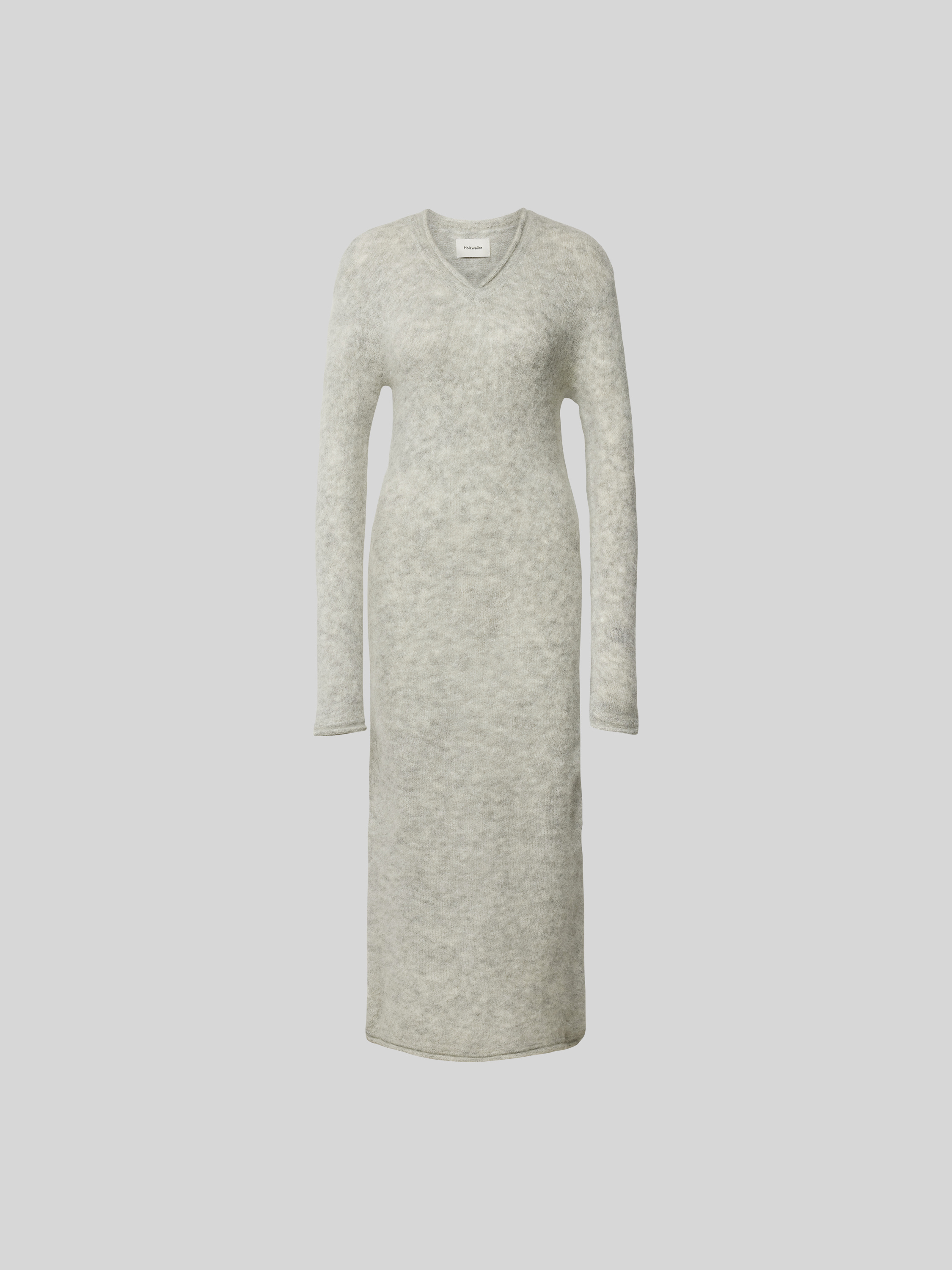 Das Strickkleid von Holzweiler zeichnet sich durch seinen taillierten Schnitt und den angenehmen Alpaka-Mix mit Stretch-Anteil aus, wodurch es geschmeidig am Körper anliegt. In Midilänge gehalten, wirkt es ebenso zurückhaltend wie vielseitig. Der V-Ausschnitt verleiht dem Modell eine dezente, moderne Note.