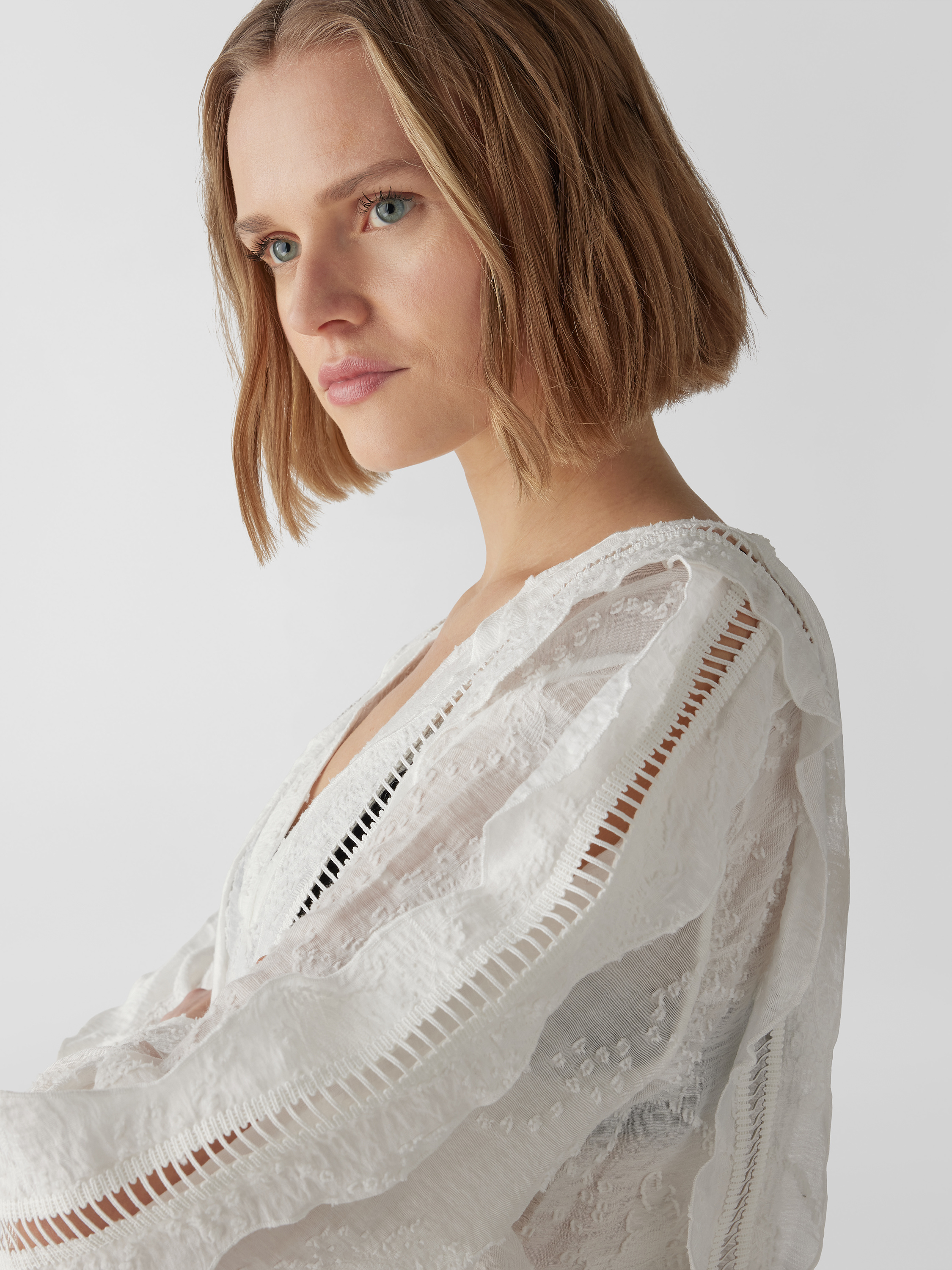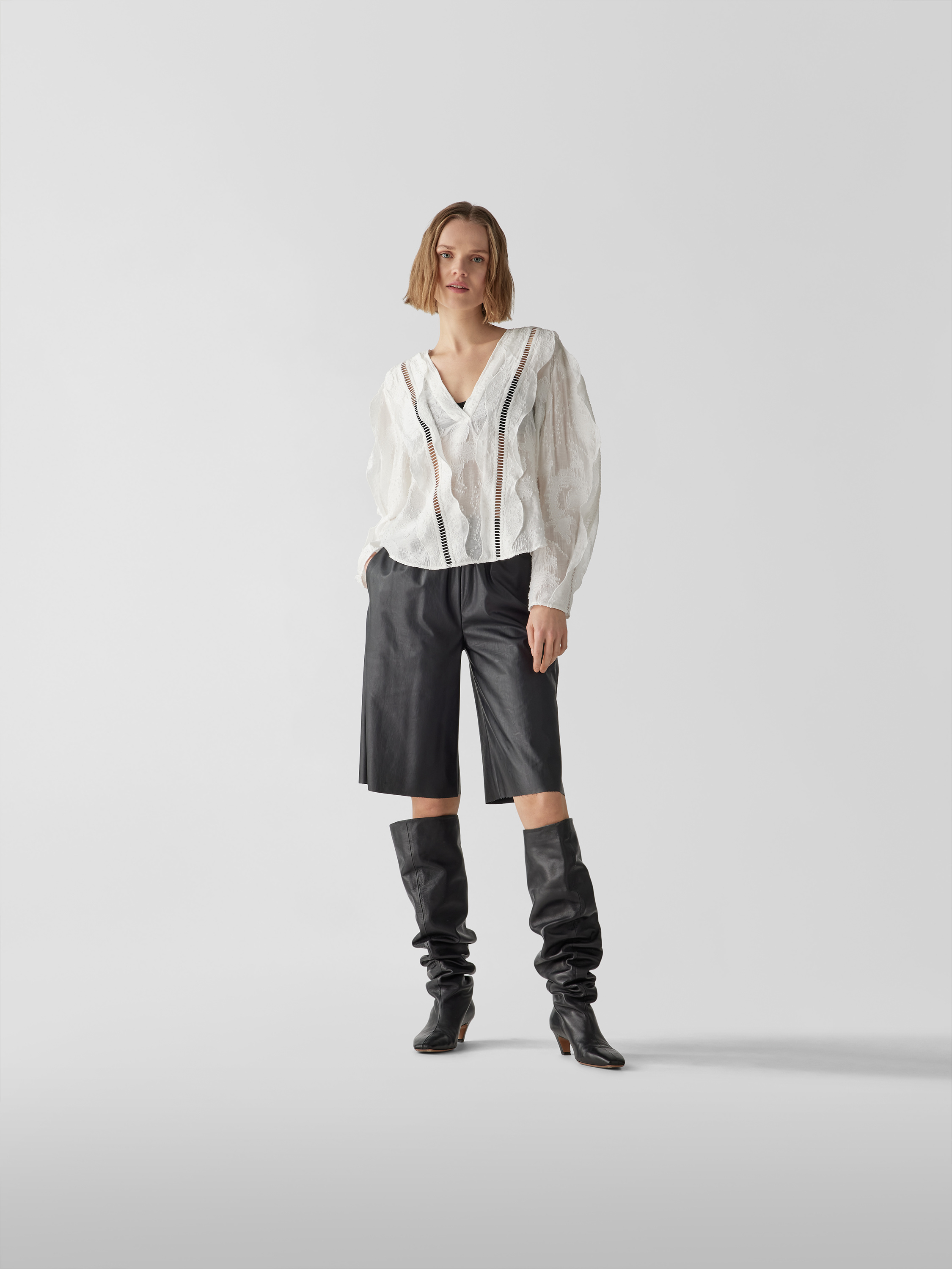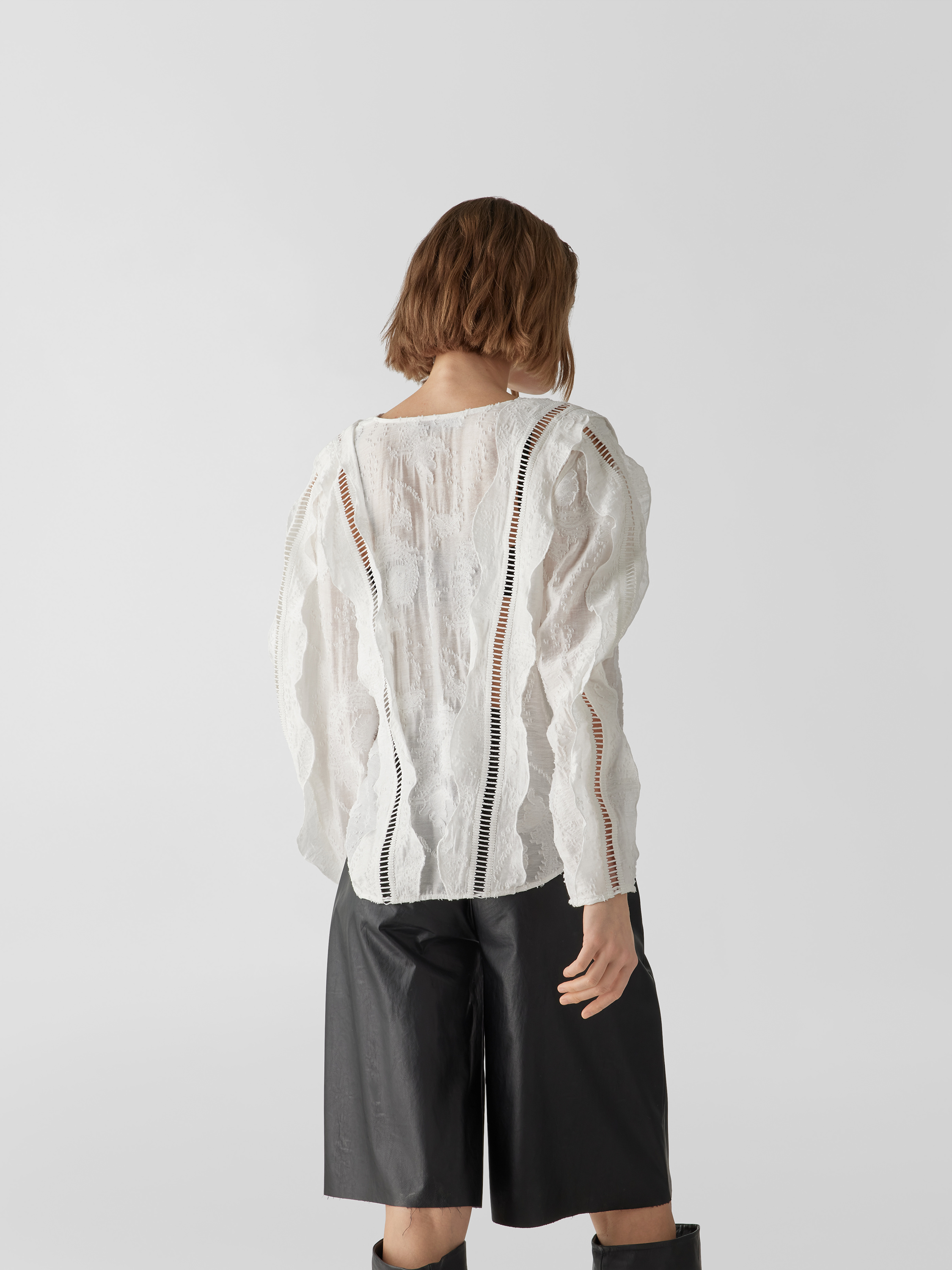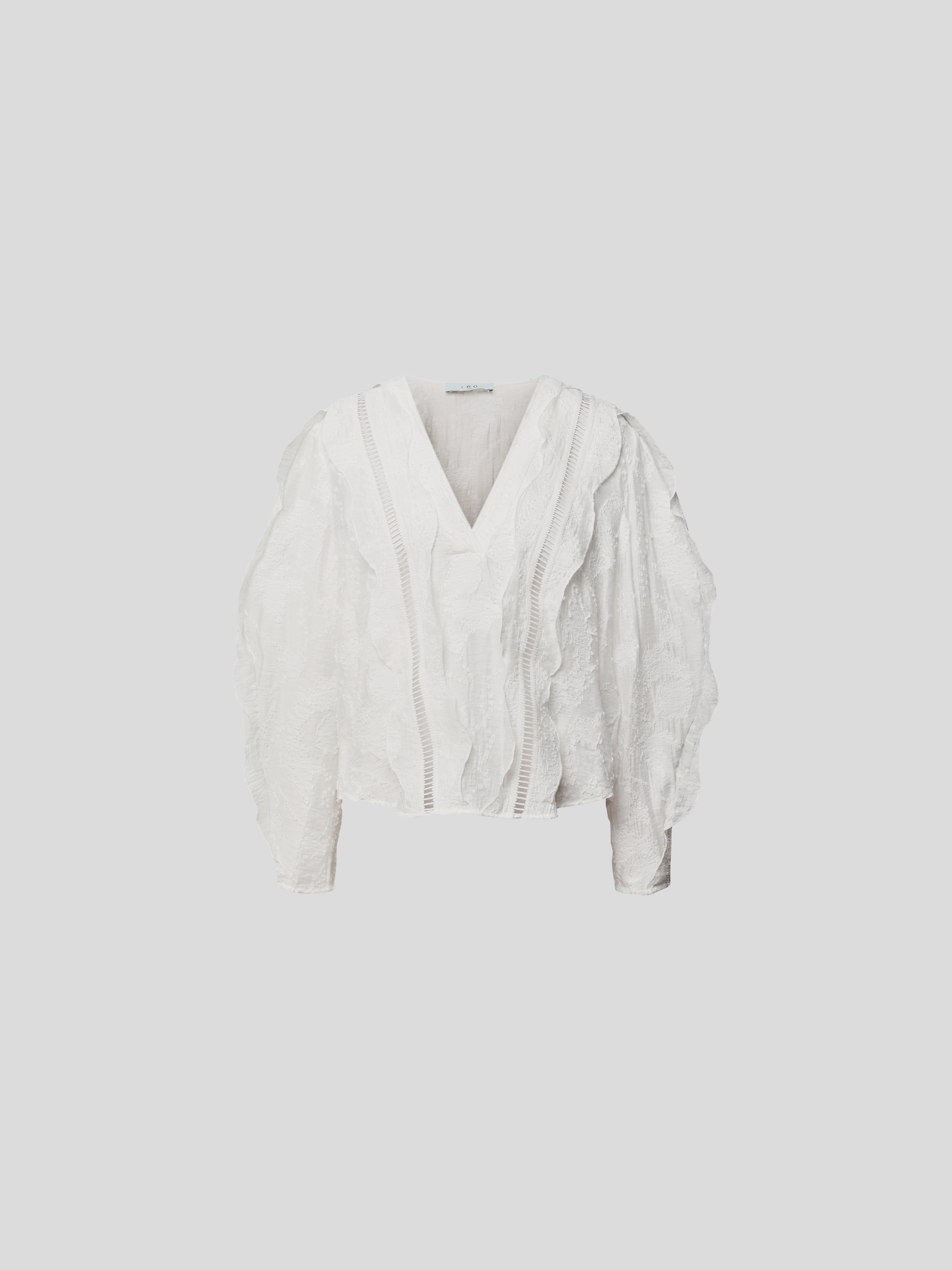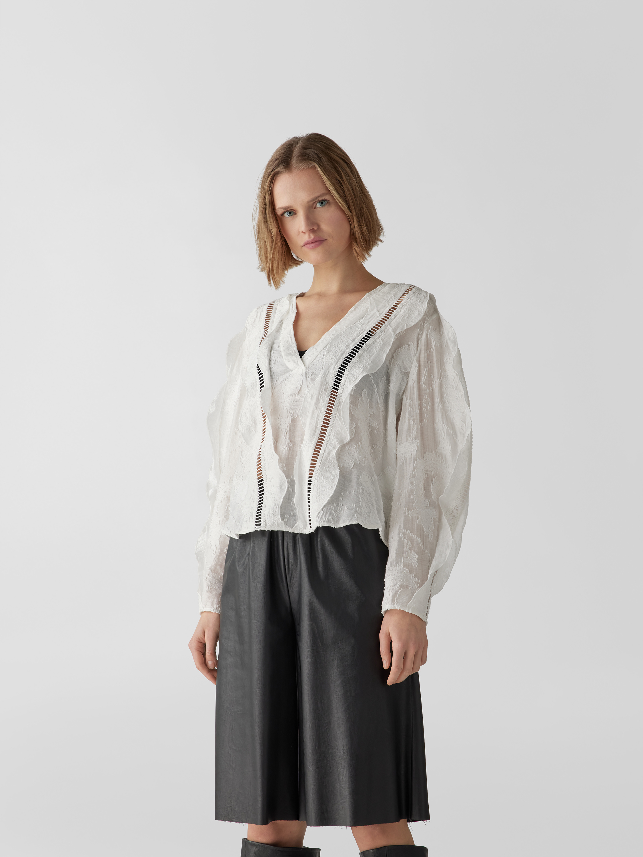 Die Bluse von IRO fällt durch ihr luftiges Lochmuster und die lockere Passform angenehm auf. Dank des feinen Material-Mix trägt sie sich leicht und sorgt für ein angenehmes Gefühl auf der Haut. Verspielte Volants und lange Ärmel runden das Design dezent ab.