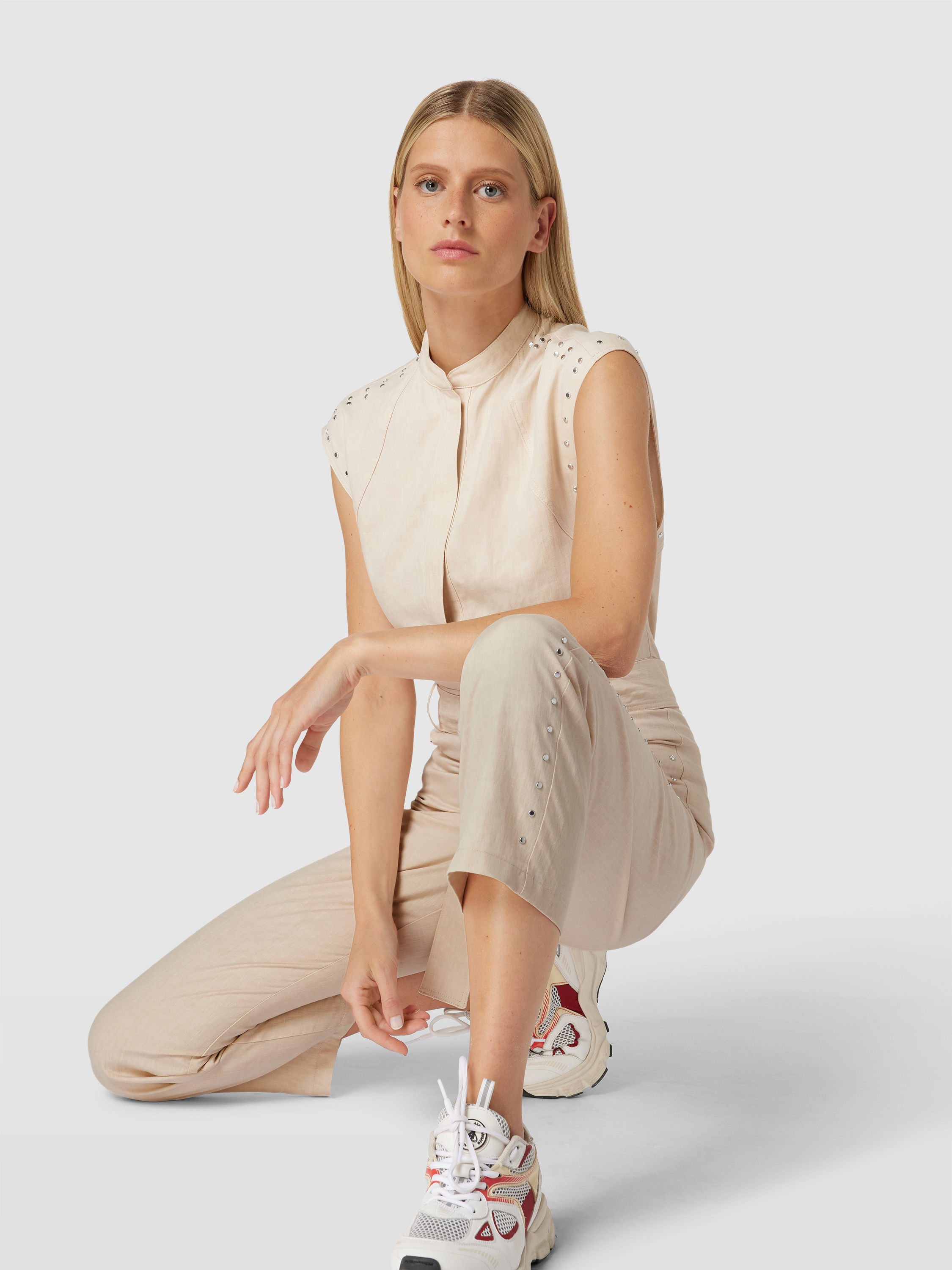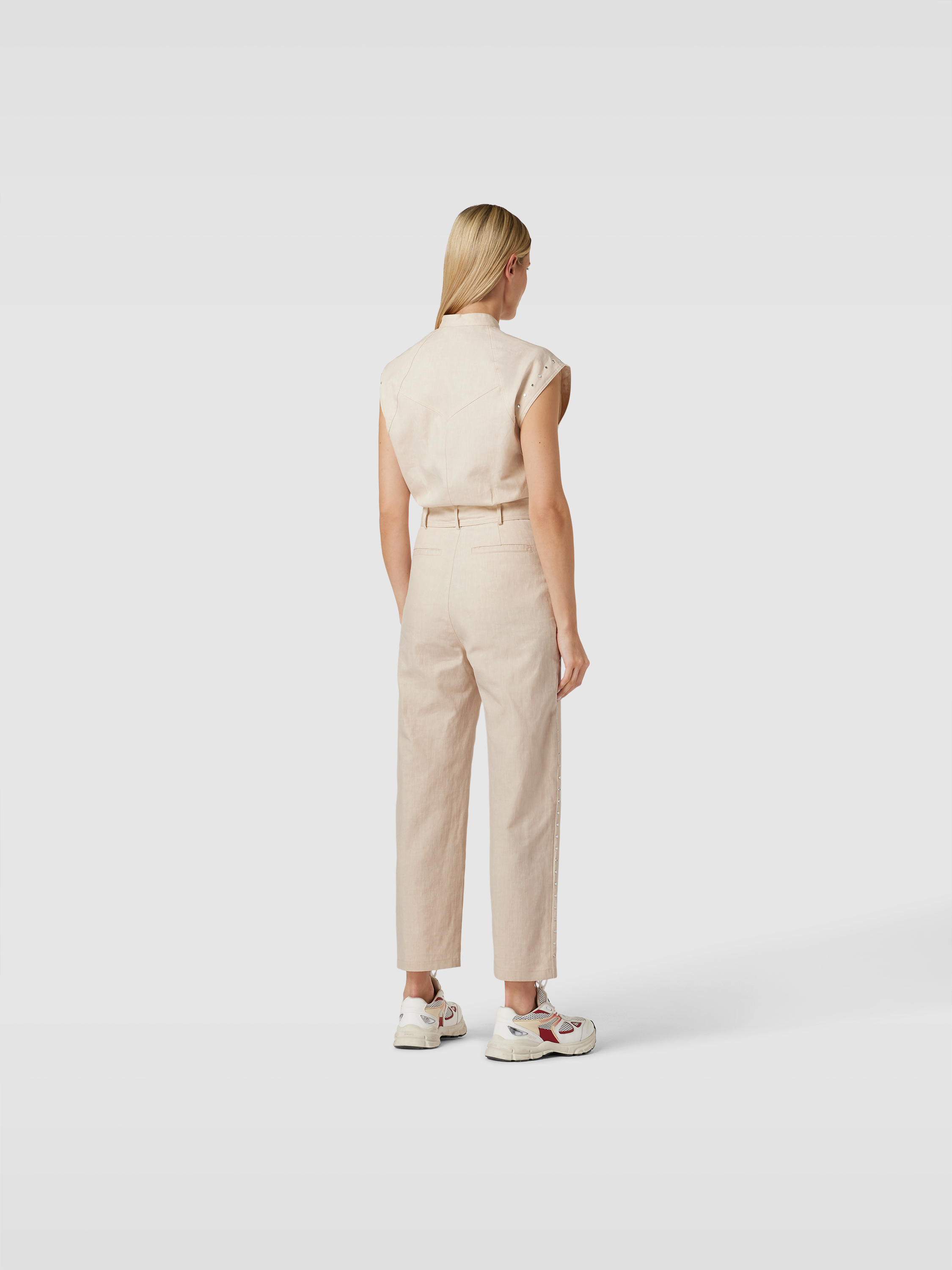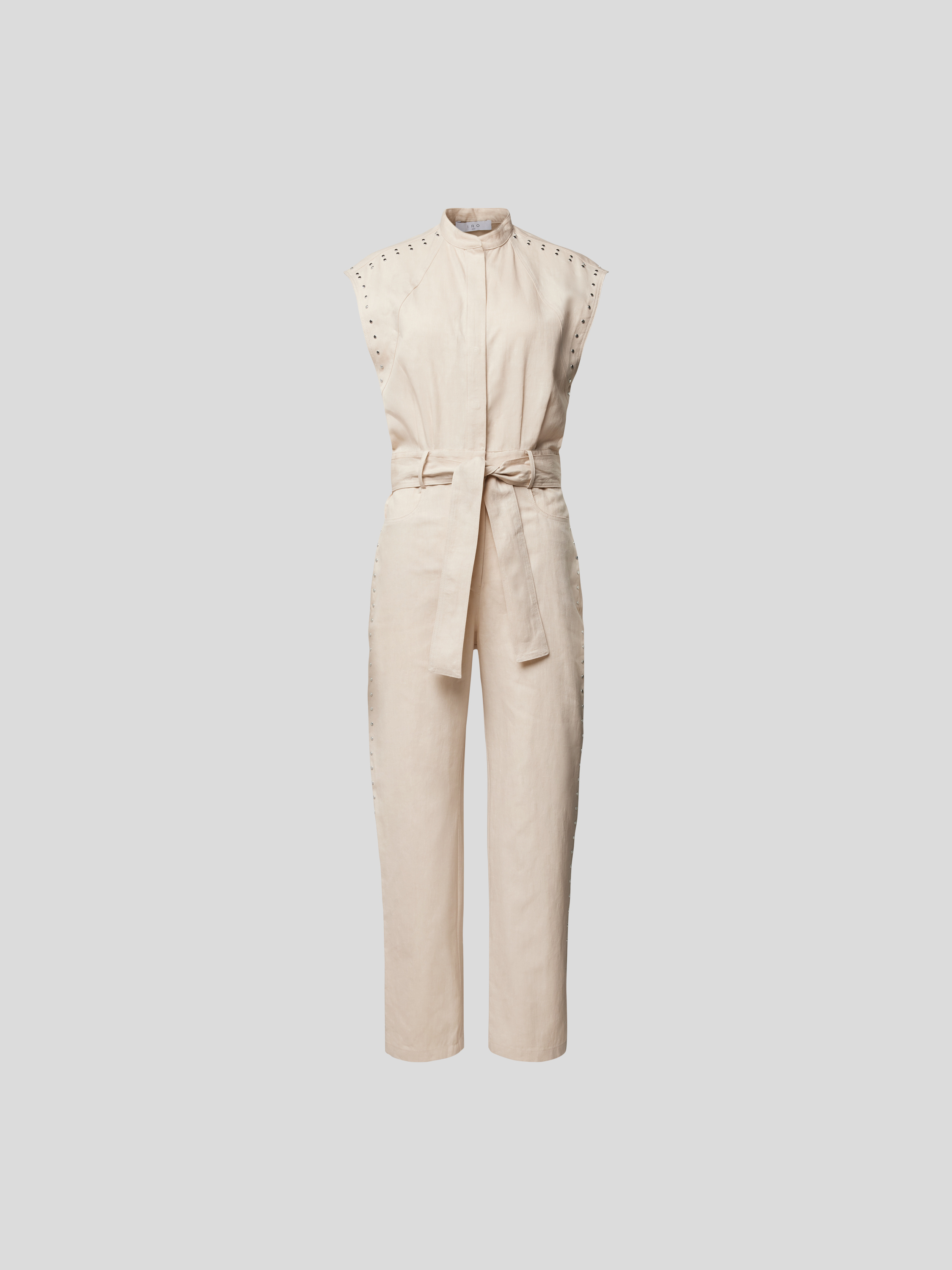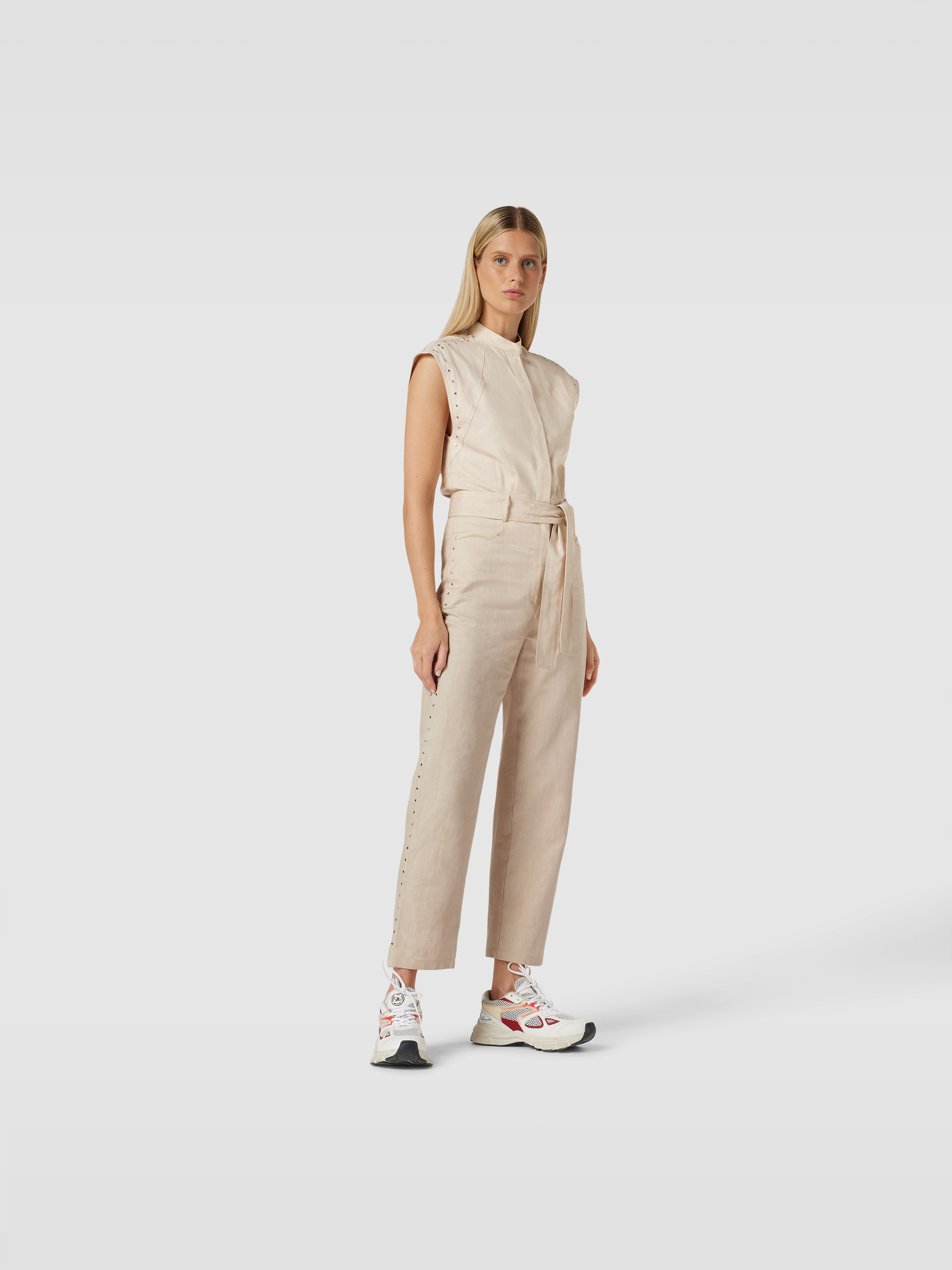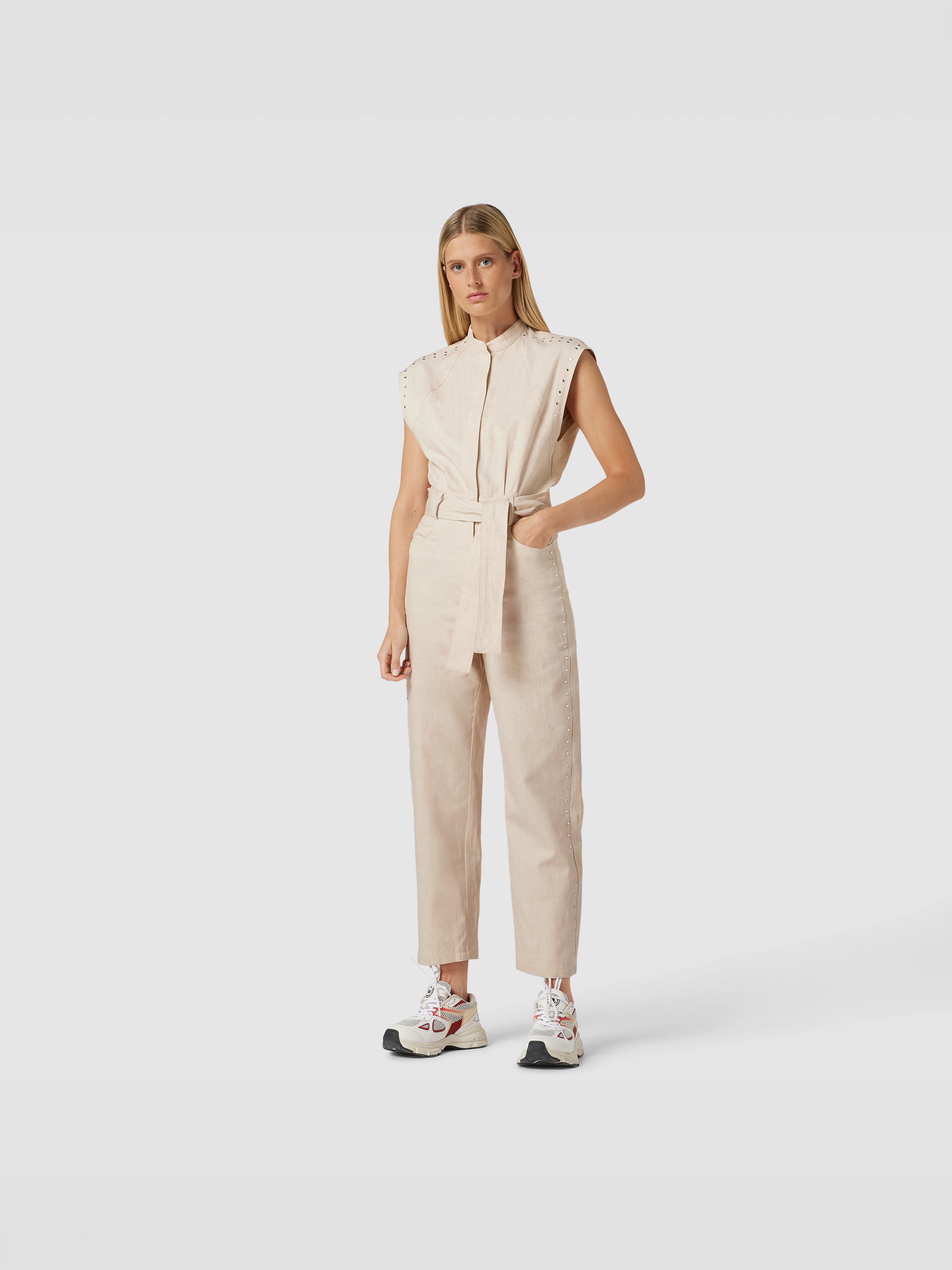 Der Damen Jumpsuit von IRO zeigt sich mit tailliertem Schnitt und einem Bindegürtel, der die Silhouette angenehm betont. Ein Stehkragen verleiht dem Look eine moderne Note, während die verdeckte Knopfleiste für eine klare Linienführung sorgt. So eignet sich das Modell für vielseitige Anlässe.
