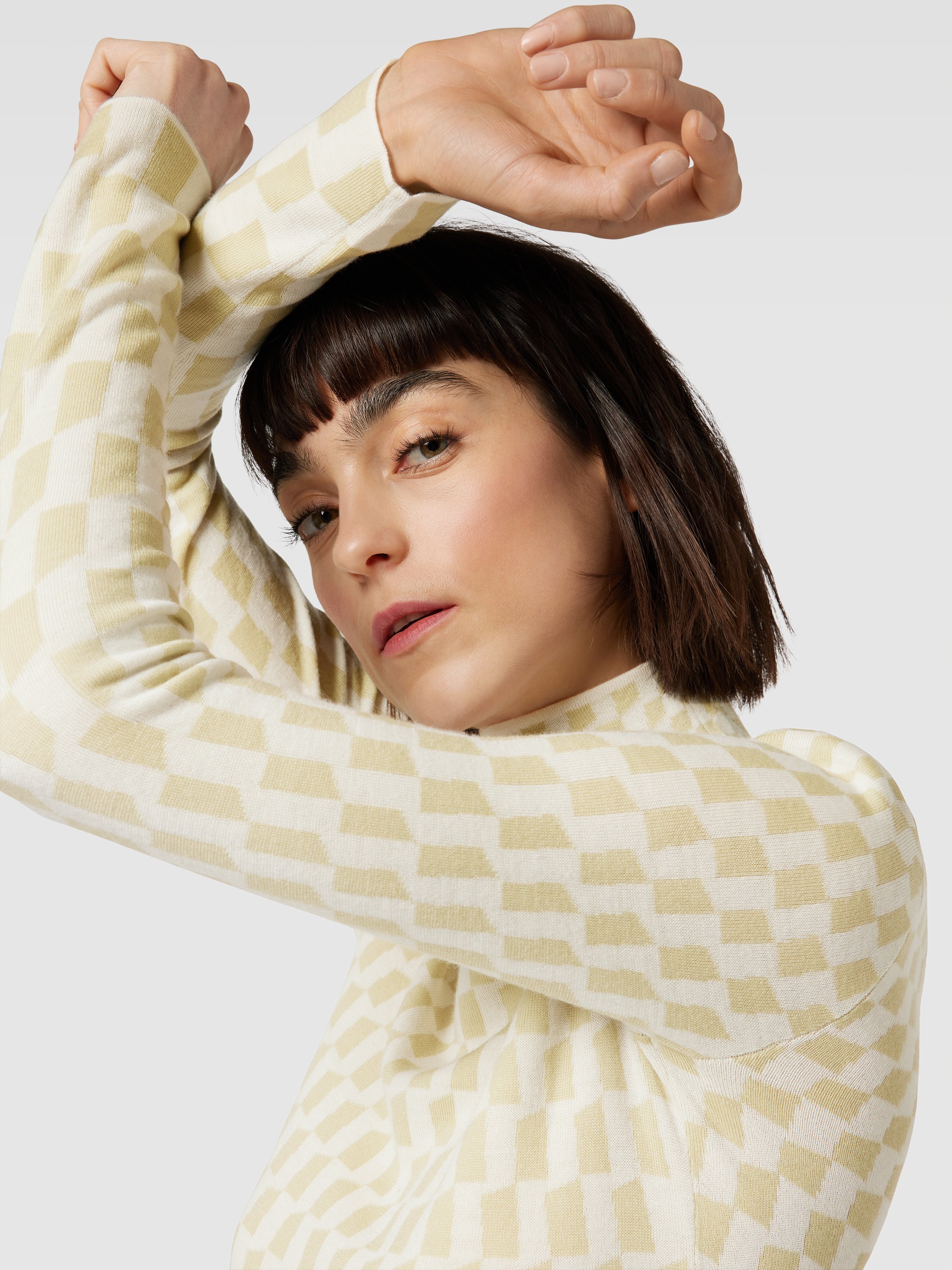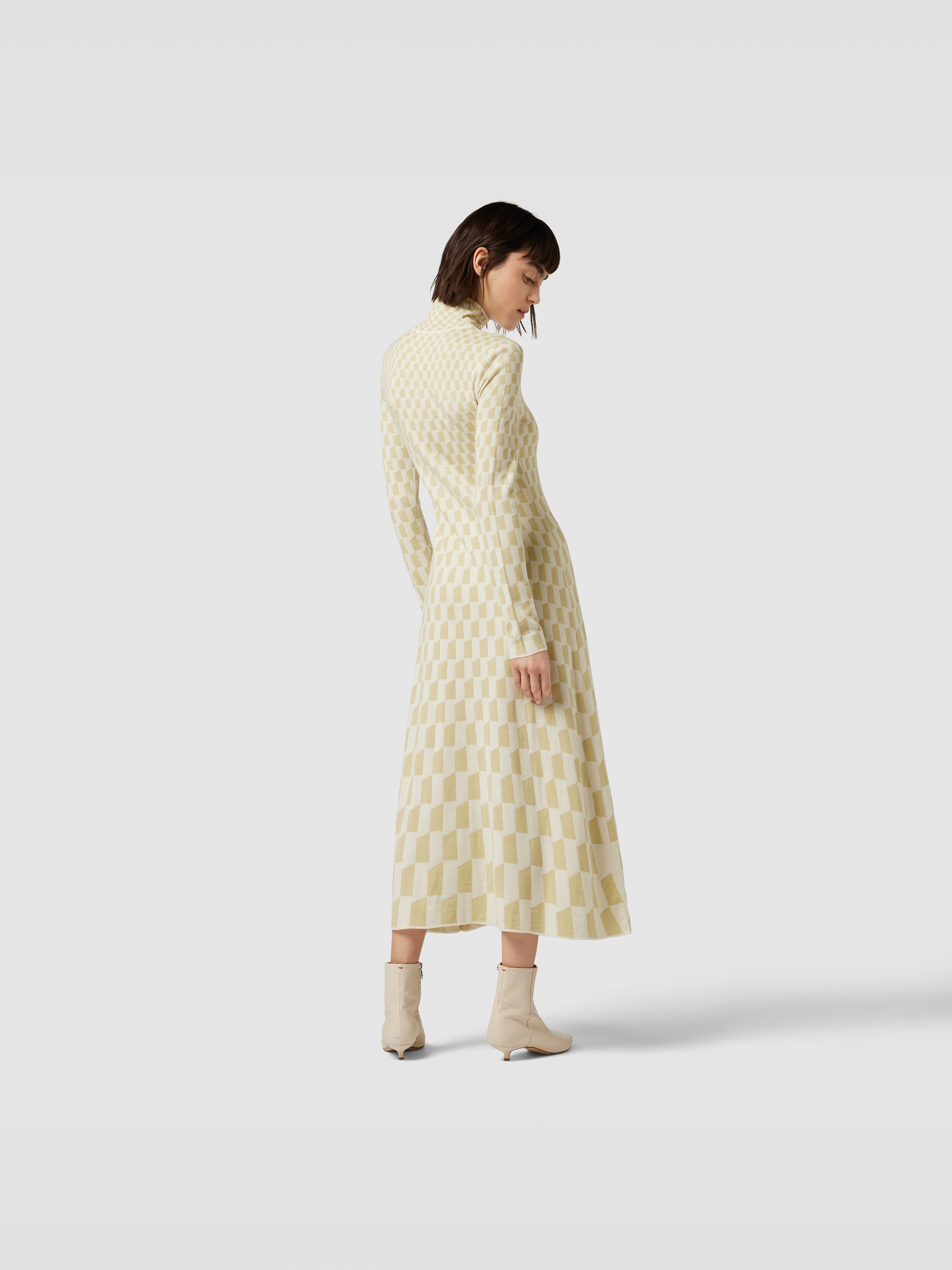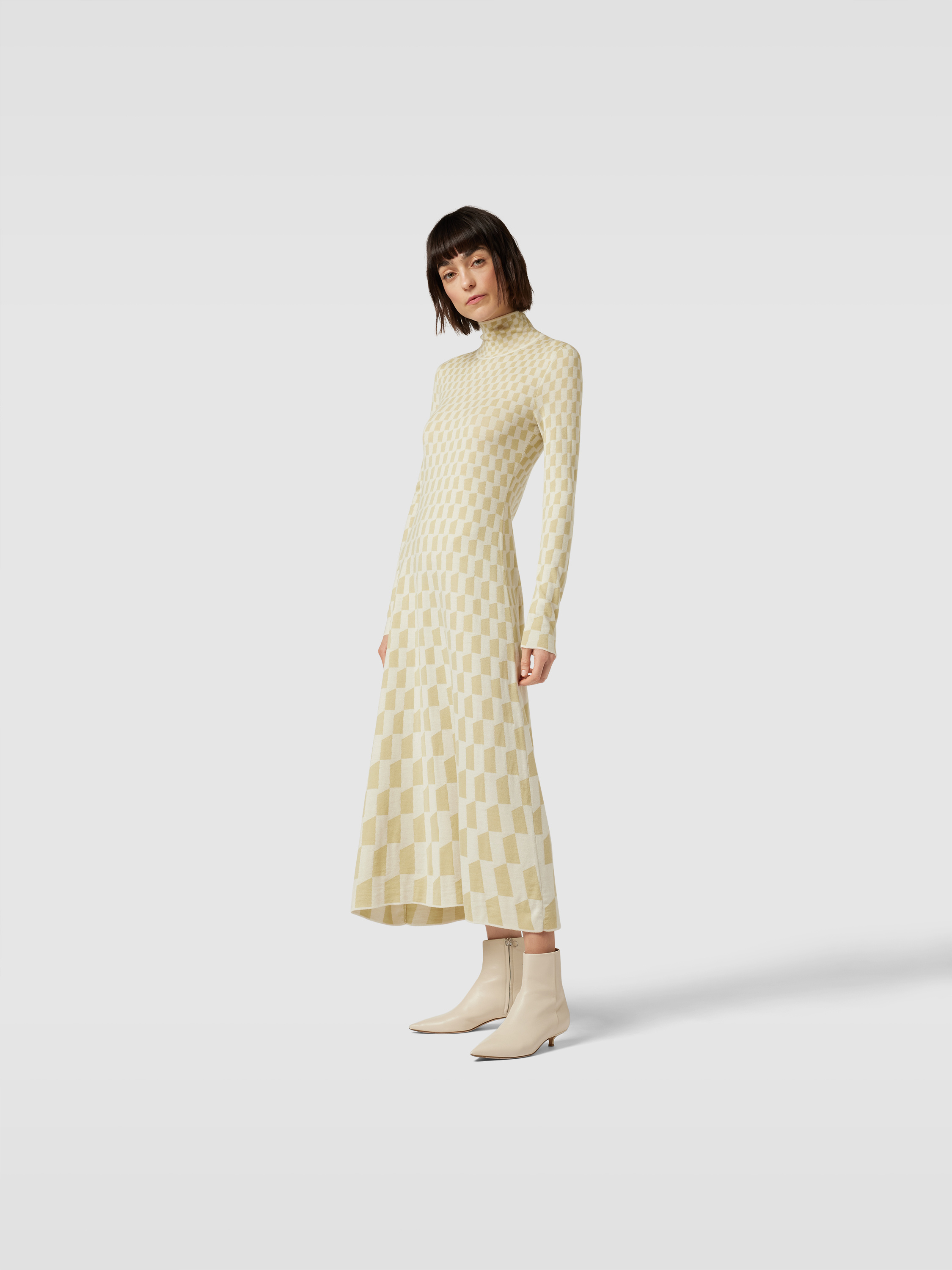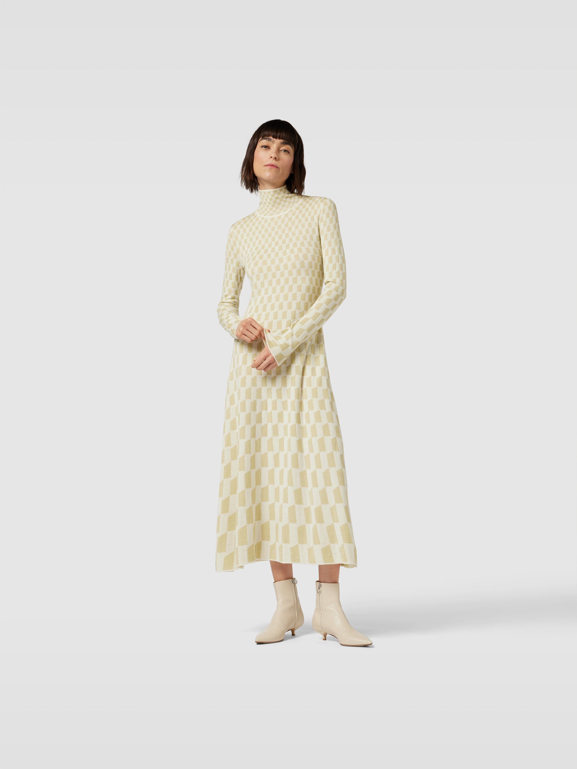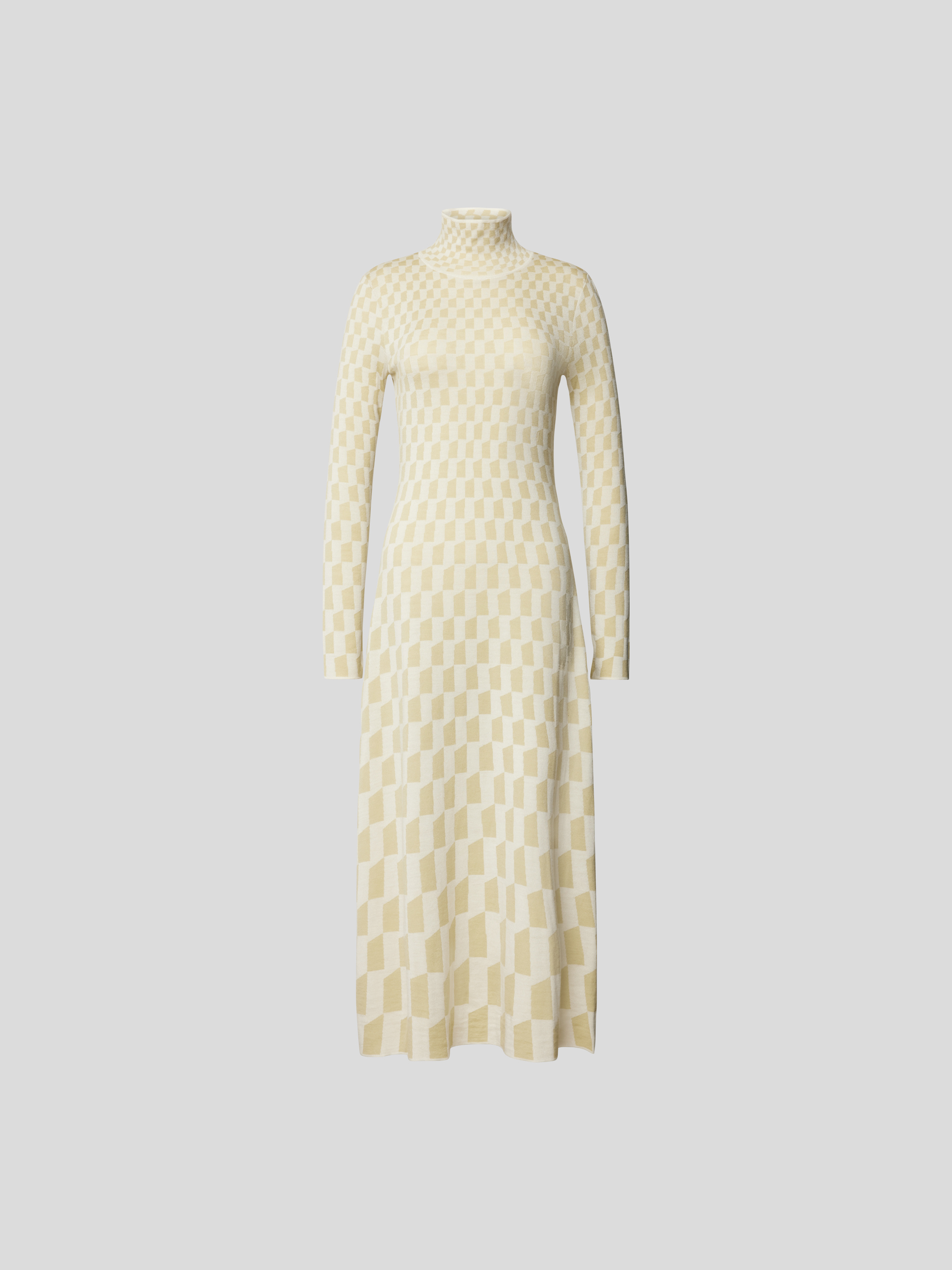 Das Damen Midikleid von Joseph schmiegt sich in körpernaher Form angenehm an und besteht aus reiner Wolle, die sich durch ihre weiche Struktur auszeichnet. Ein grafisches Allover-Muster sorgt für Abwechslung, während der Stehkragen und lange Ärmel dem Modell einen modernen Akzent verleihen.