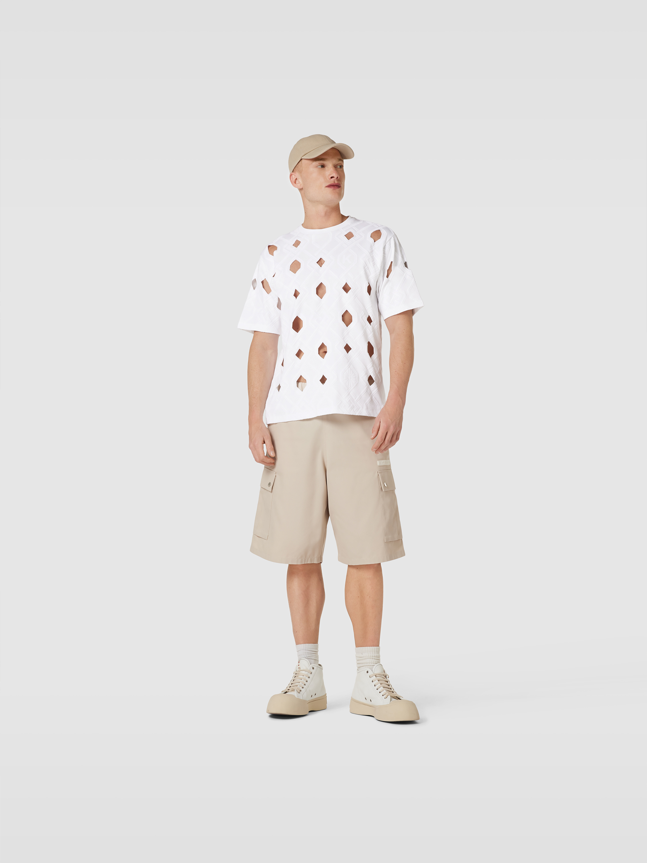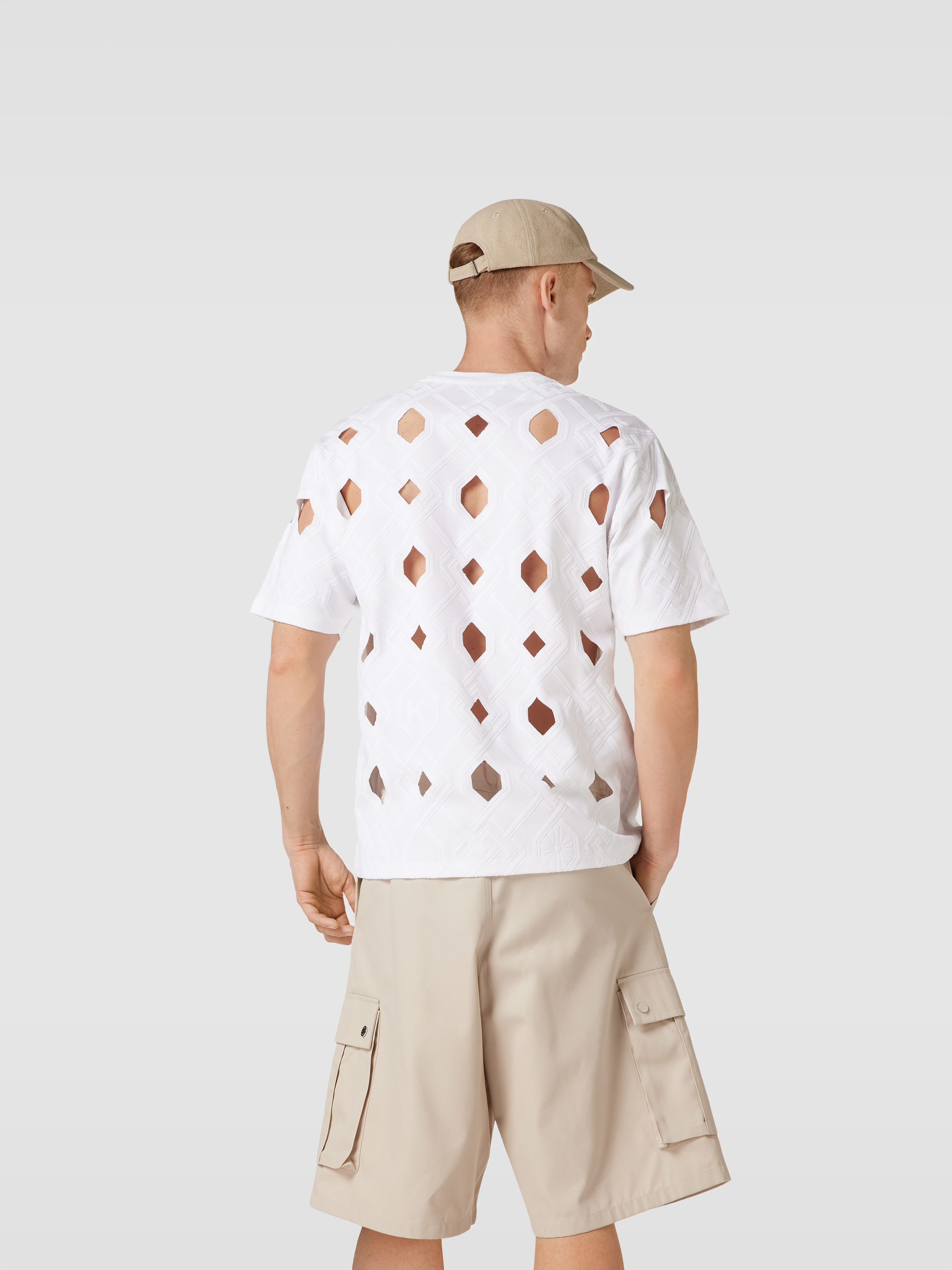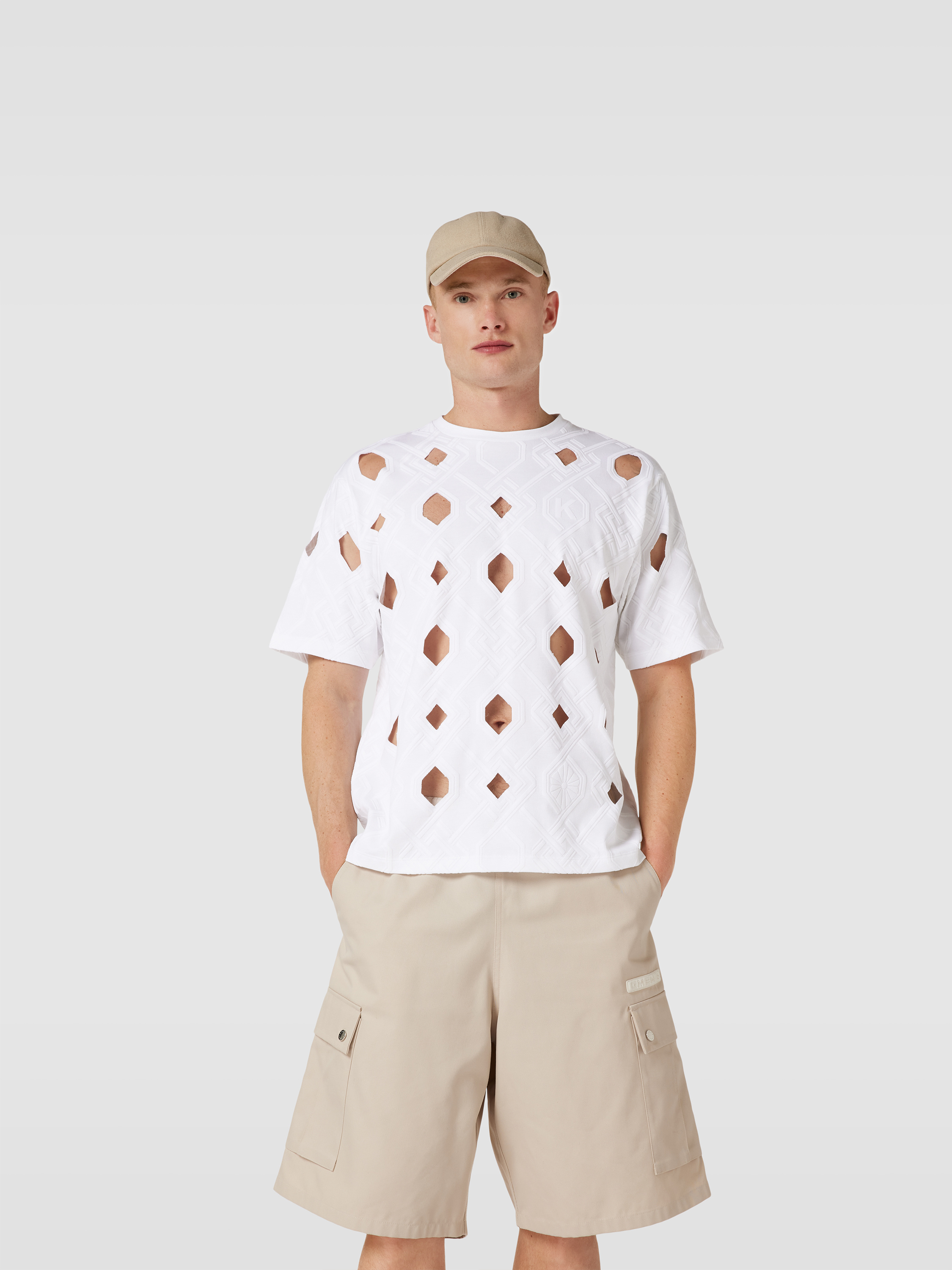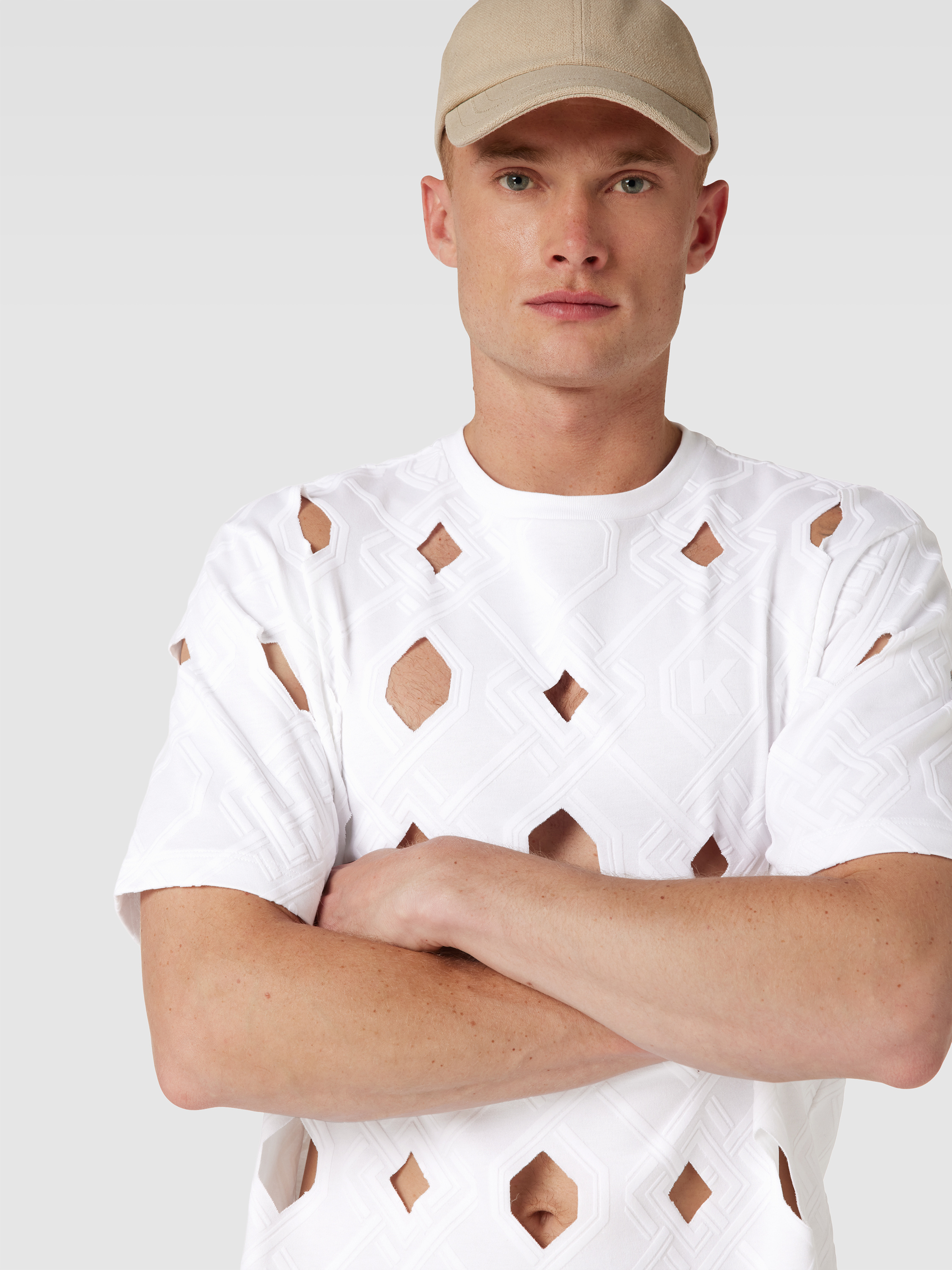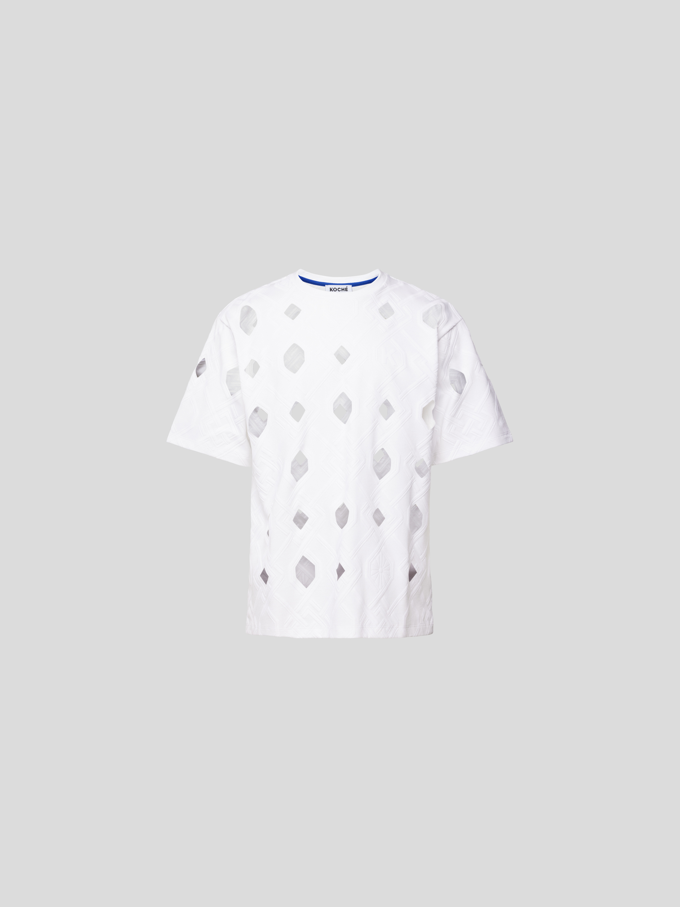 Das Herren T-Shirt von Kochè aus reiner Baumwolle sitzt locker und sorgt für angenehme Bewegungsfreiheit. Durch das grafische Muster mit Cut Outs entsteht ein spannender Akzent, der sich vielseitig kombinieren lässt. Dezente Label-Details runden das Gesamtbild lässig ab.