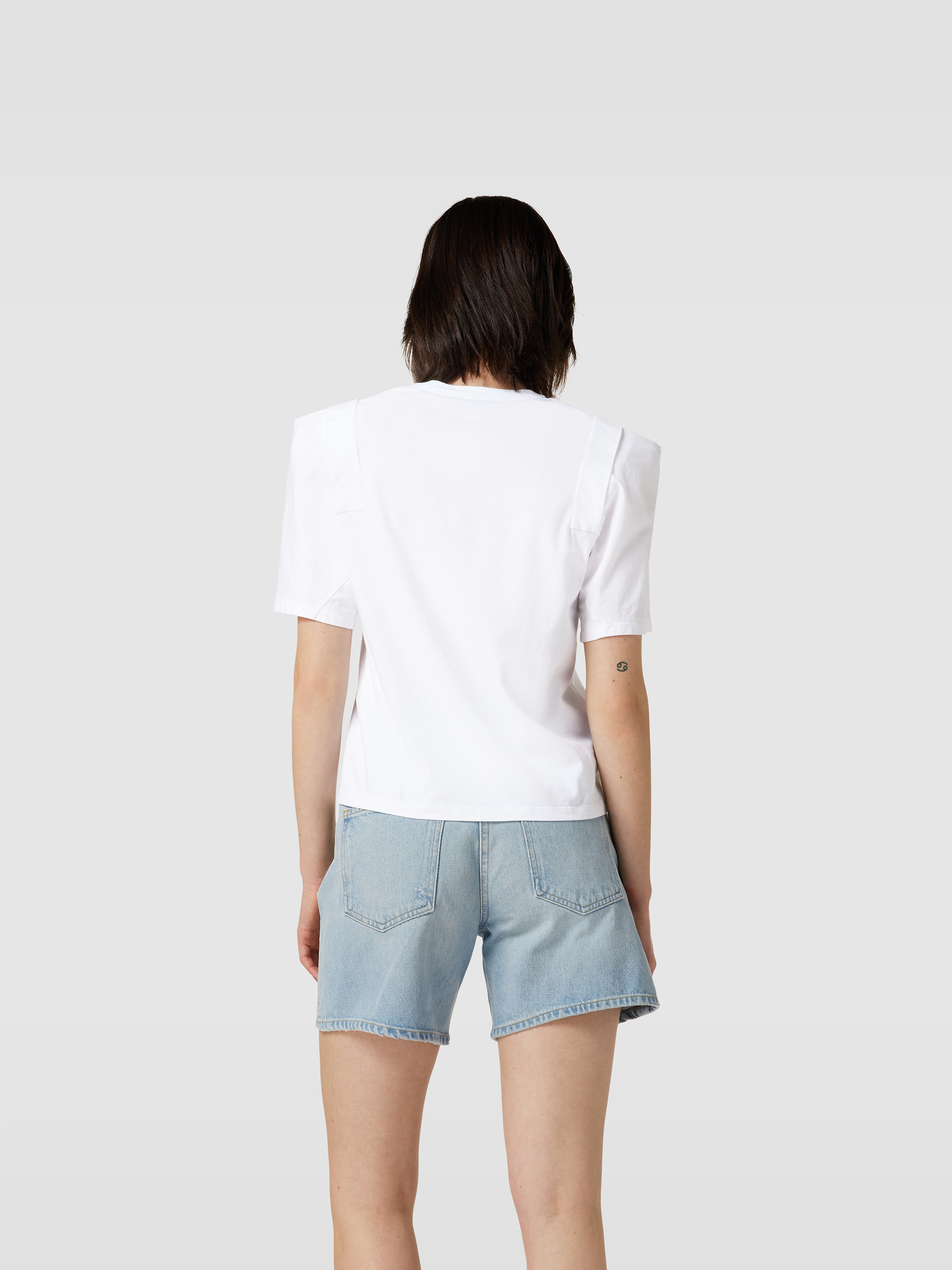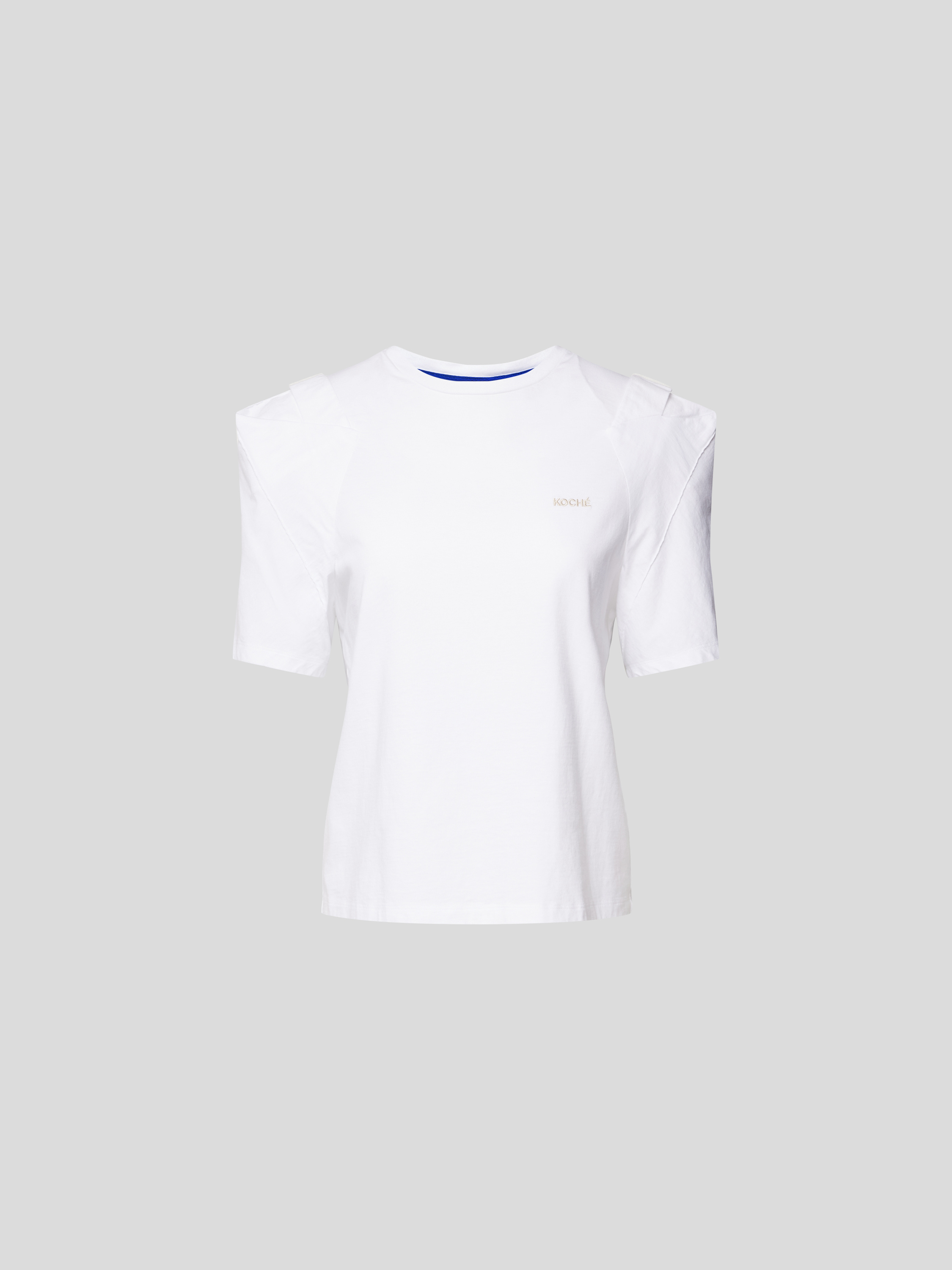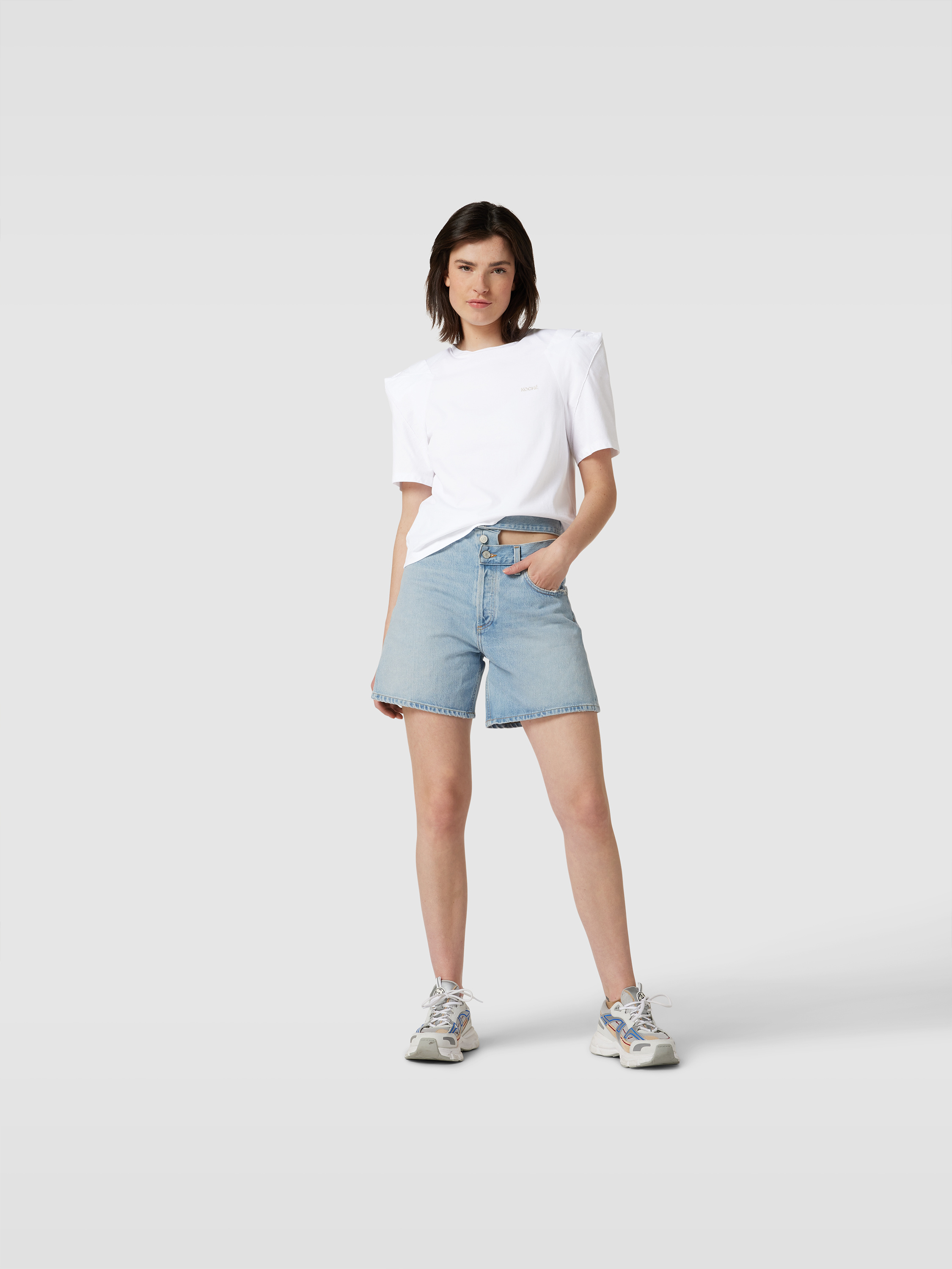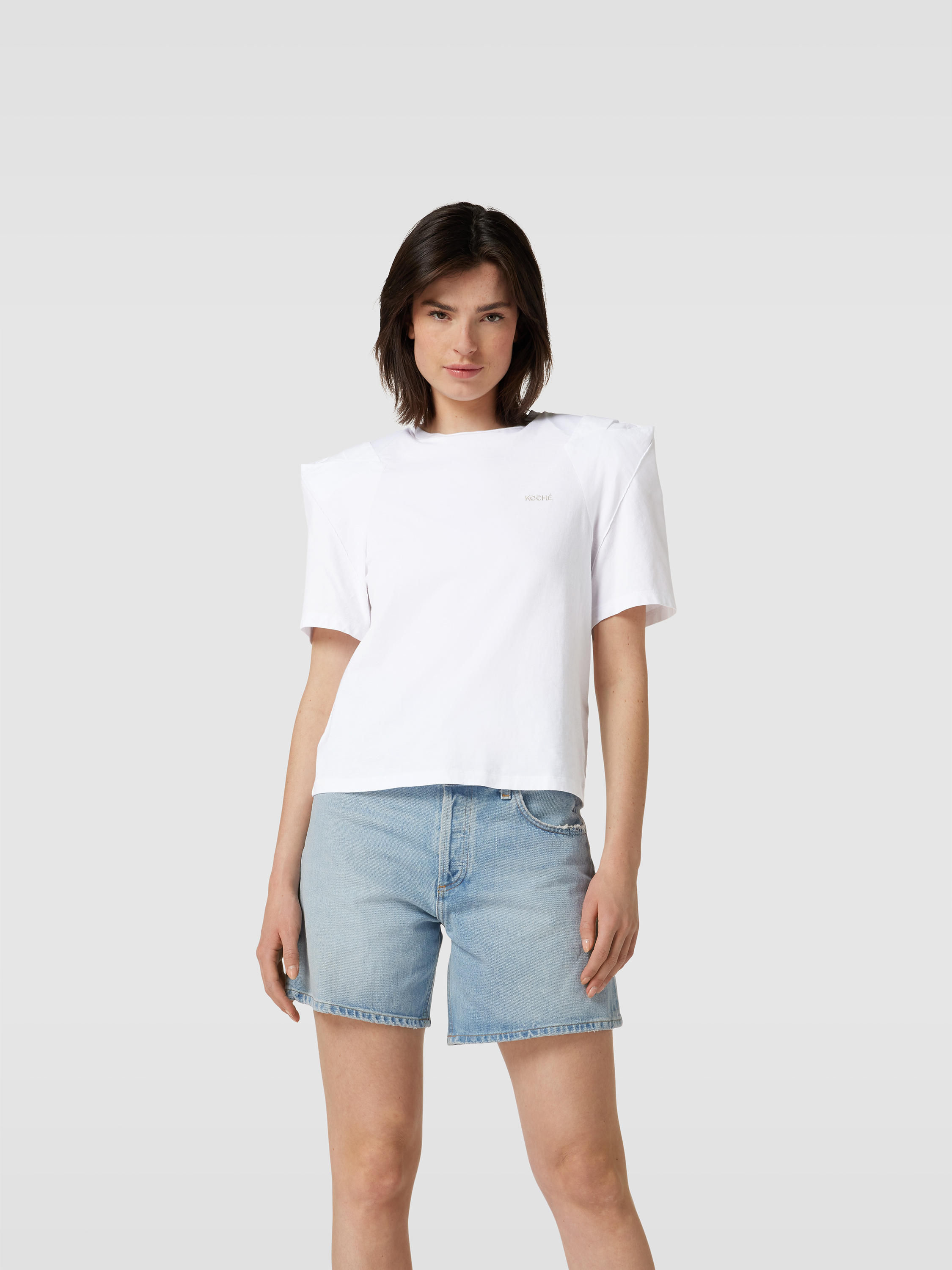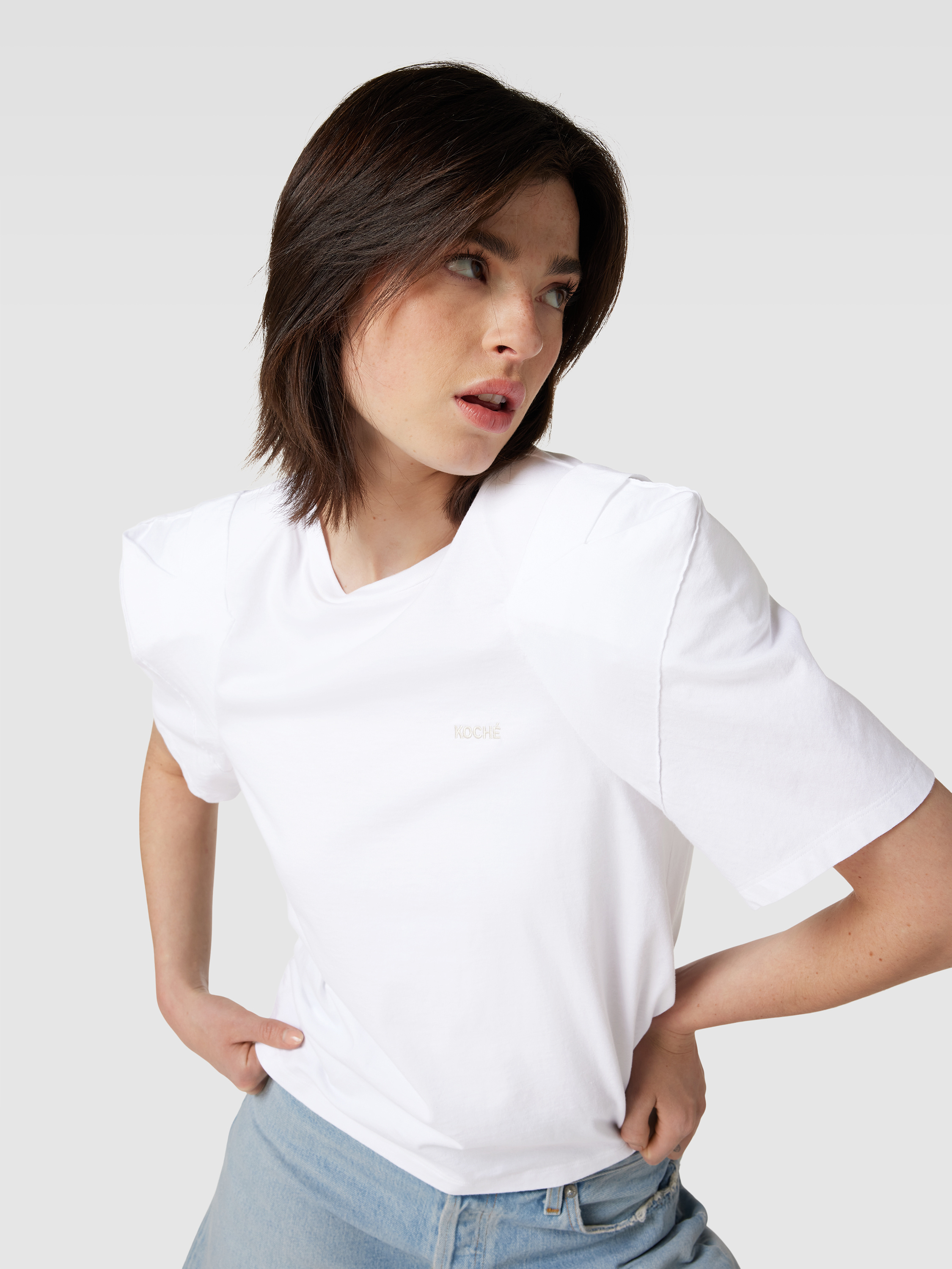 Das Damen T-Shirt von Kochè aus reiner Baumwolle fällt durch seinen lockeren Schnitt angenehm leicht und sorgt für ein entspanntes Tragegefühl. Die markanten Schulterpolster bringen klare Konturen ins Outfit und setzen einen modernen Akzent. Dezentes Label-Stitching und ein gerippter Rundhalsausschnitt runden das Design ab.