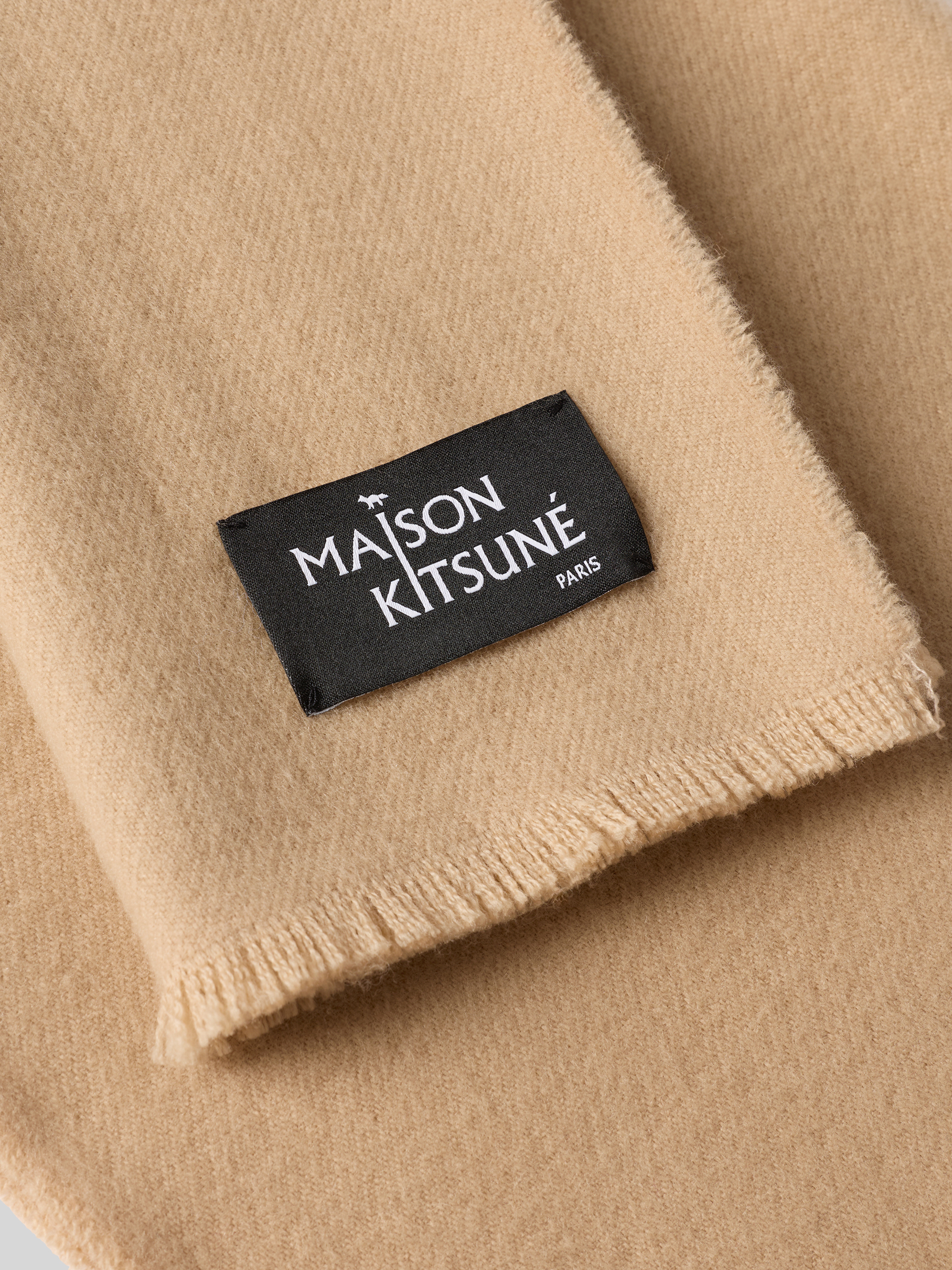 Der Herren Schal von MAISON KITSUNÉ zeigt sich in rechteckiger Form und besteht aus reiner Wolle, wodurch ein angenehmes Tragegefühl entsteht. Dezente Ausfransungen und das Label-Detail setzen einen unaufdringlichen Akzent. Durch sein Material eignet sich das Accessoire besonders für kühle Tage.