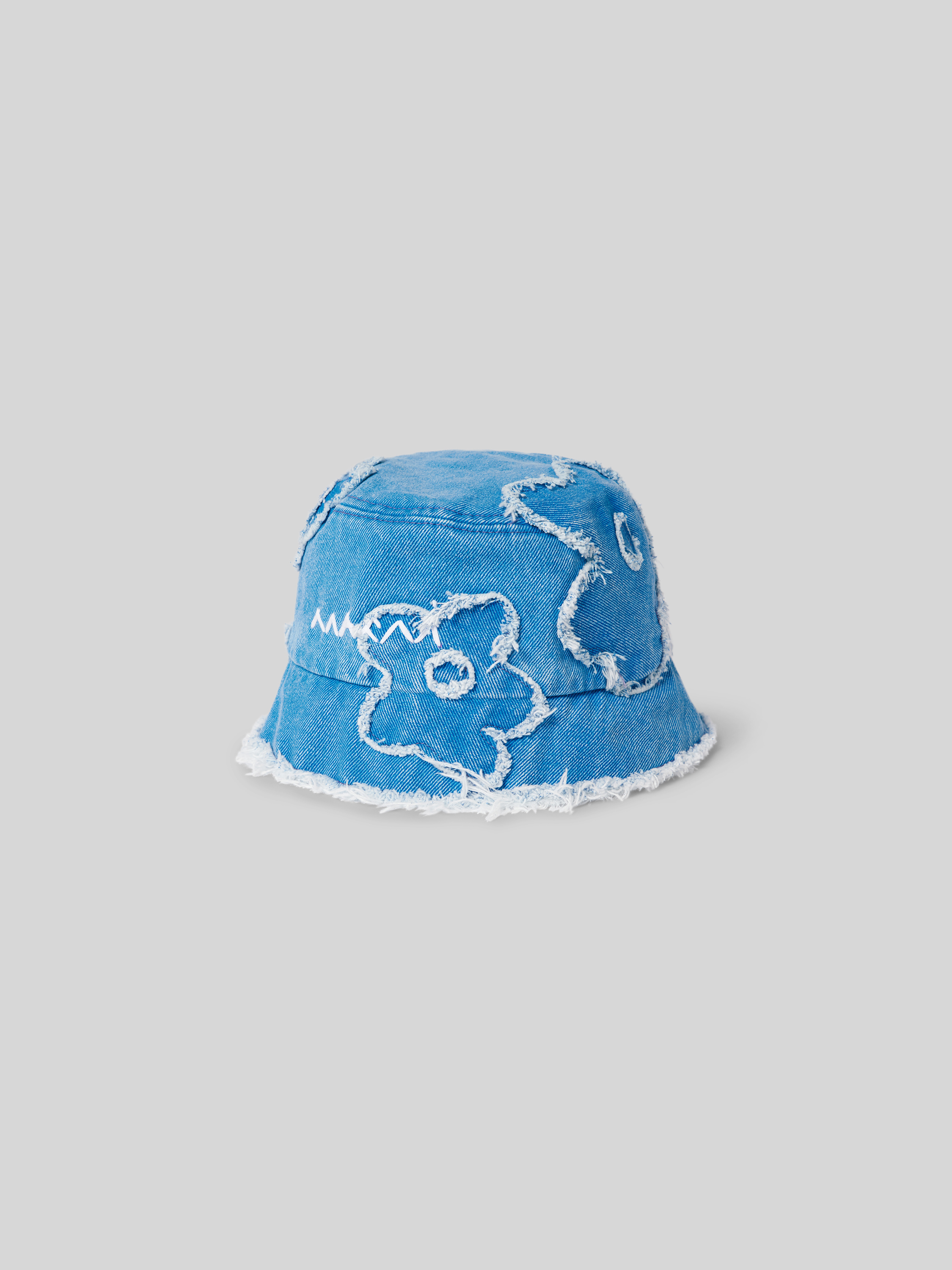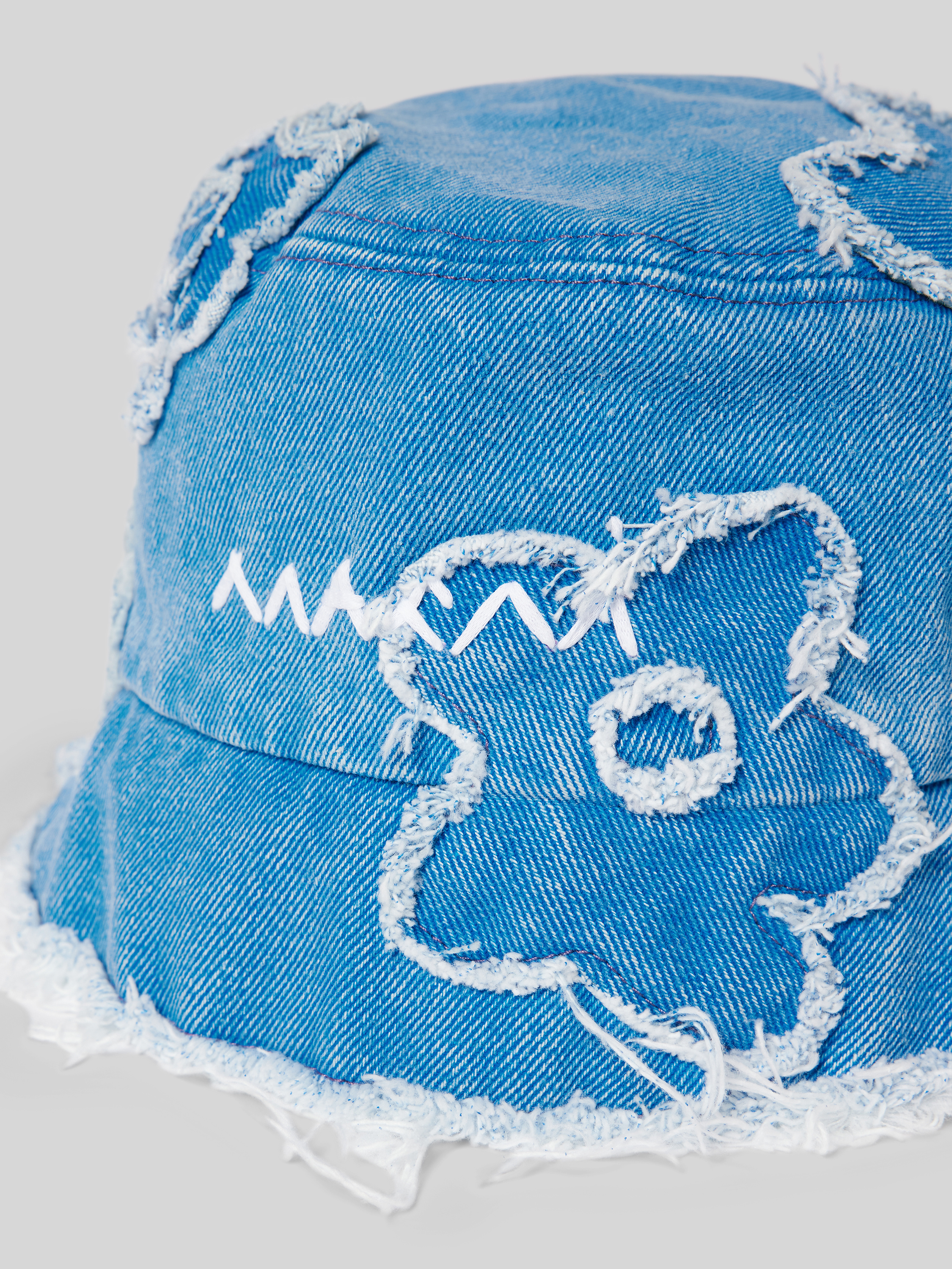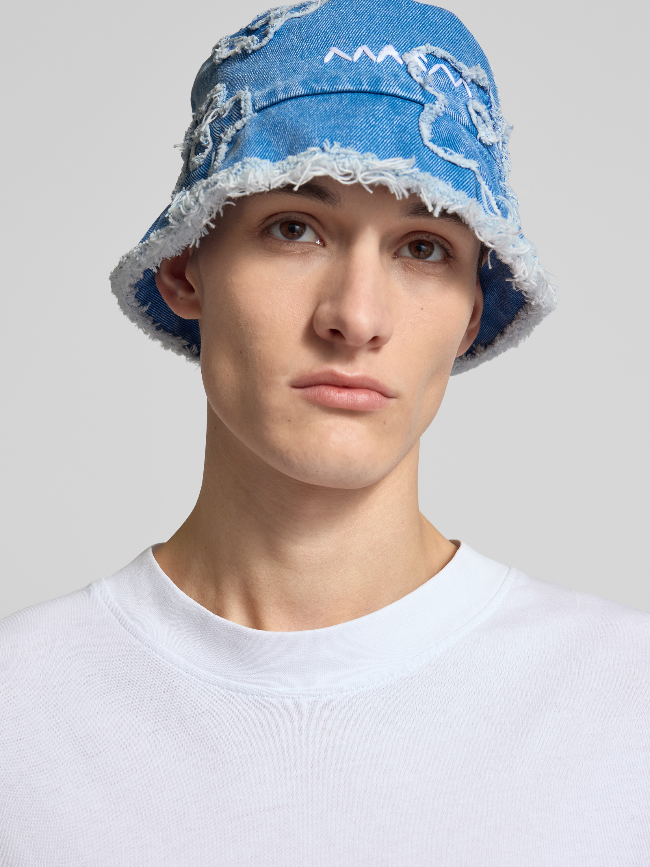 Der Herrenhut Bucket Hat von Marni zeigt sich in robuster Baumwolle und Denim-Optik, wodurch er vielseitig kombinierbar wirkt. Feine Motiv-Stitchings und das dezente Label-Stitching sorgen für individuelle Akzente. Durch die sorgfältigen Ziernähte erhält das Accessoire eine lässige Ausstrahlung.