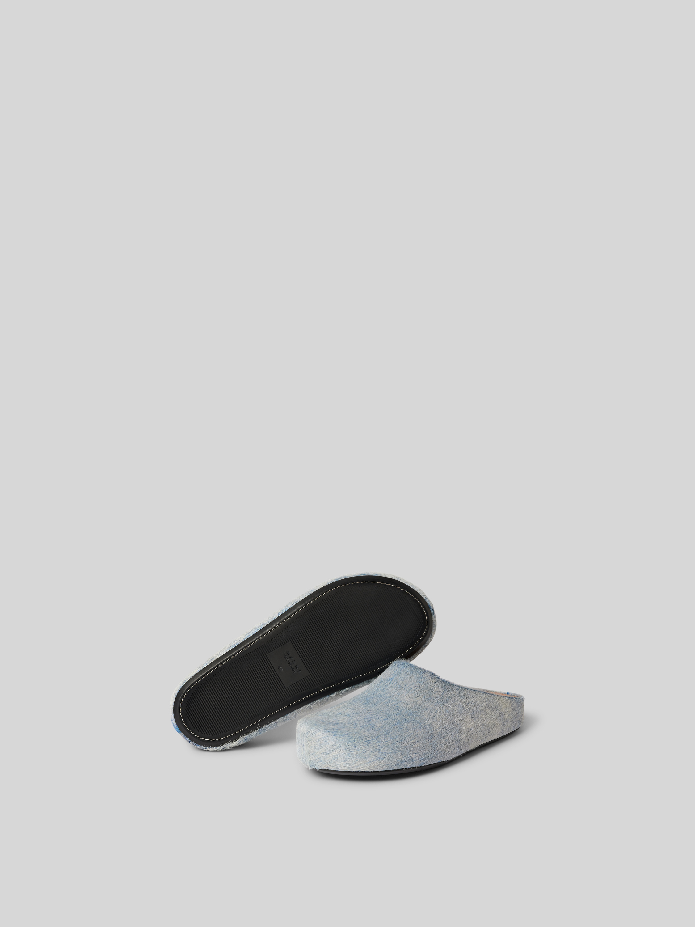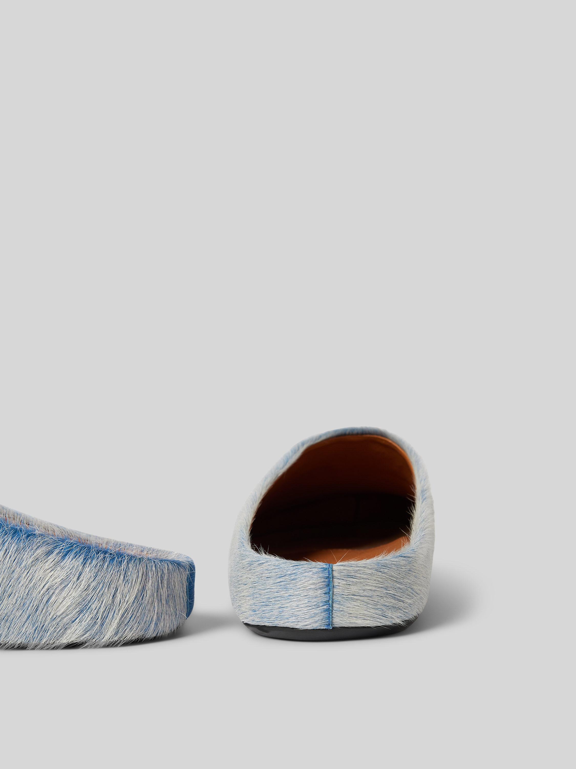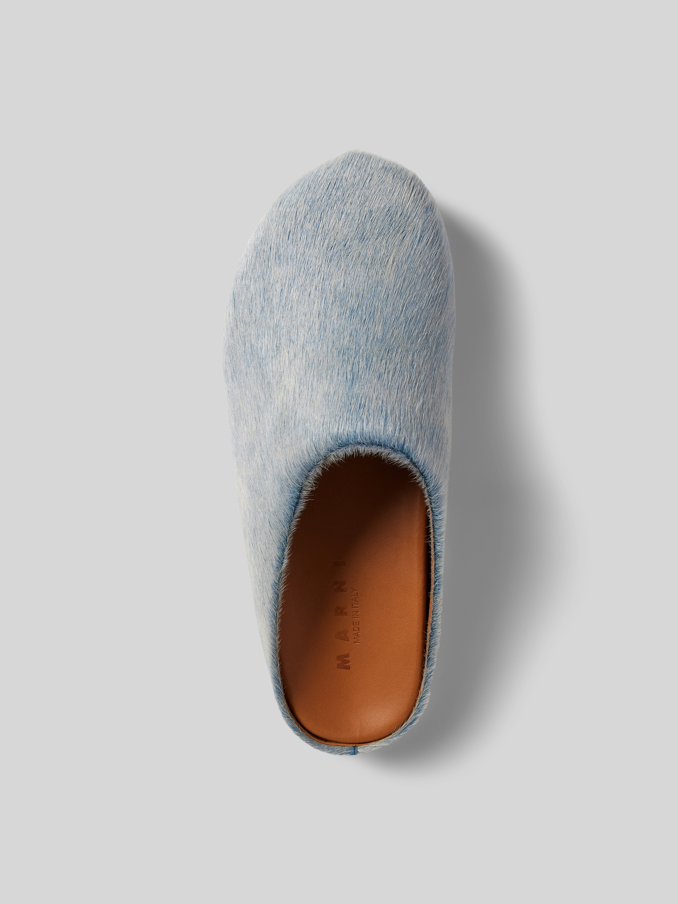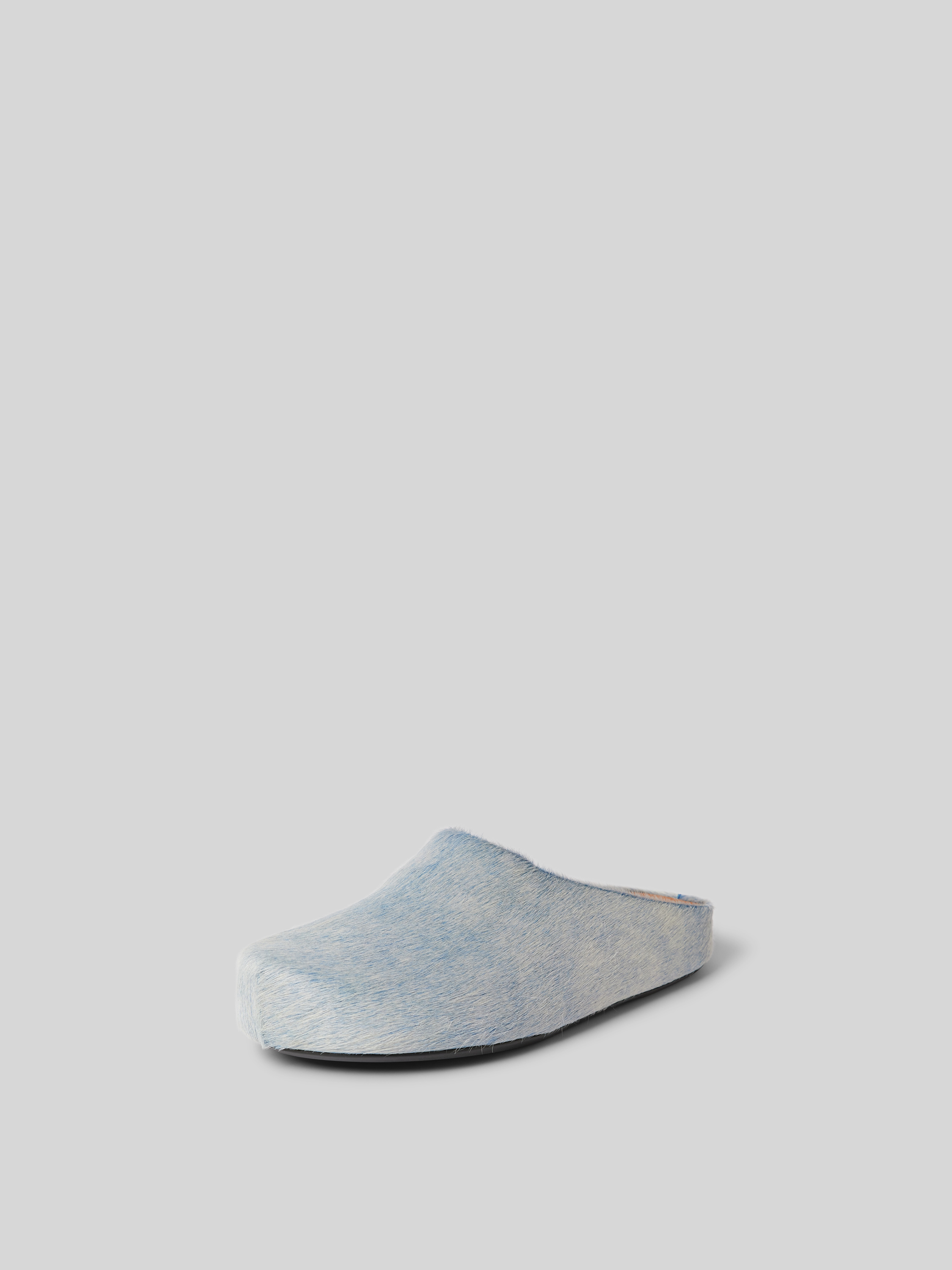 Die Herrenschuhe Pantoletten mit Fell-Besatz von Marni verbinden weiches Kalbshaar mit angenehm glattem Rindslederfutter. Die offene Ferse erlaubt unkompliziertes Hineinschlüpfen, während der Allover-Fellbesatz einen eigenständigen Akzent setzt. Durch die glatte Sohle entsteht ein komfortables Tragegefühl im Alltag.