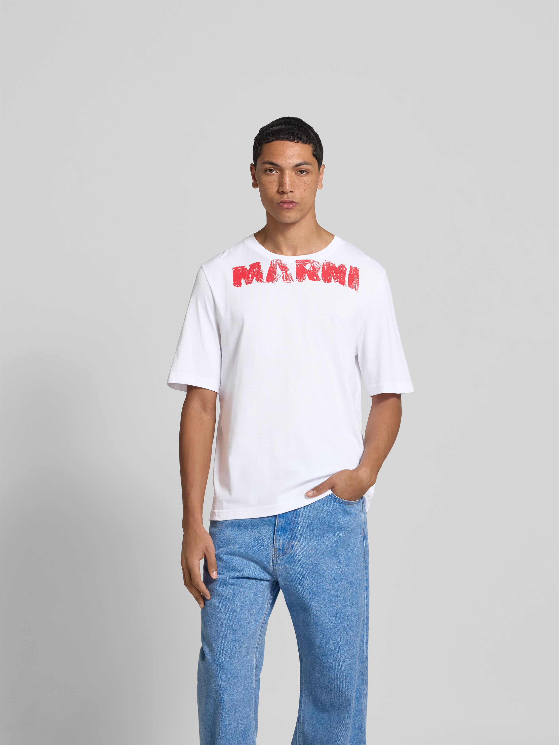 Das Herren T-Shirt von Marni aus reiner Baumwolle legt sich angenehm auf die Haut und bleibt den ganzen Tag komfortabel. Durch den Regular-Fit-Schnitt entsteht eine legere Passform, die vielseitig kombinierbar wirkt. Ein Logo-Print und der klassische Rundhalsausschnitt setzen dezente Akzente im Alltag.