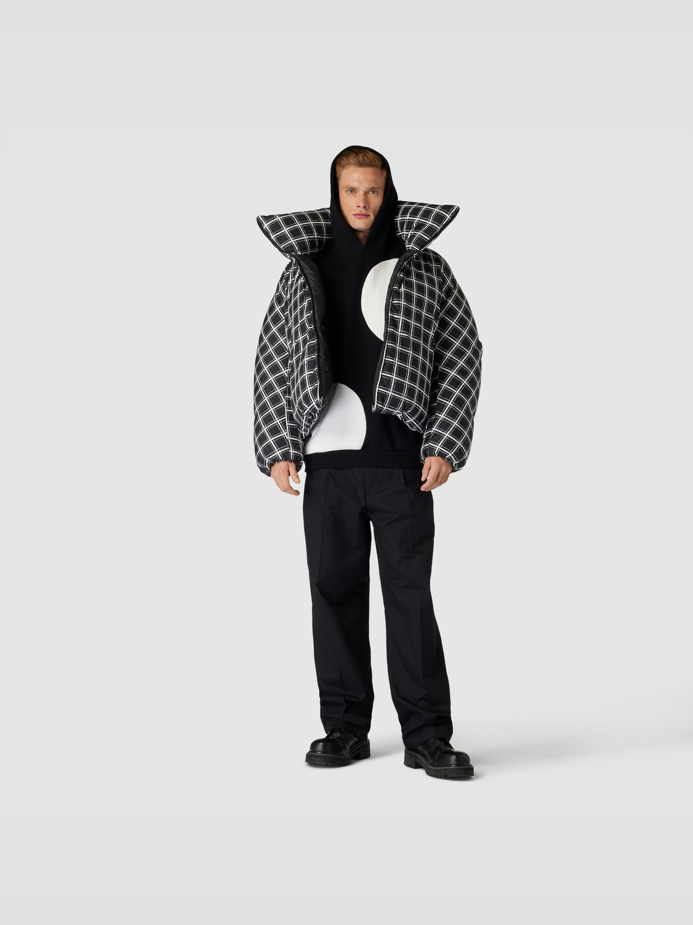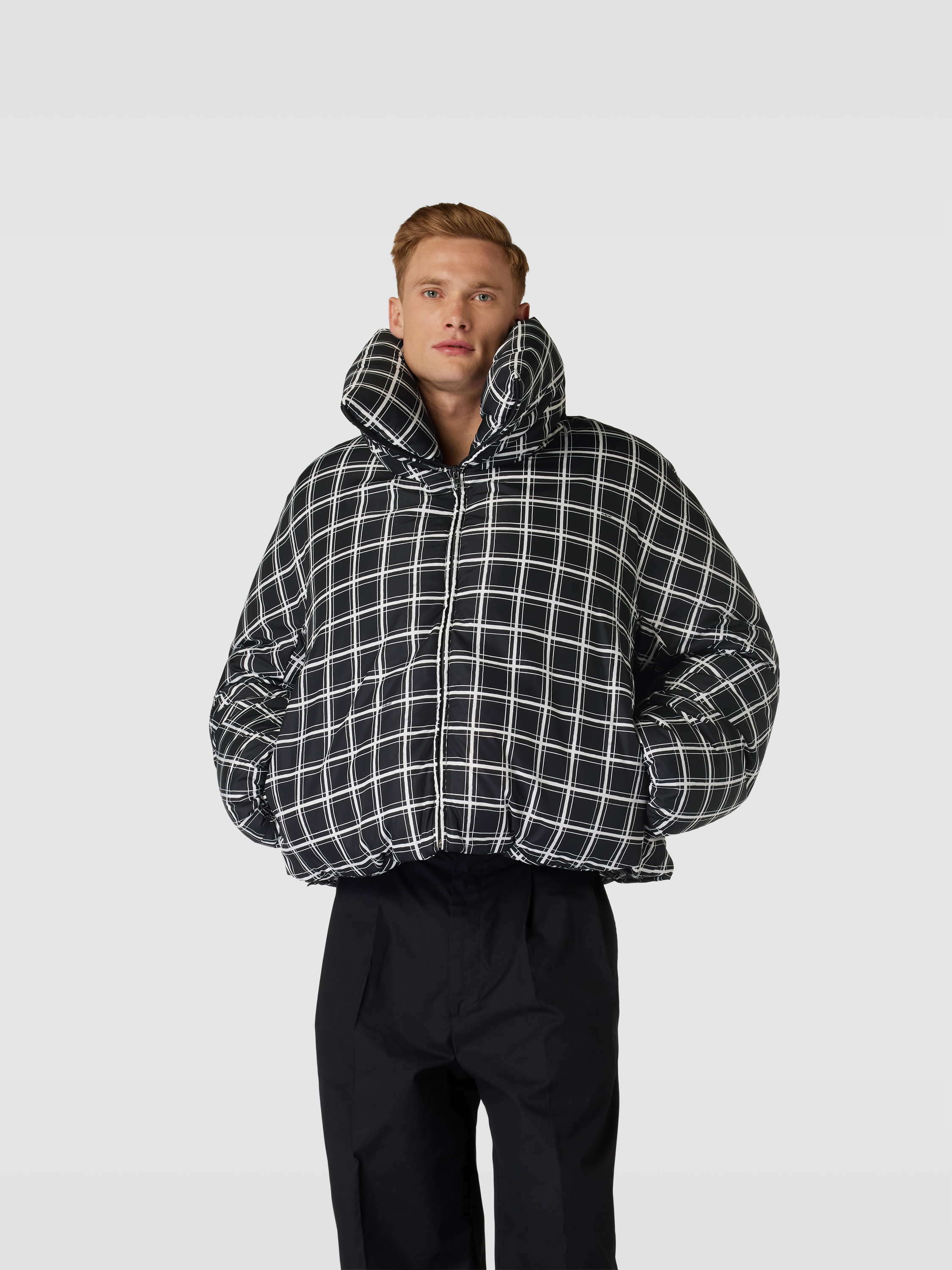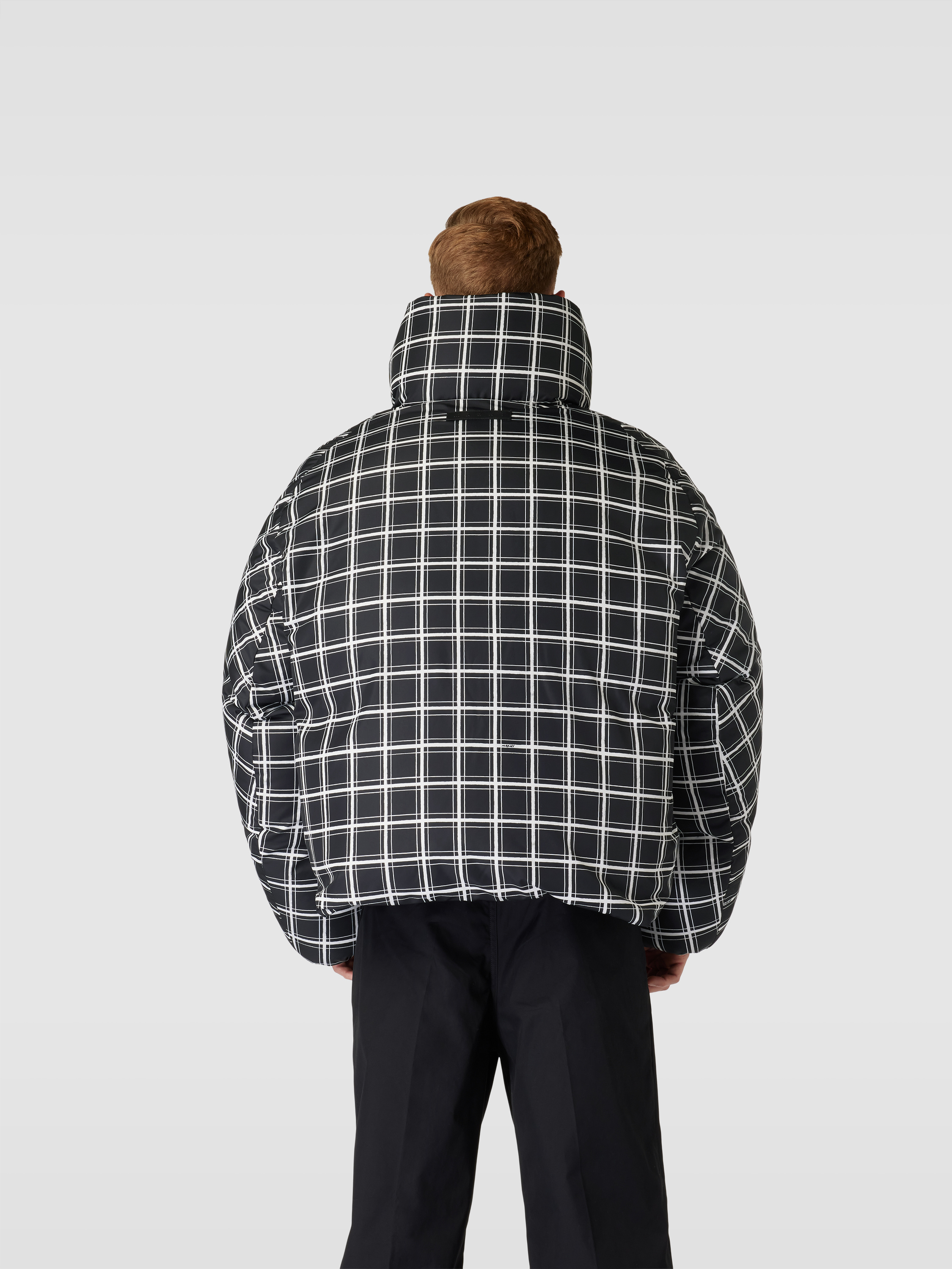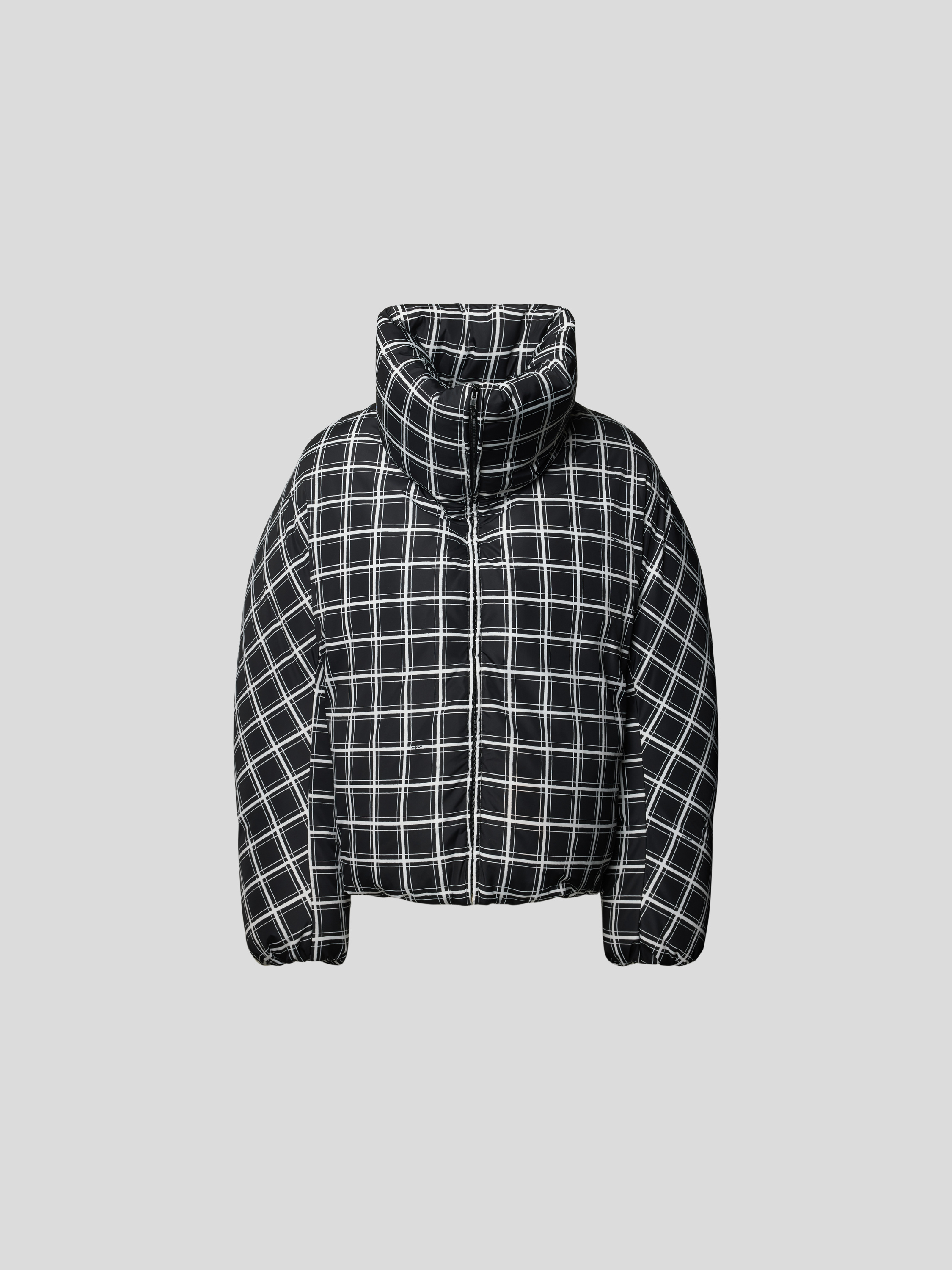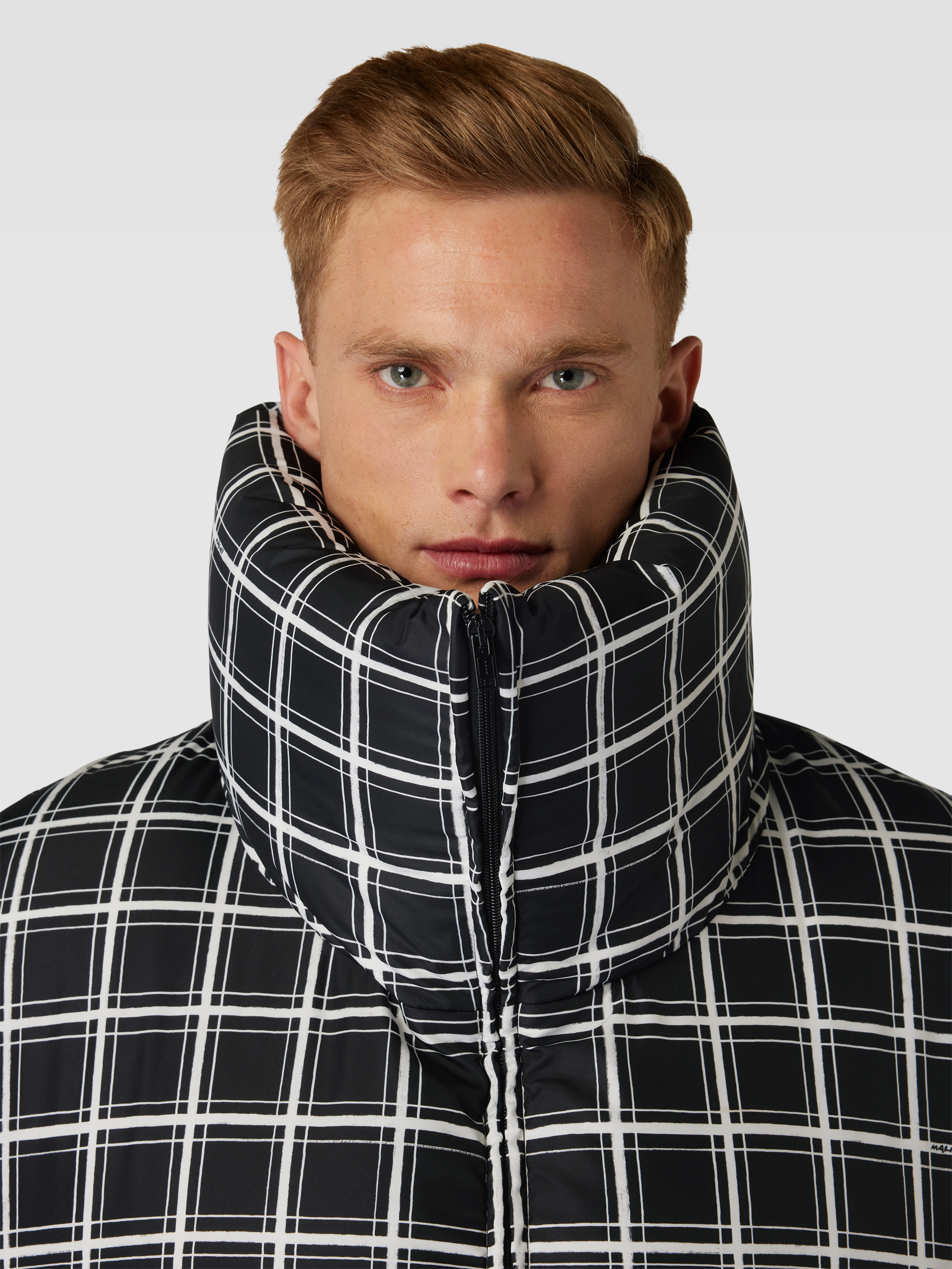 Die Herren Steppjacke von Marni zeigt sich mit lockerer Passform und markantem Karomuster. Der hohe Stehkragen hält den Hals angenehm warm, während seitliche Eingrifftaschen Platz für Kleinigkeiten bieten. Durch das zeitlose Design lässt sich die Steppjacke mit Karomuster vielseitig kombinieren.