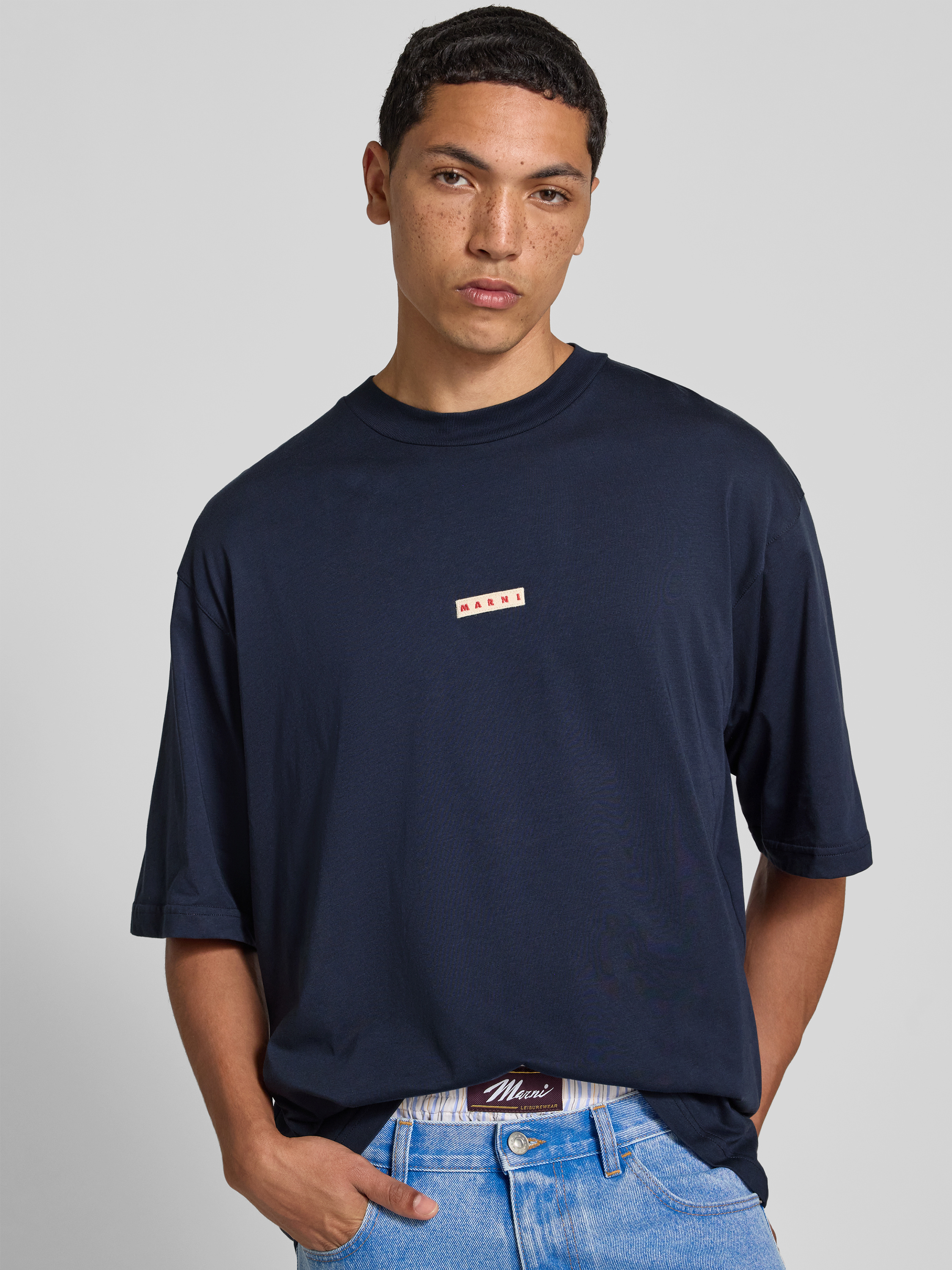 Das Herren T-Shirt von Marni aus reiner Baumwolle legt sich angenehm leicht auf die Haut und fällt durch seinen lockeren Schnitt besonders entspannt. Ein gerippter Rundhalsausschnitt sorgt für einen klassischen Akzent, während das dezente Label-Detail am Saum das Gesamtbild abrundet. Dank der komfortablen Passform eignet sich das T-Shirt sowohl für entspannte Freizeitmomente als auch für den Alltag.