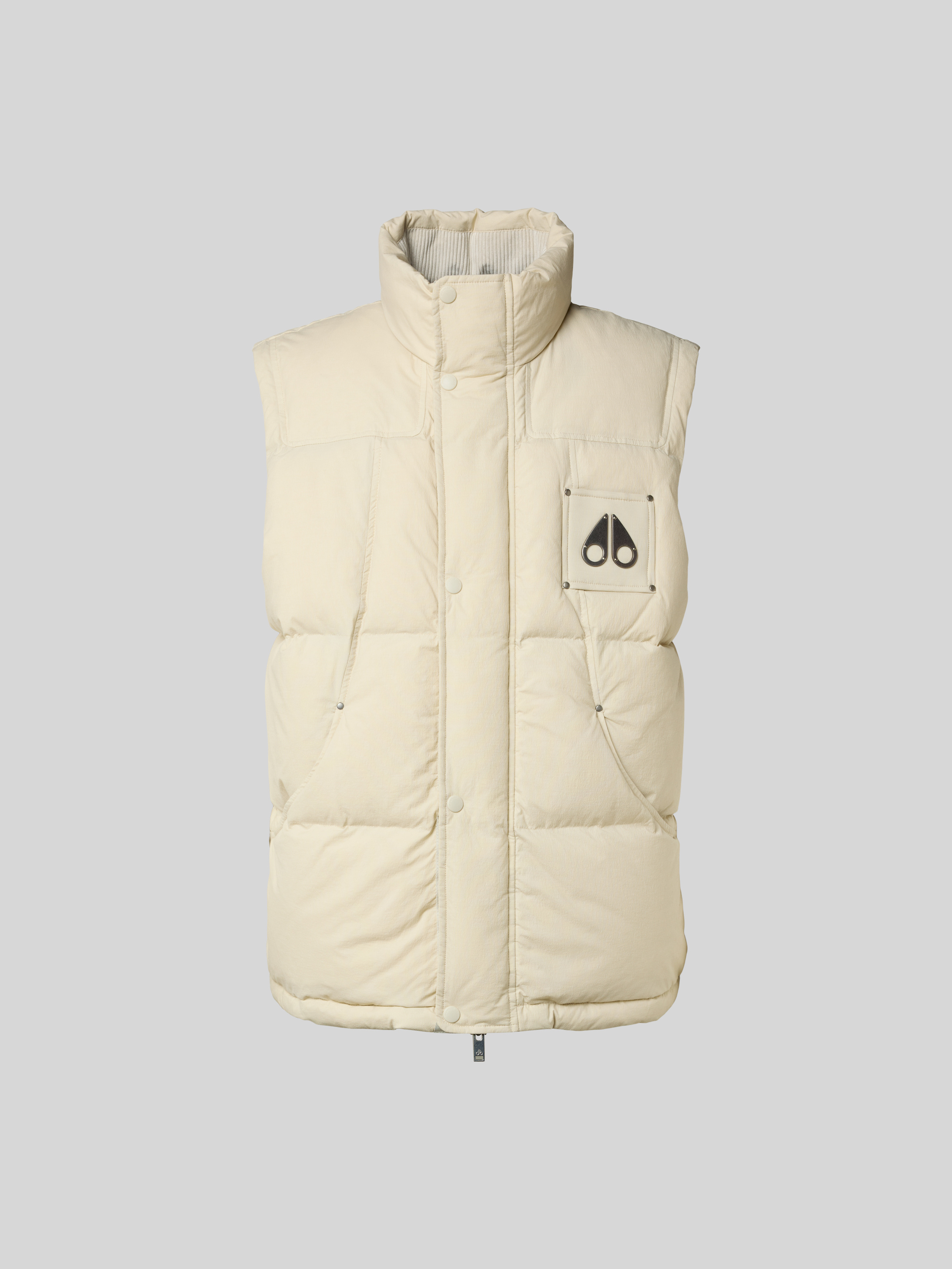 Die Herren Daunenweste von Moose Knuckles verbindet einen lässigen Regular Fit mit einem funktionalen Stehkragen. Durch den Material-Mix mit Baumwoll-Anteil fühlt sich die Weste angenehm an und sorgt für ein angenehmes Tragegefühl im Alltag. Praktische Details wie seitliche Eingrifftaschen runden das Design ab.