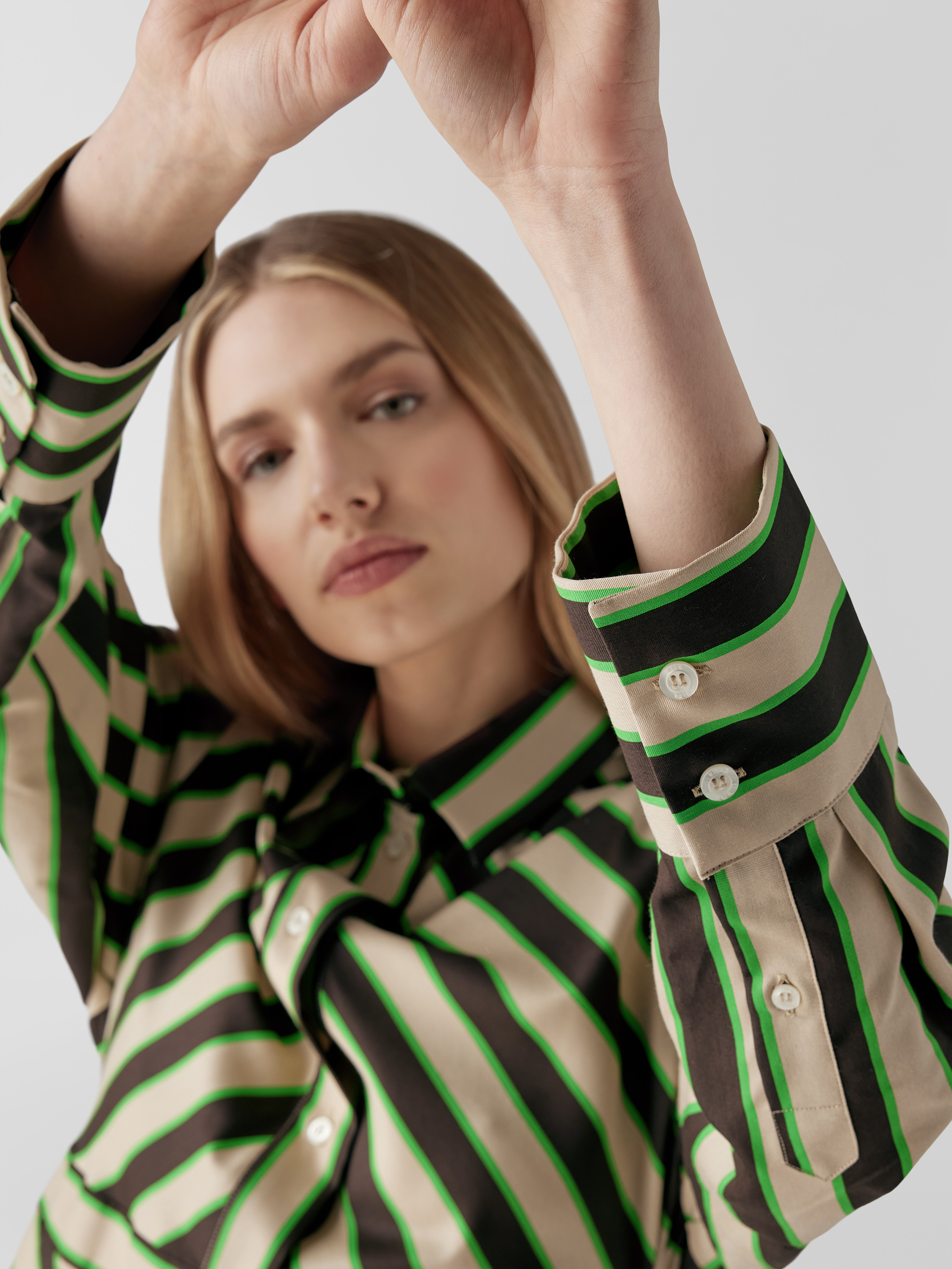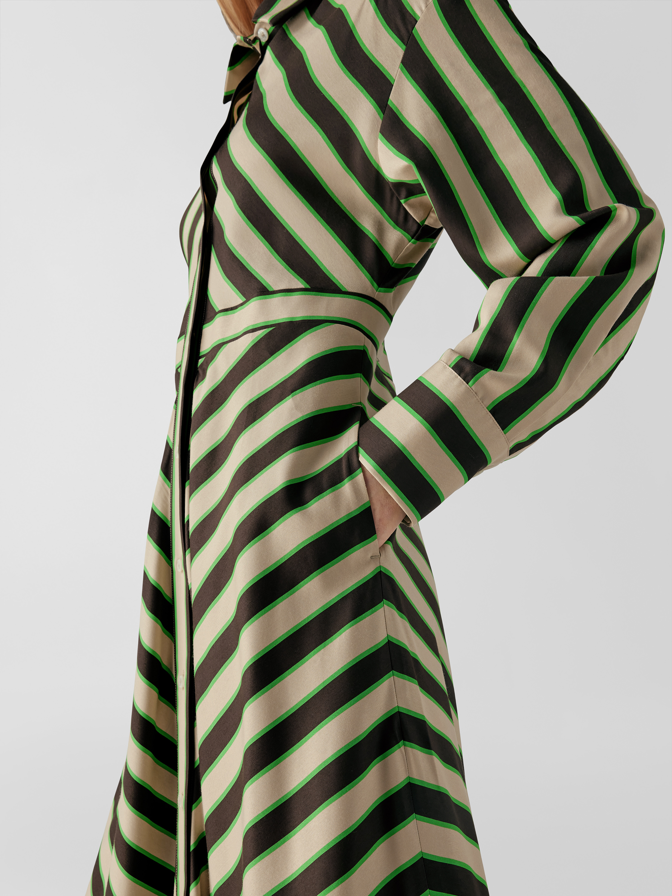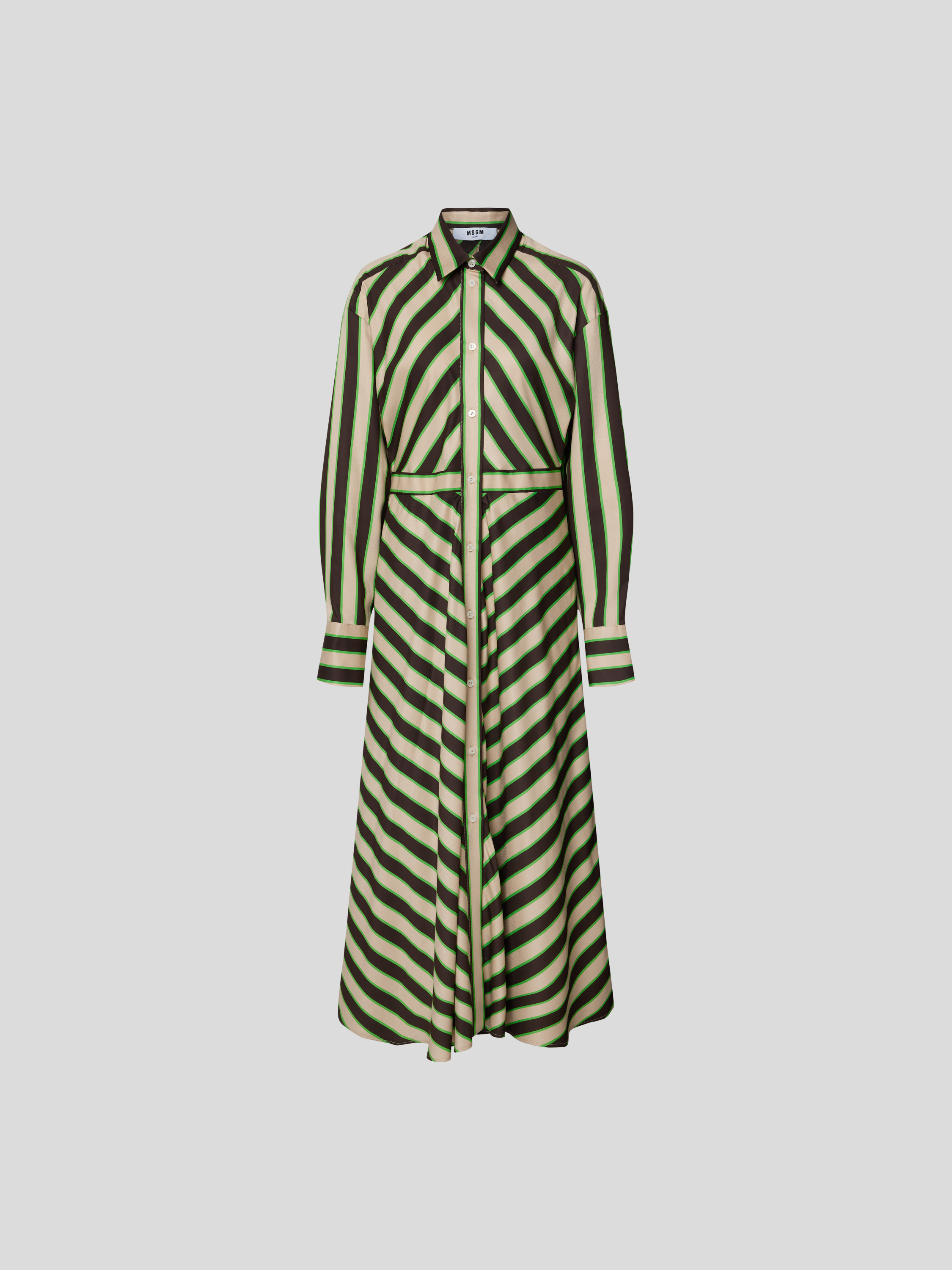 Das Maxikleid mit Streifenmuster von MSGM zeigt sich in einer geraden Passform und umspielt angenehm die Silhouette. Dank des Viskose-Mix fällt das Material weich und sorgt für ein luftiges Tragegefühl, während die langen Ärmel auch an kühleren Tagen Komfort schenken. Eingrifftaschen runden das Design praktisch ab.