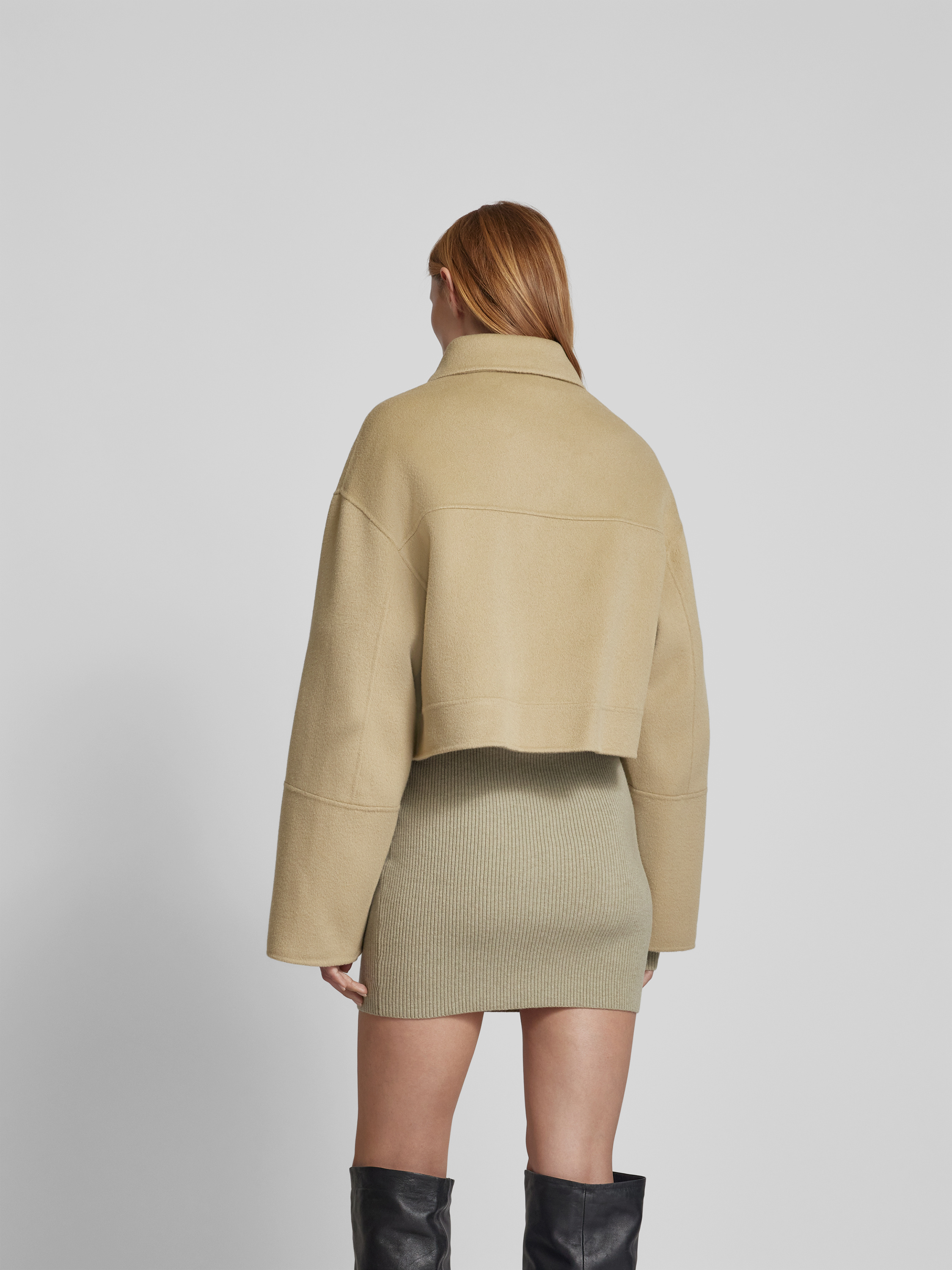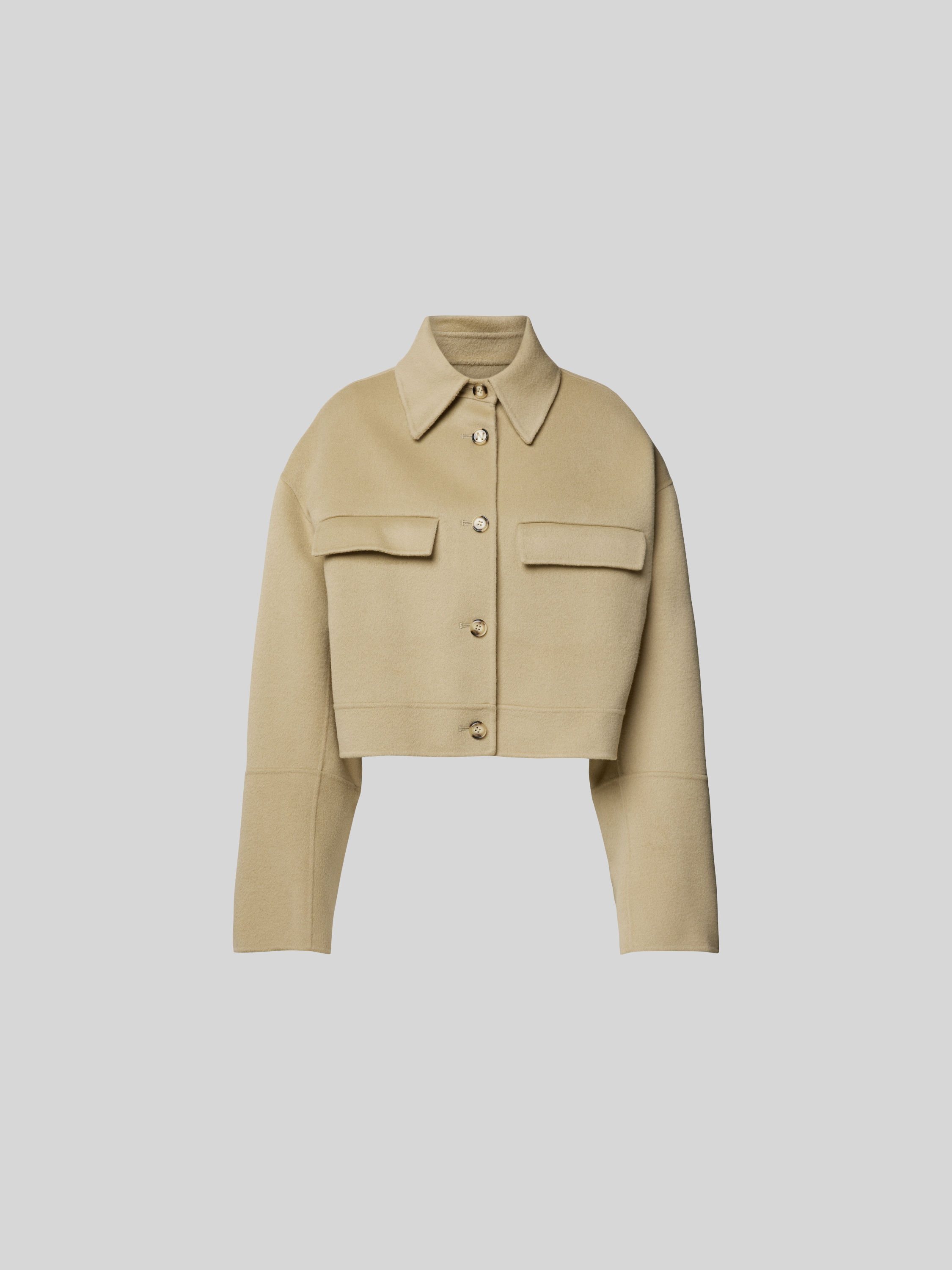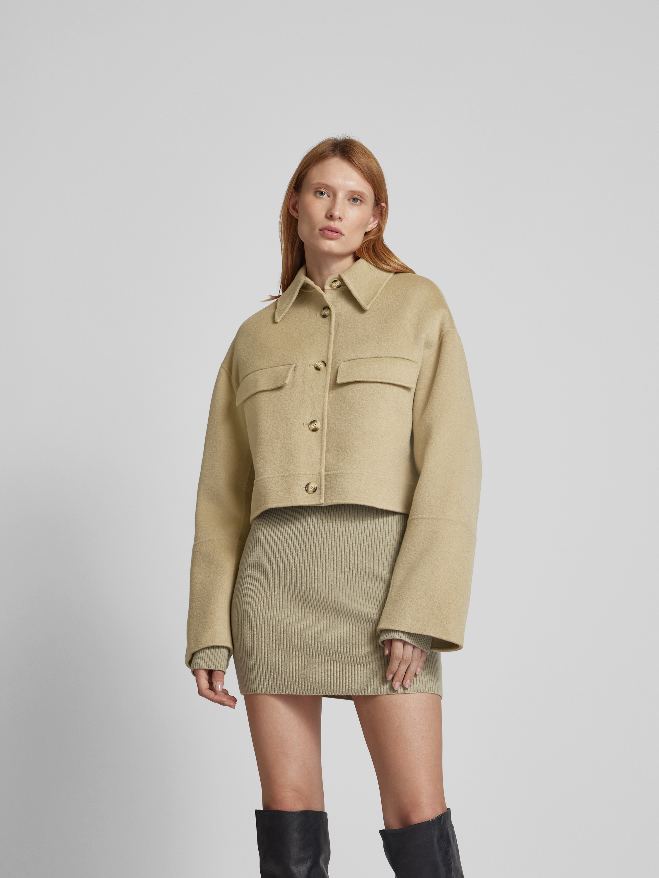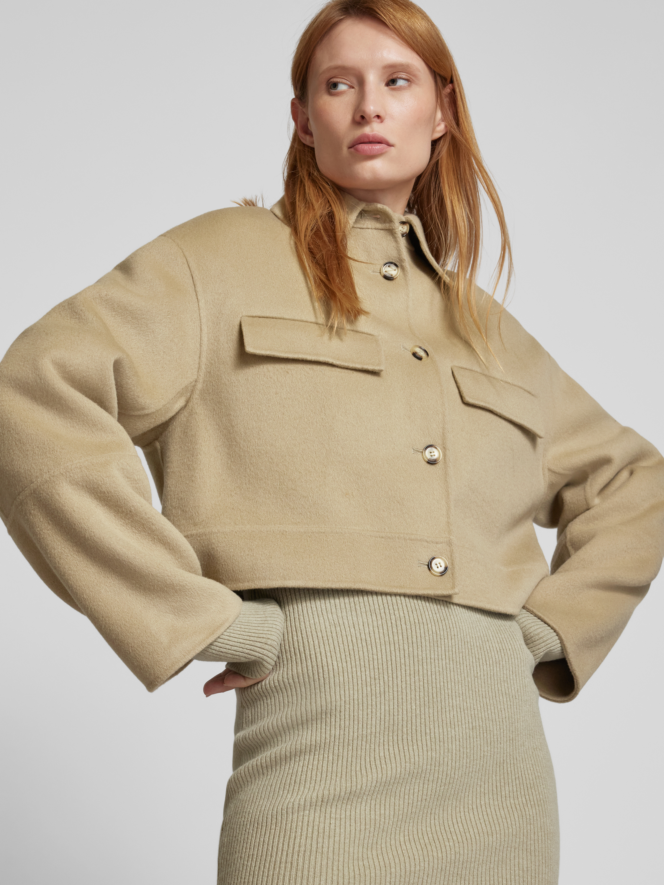 Die Cropped Jacke mit Umlegekragen von Nanushka verbindet einen angenehmen Woll-Seide-Mix mit einem lässigen Regular Fit. Durch den verkürzten Schnitt wirkt der Look modern, während der Umlegekragen klassische Akzente setzt. So eignet sich die Jacke für vielseitige Outfits im Alltag.