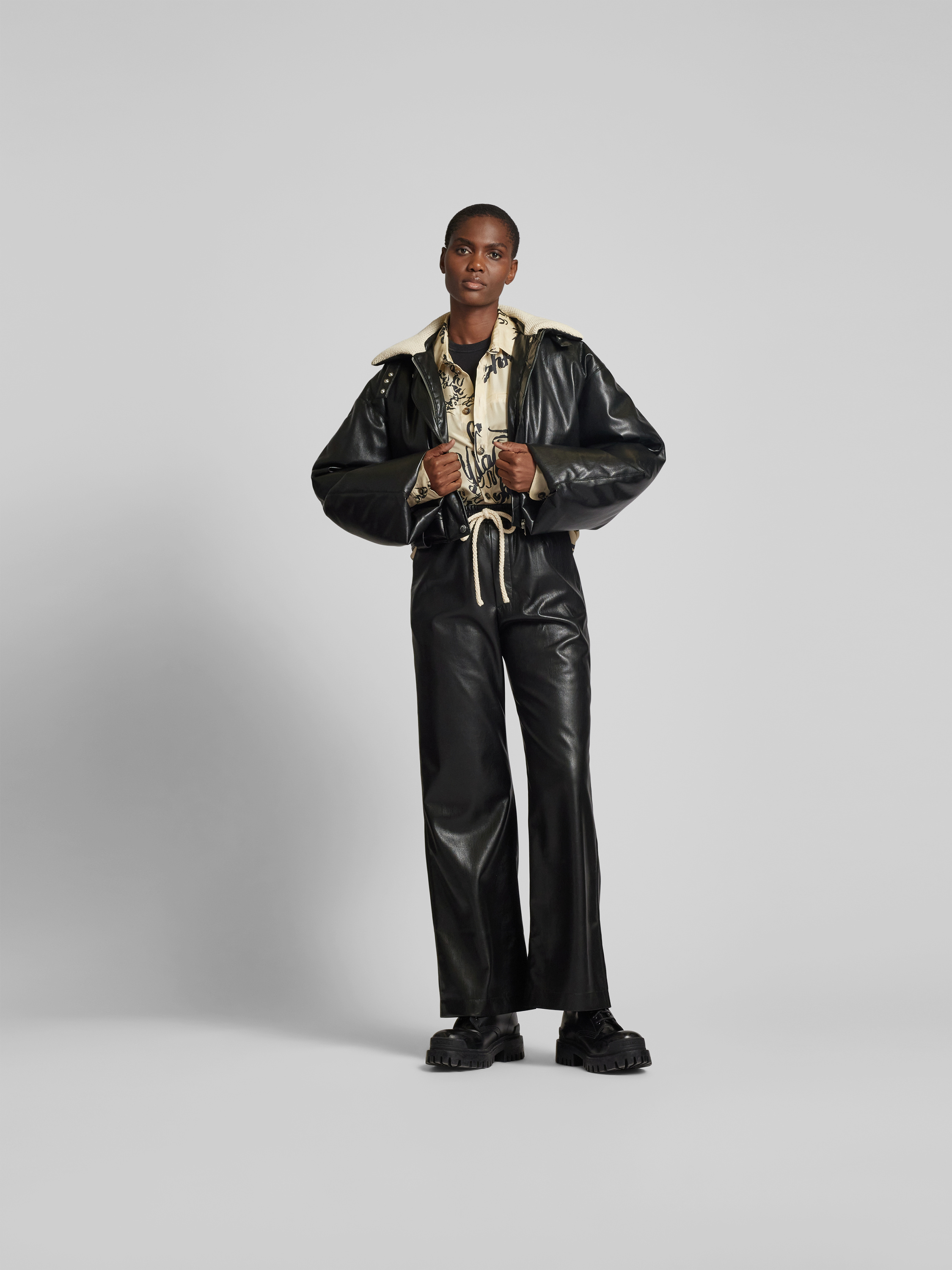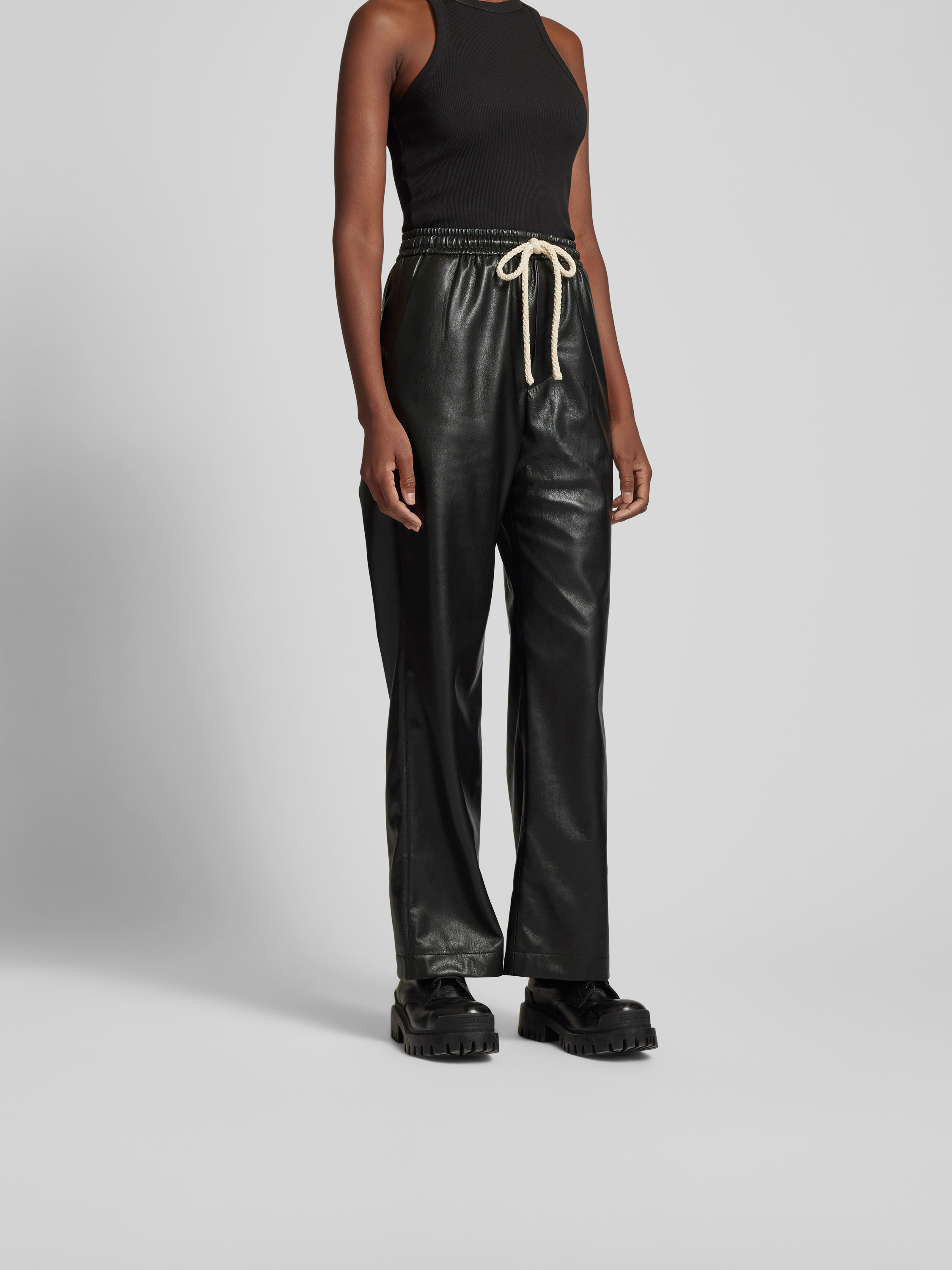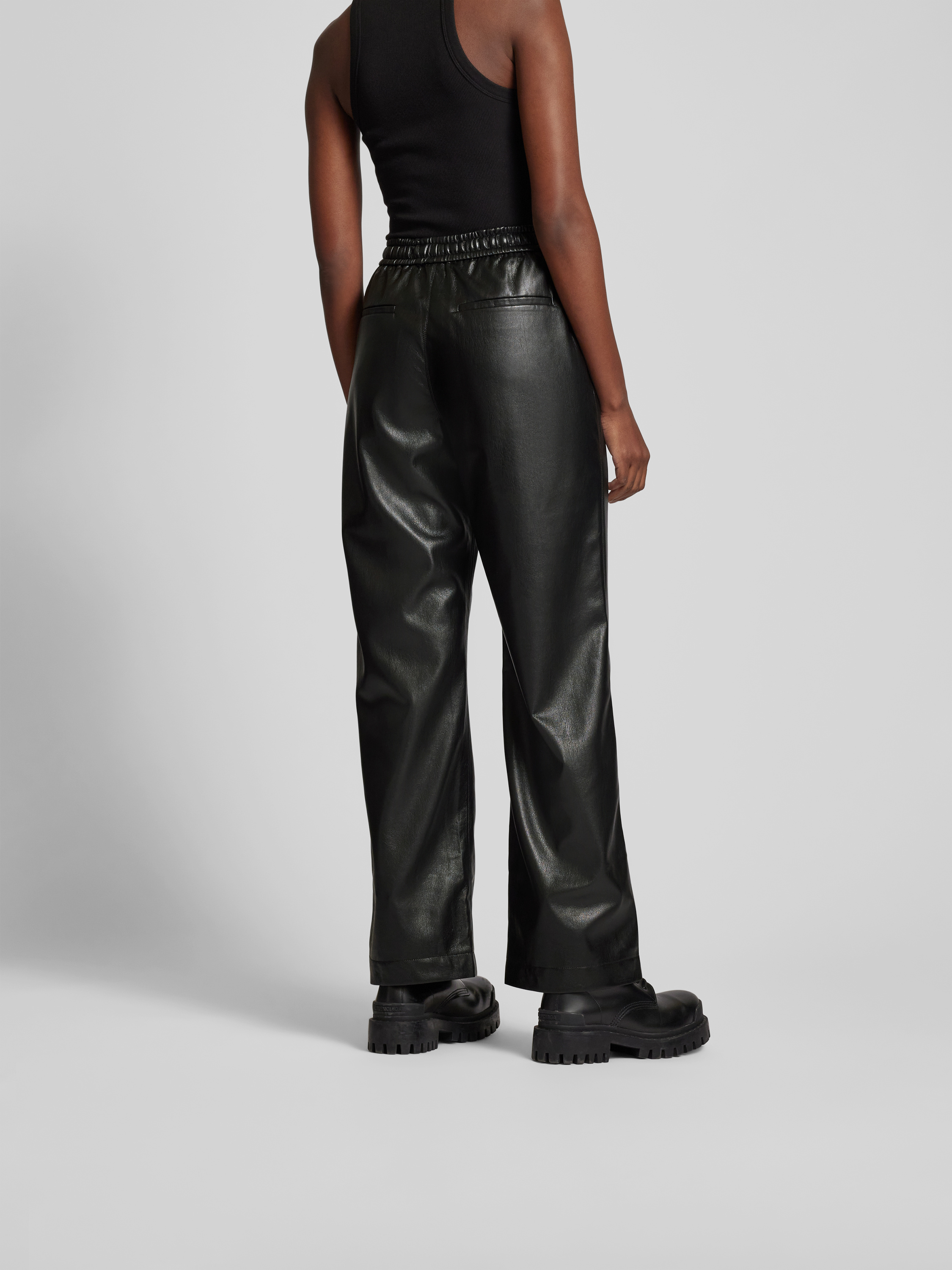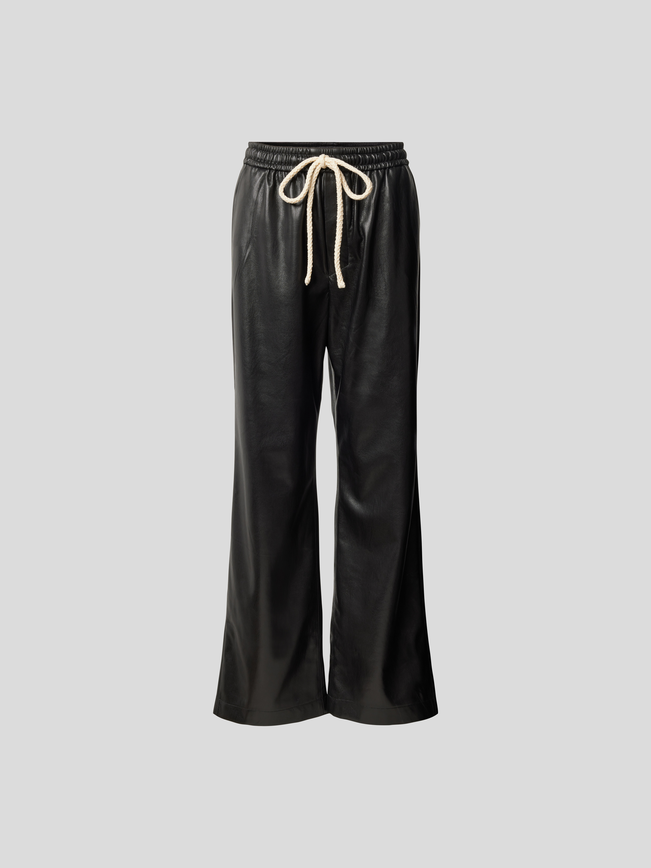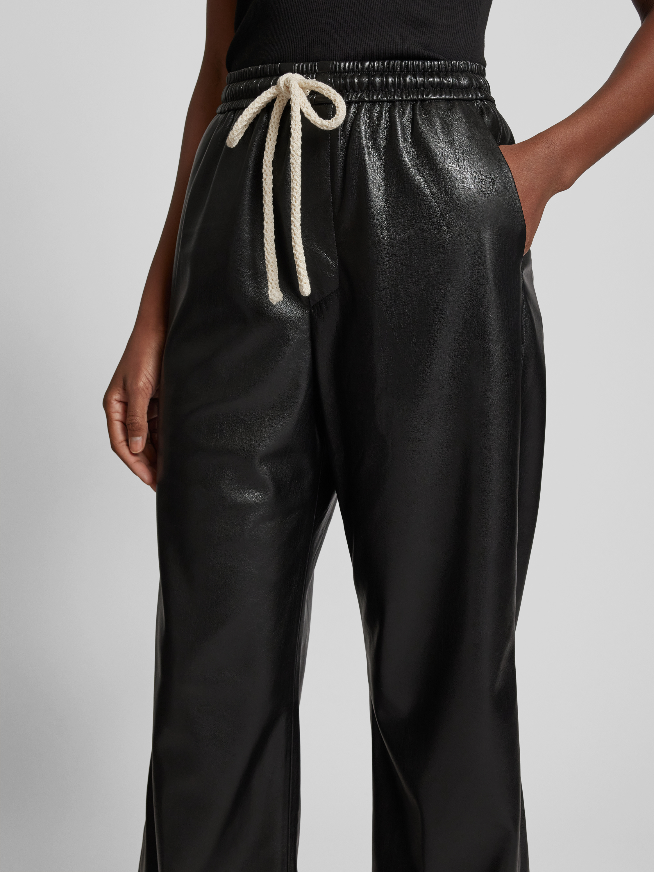 Die Damen Hose von Nanushka zeigt sich im Loose Fit und bringt durch das ausgestellte Bein eine angenehme Bewegungsfreiheit mit. Dank elastischem Bund und Tunnelzug passt sich die Hose in Leder-Optik unkompliziert an verschiedene Bedürfnisse an. Ihr geschmeidiges Material sorgt für ein entspanntes Tragegefühl im Alltag.