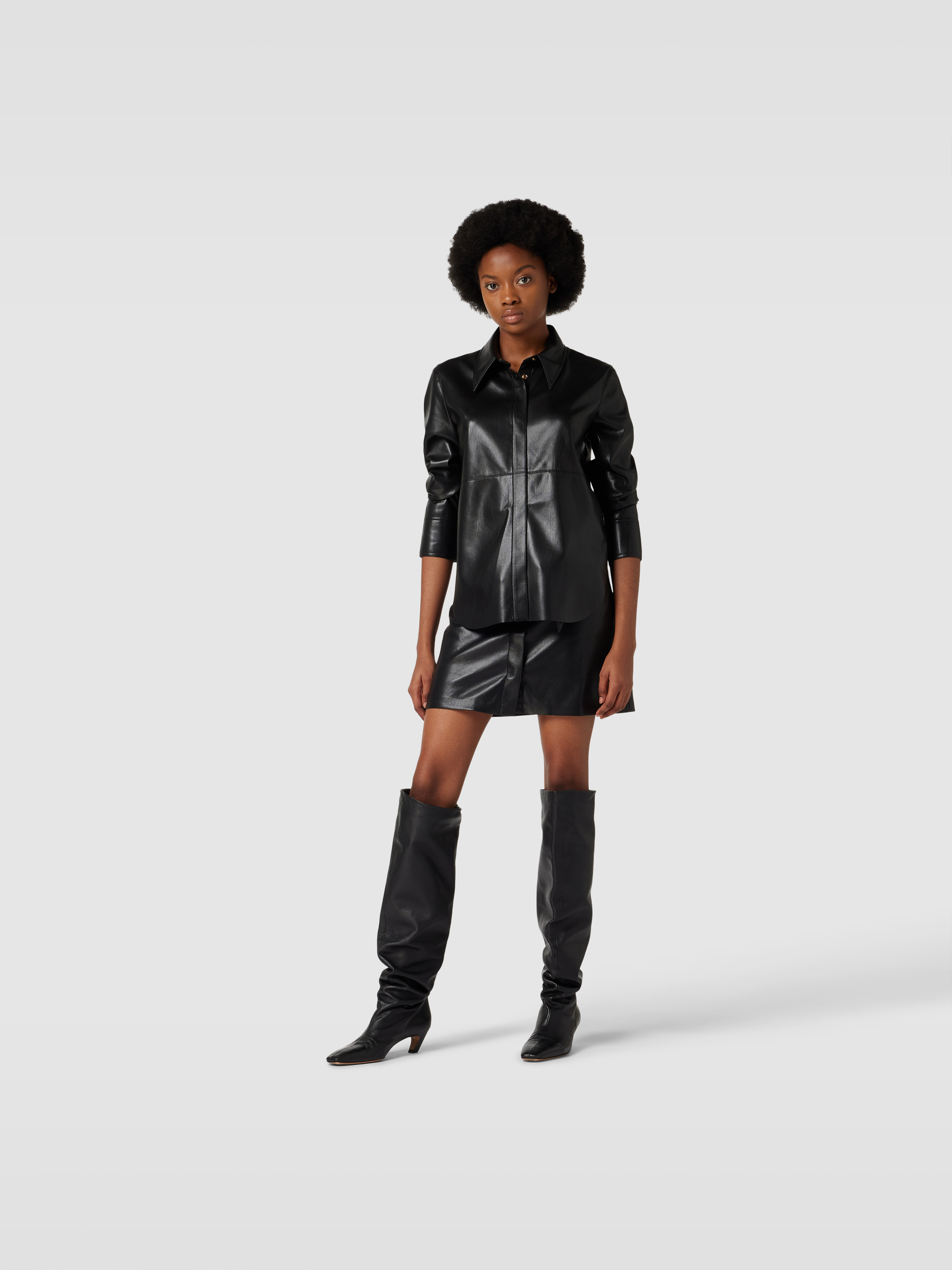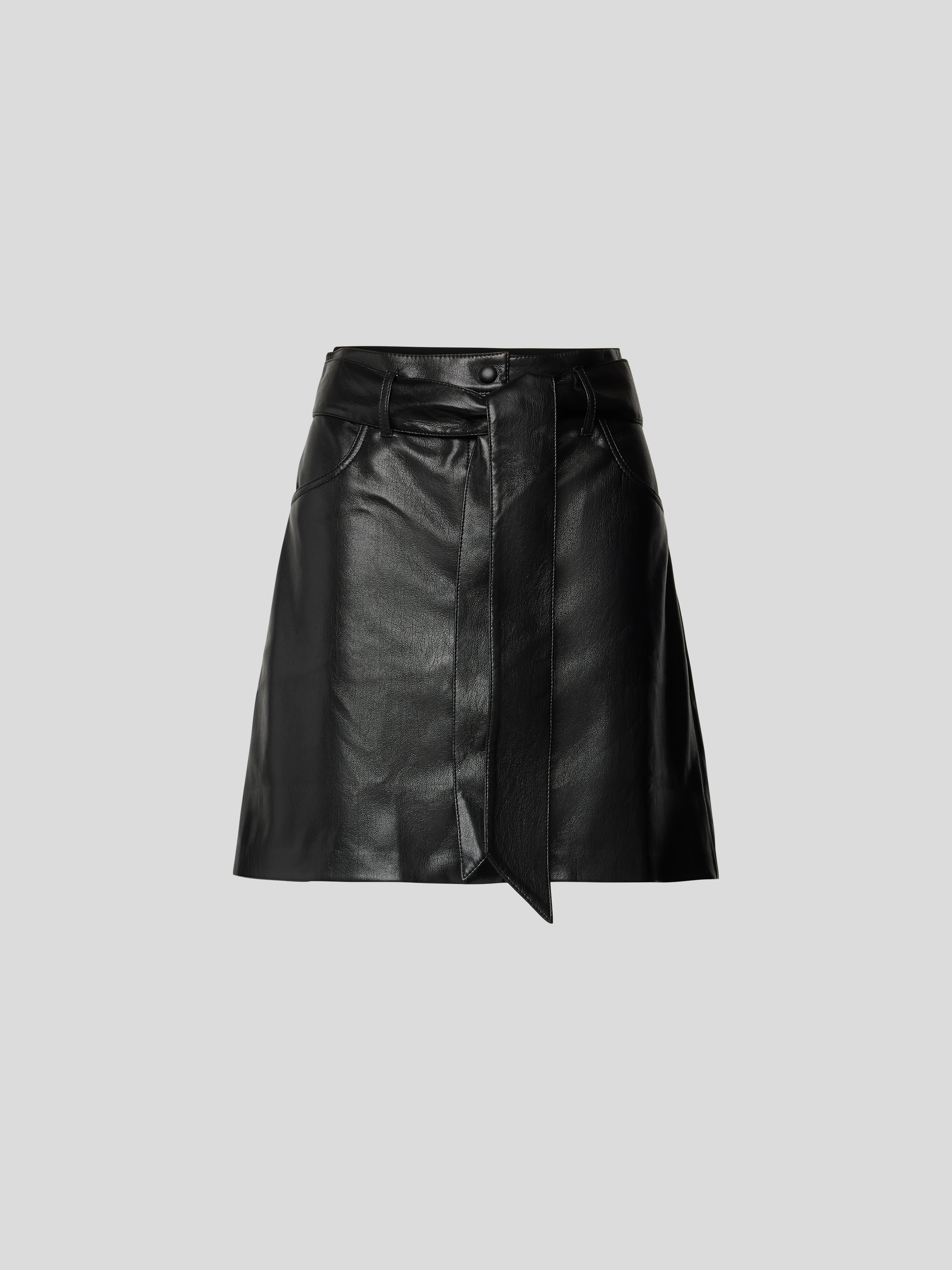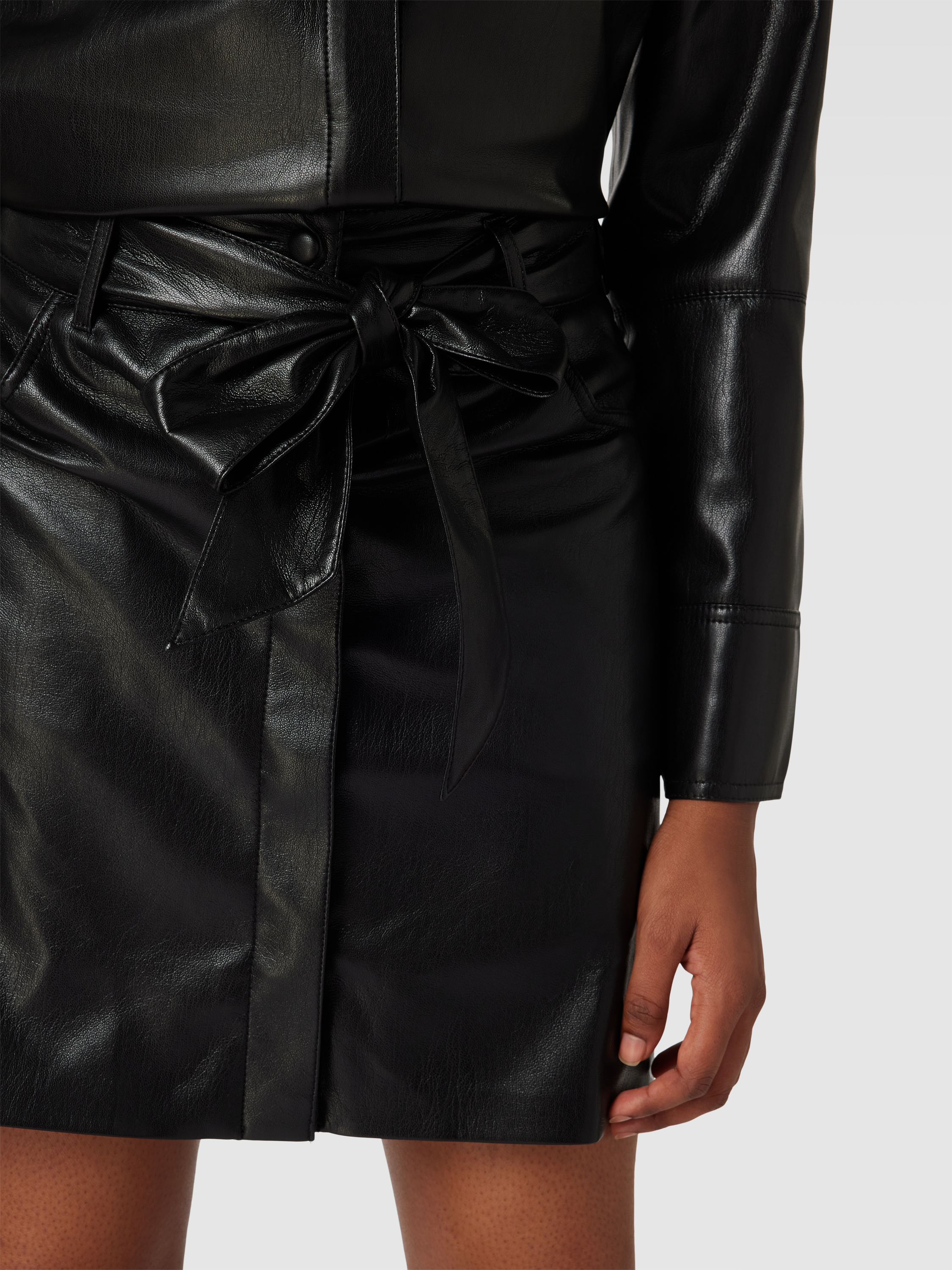 Der Minirock von Nanushka fällt durch seine A-Linie und die Leder-Optik auf, wodurch er vielseitig kombinierbar bleibt. Die praktische Länge und die Eingrifftaschen erlauben Bewegungsfreiheit im Alltag. Durch den Bund mit Gürtel lässt sich die Passform unkompliziert variieren.