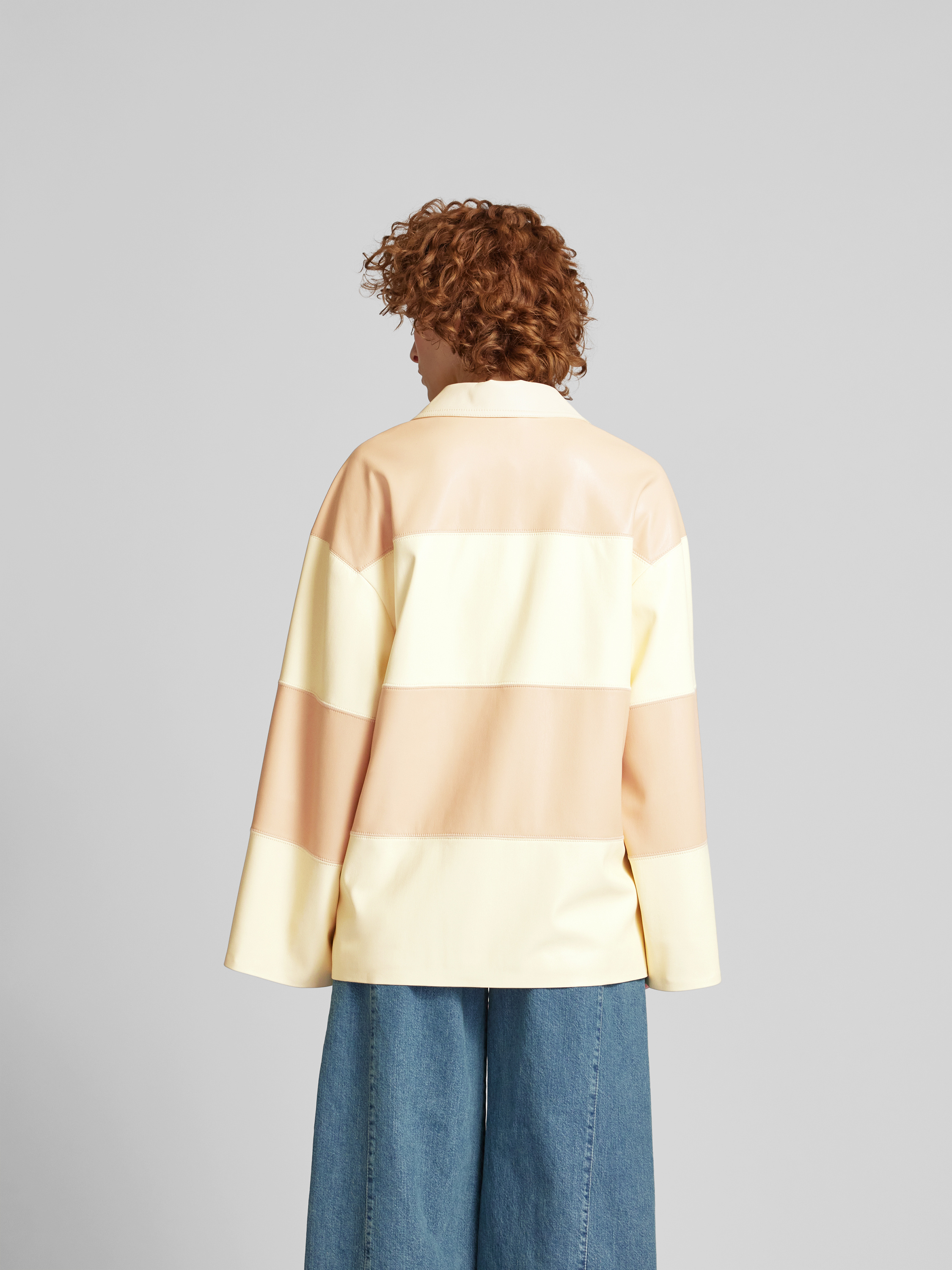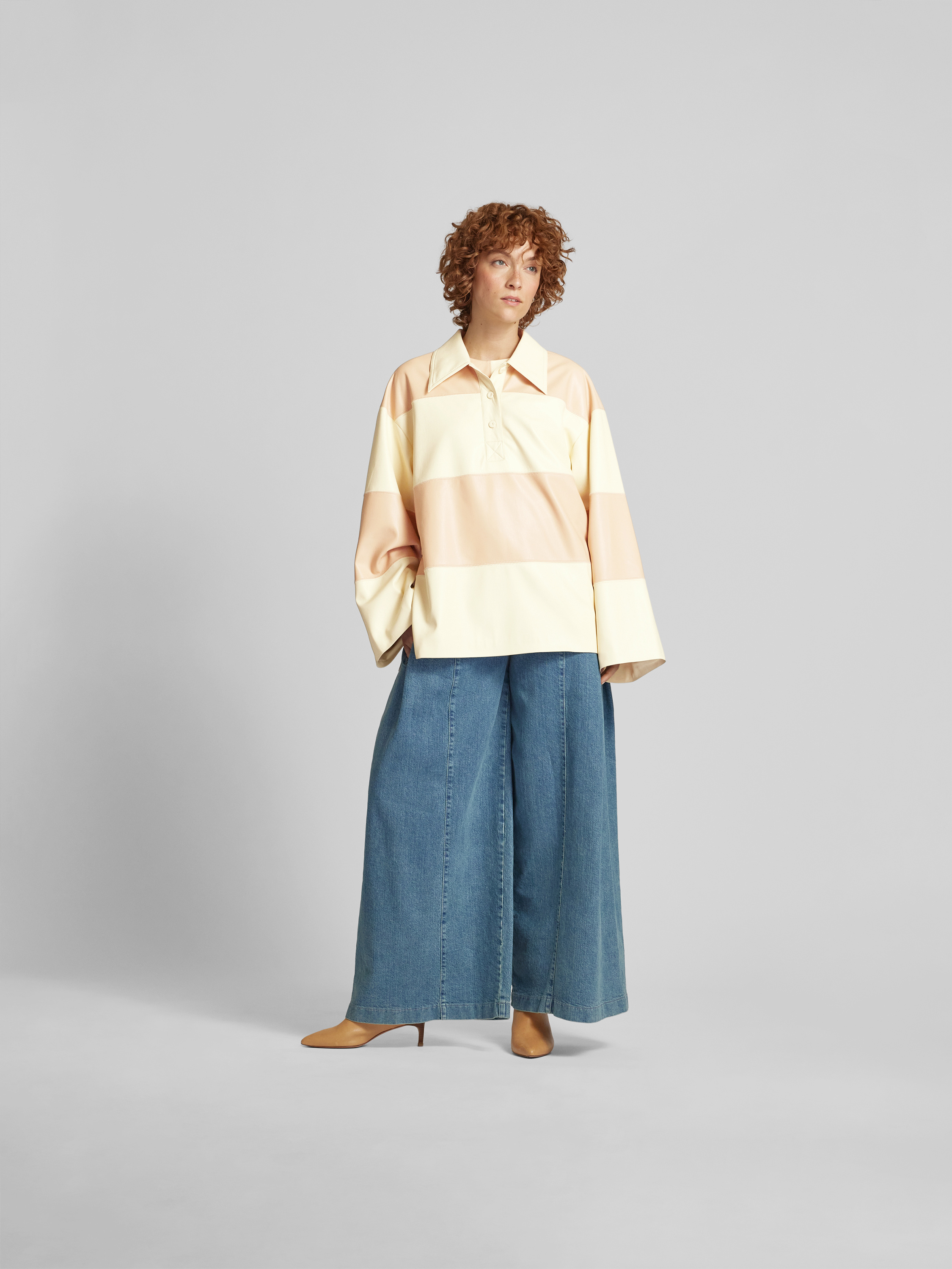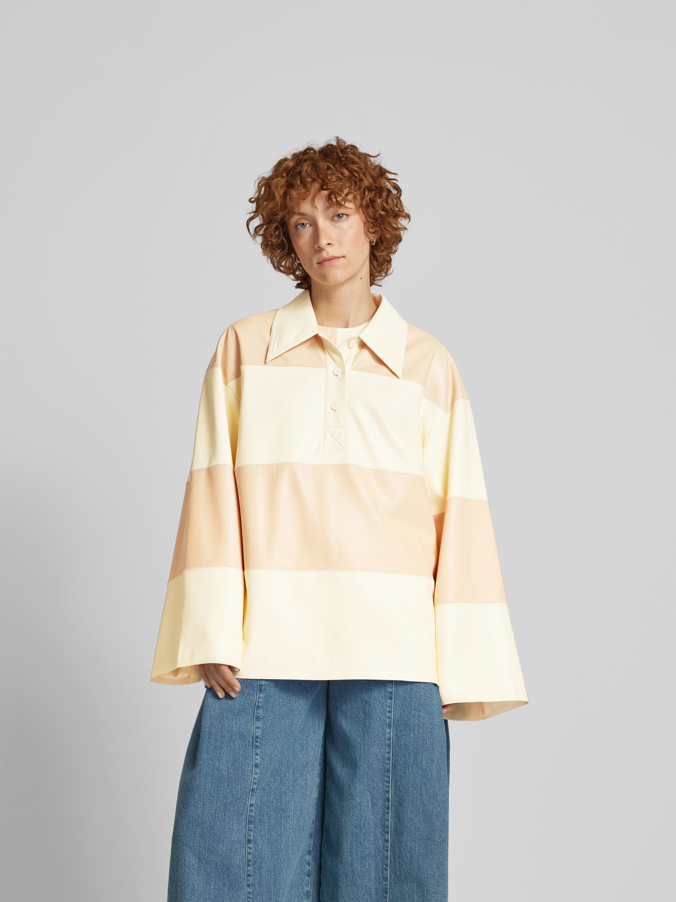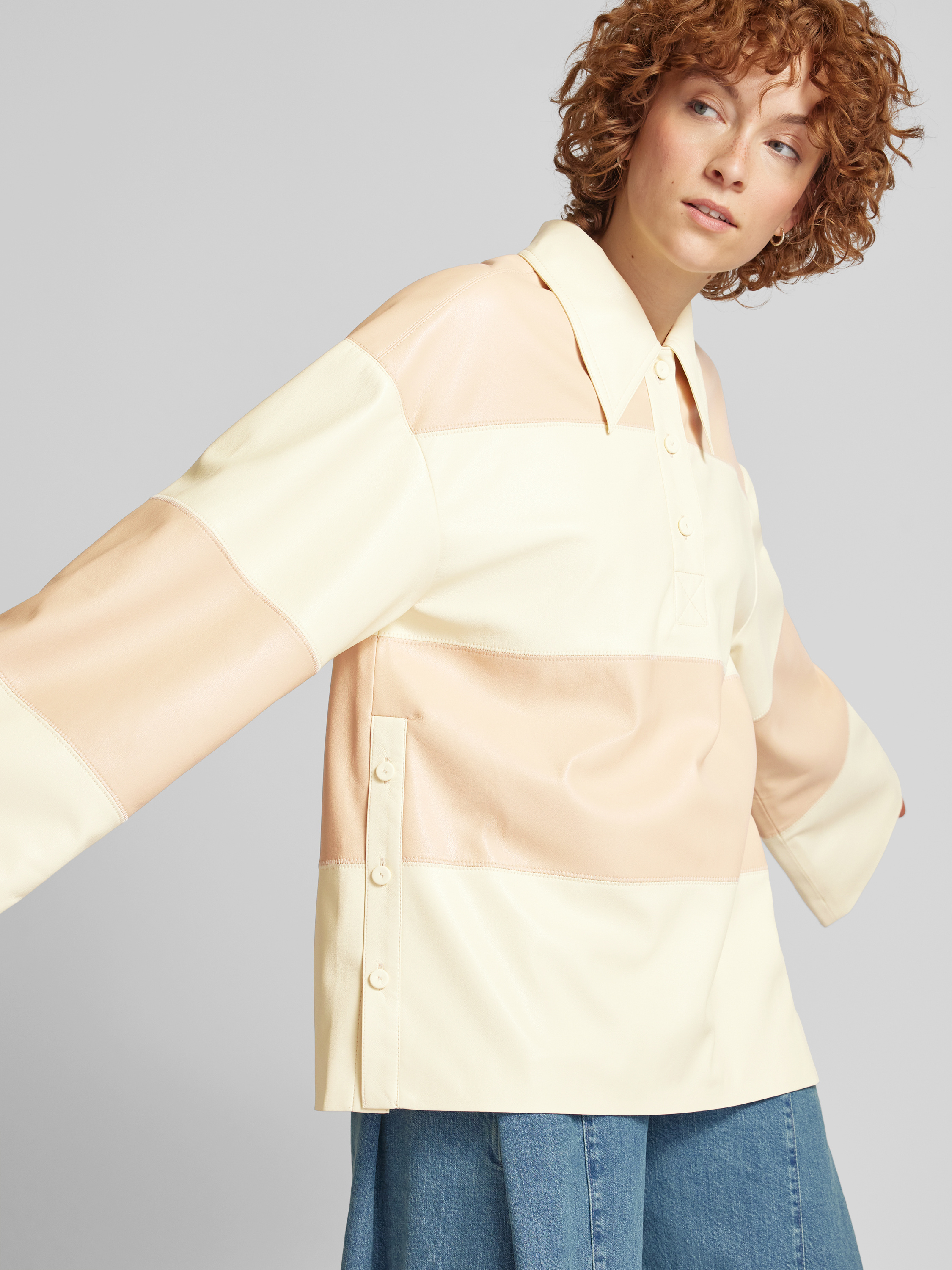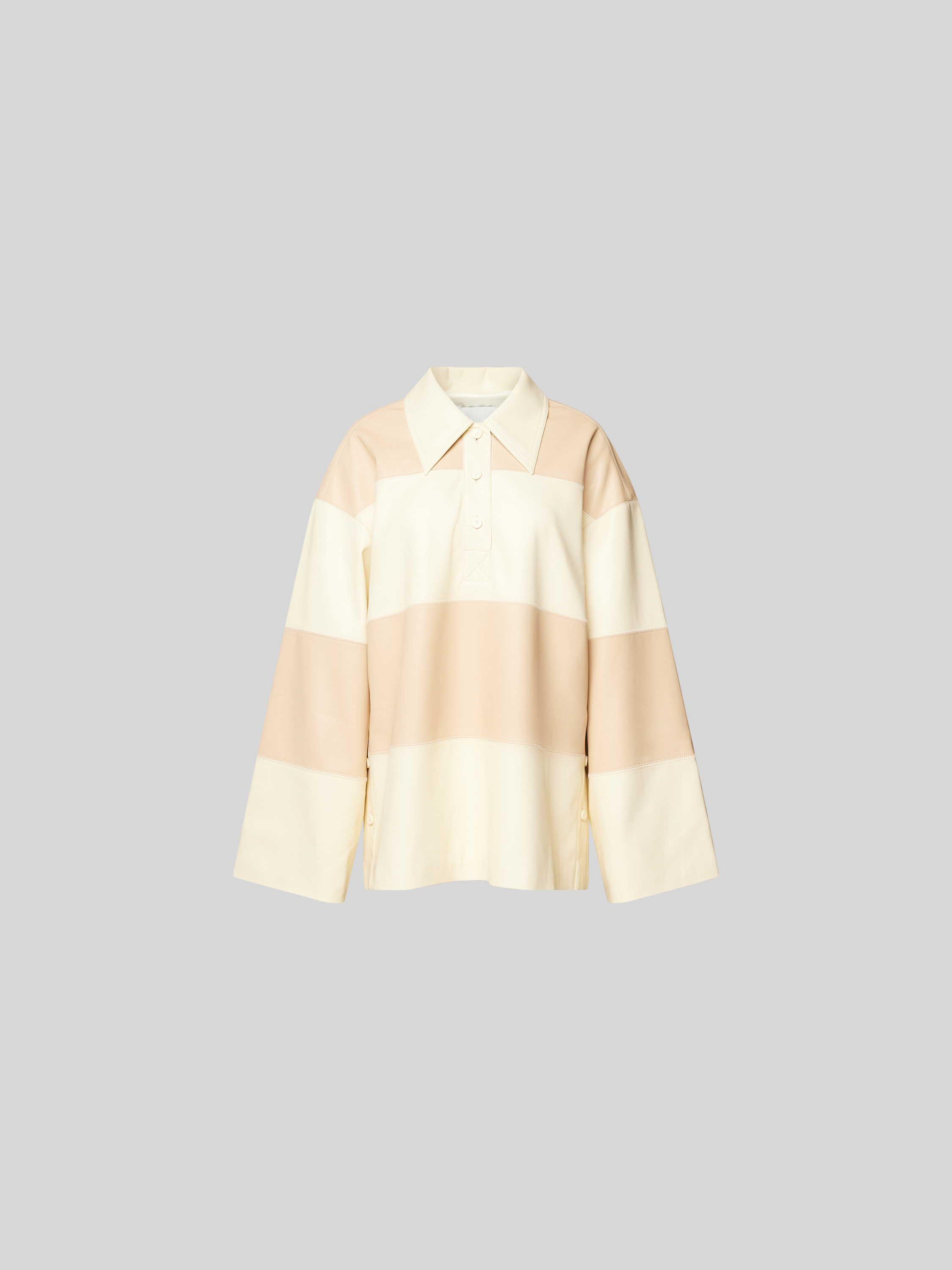 Das Damen-Oversized Longsleeve von Nanushka fällt durch sein markantes Streifenmuster und den klassischen Polokragen auf. Die lockere Passform sorgt für angenehme Bewegungsfreiheit, während die Trompetenärmel dem Look eine besondere Note verleihen. So eignet sich das Shirt für entspannte und vielseitige Outfits.