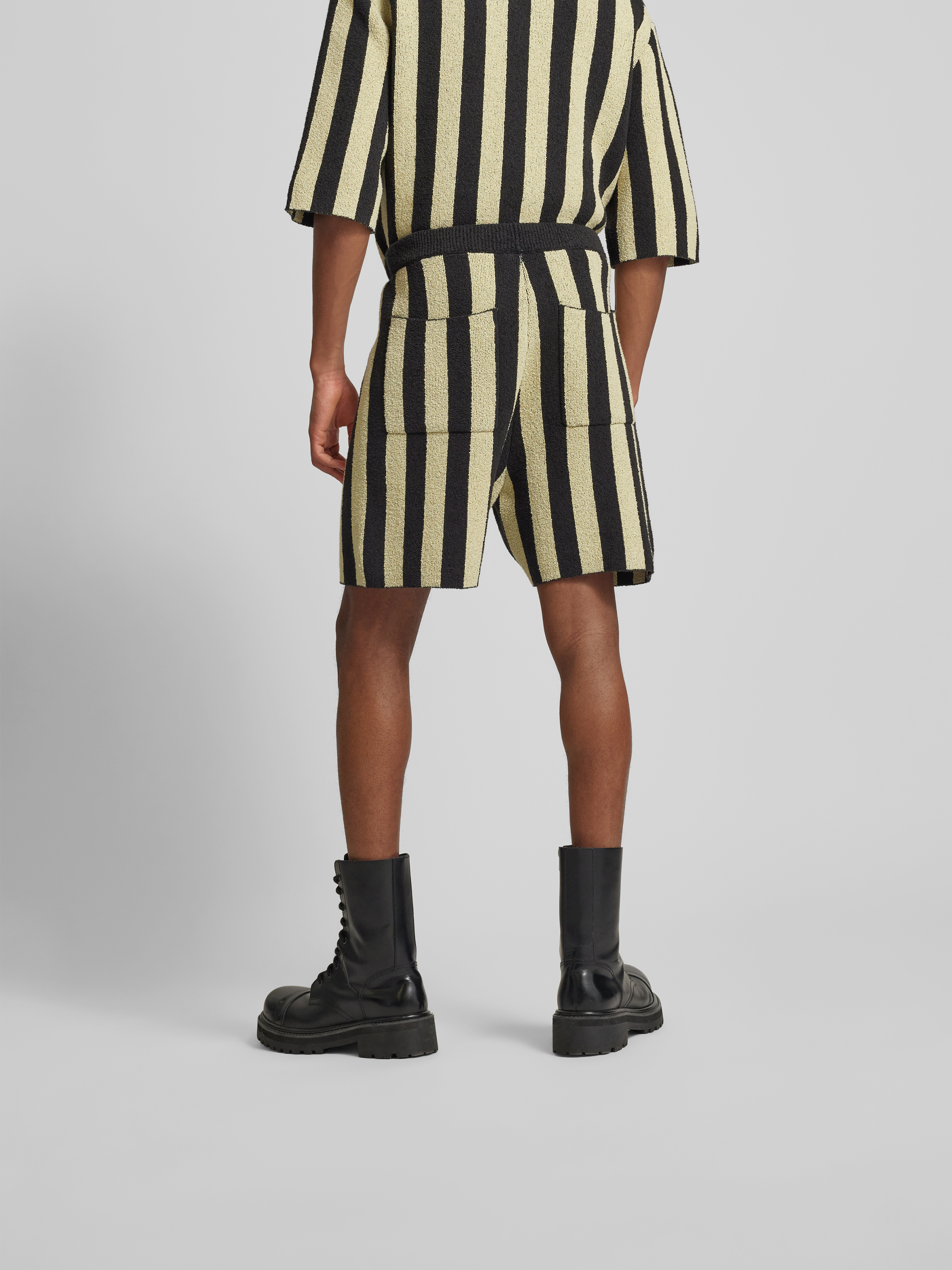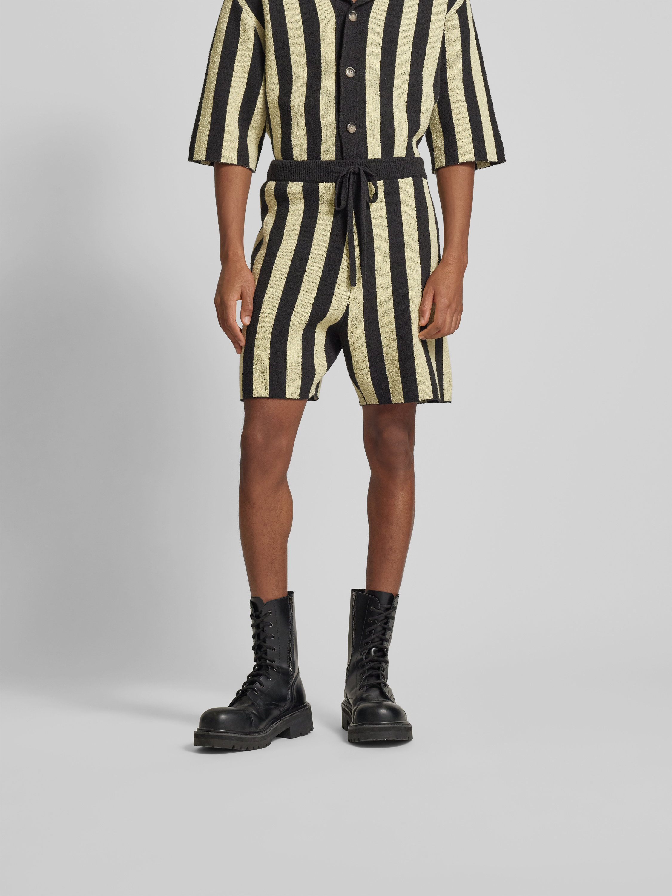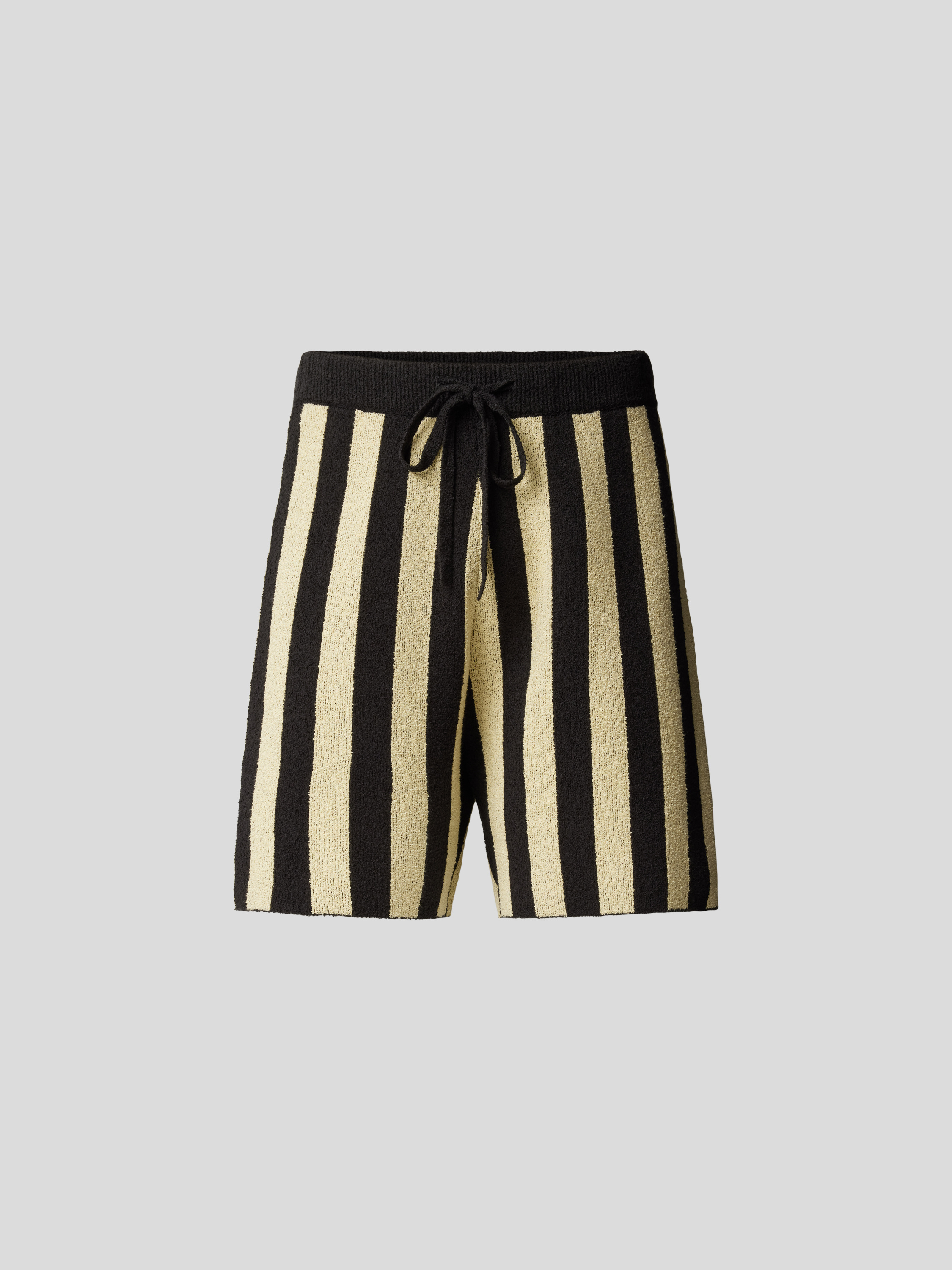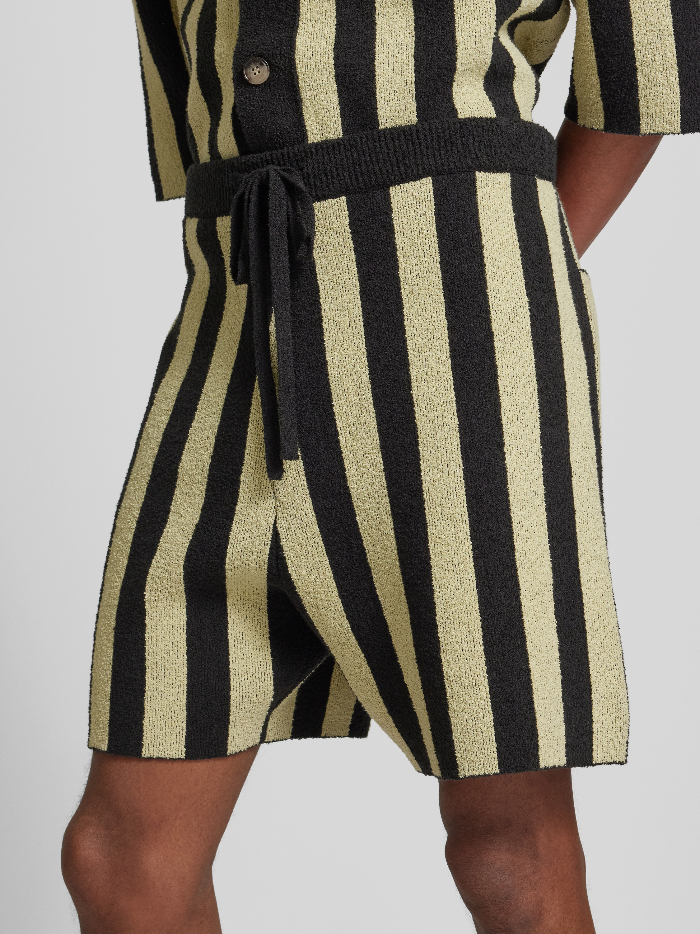 Die Herren Shorts von Nanushka fallen durch ihr Streifenmuster und den lockeren Schnitt angenehm auf. Dank des soften Frottee-Materials trägt sich die Shorts aus Frottee besonders leicht. Der Bund mit Tunnelzug sorgt dafür, dass Bewegungsfreiheit jederzeit gewahrt bleibt.