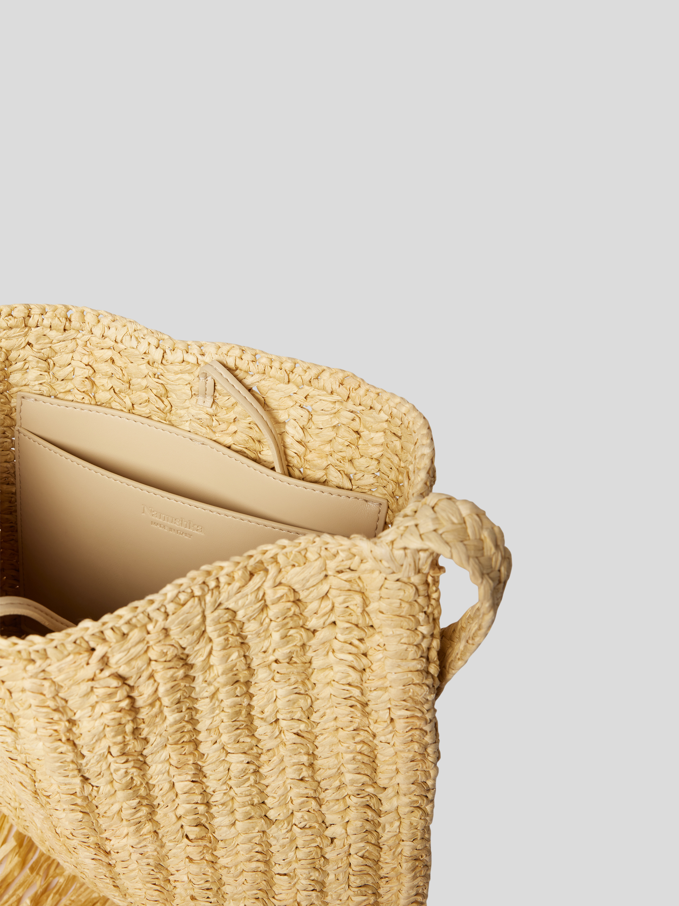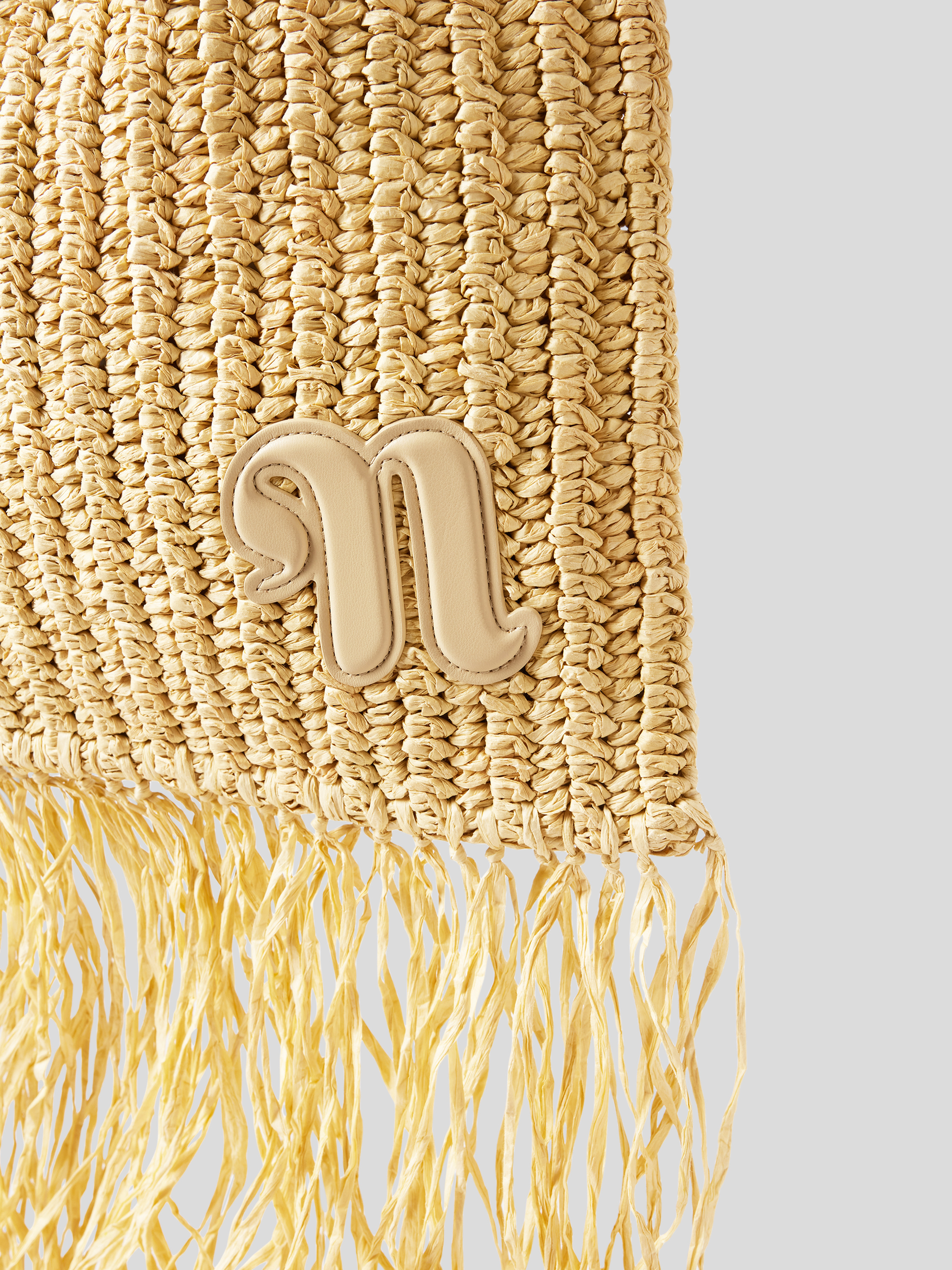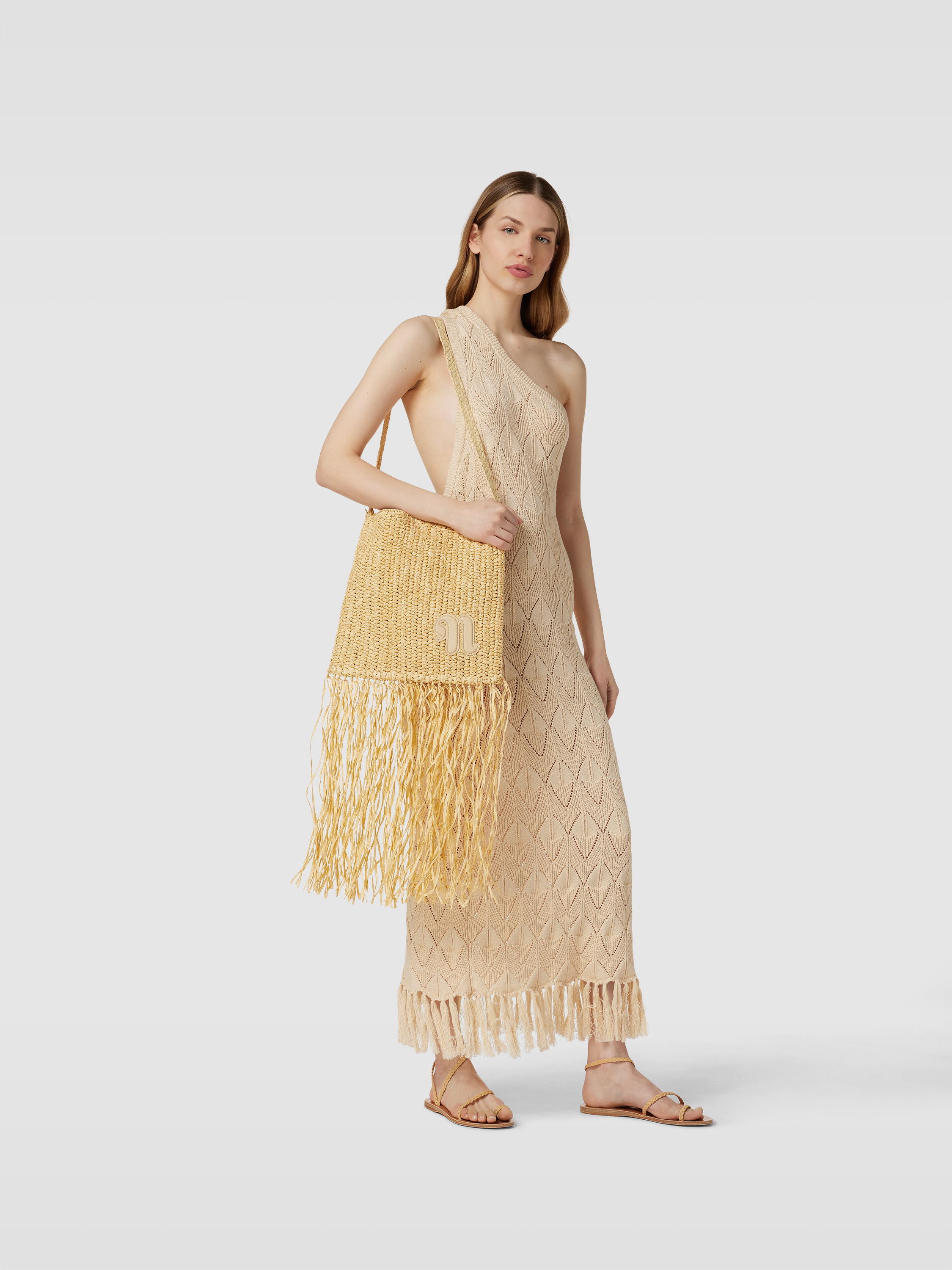 Die Strandtasche von Nanushka aus reinem Bast fällt durch ihr lockeres Design und das dezente Label-Detail auf. Mit den angenehm breiten Schulterriemen lässt sich Gepäck bequem tragen, während innen praktische Steckfächer Ordnung schaffen. So eignet sich die Tasche für entspannte Tage am Wasser.