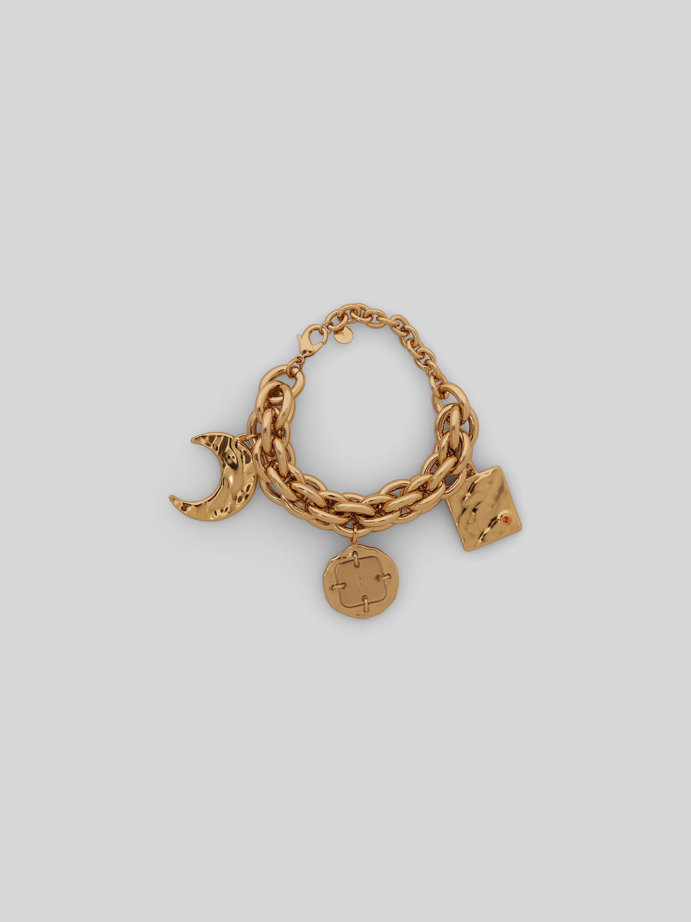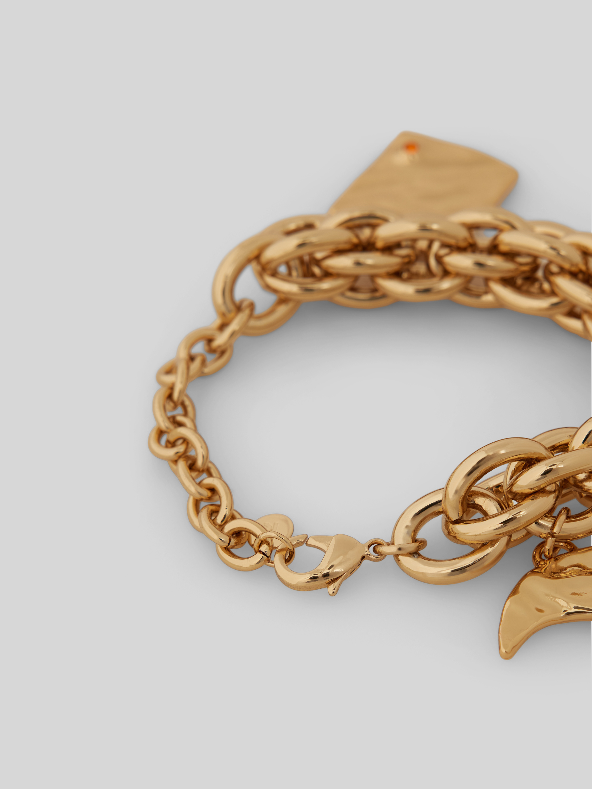 Das Damen Armband von Rabanne fällt durch seine glänzende Metallic-Oberfläche und die feinen Motiv-Anhänger auf, die geschickt in die Gliederketten-Optik eingearbeitet sind. Gefertigt aus reinem Messing, liegt es angenehm am Handgelenk und ergänzt verschiedenste Outfits mühelos. Mit seinem Hakenverschluss lässt sich das Armband unkompliziert anlegen und wieder abnehmen.