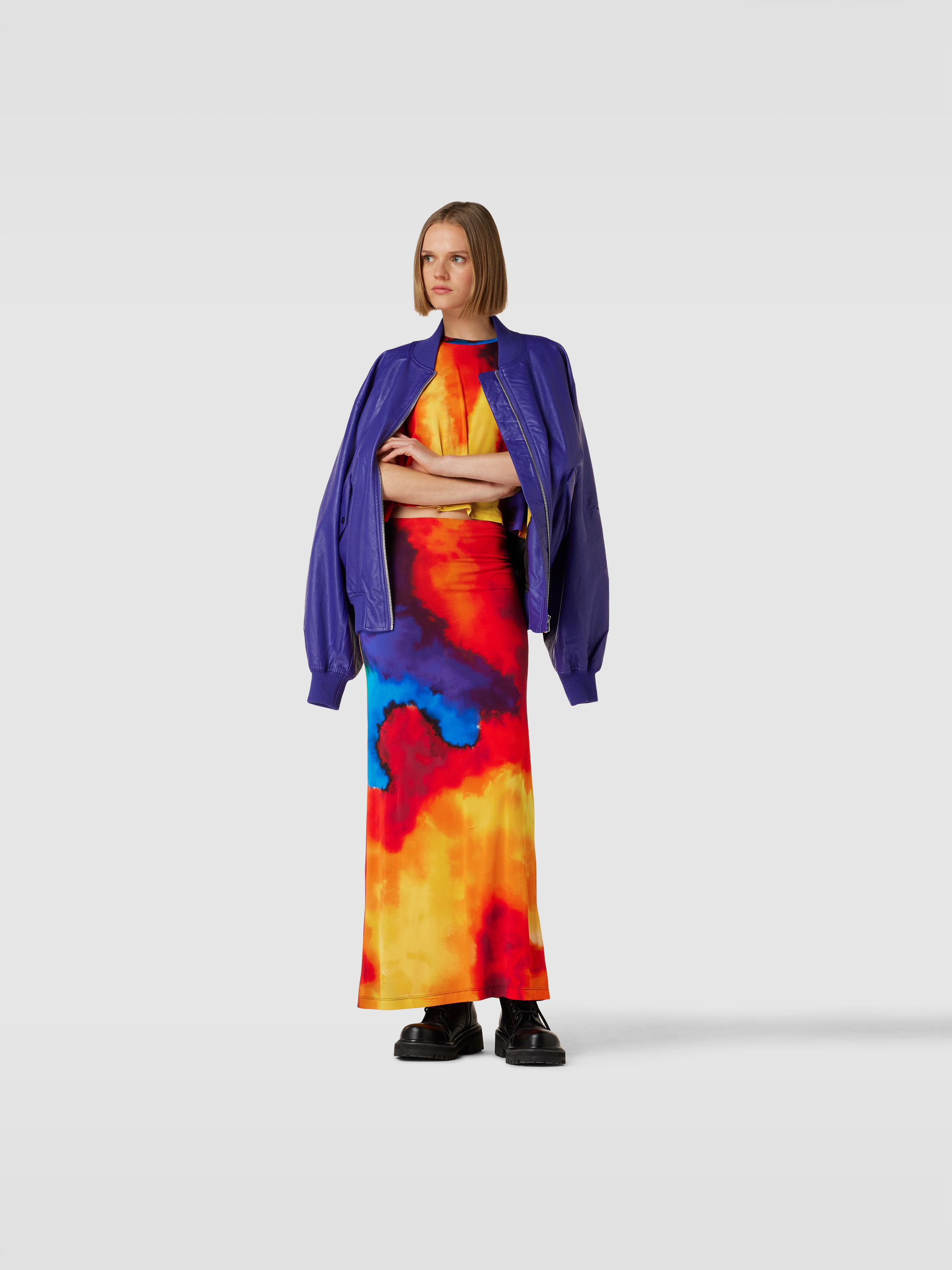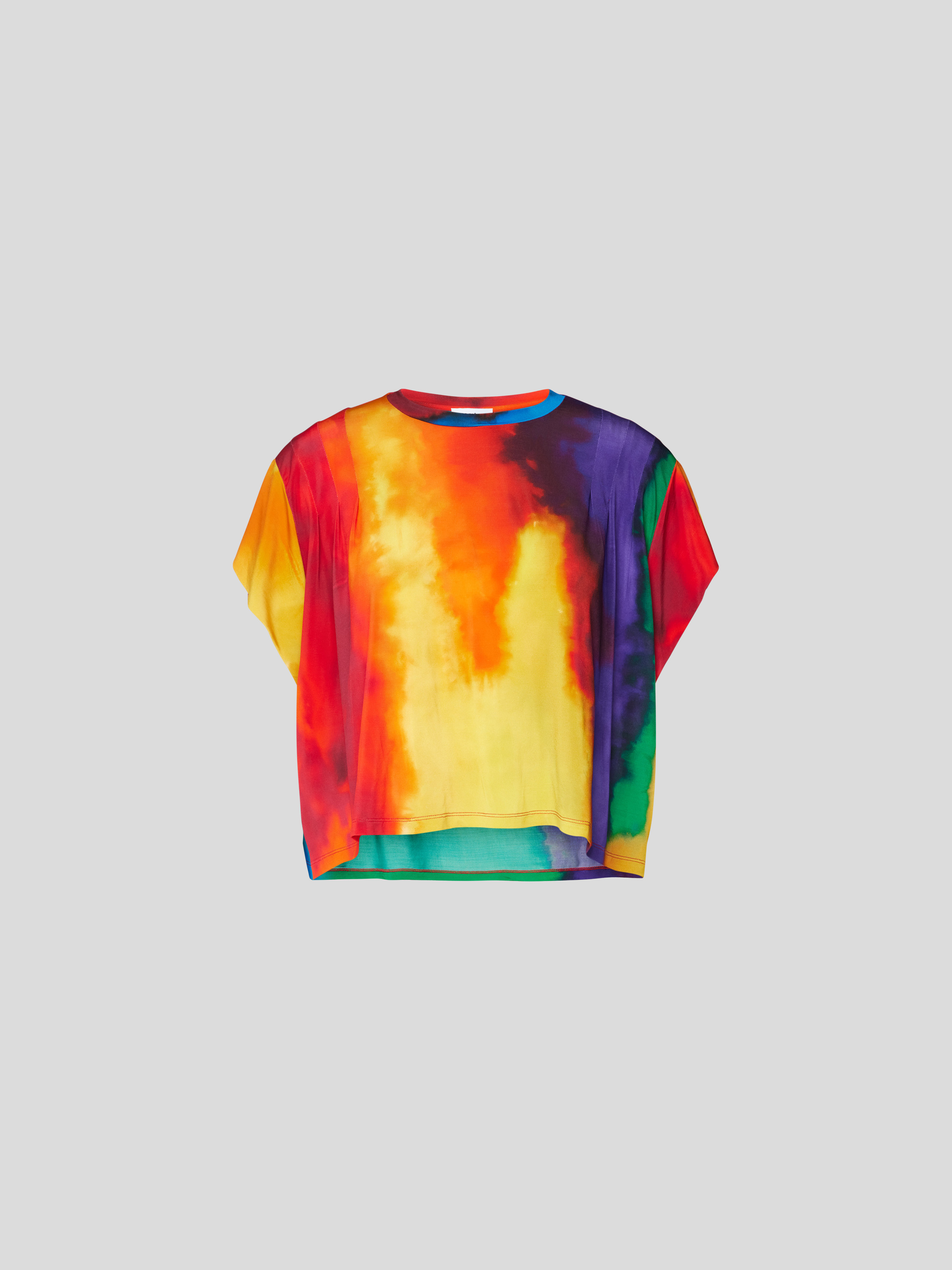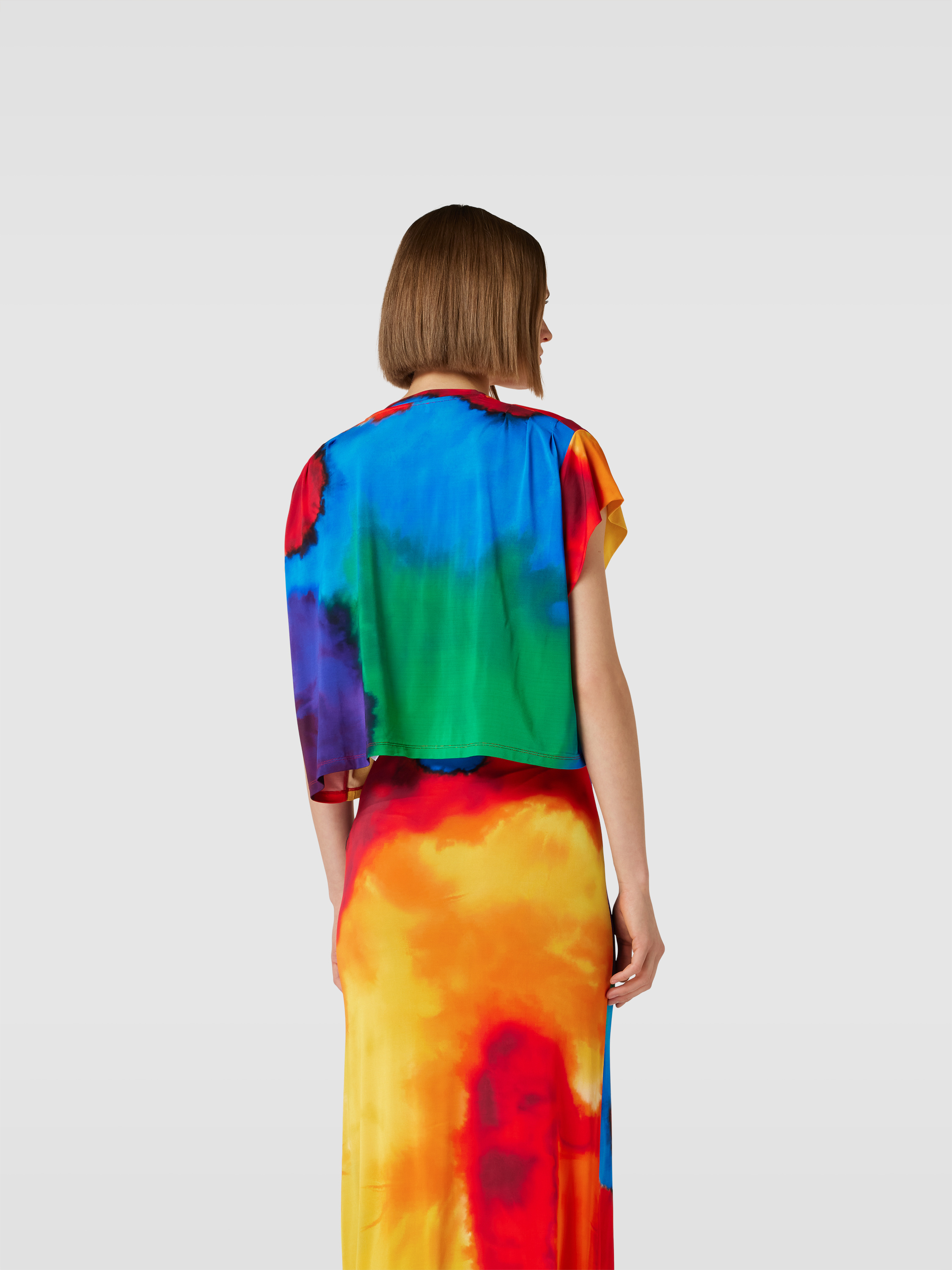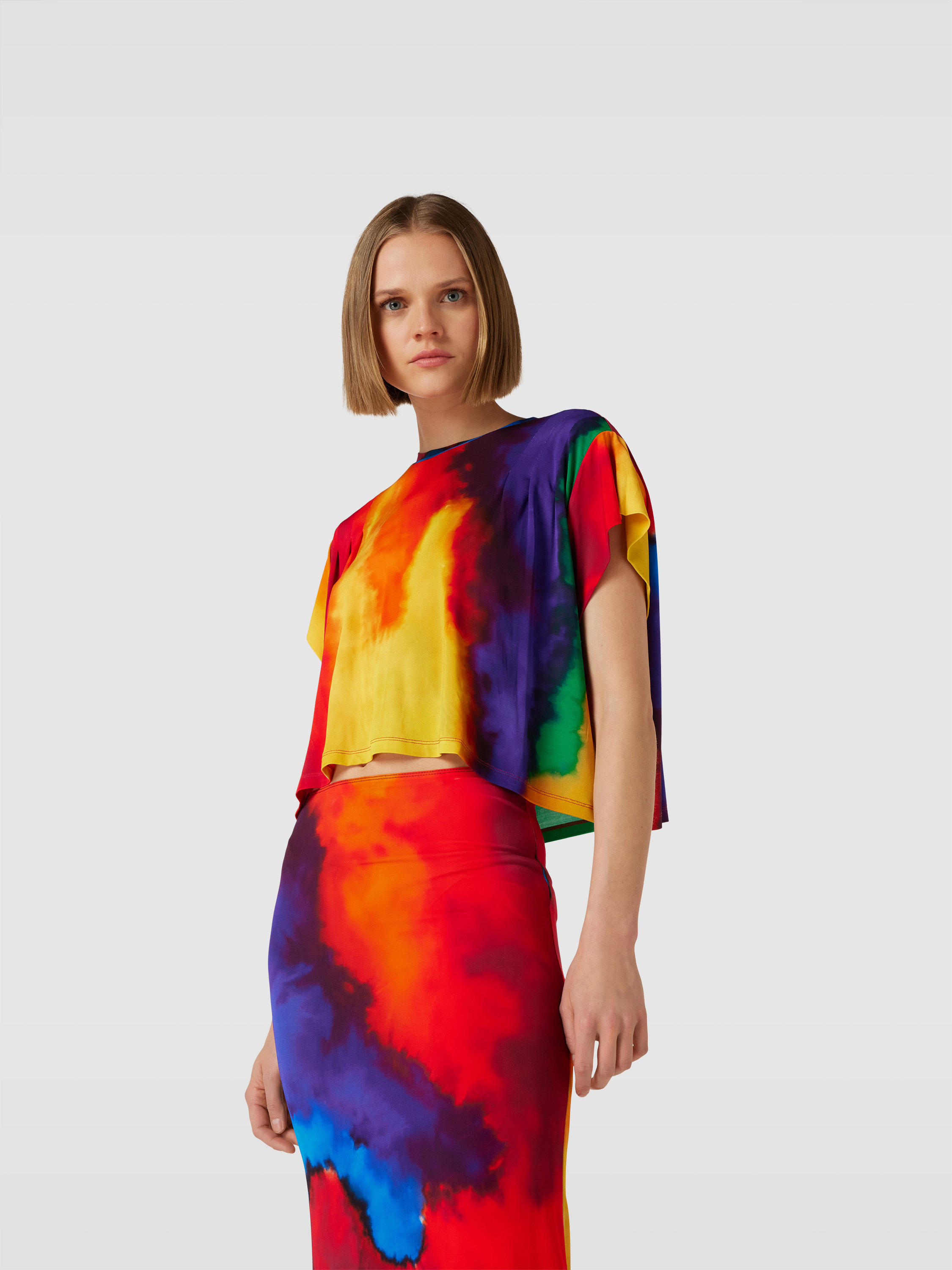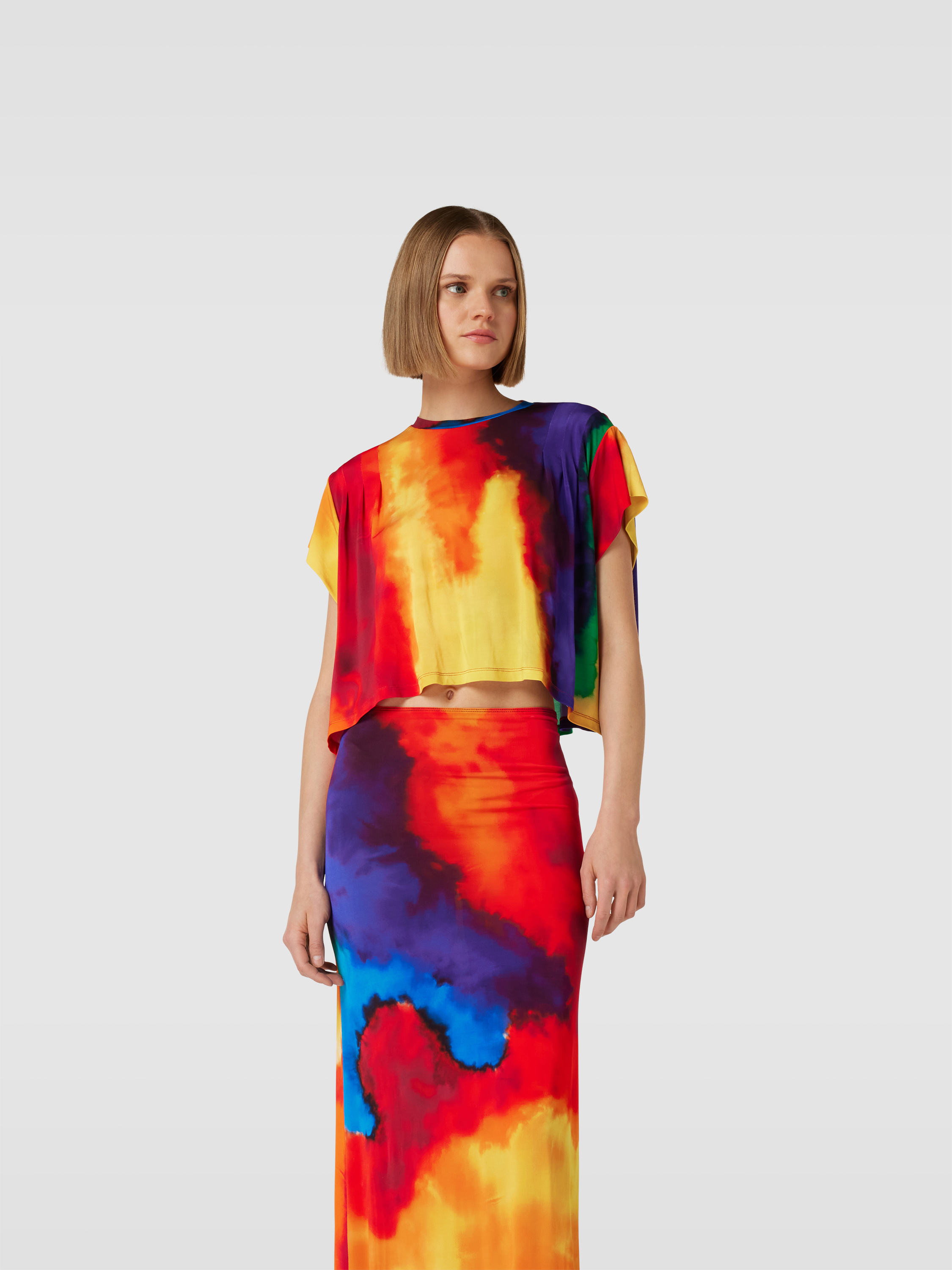 Das Damen T-Shirt von Paco Rabanne fällt durch seinen Batik-Look und den lockeren Schnitt ins Auge. Dank des soften Cupro-Elasthan-Mixes fühlt sich das Cropped T-Shirt im Alltag angenehm an und sitzt entspannt. Die verkürzte Form unterstreicht einen modernen, unkomplizierten Stil.