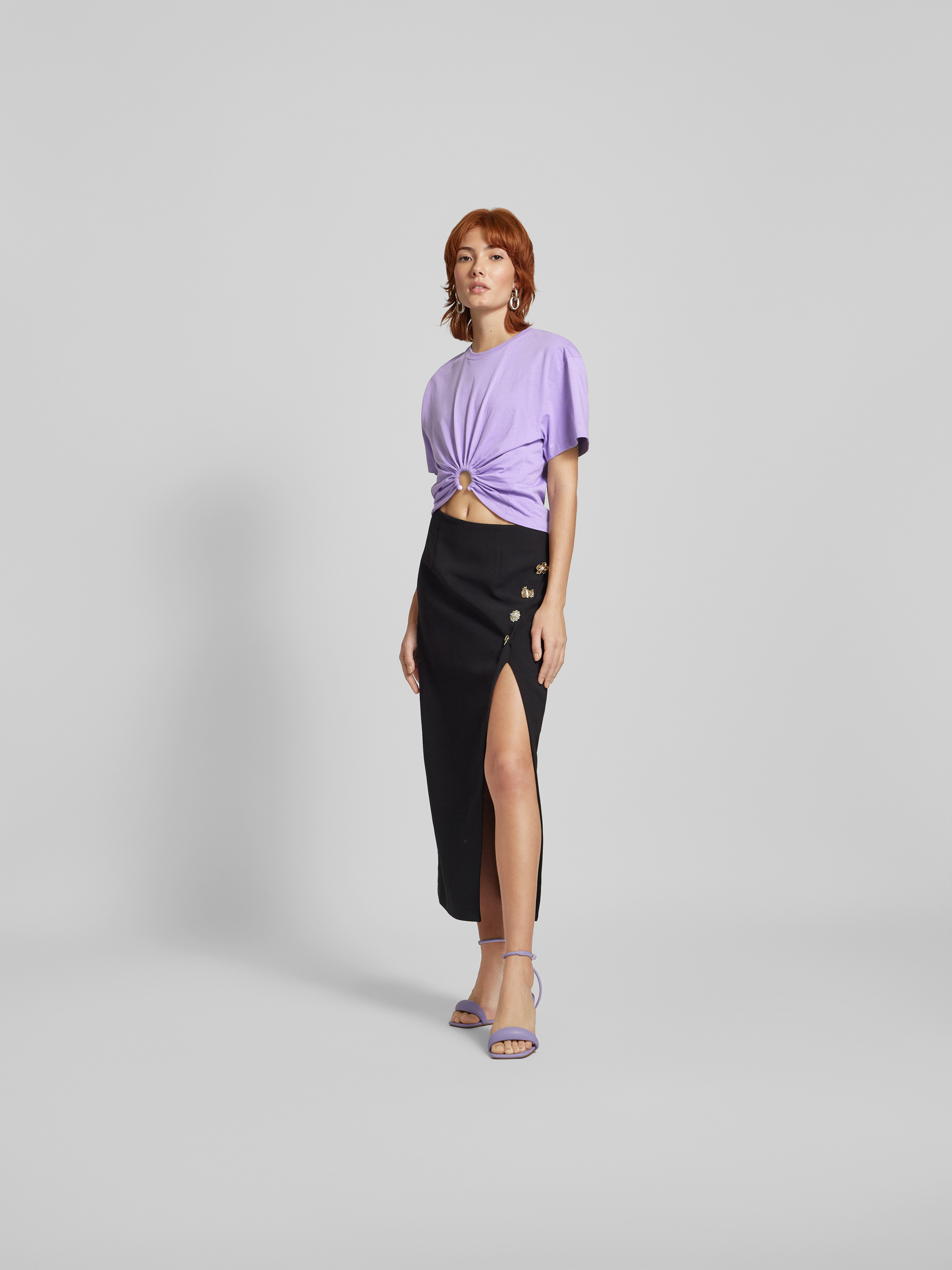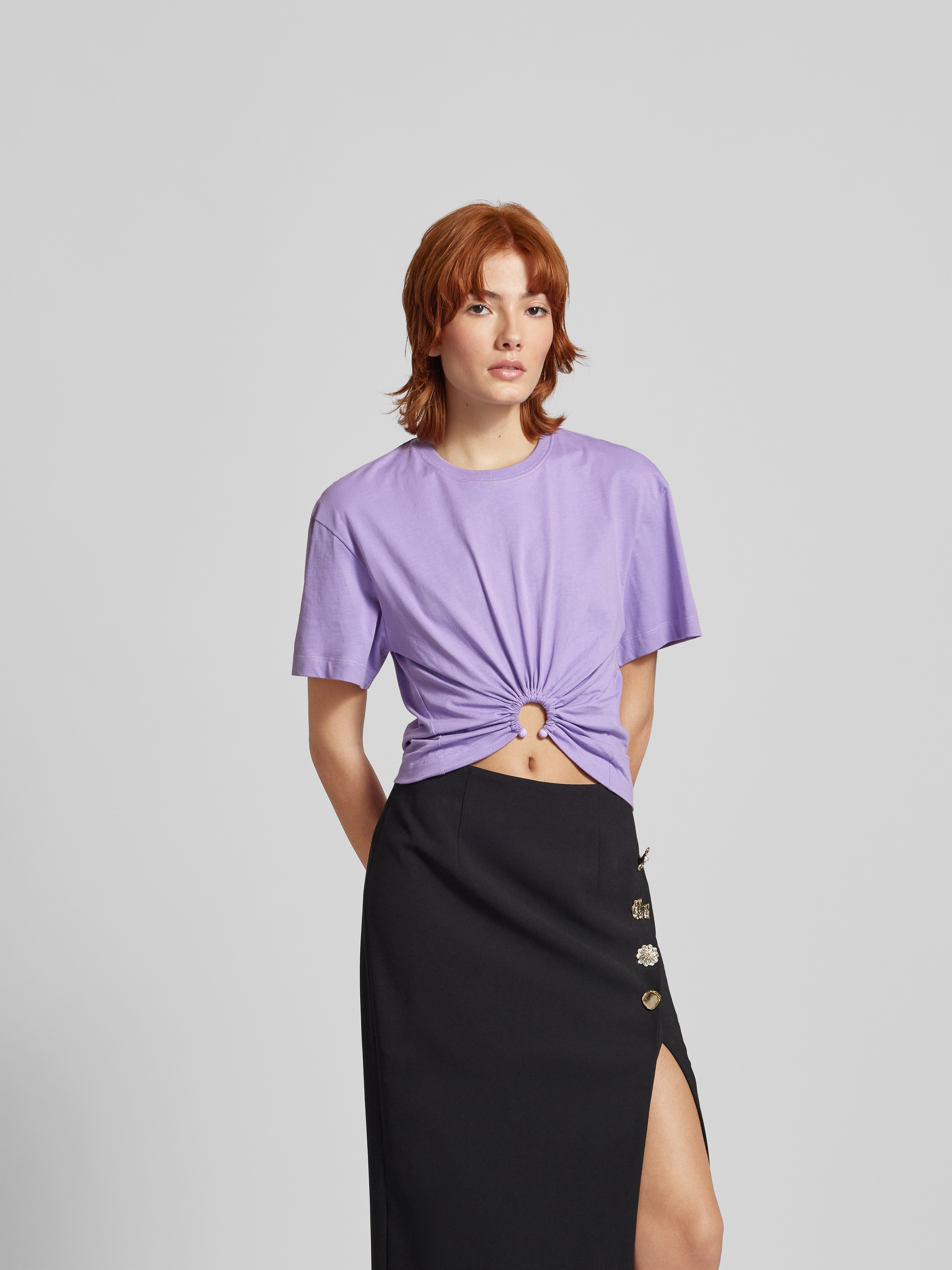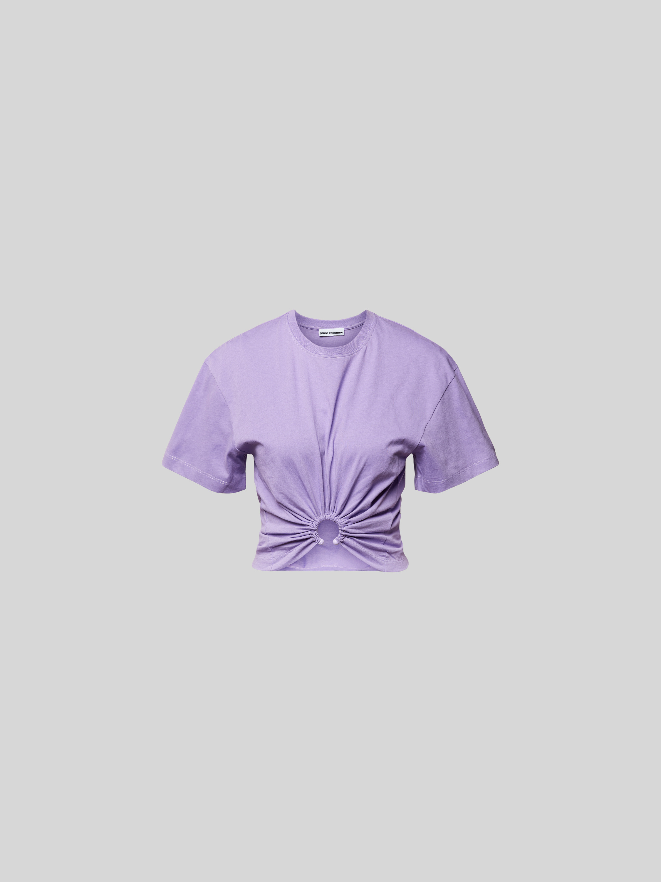 Das Damen T-Shirt von Paco Rabanne zeichnet sich durch reine Baumwolle und einen lockeren Schnitt aus, wodurch es angenehm auf der Haut liegt. Durch den verkürzten Schnitt und dezente Raffungen entsteht eine moderne Silhouette, die vielseitig kombinierbar bleibt. So lässt sich im Alltag unkompliziert Akzente setzen.