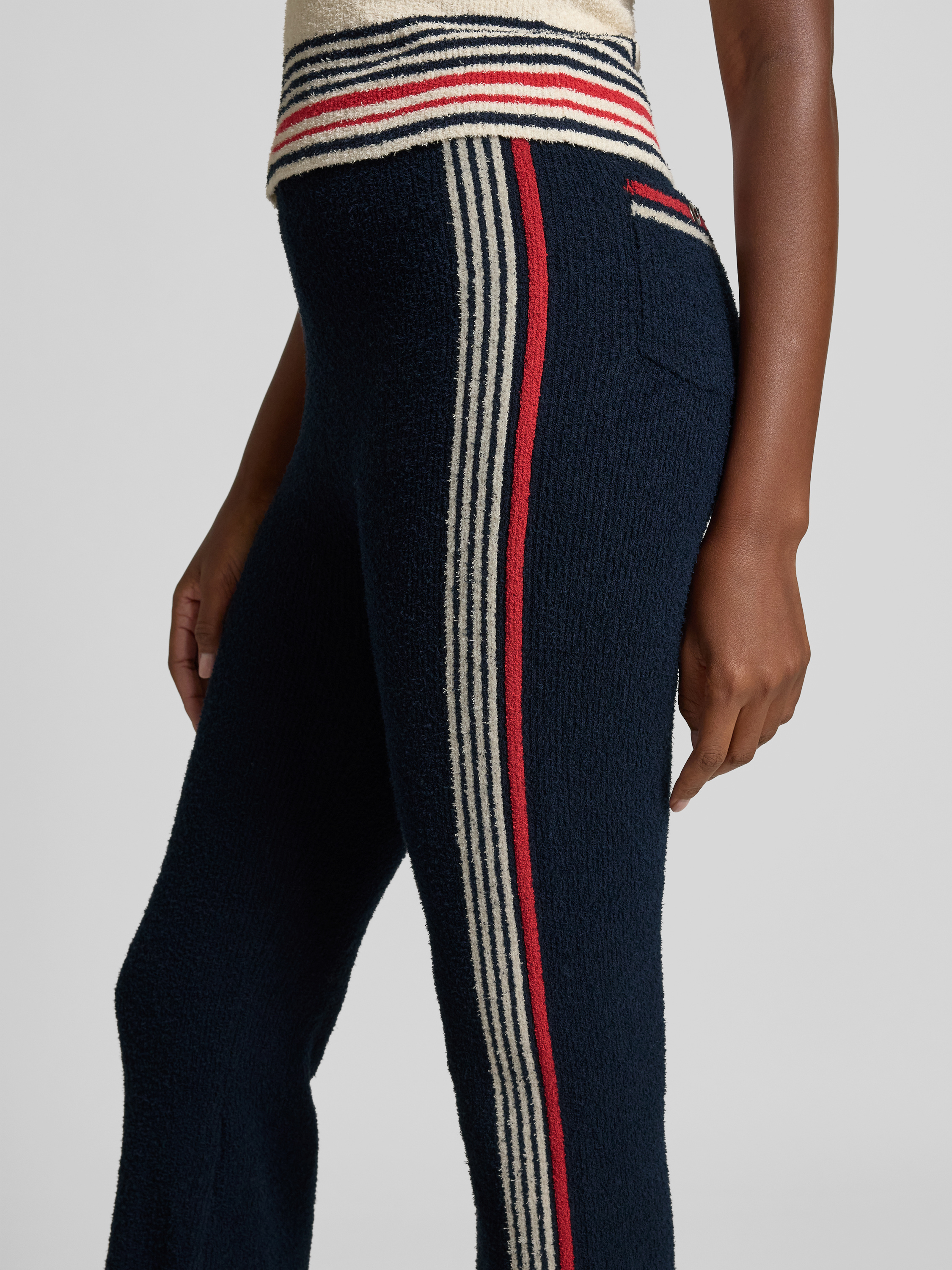 Die Damenhose Flared Fit Stoffhose von Rabanne bringt durch ihren ausgestellten Schnitt und die Strick-Optik Abwechslung in den Alltag. Ihr Baumwoll-Mix sorgt für ein angenehmes Tragegefühl, während der elastische Bund sowie Galonstreifen moderne Akzente und Bewegungsfreiheit schaffen.