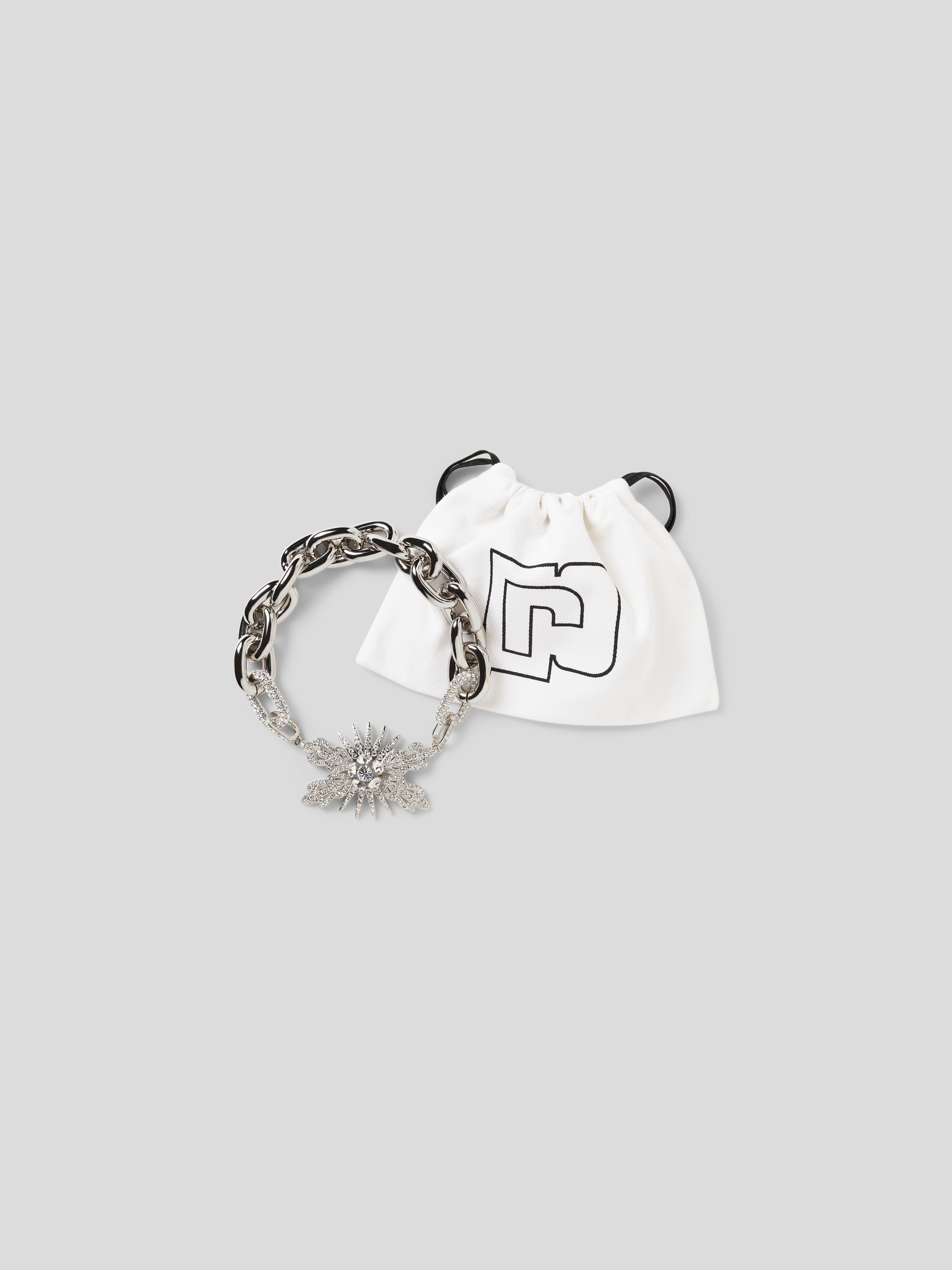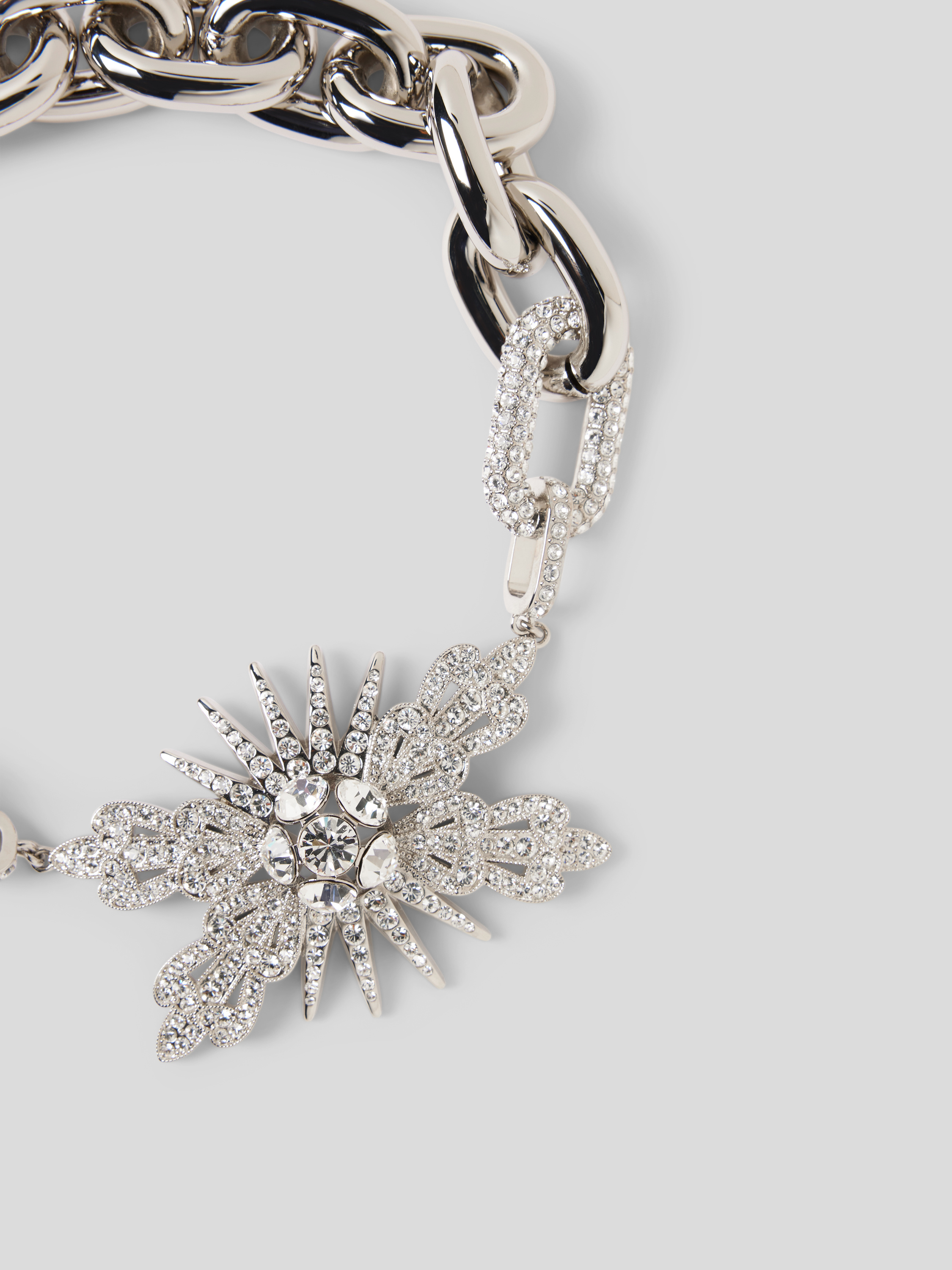 Die Halskette mit Ziersteinbesatz von Paco Rabanne kombiniert einen Material-Mix mit Bronze-Anteil und auffälligem Metallic-Look. Ihr extravagantes Design in Gliederketten-Optik zieht die Blicke auf sich, während der Ziersteinbesatz für eine besondere Note sorgt. So ergänzt das Accessoire verschiedenste Outfits.