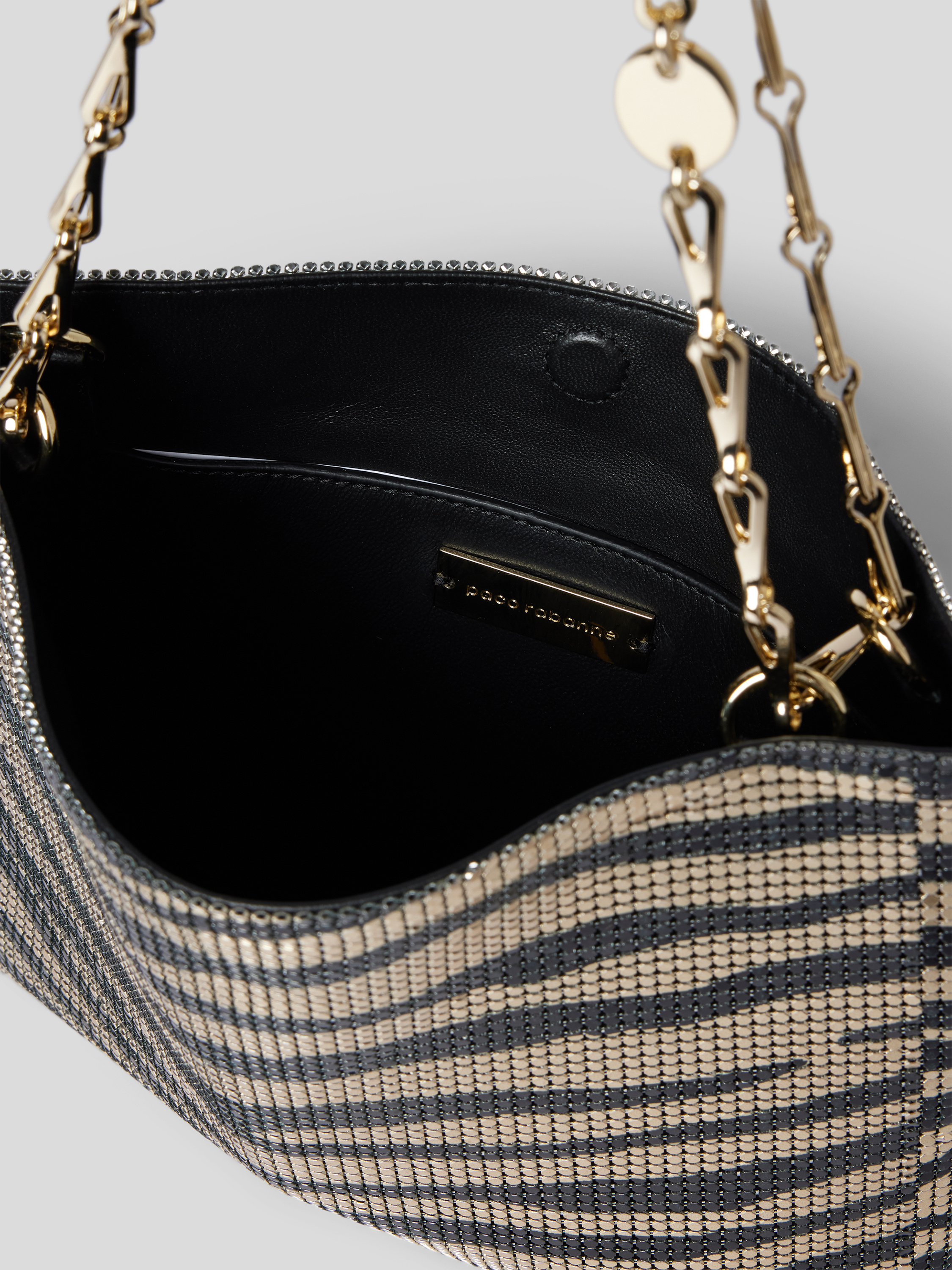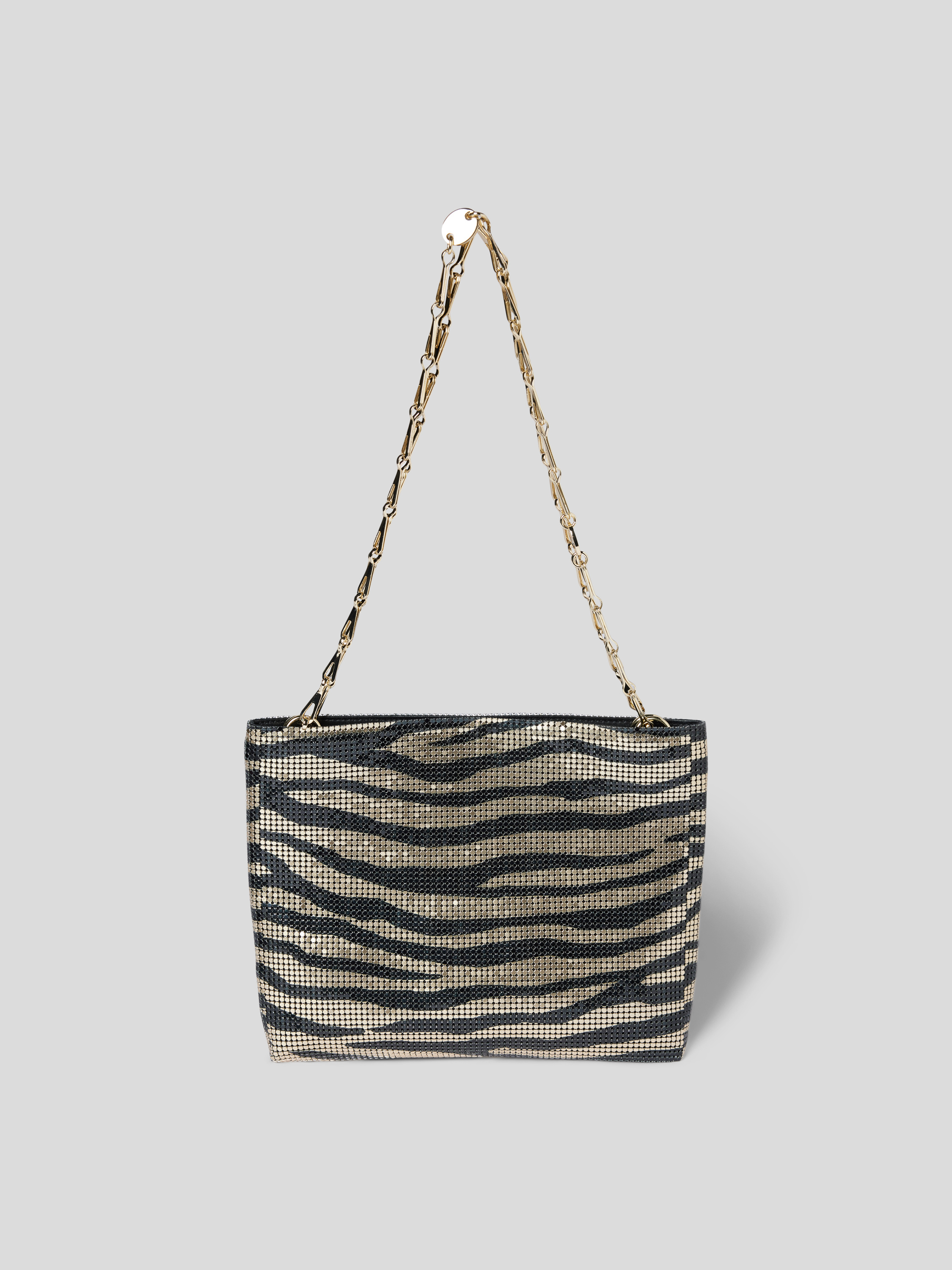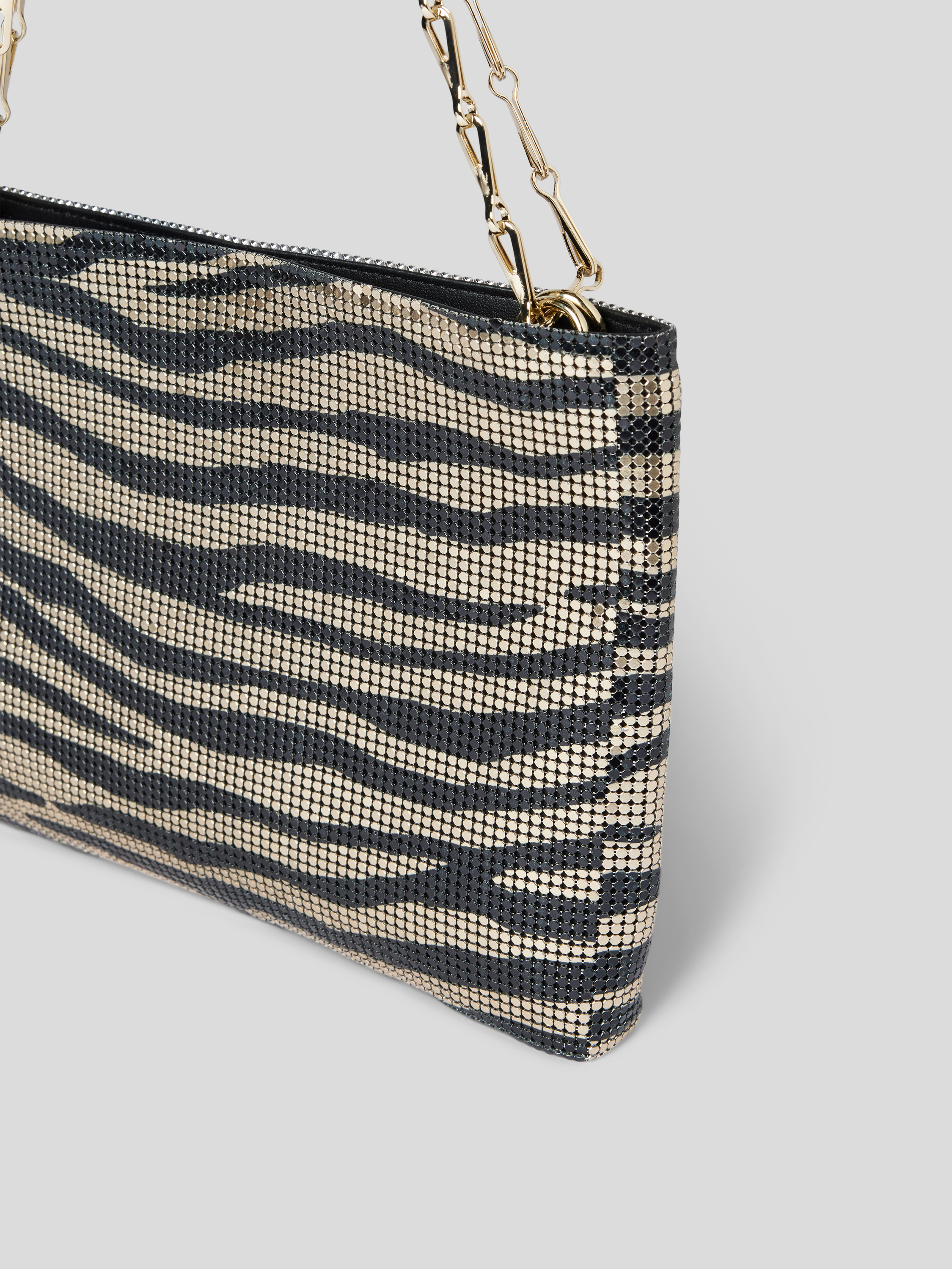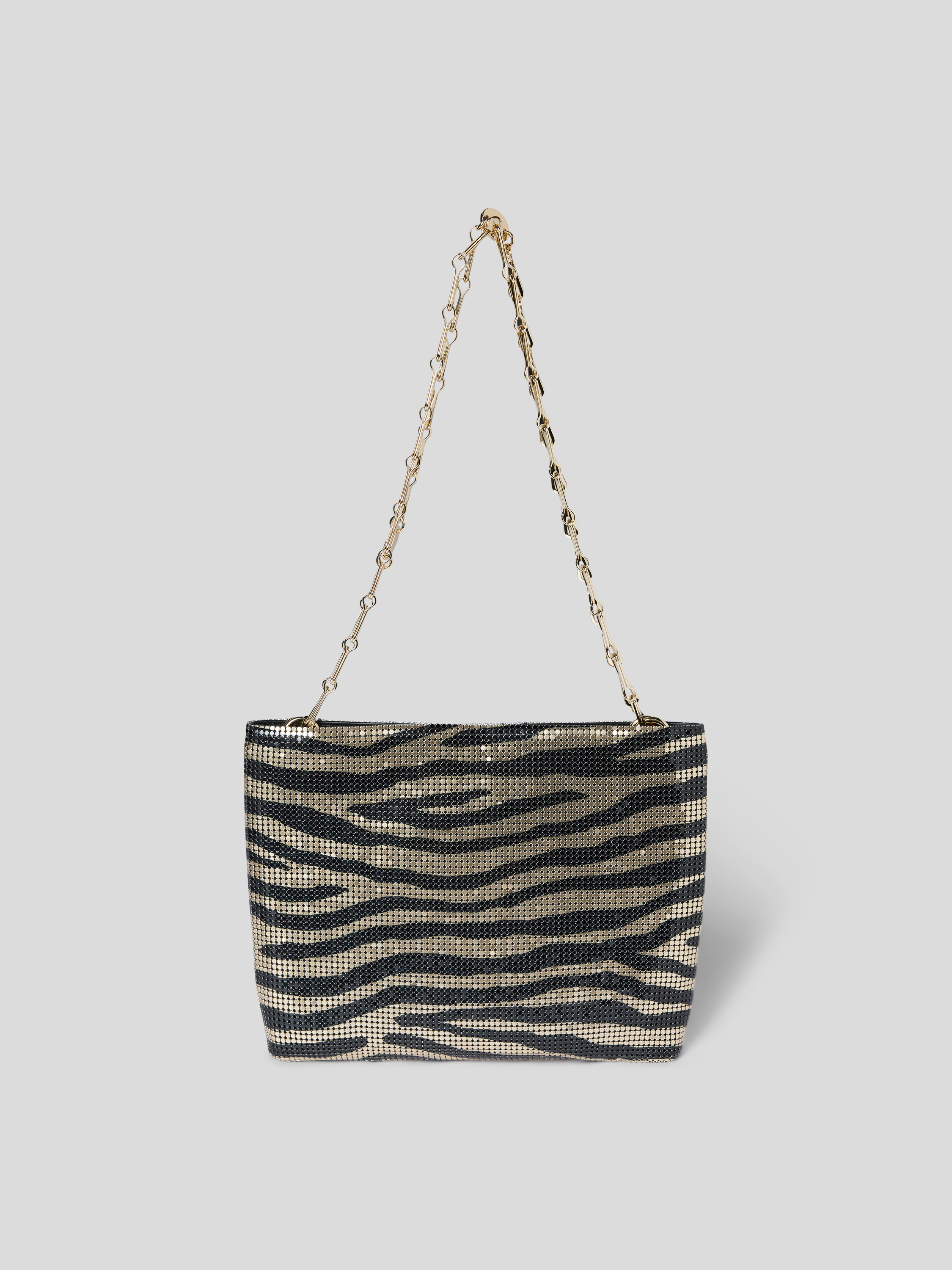 Die Damen Handtasche von Paco Rabanne kombiniert ein auffälliges Animal-Muster mit einem markanten Metallic-Look und setzt so spannende Akzente im Alltag. Dank Schulterriemen trägt sie sich angenehm, während das übersichtliche Hauptfach samt praktischem Steckfach für eine ordentliche Aufbewahrung verschiedener Utensilien sorgt.