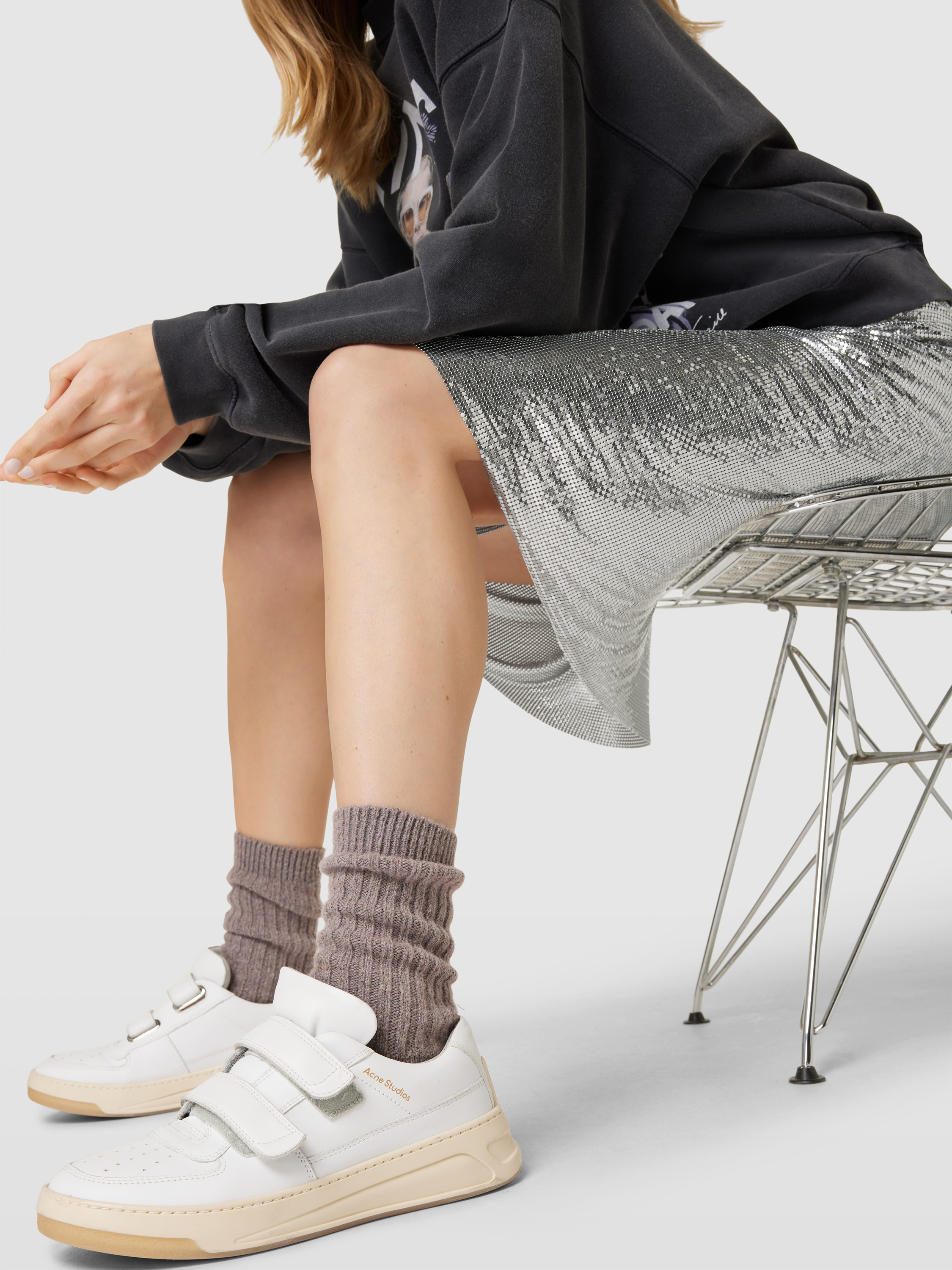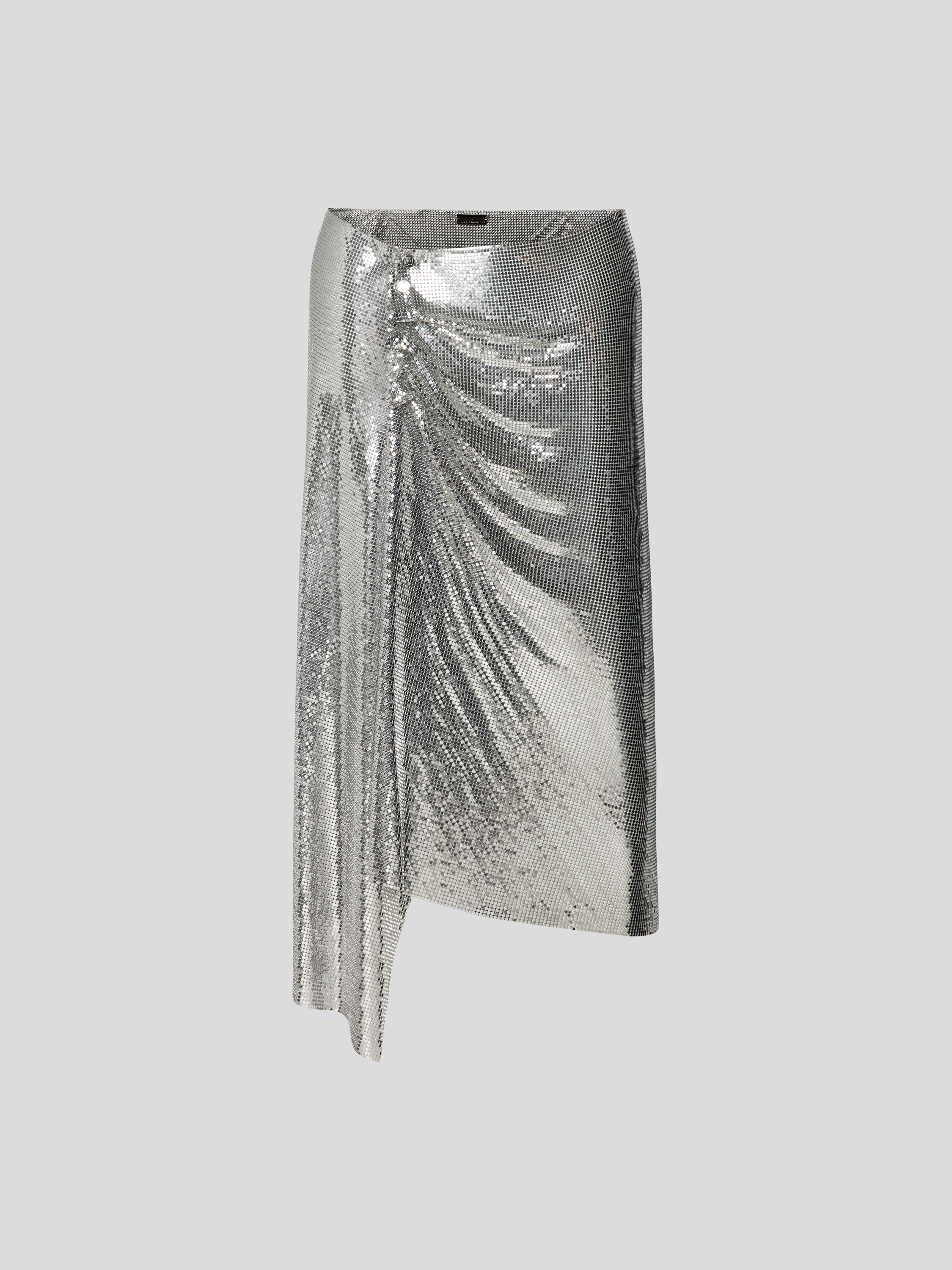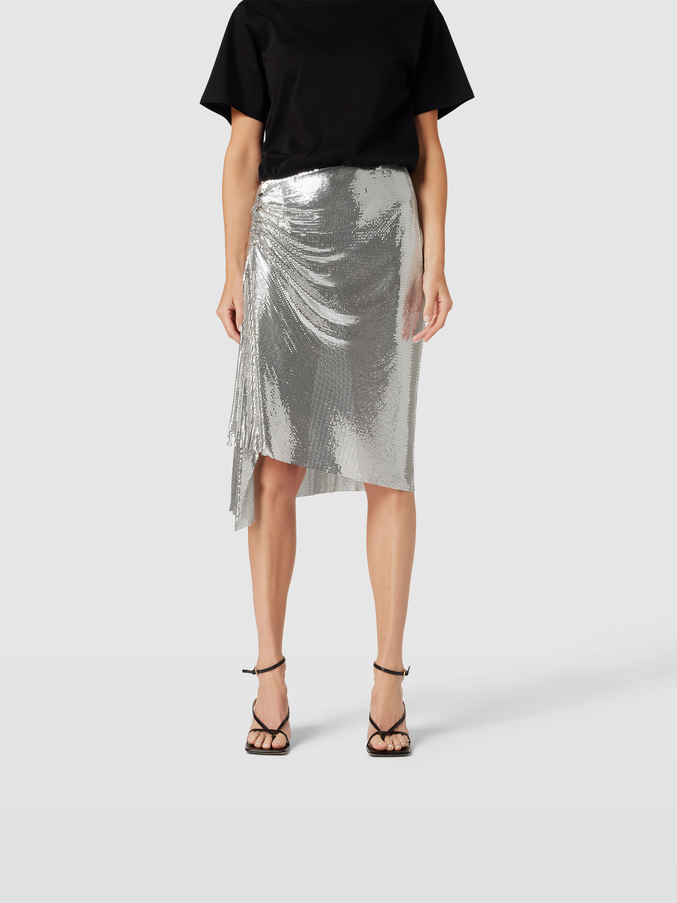 Der knielange Rock von Paco Rabanne fällt durch seinen geraden Schnitt und den raffinierten Zierbesatz auf, der dem Design eine besondere Note verleiht. Dezente Raffungen sorgen für eine angenehme Passform und unterstreichen die feminine Silhouette. Das dezente Label-Detail rundet den Look stimmig ab.