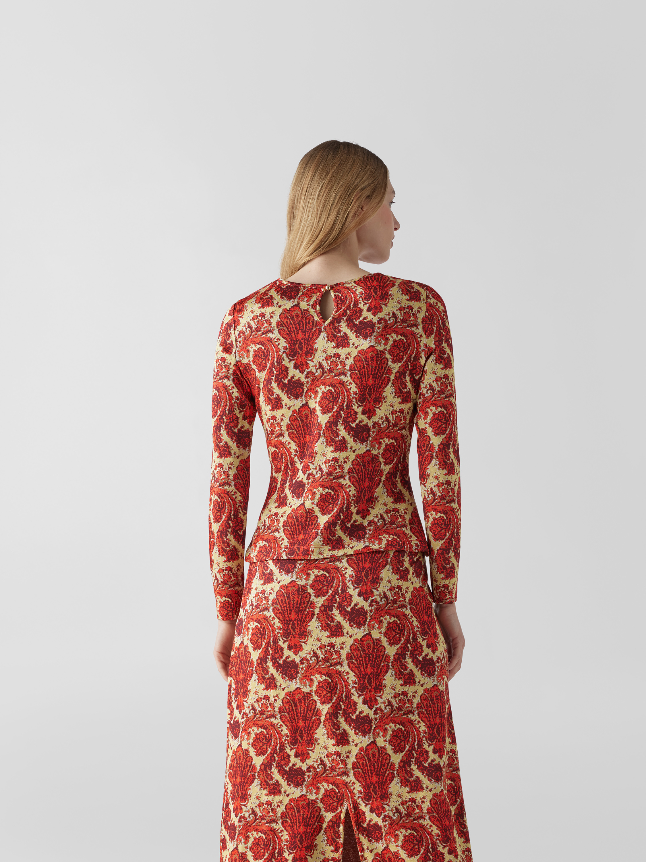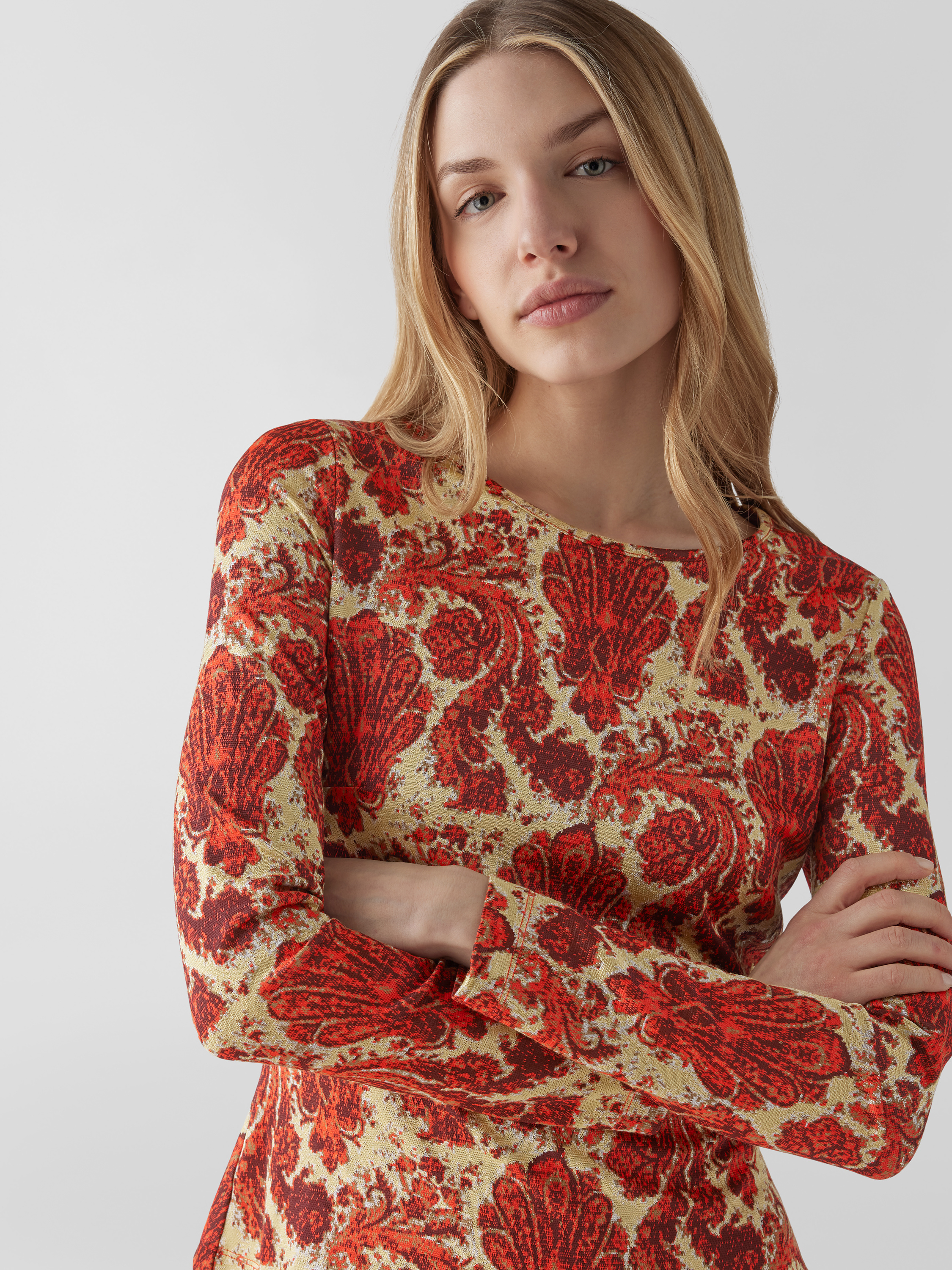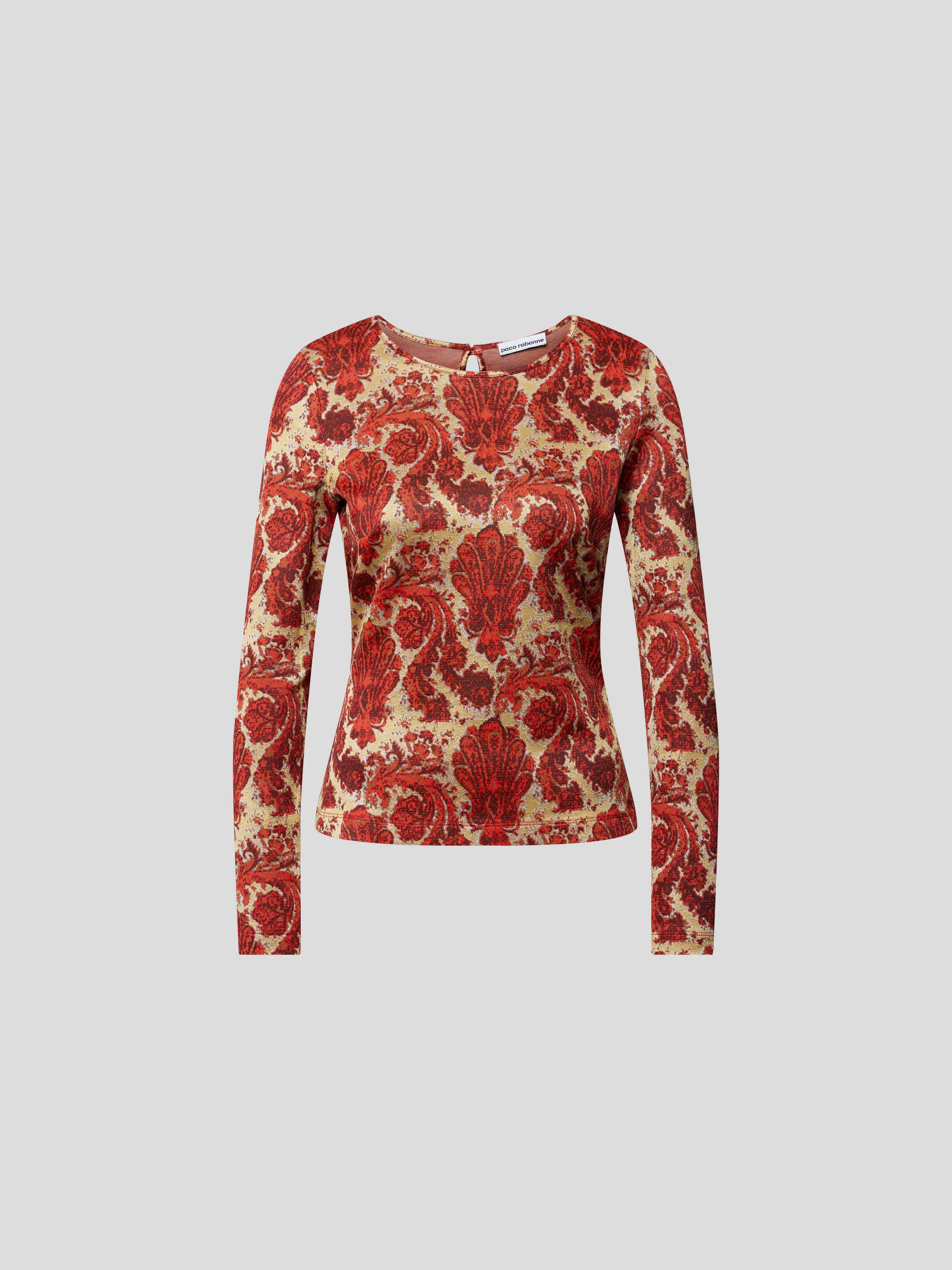 Das Damen Longsleeve von Paco Rabanne schmiegt sich dank körpernaher Passform angenehm an und sorgt durch den Viskose-Mix mit Baumwoll-Anteil für ein weiches Tragegefühl. Das Allover-Muster in Metallic-Optik zieht die Blicke auf sich. Ein klassischer Rundhalsausschnitt rundet das Design ab.