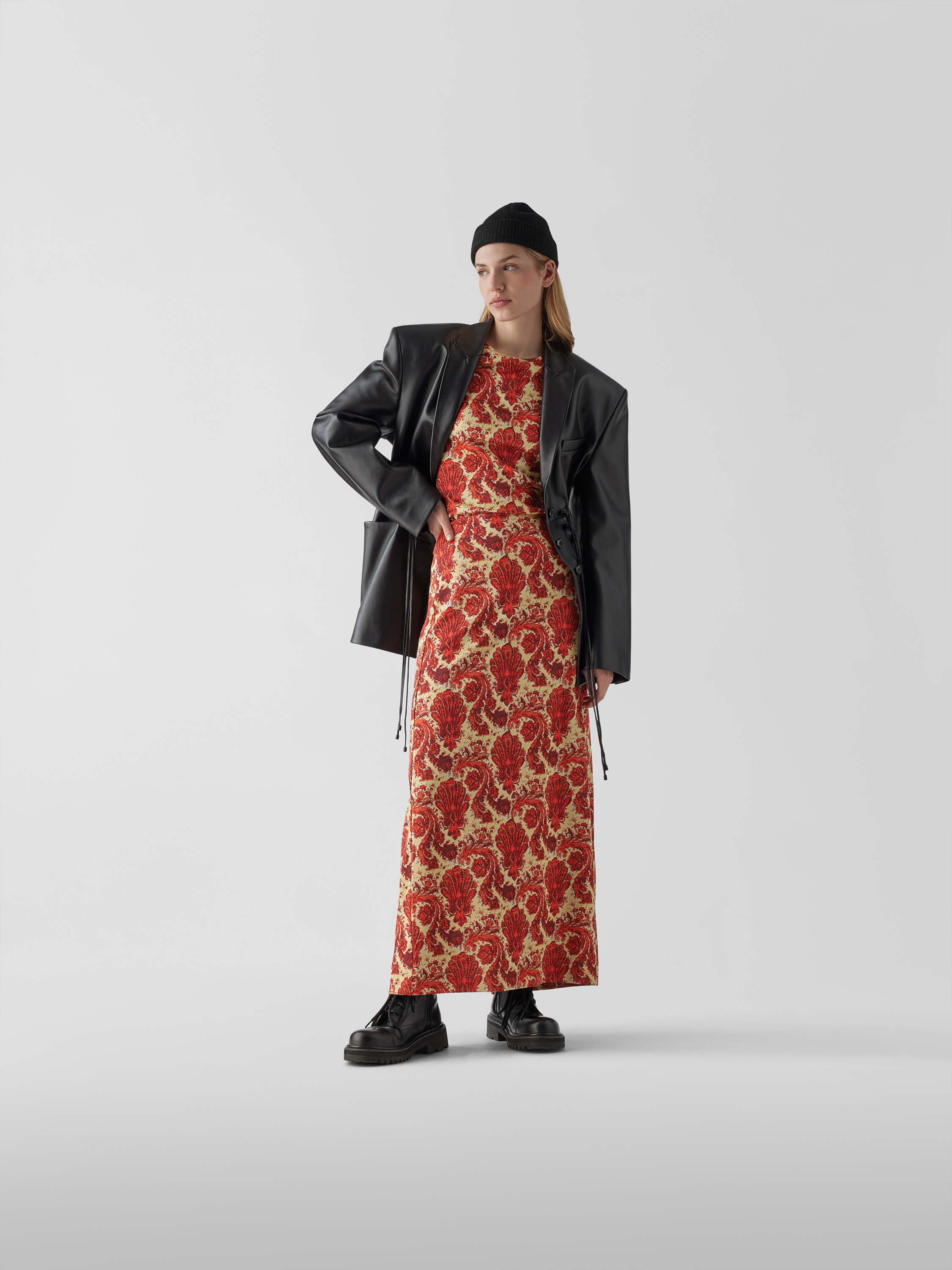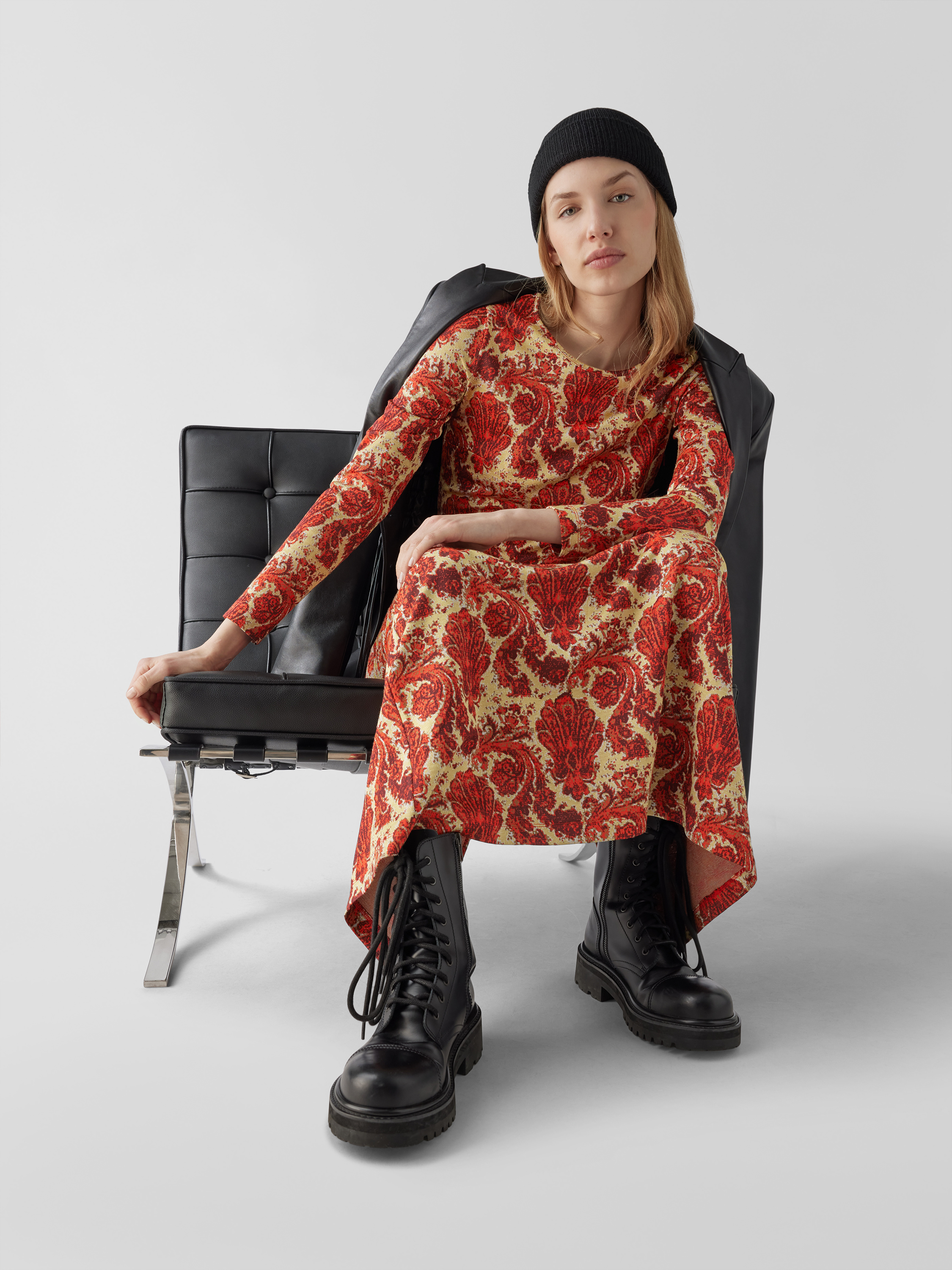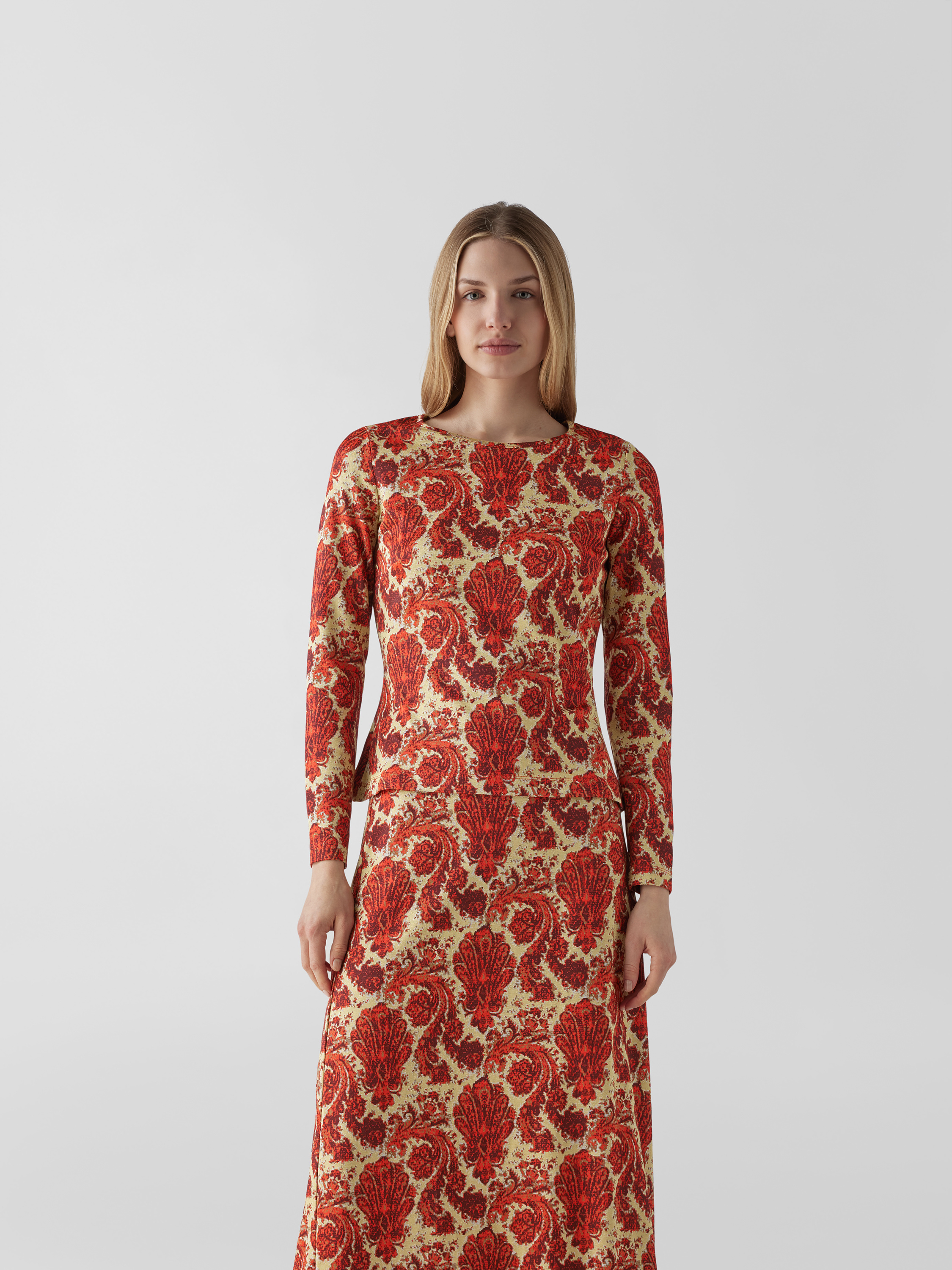 Das Damen Longsleeve von Paco Rabanne schmiegt sich dank körpernaher Passform angenehm an und sorgt durch den Viskose-Mix mit Baumwoll-Anteil für ein weiches Tragegefühl. Das Allover-Muster in Metallic-Optik zieht die Blicke auf sich. Ein klassischer Rundhalsausschnitt rundet das Design ab.