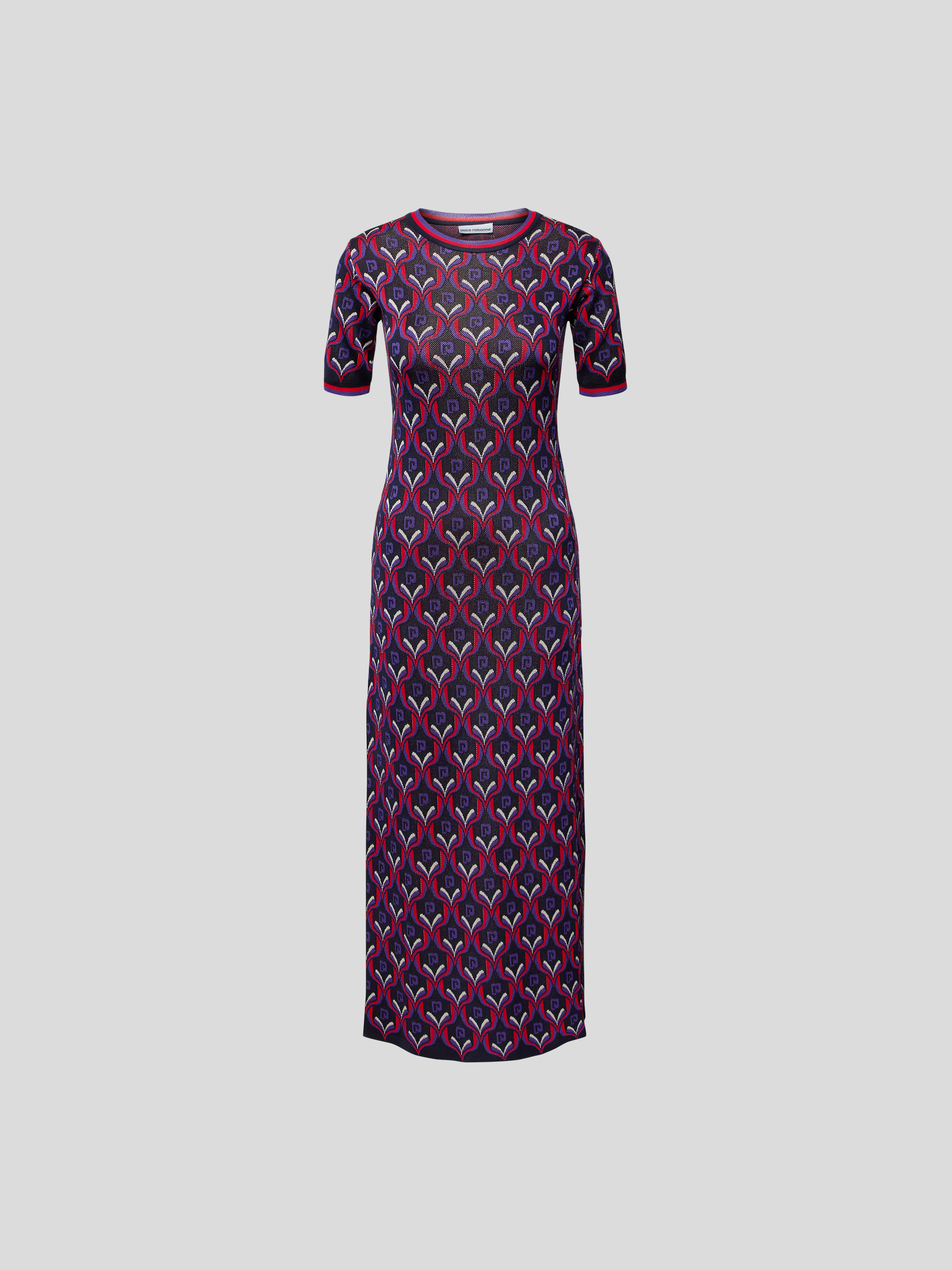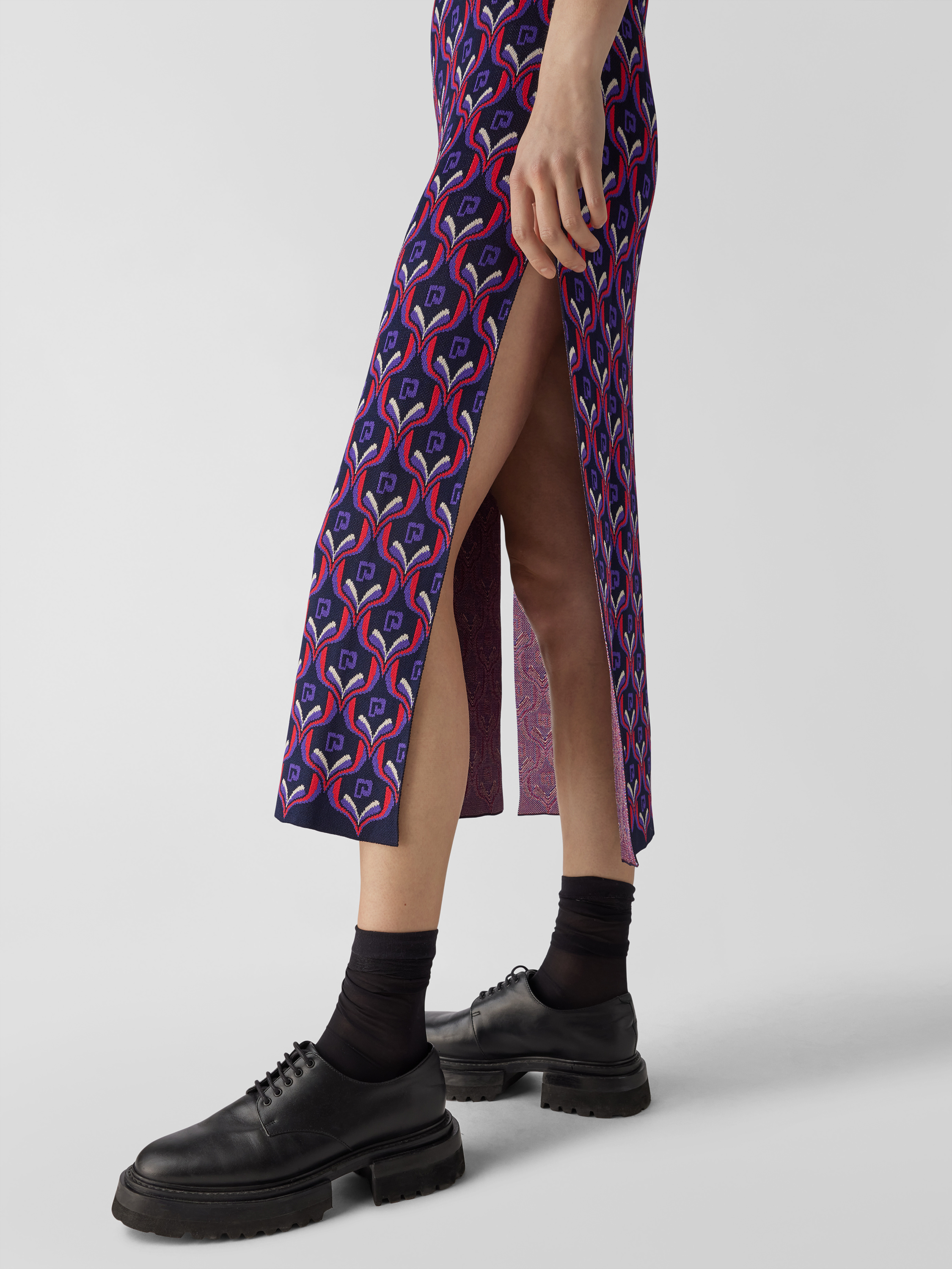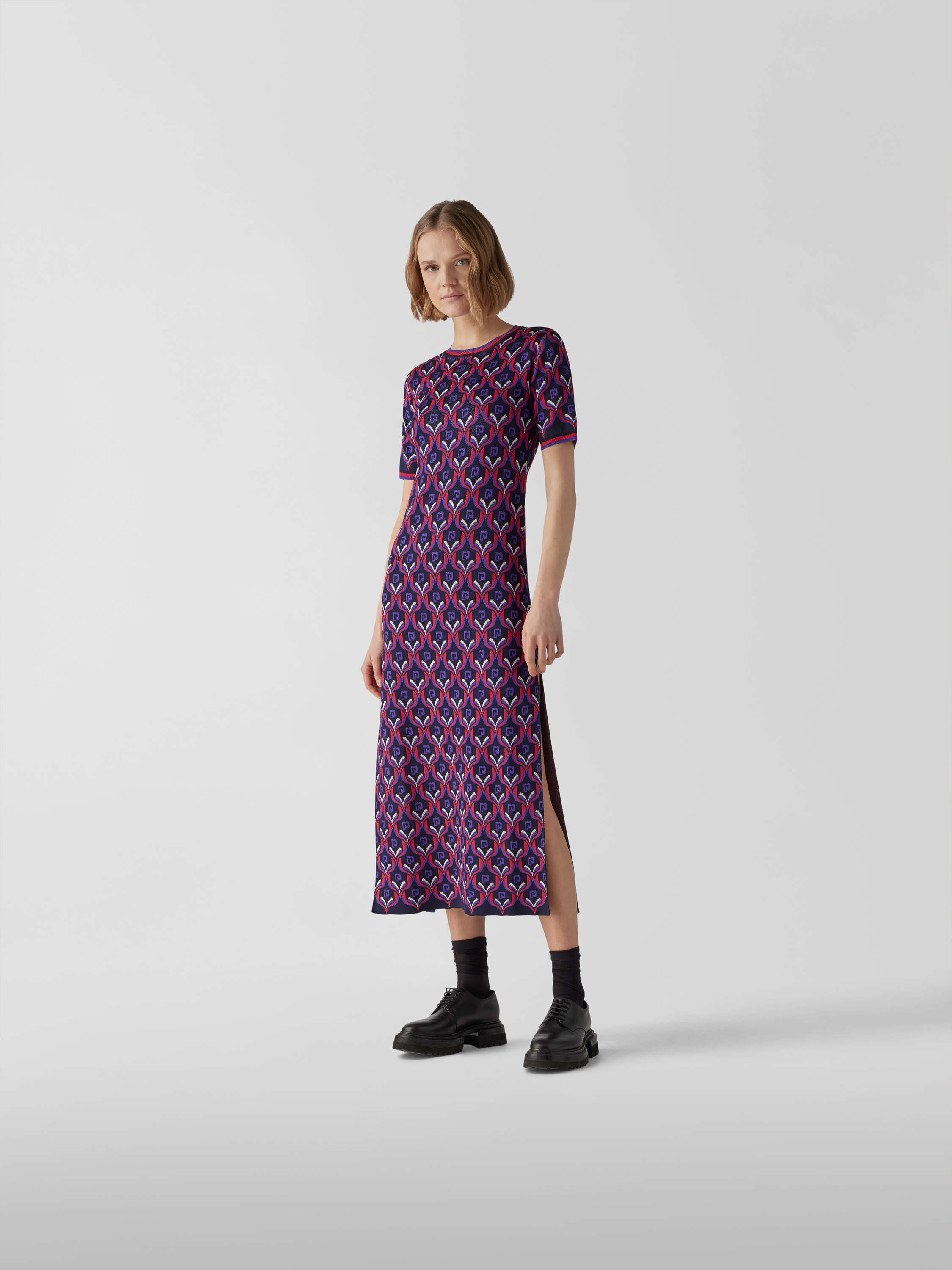 Das Maxikleid mit Allover-Muster von Paco Rabanne zeigt sich mit einer taillierten Silhouette und kurzen Ärmeln, wodurch es angenehm luftig wirkt. Die reine Viskose sorgt für ein leichtes Tragegefühl, während das lebendige Muster dem Outfit eine besondere Note verleiht. Durch den Rundhalsausschnitt erhält das Kleid einen zeitlosen Rahmen.