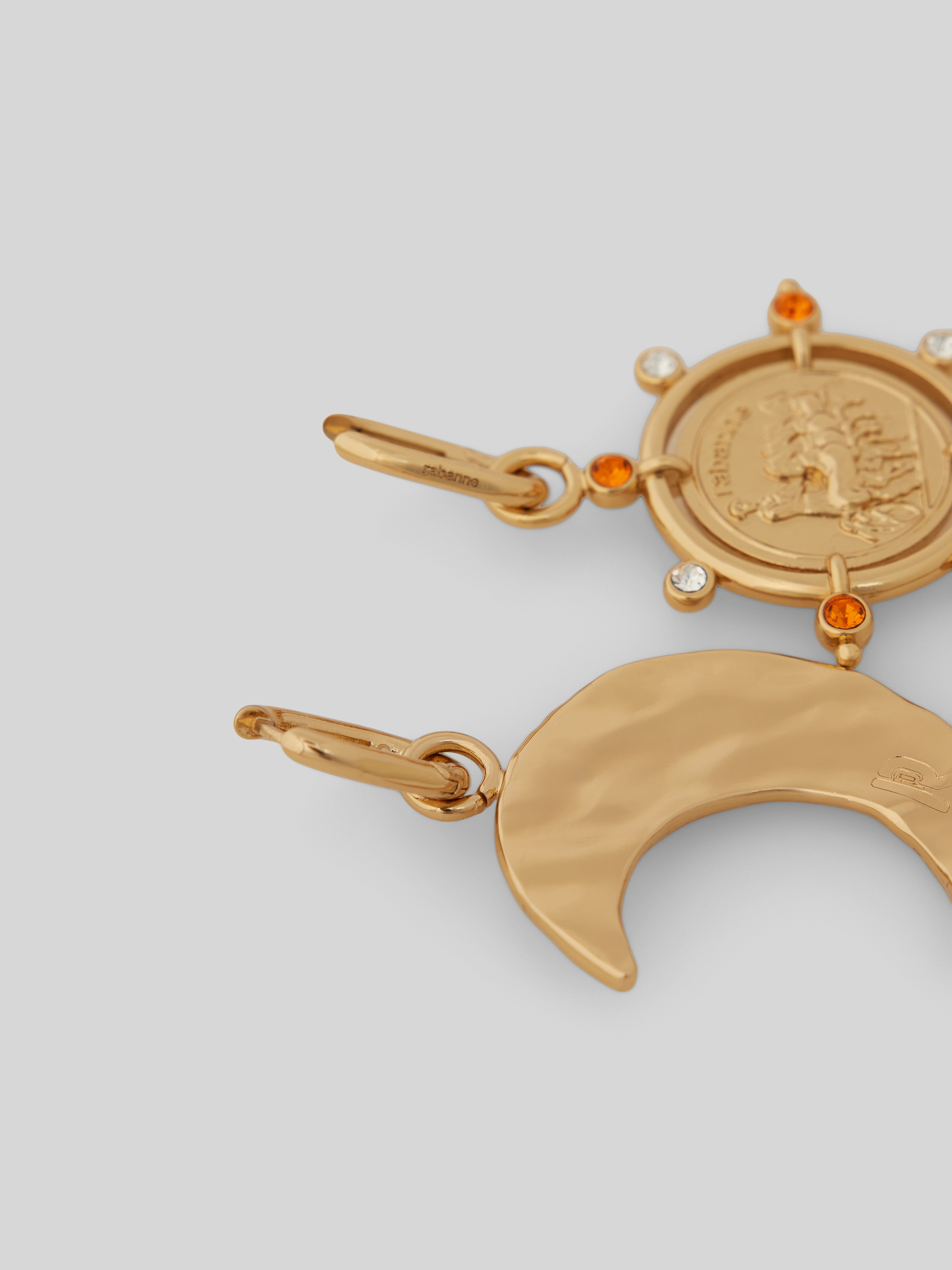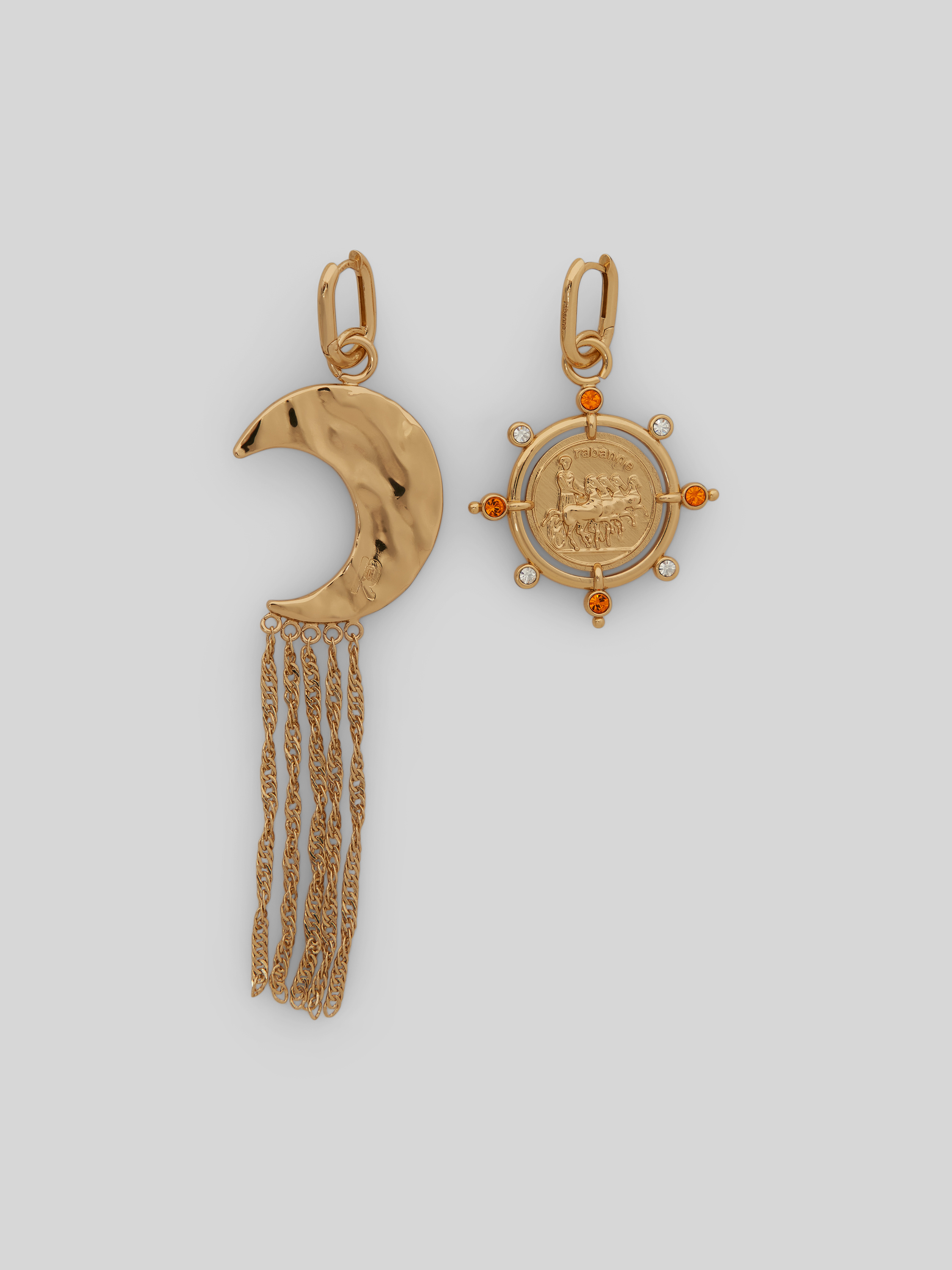 Die Ohrringe von Rabanne präsentieren sich in einem asymmetrischen Design, das durch den Ziersteinbesatz und detailreiche Motiv-Anhänger lebendig wirkt. Das metallische Finish harmoniert mit der filigranen Formgebung und setzt feine Akzente. Durch ihre Länge fallen die Ohrringe angenehm ins Auge, ohne aufdringlich zu wirken.