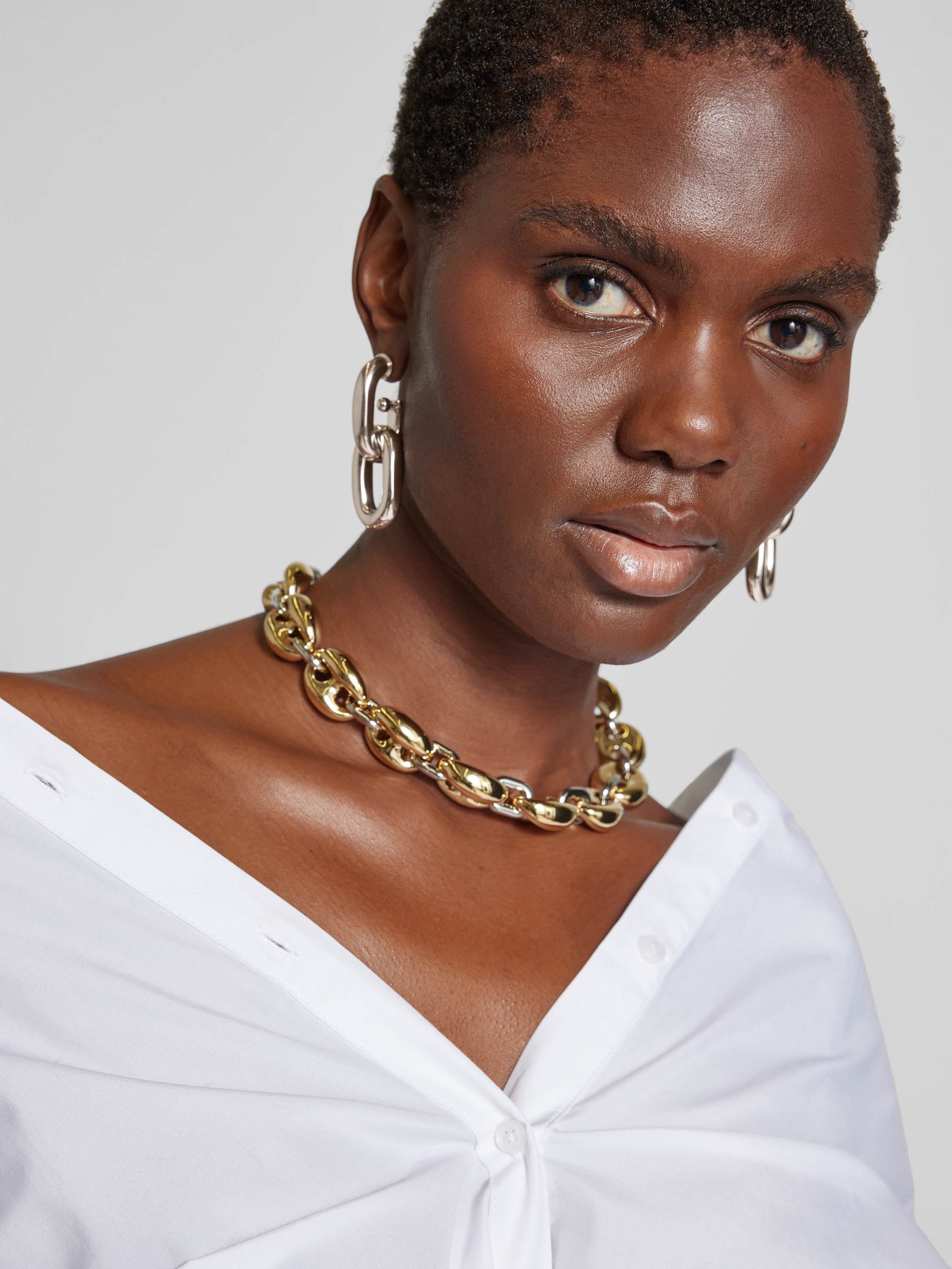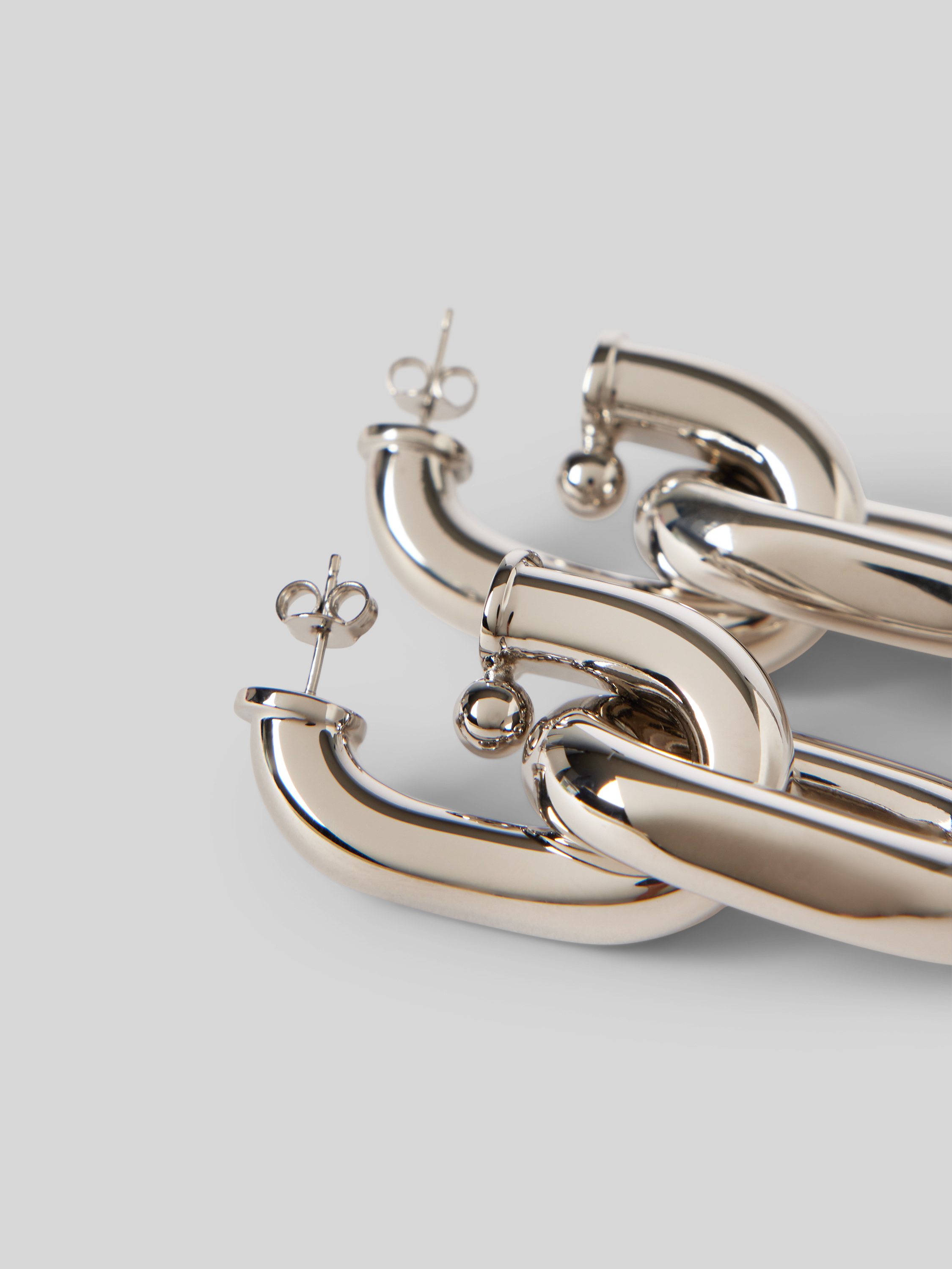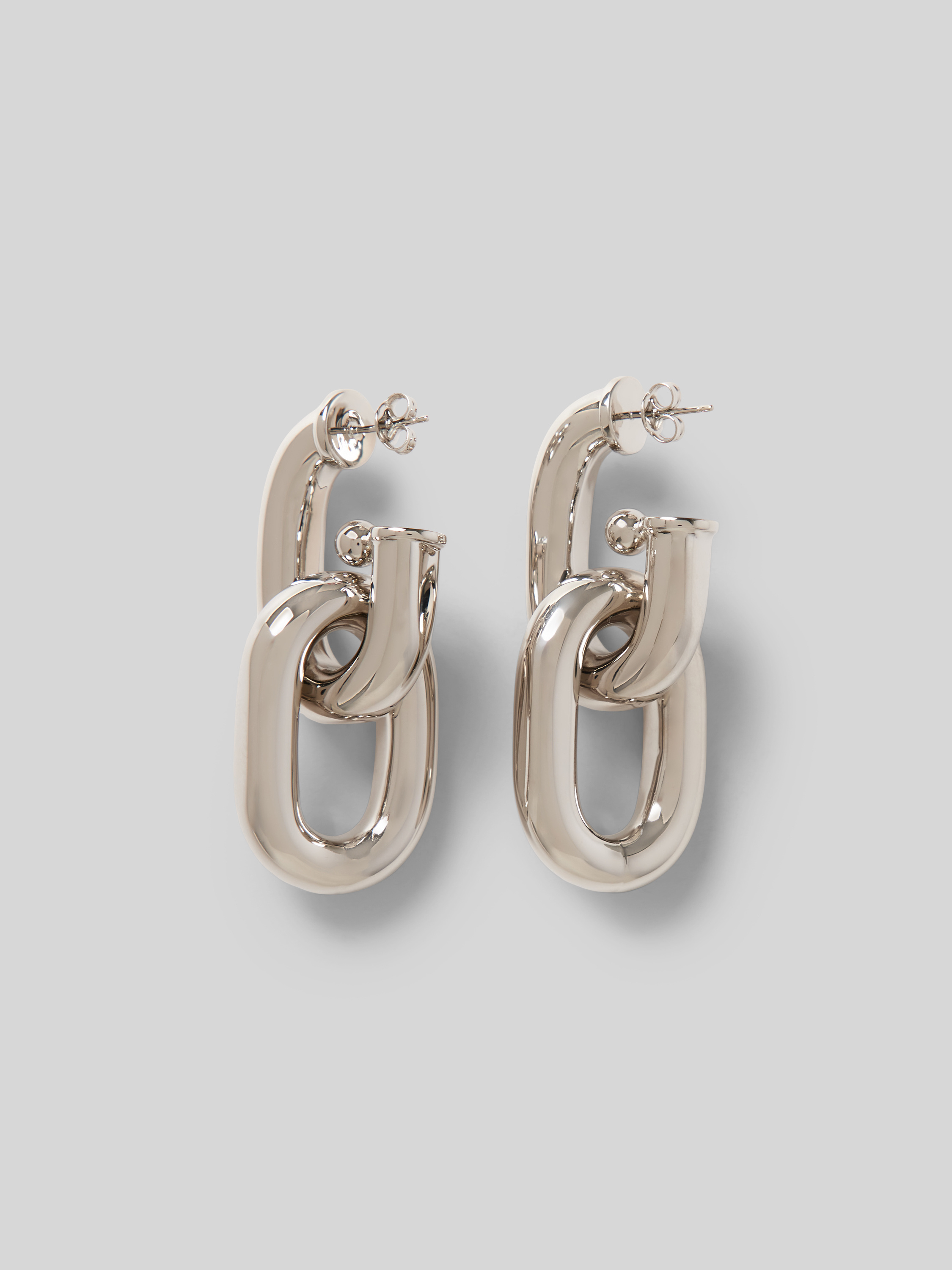 Die Ohrstecker in metallic von Rabanne zeigen sich mit markanter Gliederketten-Optik und fallen durch ihr hängendes Design angenehm ins Auge. Reines Metall sorgt für einen dezenten Schimmer, der jedem Outfit eine besondere Note verleiht. Durch ihre Form eignen sie sich für verschiedene Anlässe.