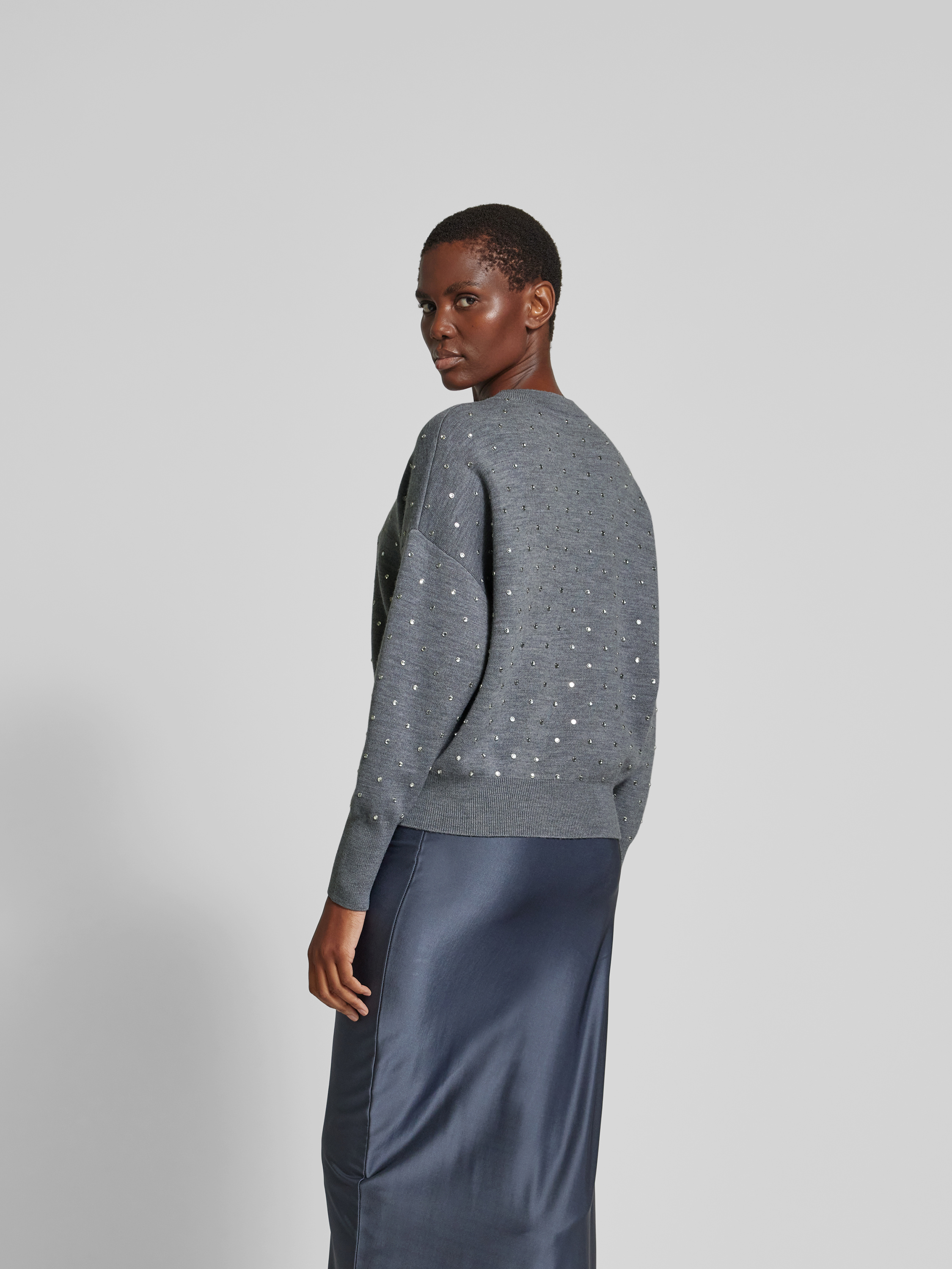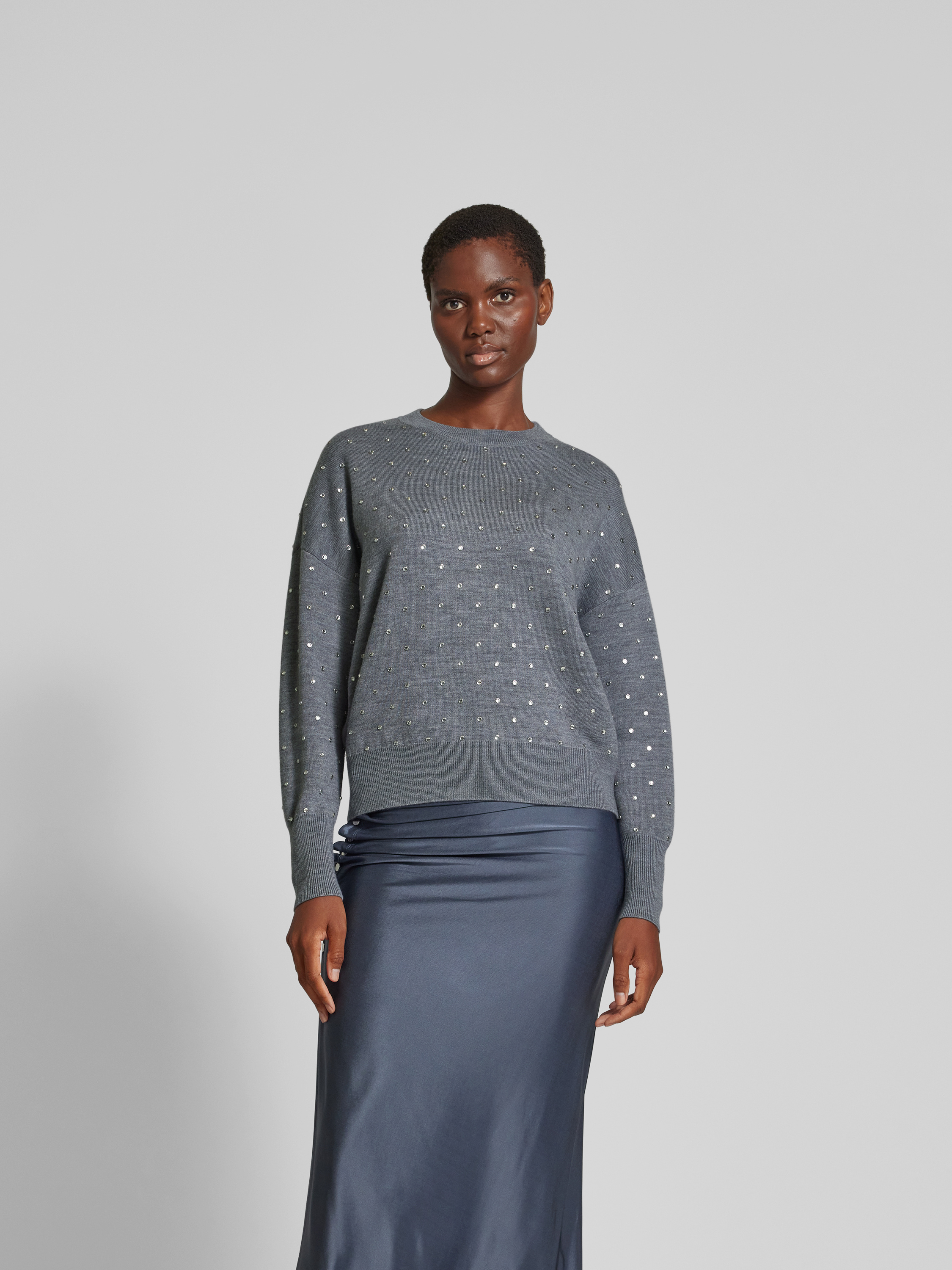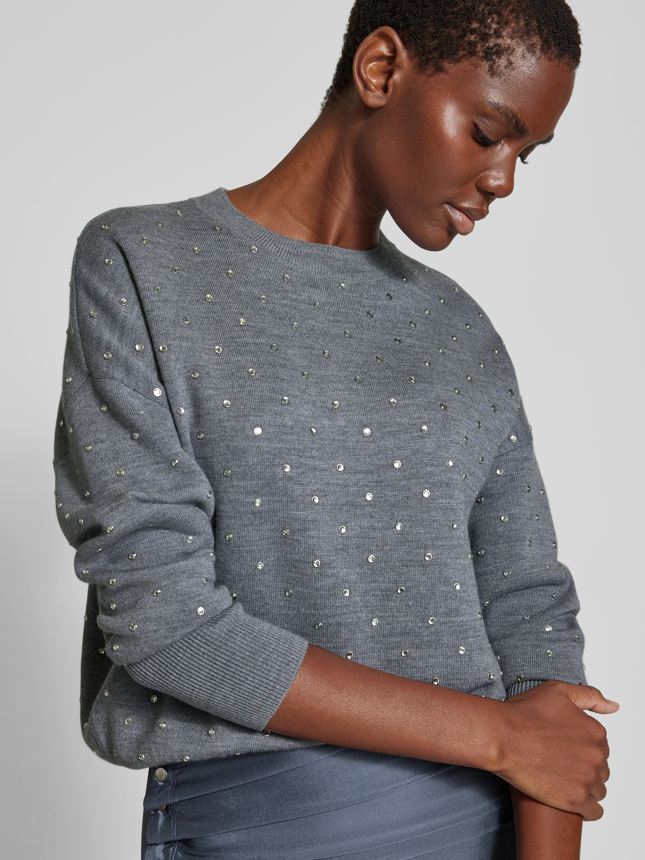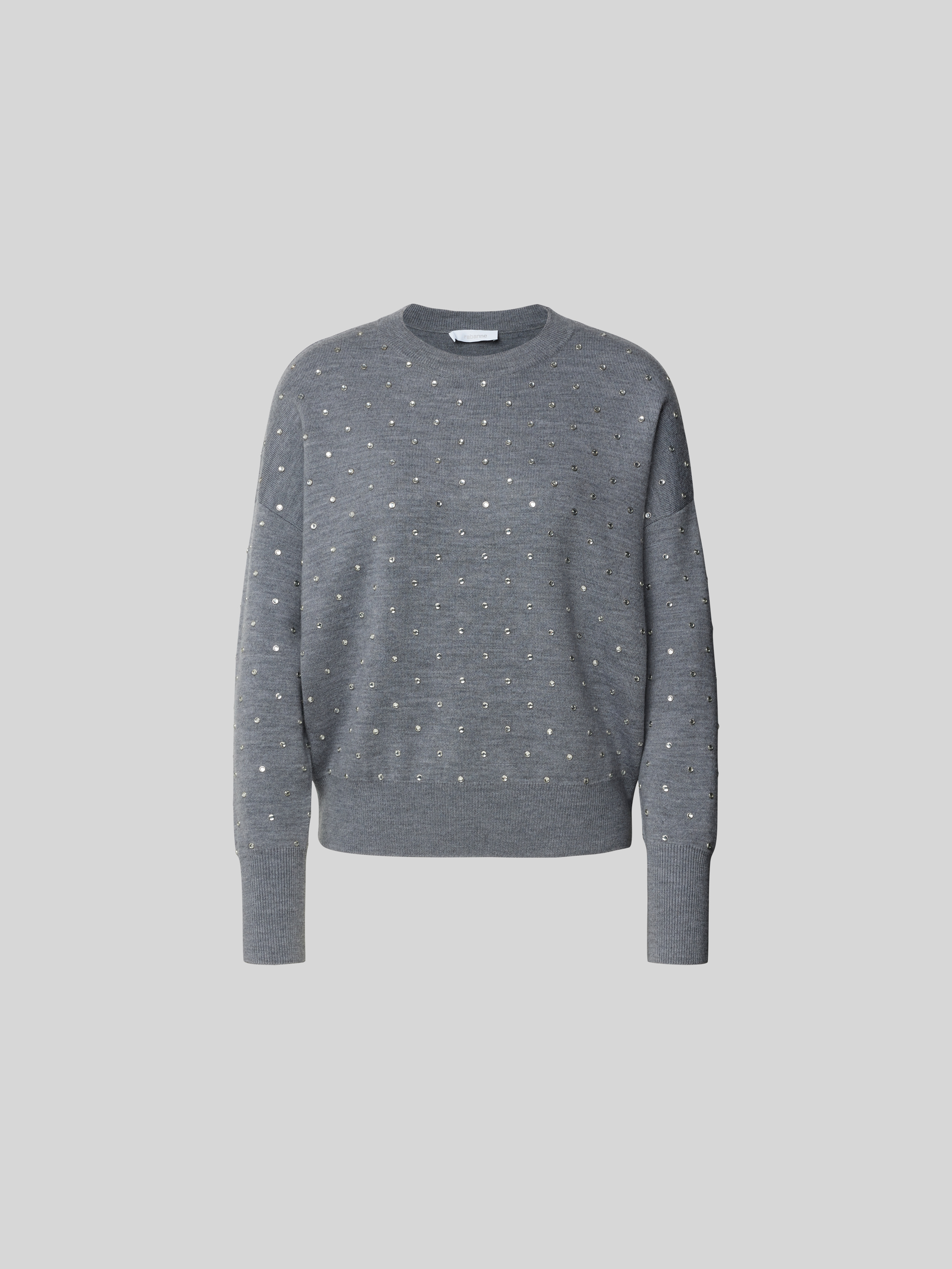 Der Damenpullover von Paco Rabanne fällt durch seinen lockeren Schnitt angenehm auf und lässt sich vielseitig kombinieren. Ein Woll-Mix sorgt für ein angenehmes Tragegefühl, während Strasssteine dezente Akzente setzen. Dank geripptem Rundhalsausschnitt bleibt der Look entspannt und alltagstauglich.