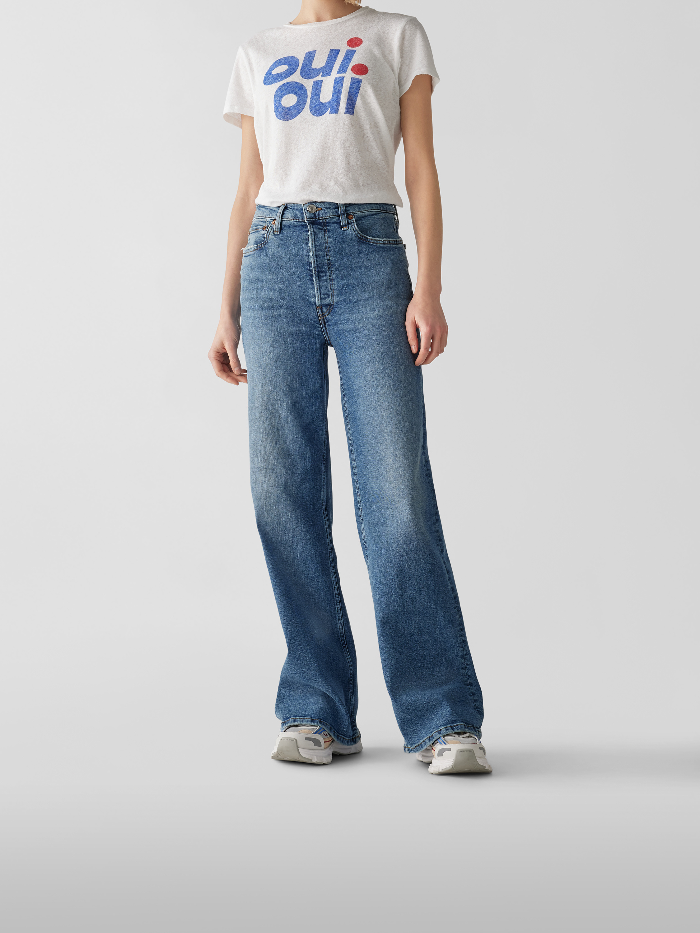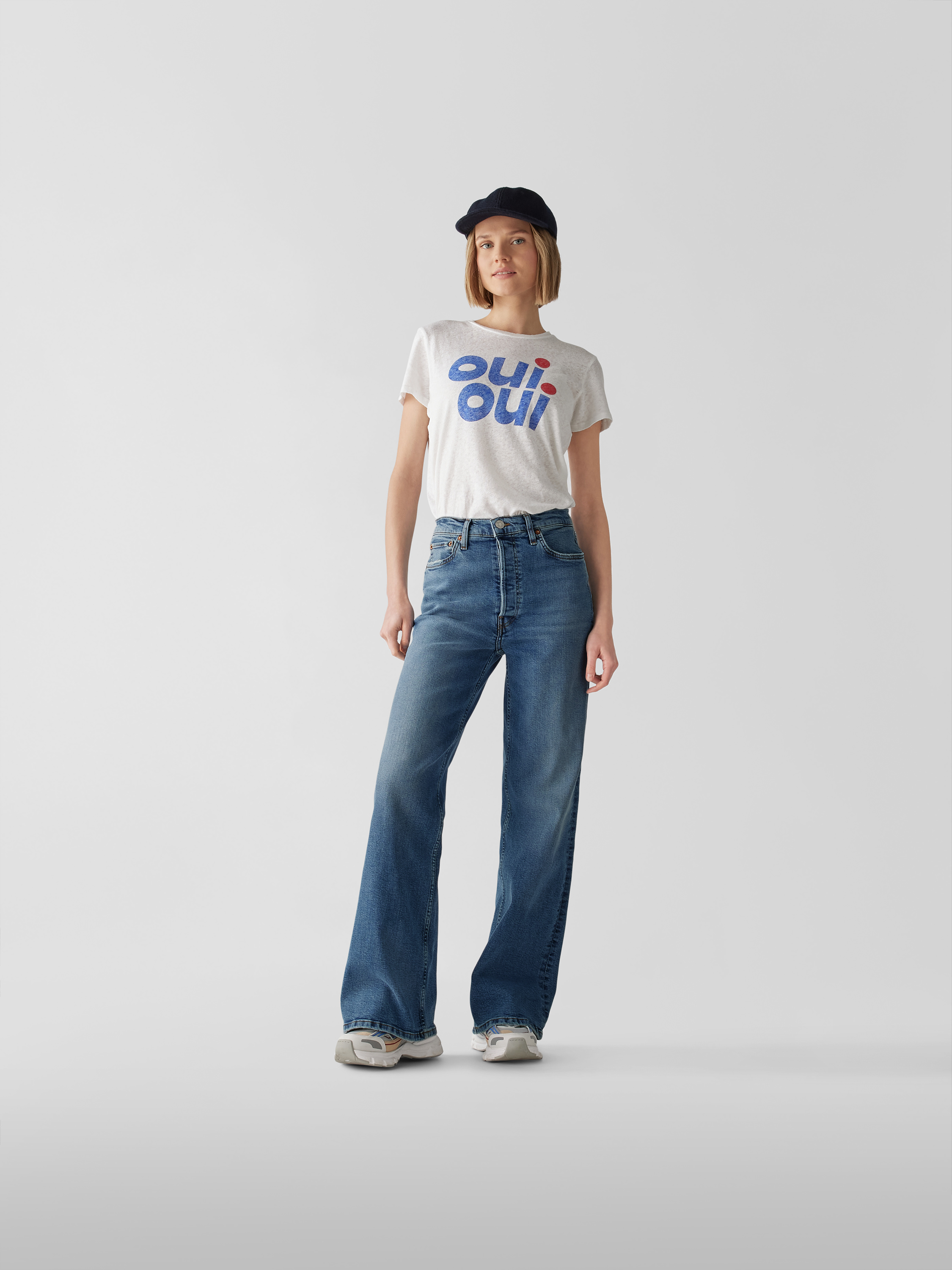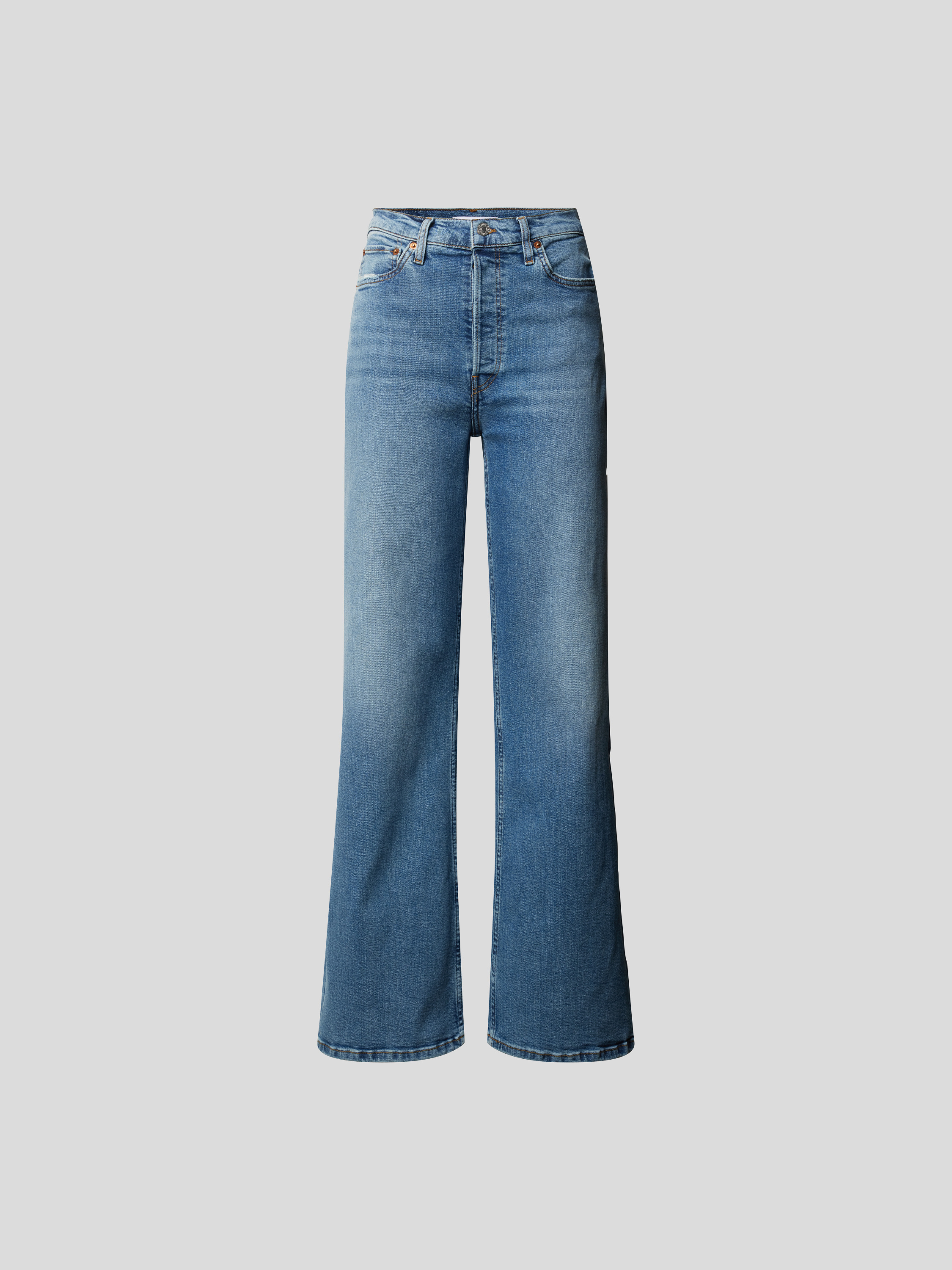 Die Damenjeans High Rise Flared Fit von RE/DONE liegt angenehm an der Taille und betont durch ihren ausgestellten Schnitt die Silhouette auf dezente Weise. Der Baumwoll-Elasthan-Mix sorgt für ein geschmeidiges Tragegefühl, während der Used-Look dem Outfit eine lässige Note verleiht. Dank des klassischen 5-Pocket-Designs erhält man ausreichend Stauraum für Kleinigkeiten.