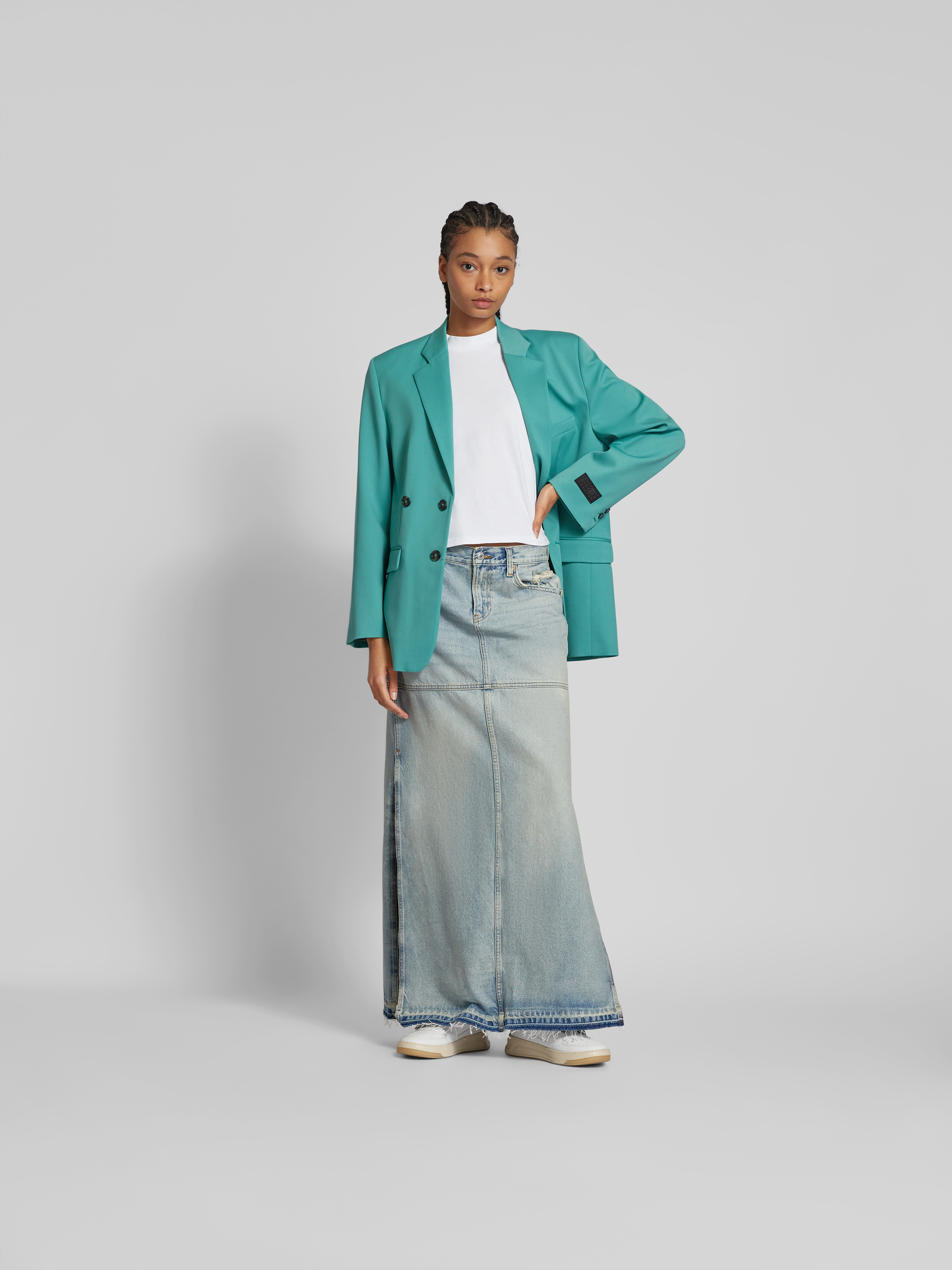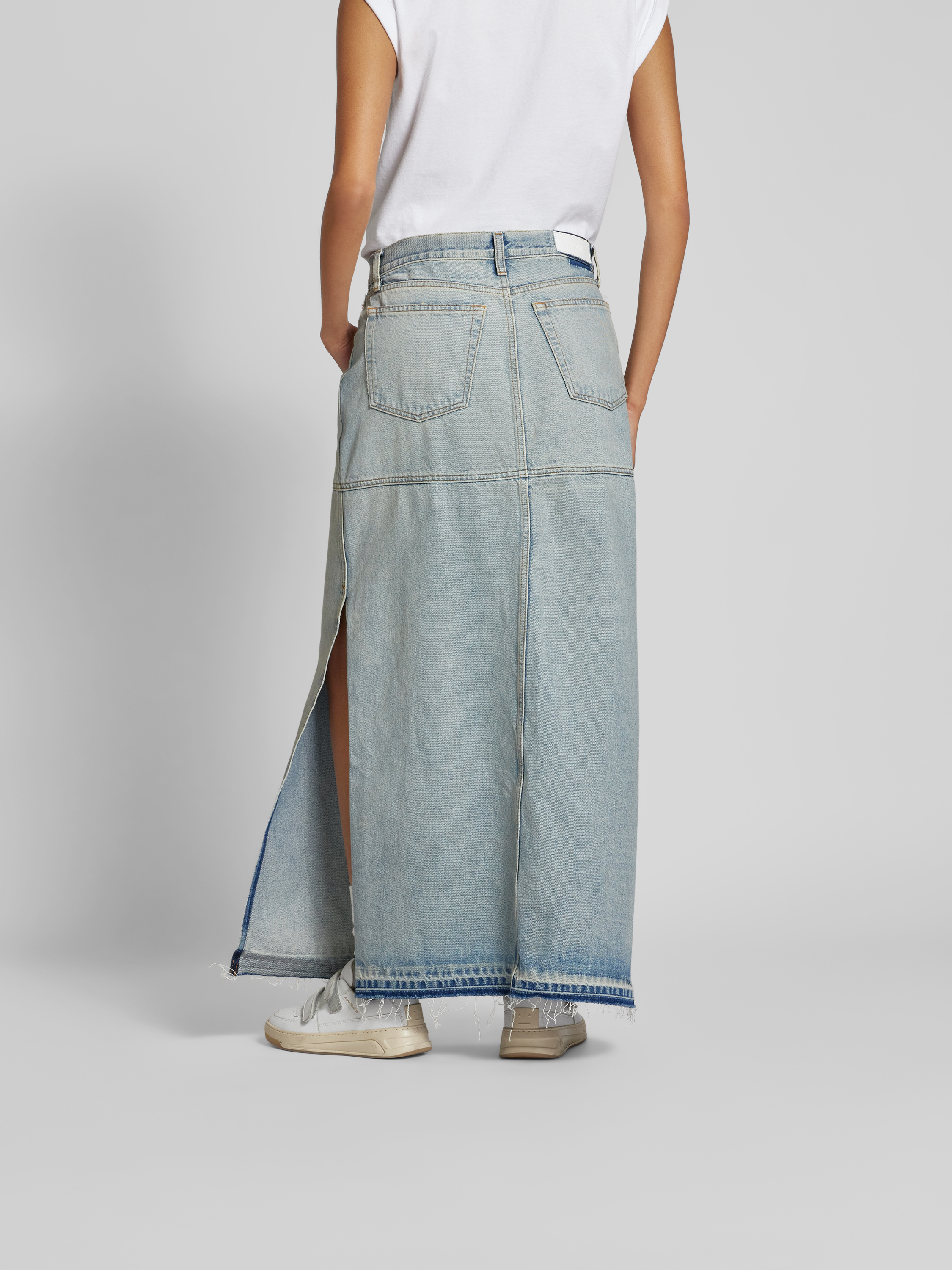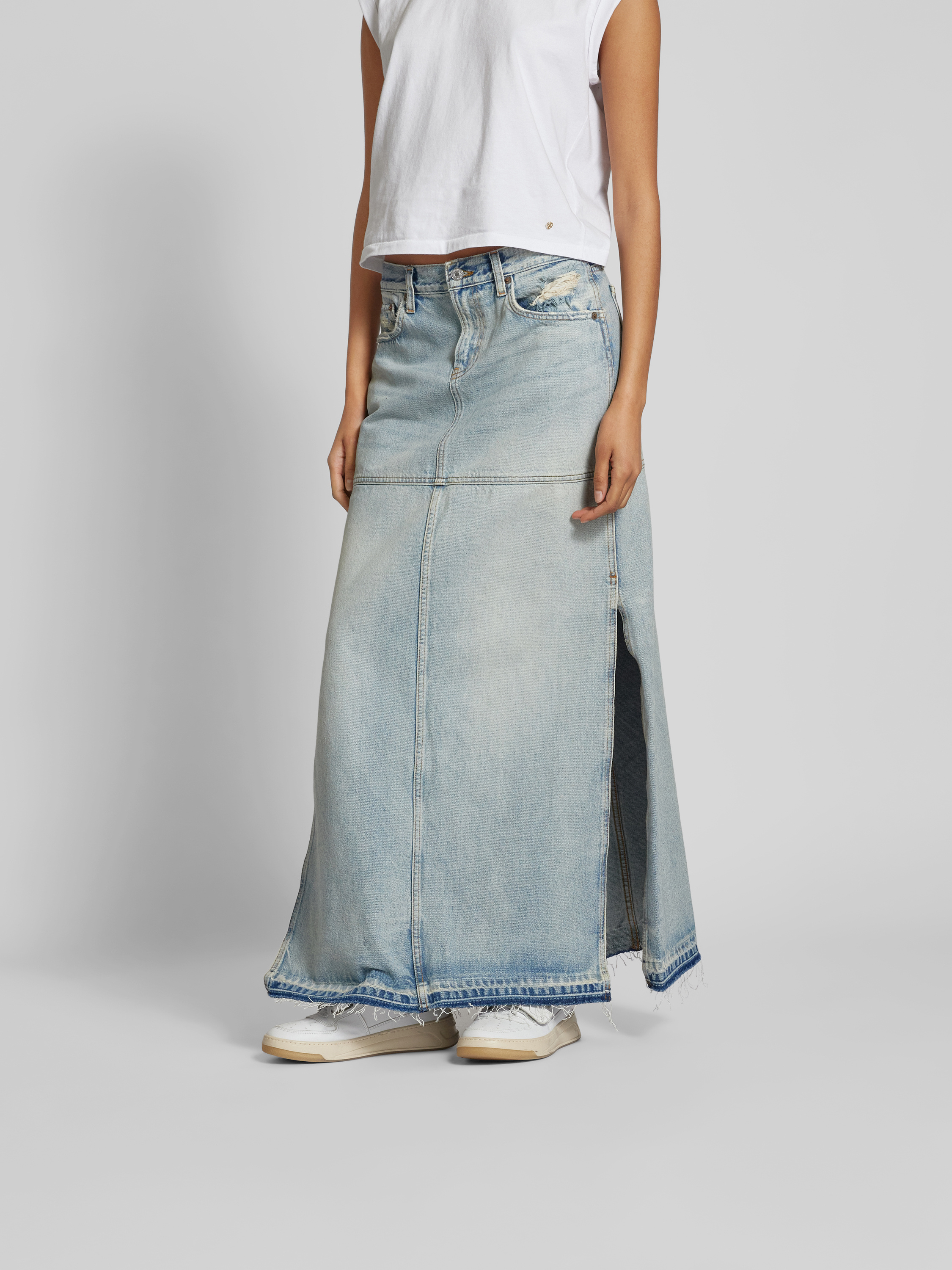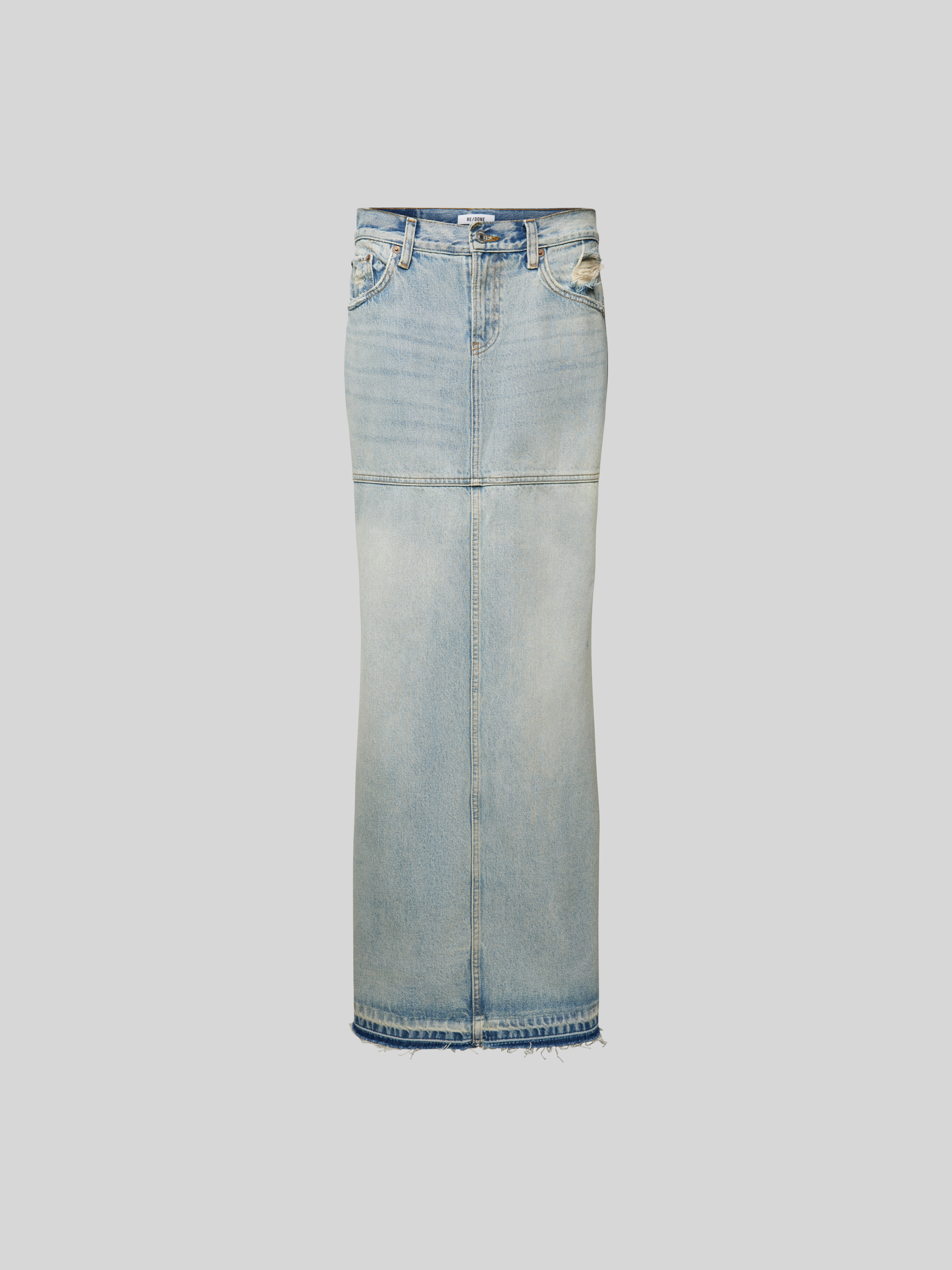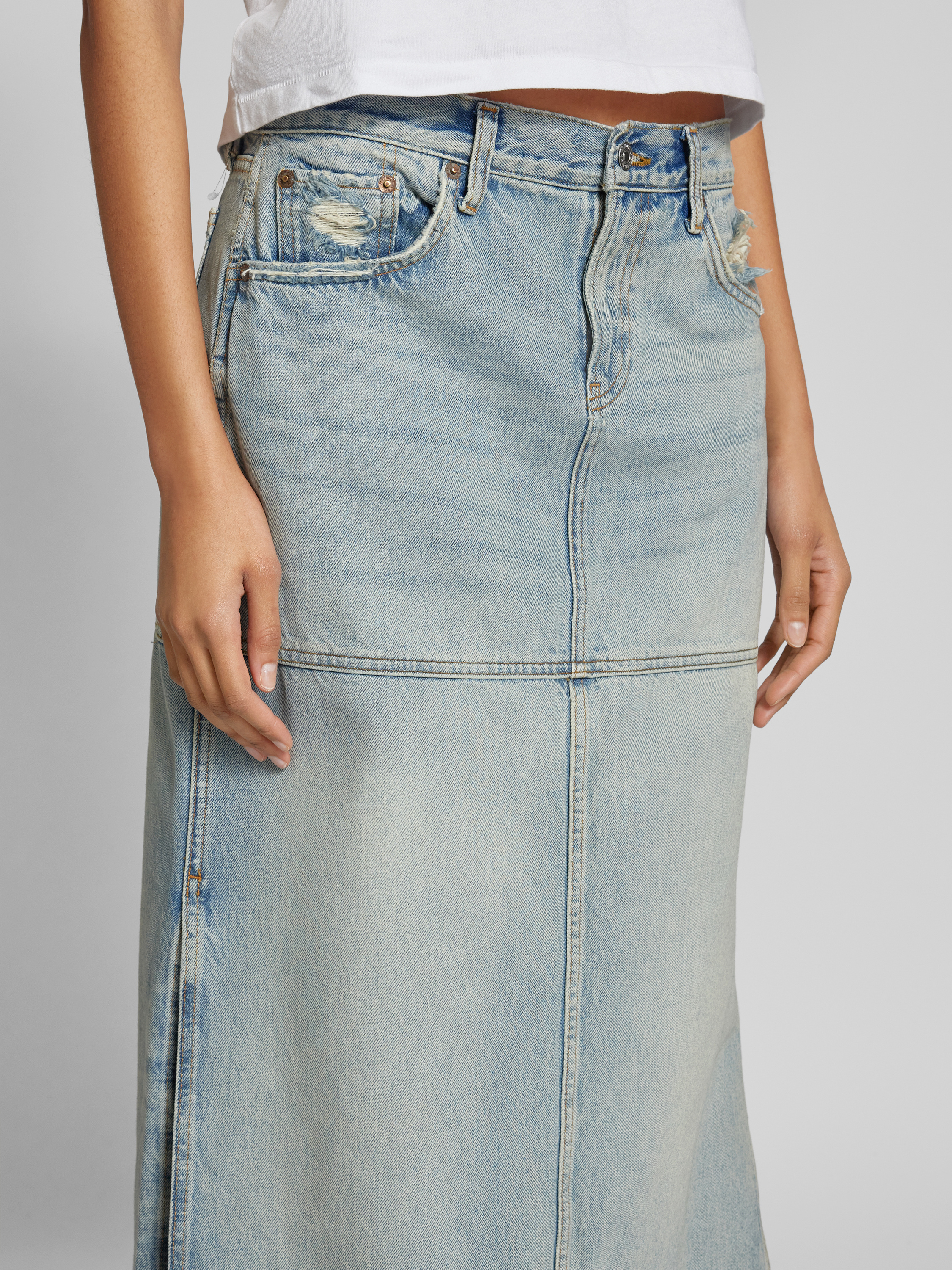 Der Jeansrock in Maxilänge von RE/DONE besteht aus reiner Baumwolle und schmiegt sich durch seine körpernahe Passform angenehm an. Das klassische 5-Pocket-Design im Used-Look verleiht dem Modell eine lässige Note, sodass er vielseitig kombinierbar bleibt. Ob im Alltag oder zu besonderen Anlässen, dieser Rock passt sich vielen Situationen an.