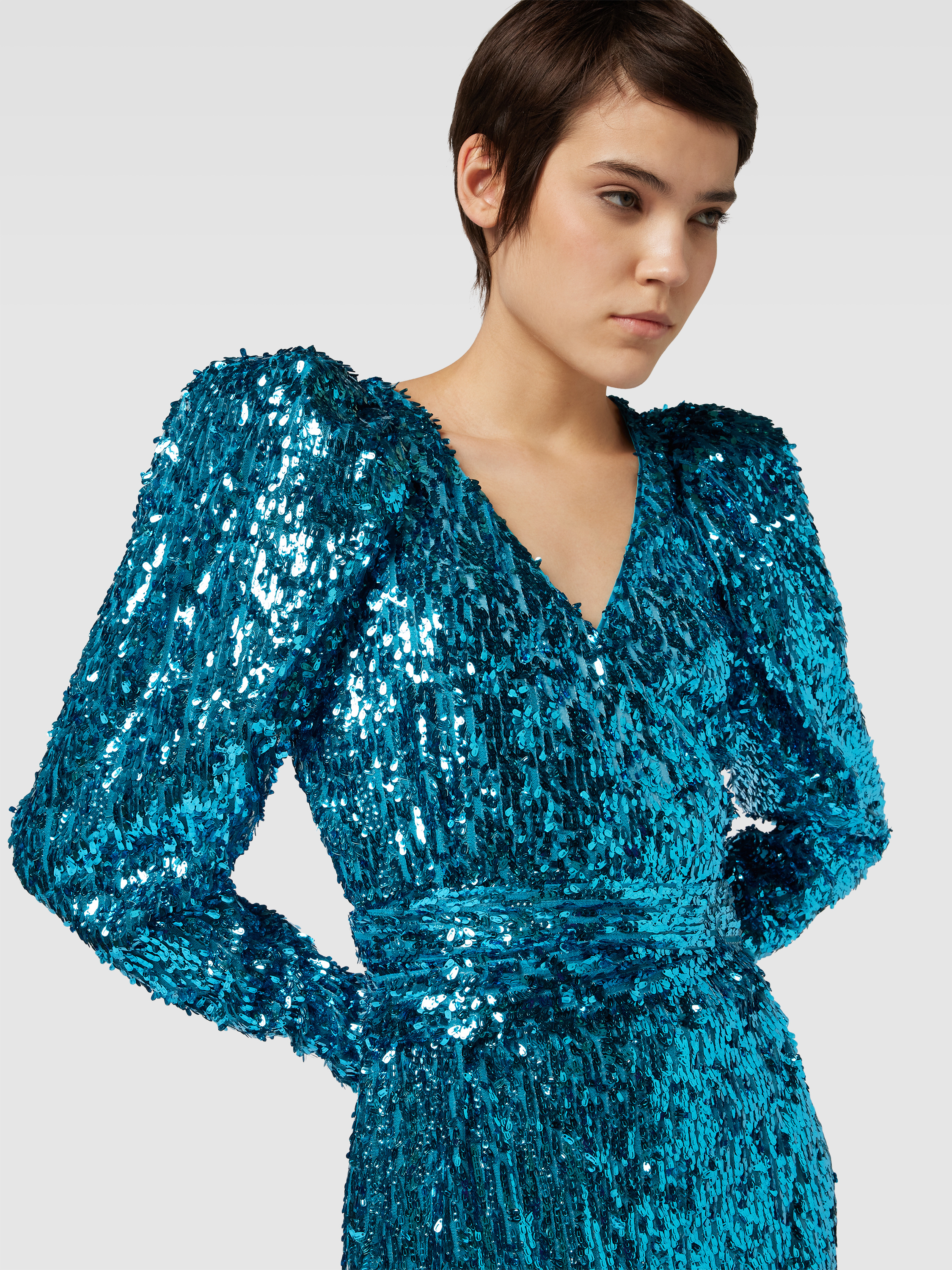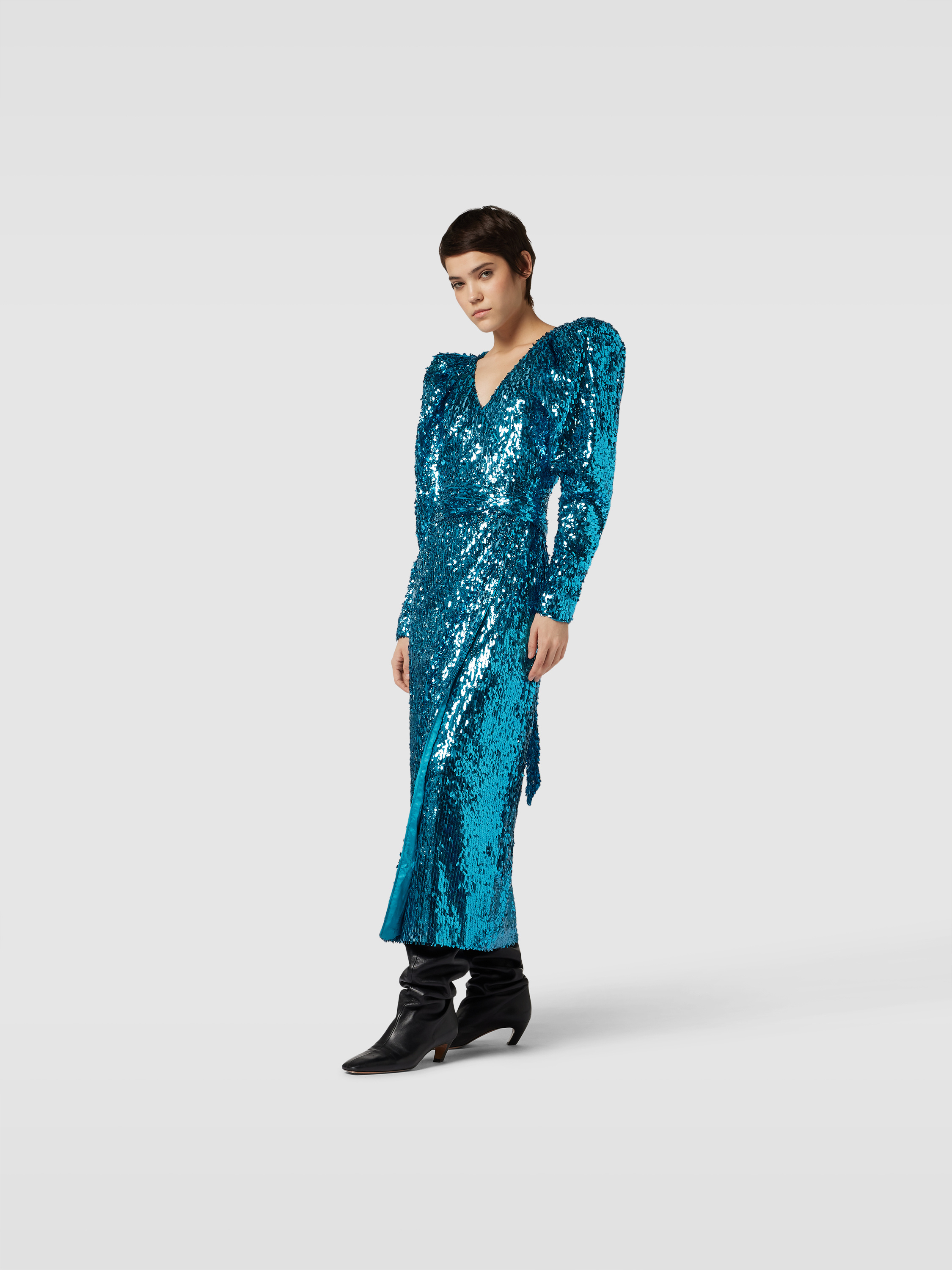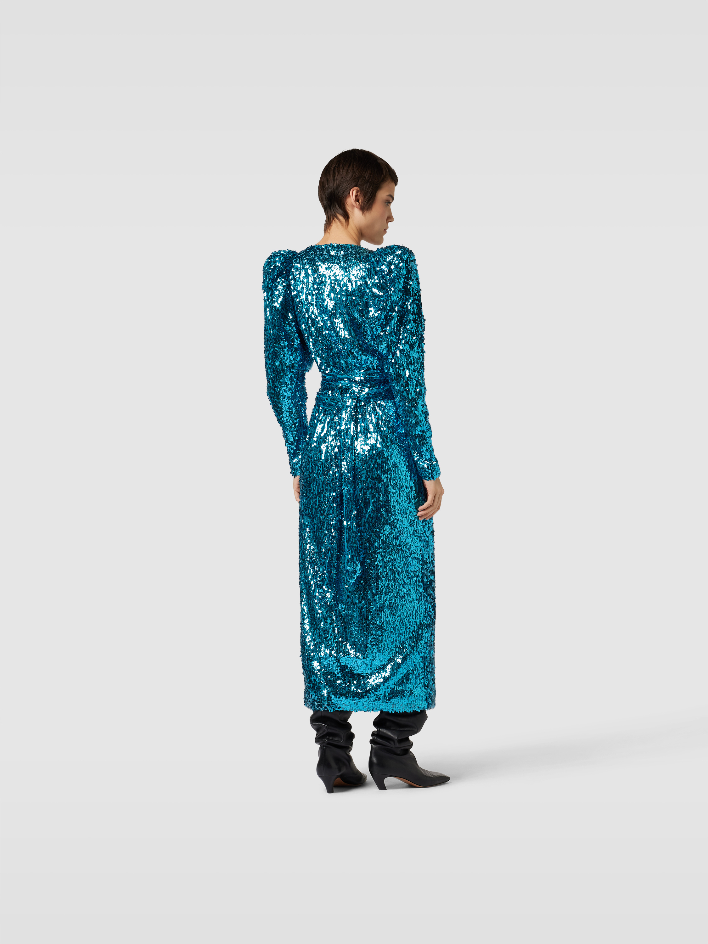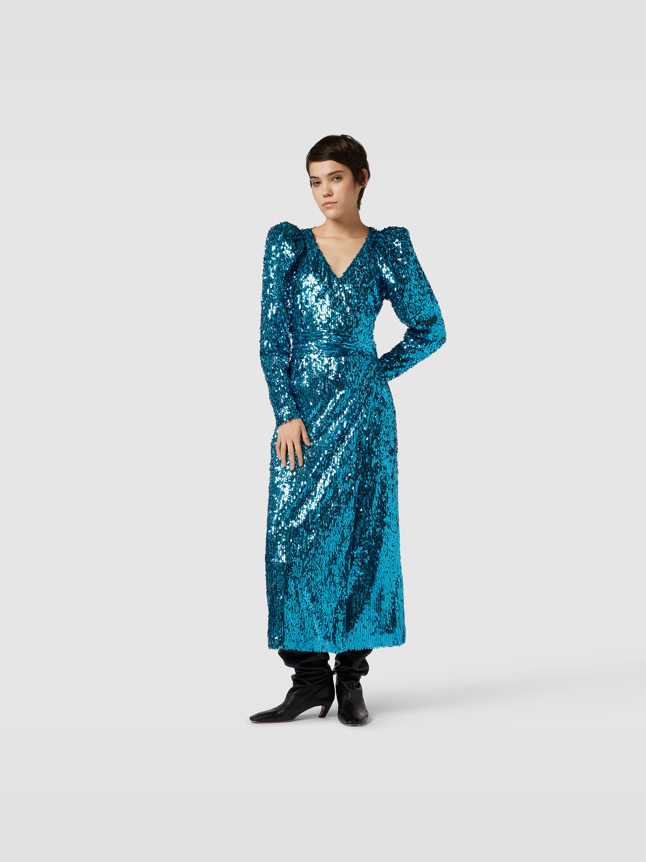 Das Maxikleid von ROTATE BIRGER CHRISTENSEN zeigt sich mit einer körpernahen Passform, die durch den V-Ausschnitt und kurze Puffärmel unterstrichen wird. Der Allover-Paillettenbesatz sorgt für einen dezenten Glanz, während das unifarbene Design vielseitig kombinierbar bleibt. So eignet sich das Kleid sowohl für festliche Anlässe als auch für besondere Momente im Alltag.