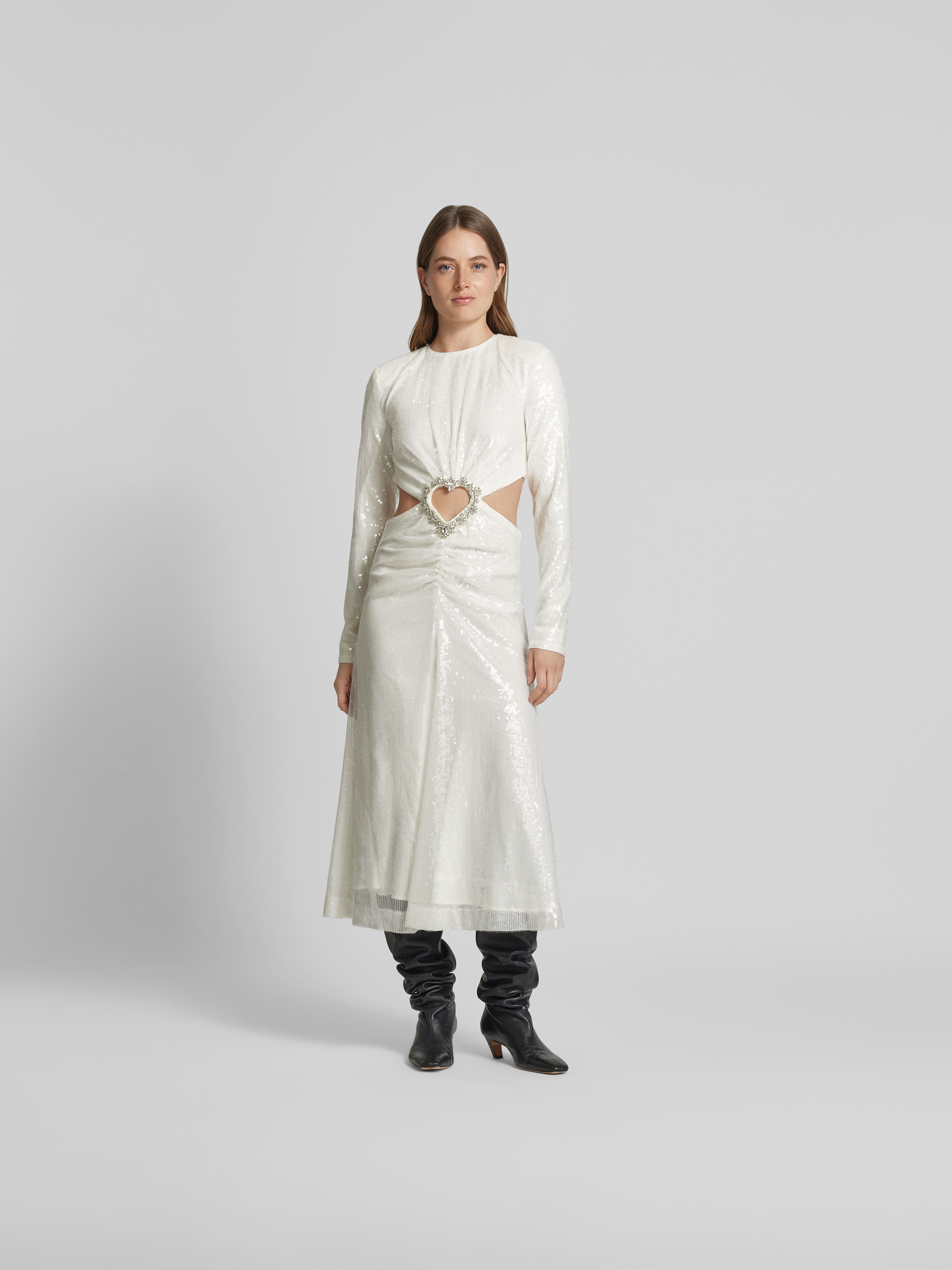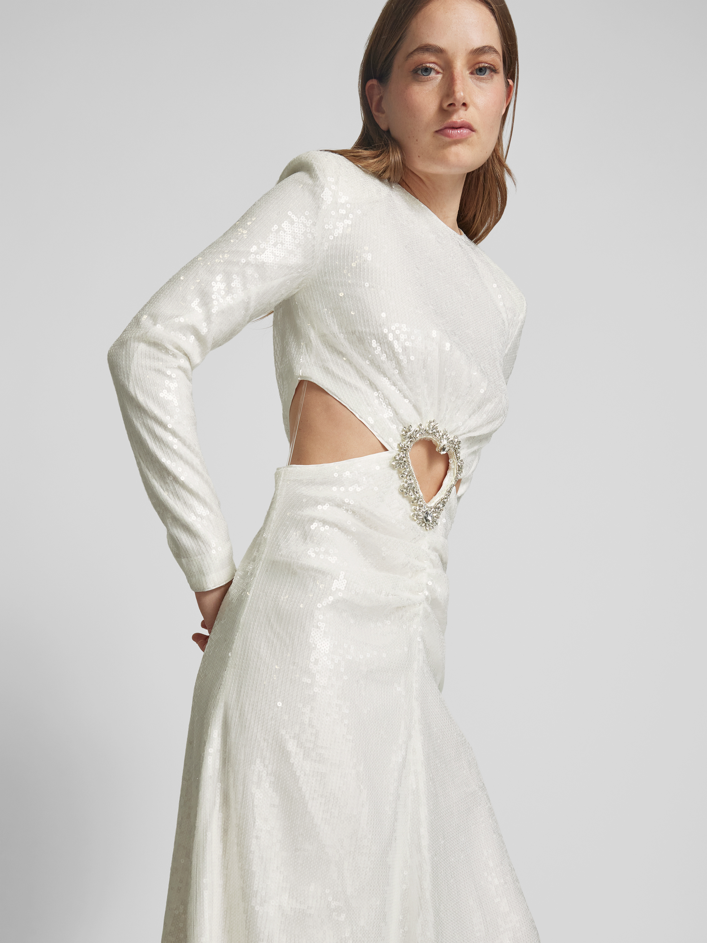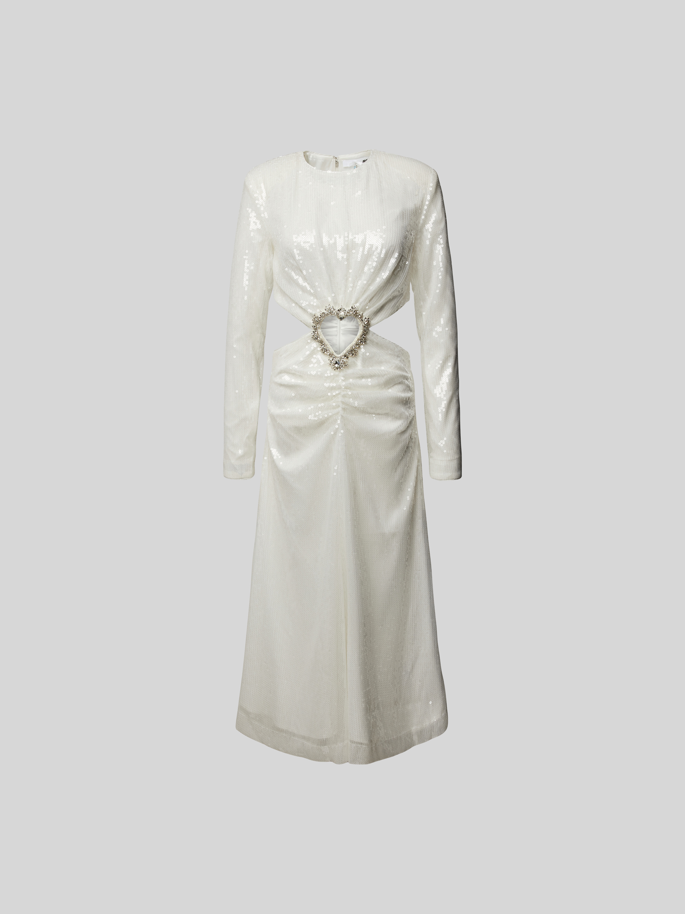 Das Midikleid mit Rundhalsausschnitt von Rotate verbindet einen taillierten Schnitt mit elegantem Paillettenbesatz und raffiniertem Cut Out. Durch den sanften Fall des Materials entsteht ein angenehmes Tragegefühl, während der feminine Stil viele Gelegenheiten im Alltag und zu besonderen Anlässen eröffnet.