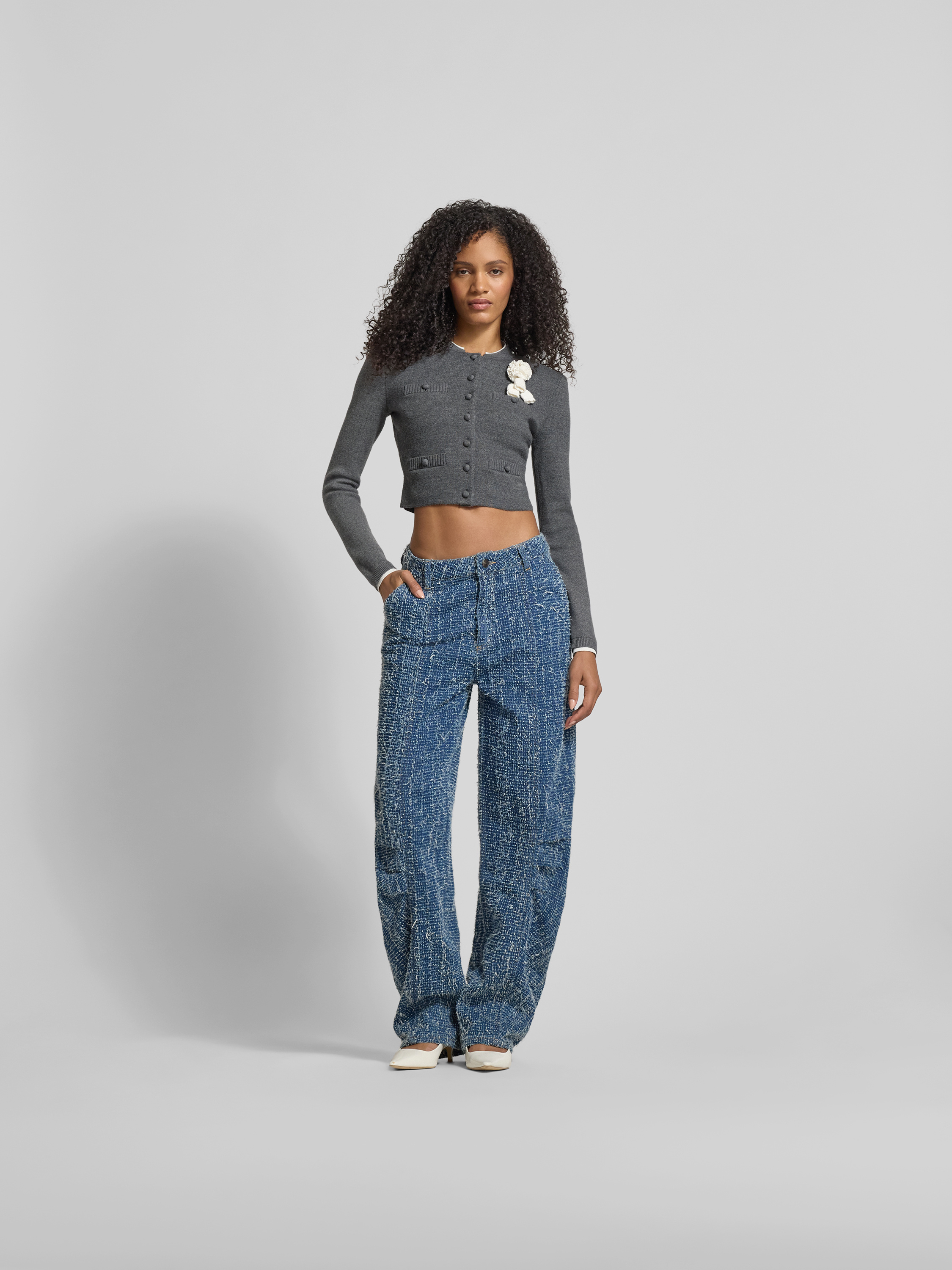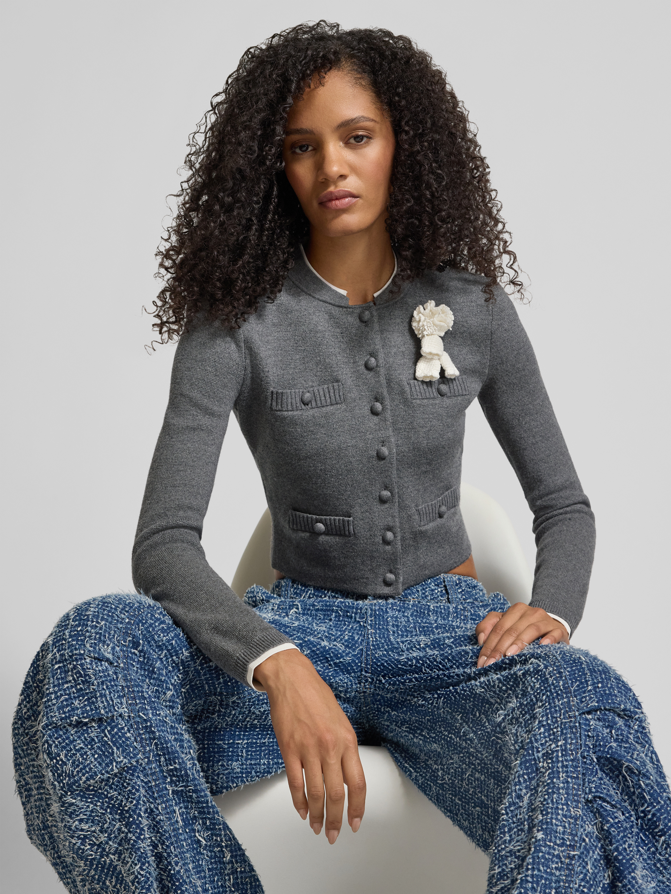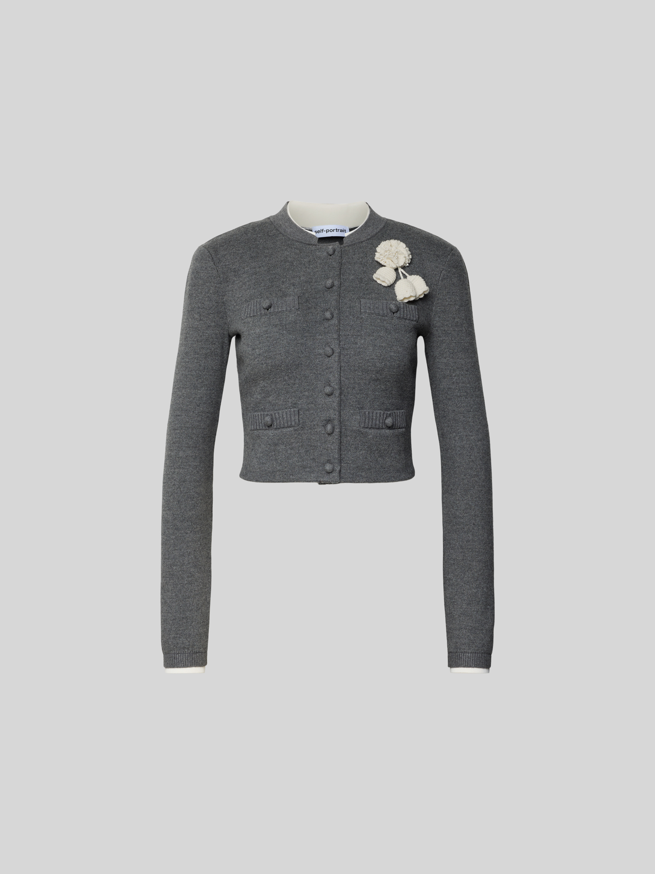 Die Cropped Jacke von Self-Portrait zeigt sich in einer feinen Strick-Optik, die einen angenehmen Tragekomfort vermittelt. Florale Zierdetails verleihen dem Modell einen verspielten Akzent, während die praktischen Pattentaschen den Alltag bereichern. Durch ihre verkürzte Form lässt sich das Kleidungsstück vielseitig kombinieren.