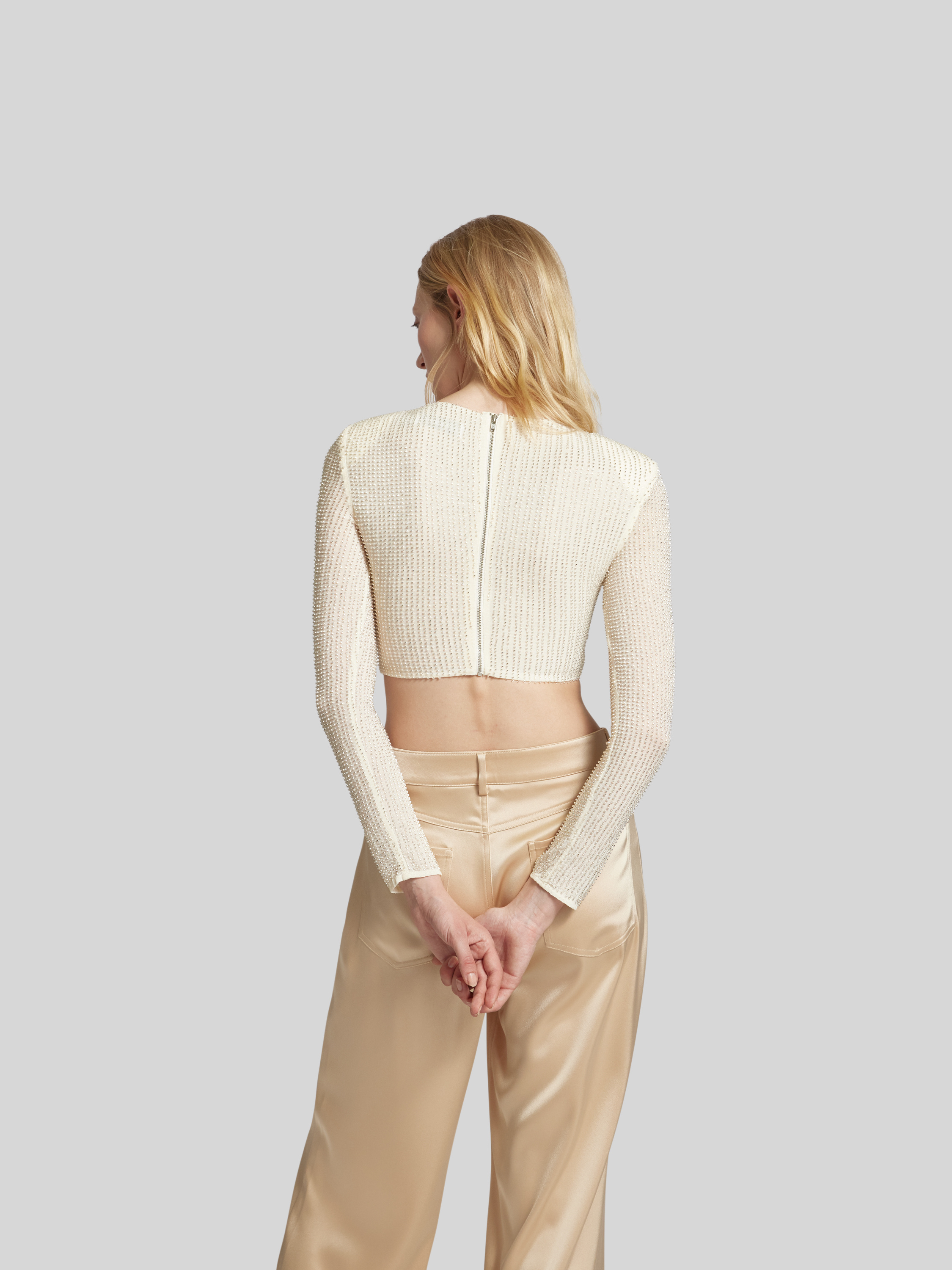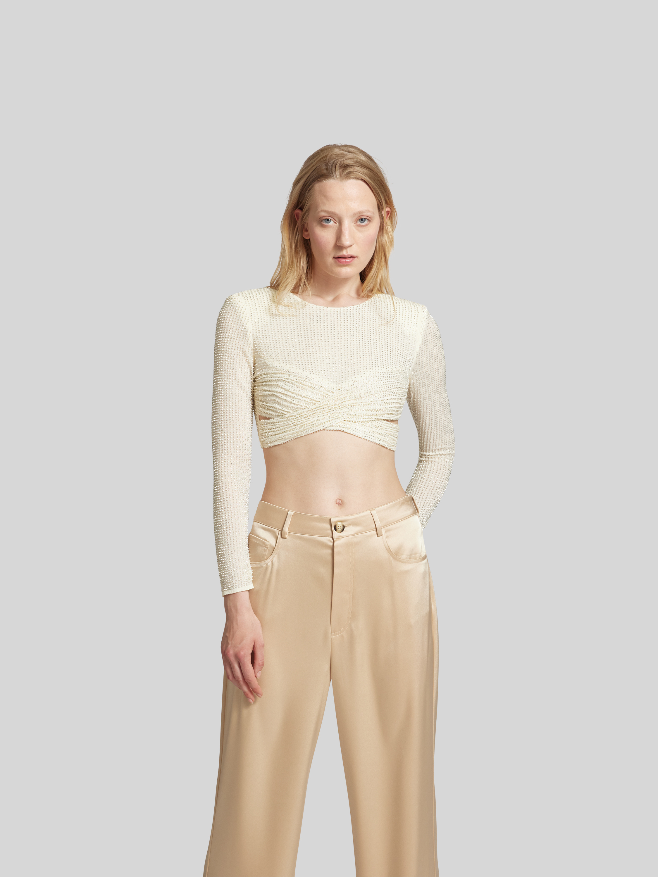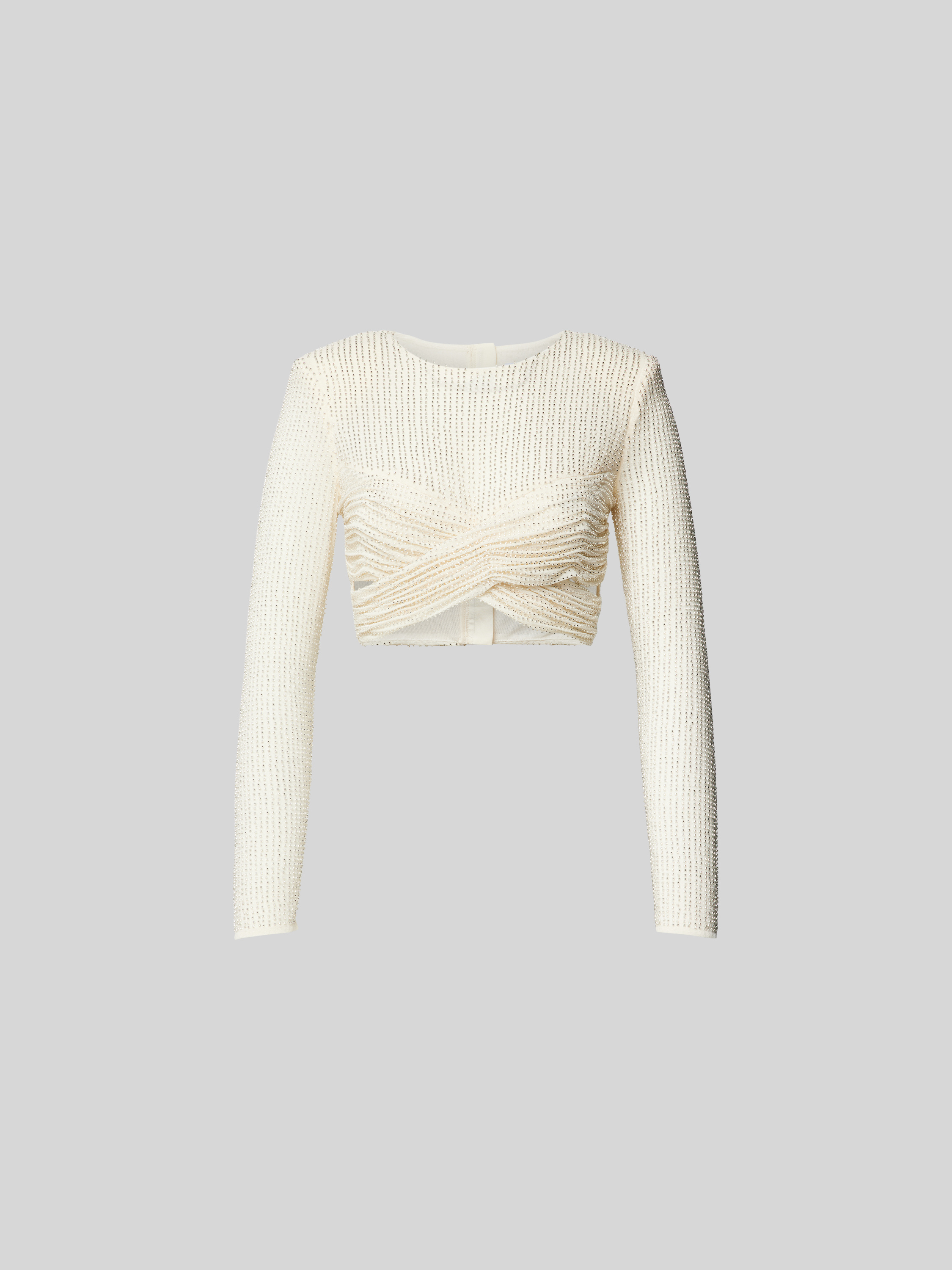 Das Damenmodell Cropped Longsleeve mit Zierbesatz von Self-Portrait verbindet eine figurnahe Passform mit modernem Schnitt. Durch den angenehmen Material-Mix mit Stretch-Anteil sitzt das Oberteil bequem, während die Wickel-Optik und der dekorative Besatz einen abwechslungsreichen Akzent im Outfit setzen.