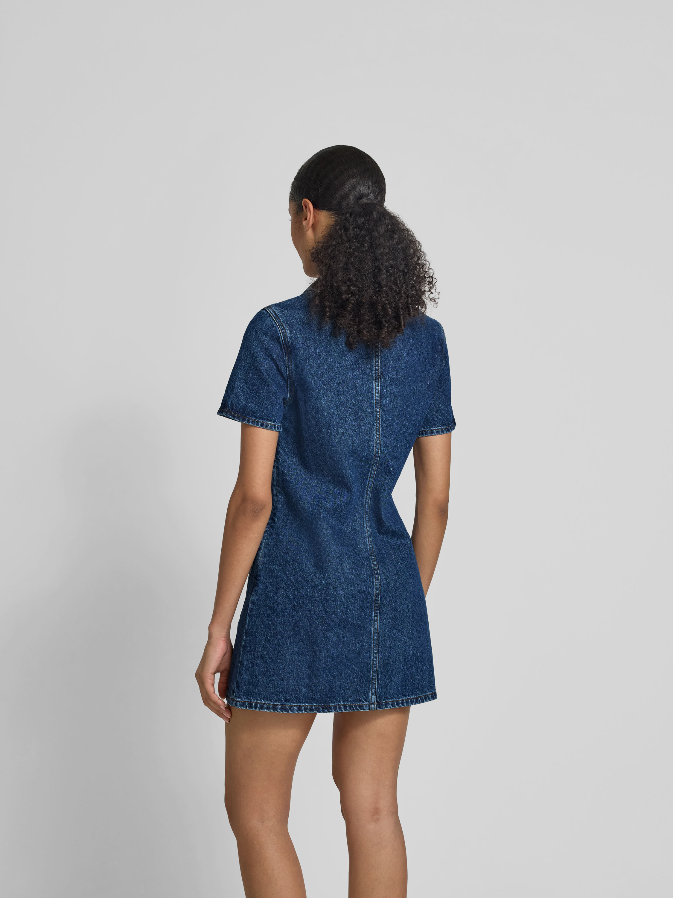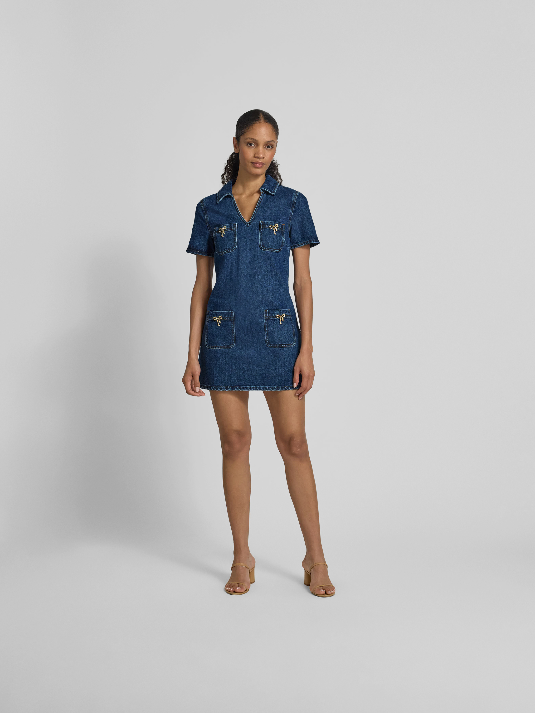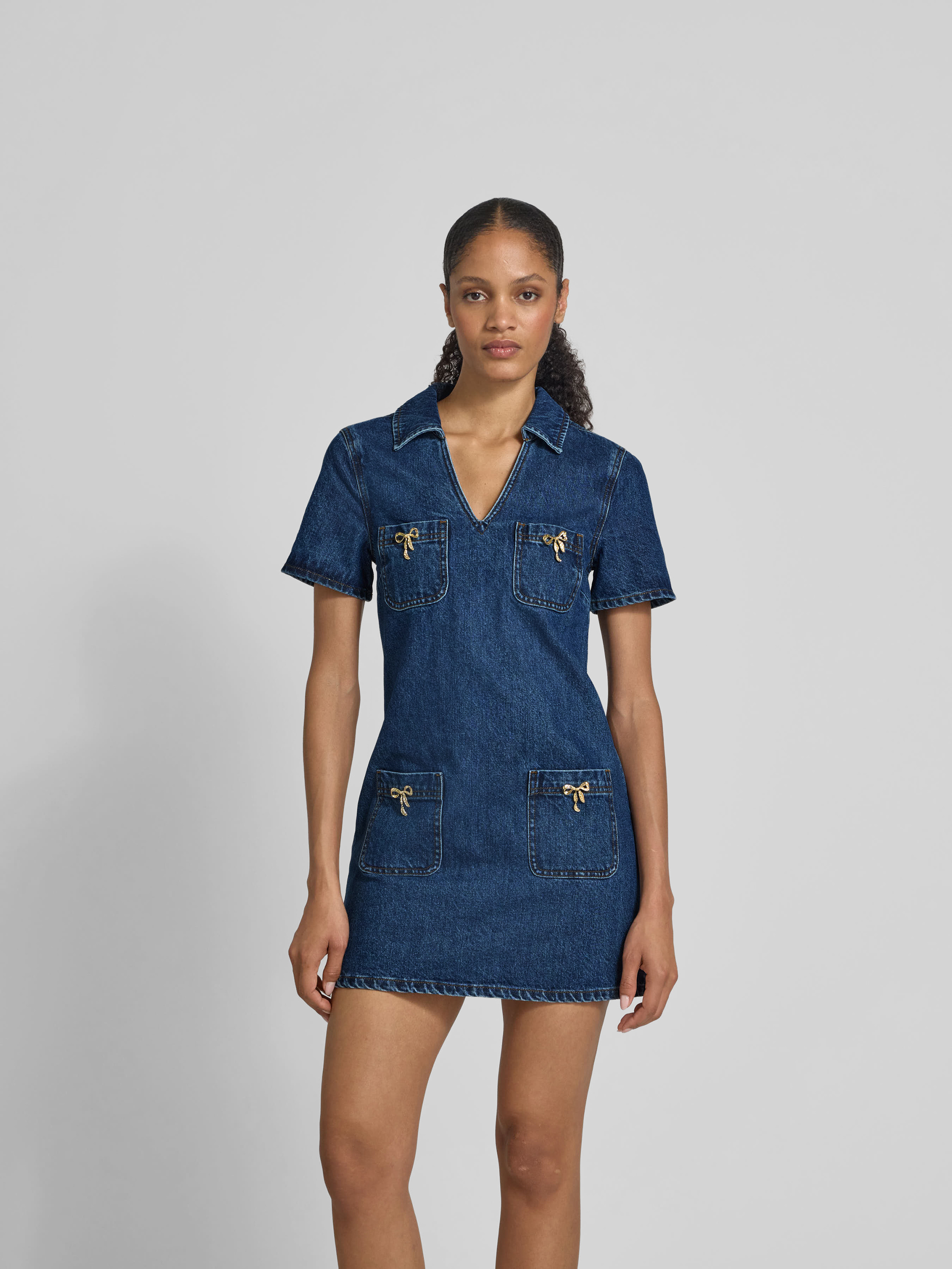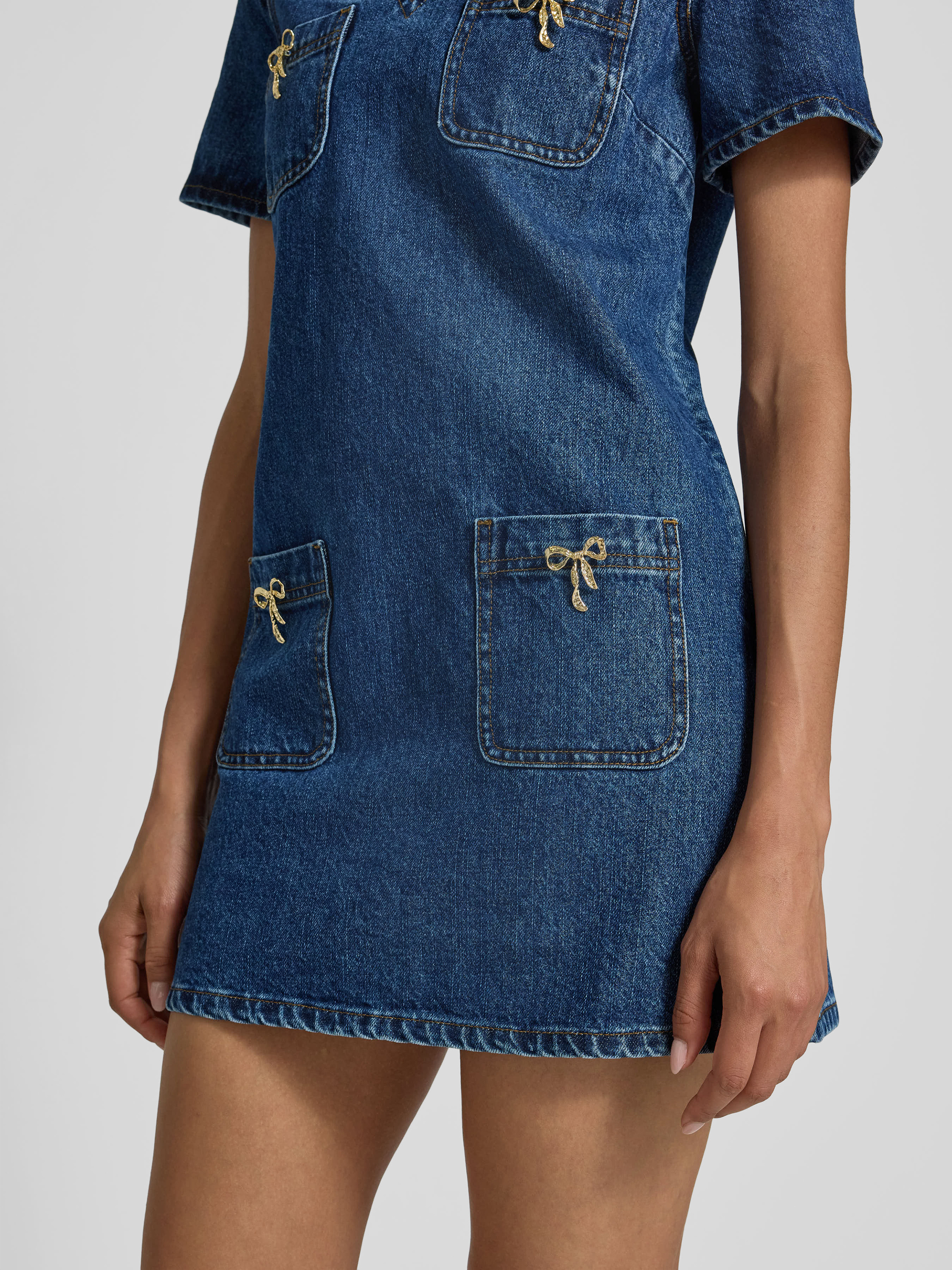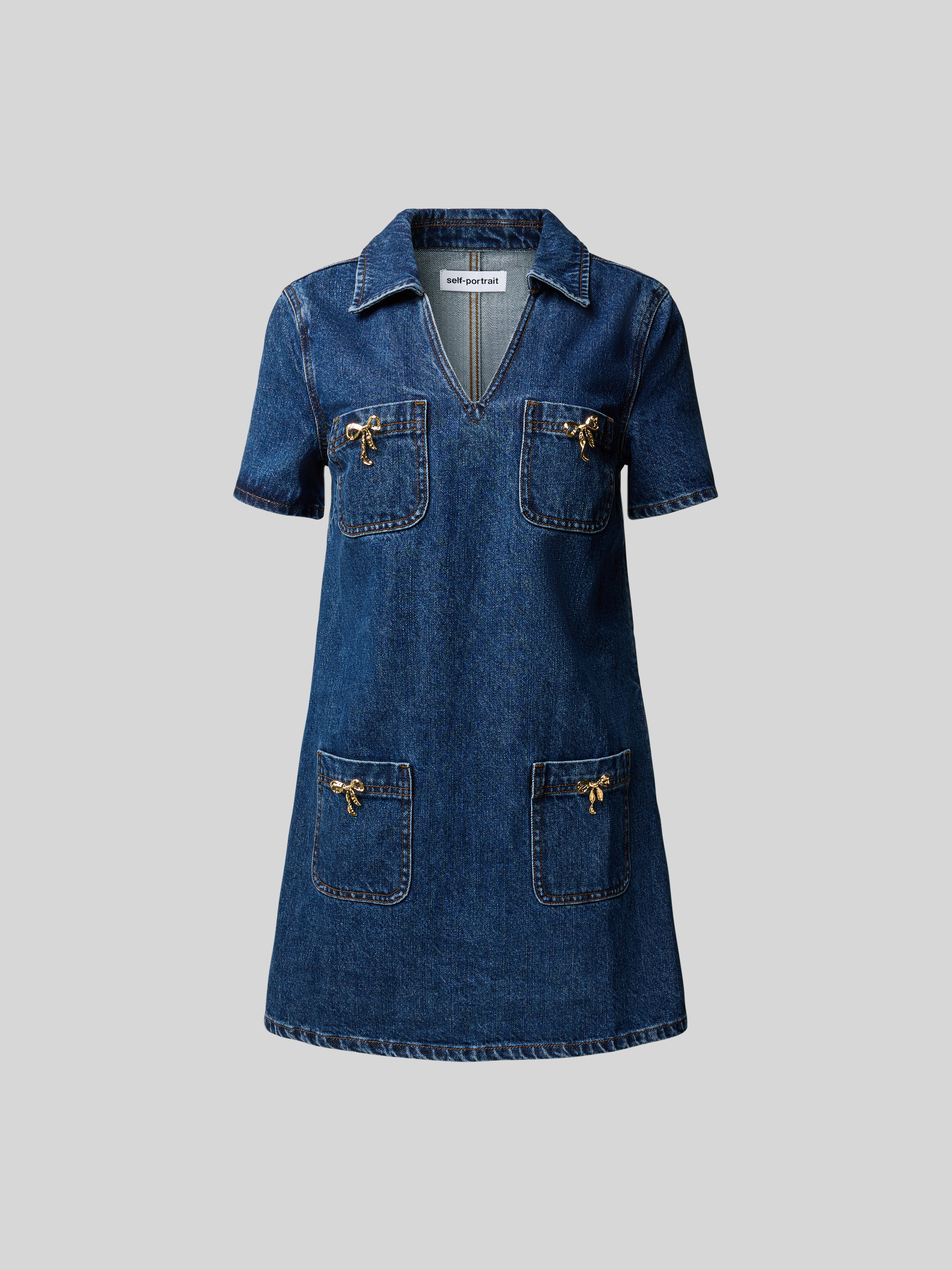 Das Jeanskleid von Self-Portrait kombiniert klassische Eleganz mit moderner Raffinesse. Aus reiner Baumwolle gefertigt, bietet es ein angenehmes Tragegefühl und eine leichte A-Linien-Silhouette. Die aufgesetzten Taschen mit metallicfarbenen Zierschleifen verleihen dem kurzärmeligen Design einen besonderen Akzent.
