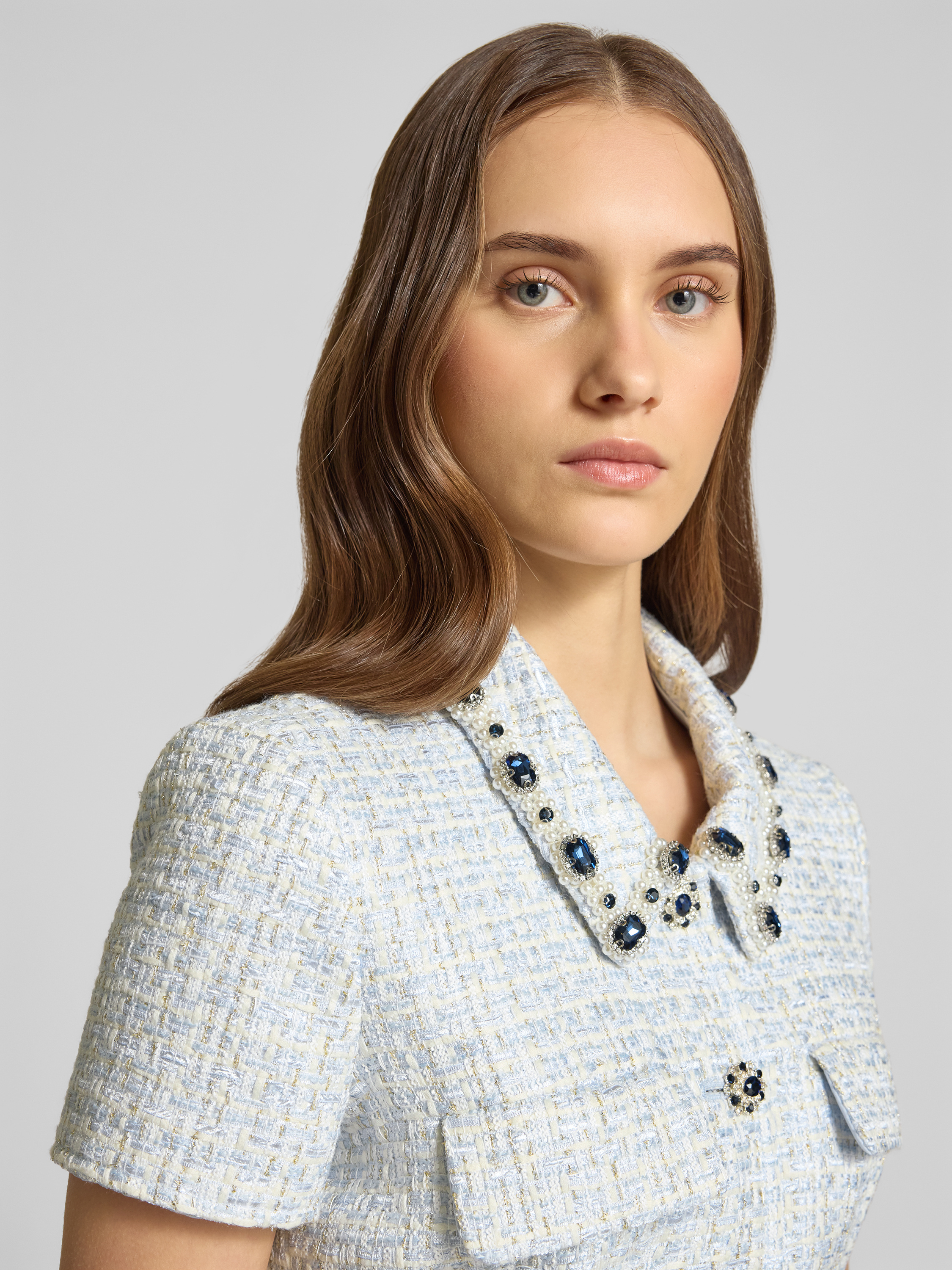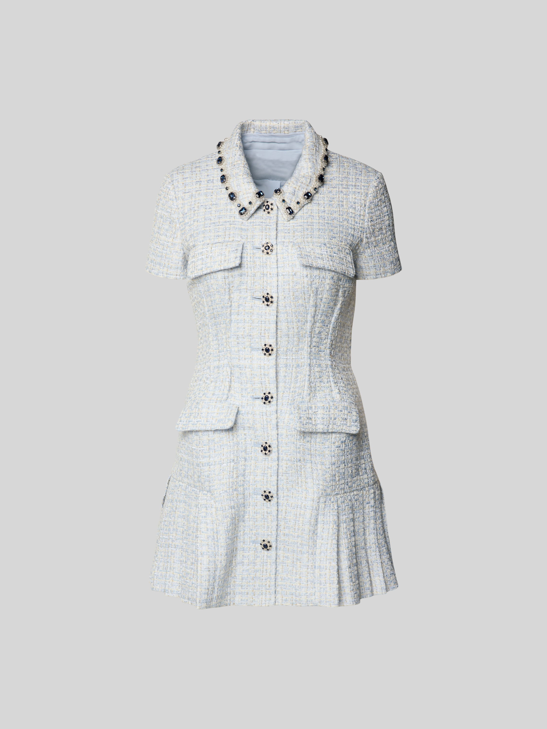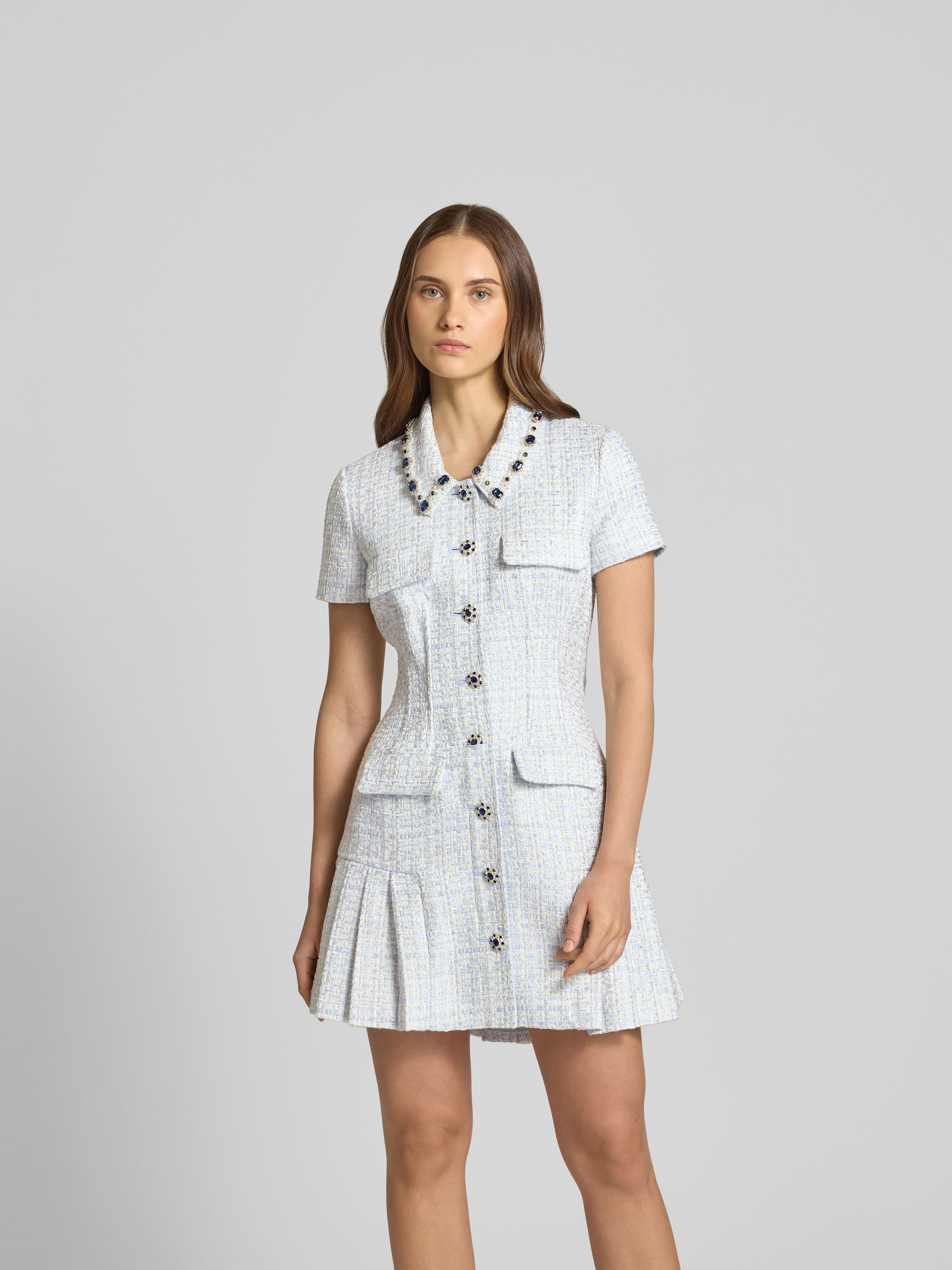 Das Damen Kleid von Self-Portrait fällt durch seinen taillierten Schnitt angenehm auf und sitzt dabei locker über dem Knie. Ein Hemdblusenkragen und Pattentaschen verleihen dem Modell einen klassischen, leicht formellen Charakter, der vielseitig kombinierbar ist. Die Knielänge sorgt für Bewegungsfreiheit und unterstreicht den unkomplizierten Stil.