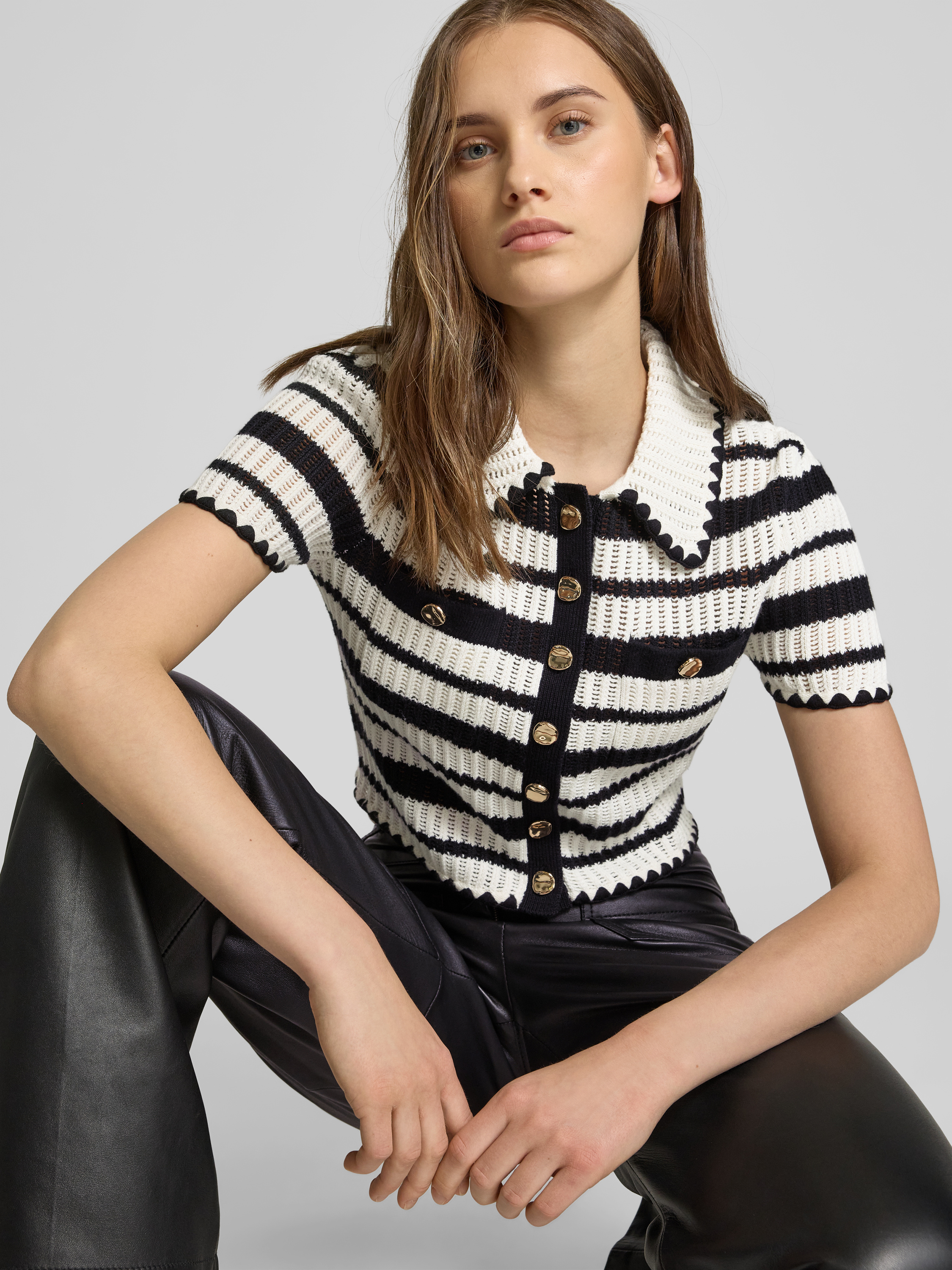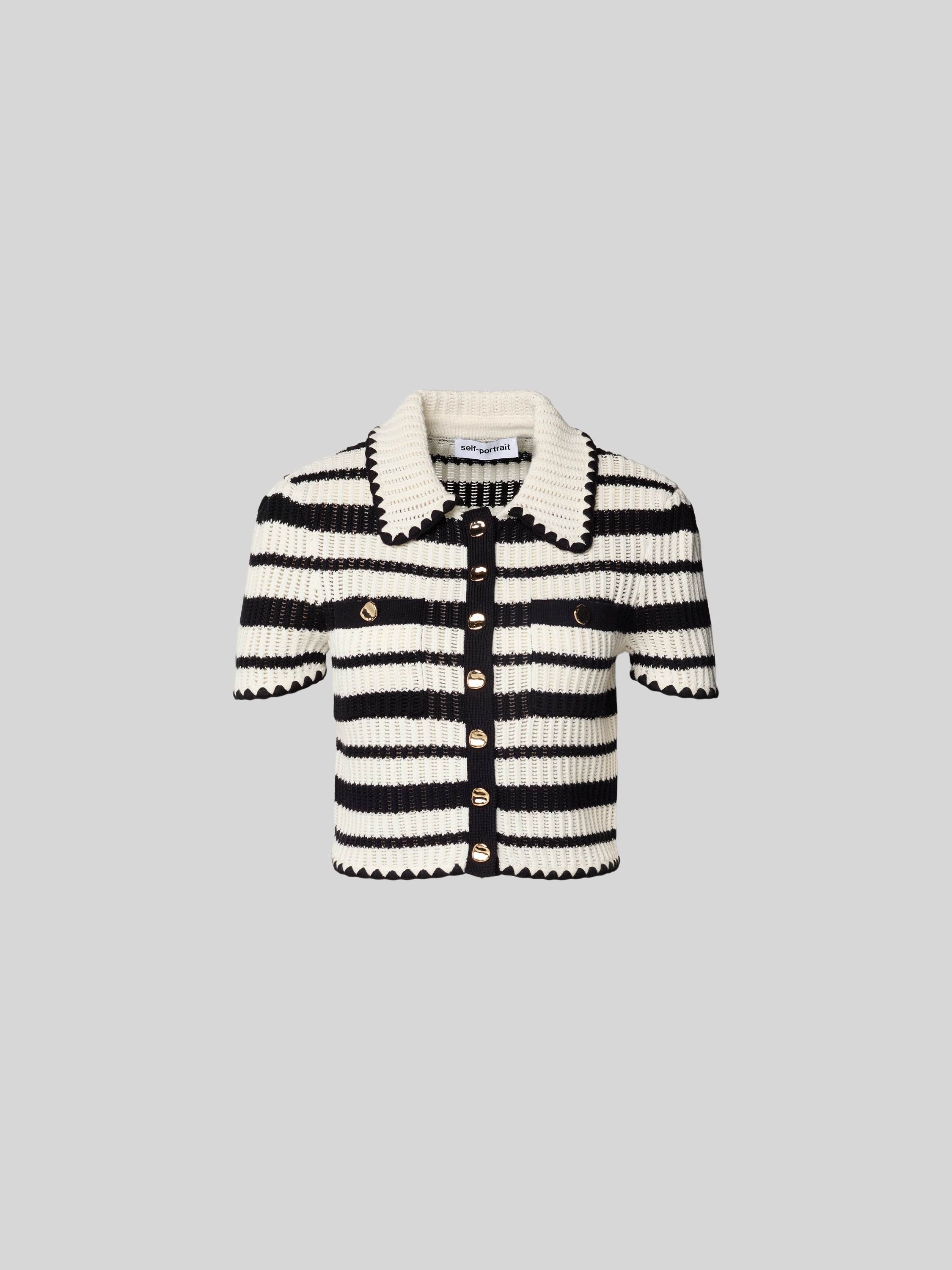Die Strickjacke von Self-Portrait vereint einen Baumwoll-Viskose-Mix mit Stretch für angenehmen Tragekomfort. In einem Regular Fit geschnitten, endet sie in einer modernen Cropped-Länge. Brusttaschen und eine durchgehende Knopfleiste sorgen für einen vielseitigen und funktionalen Look.