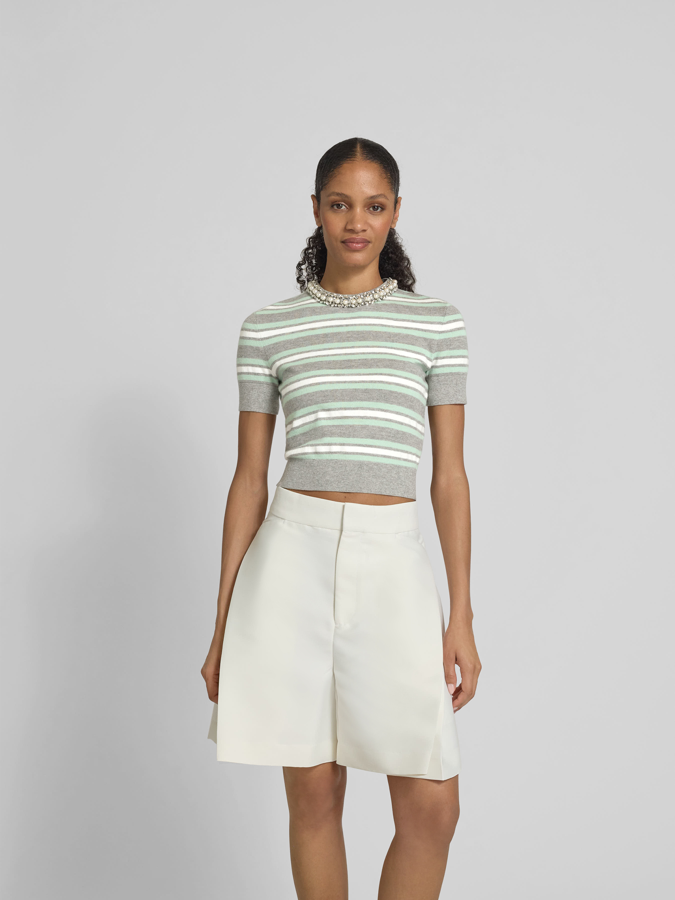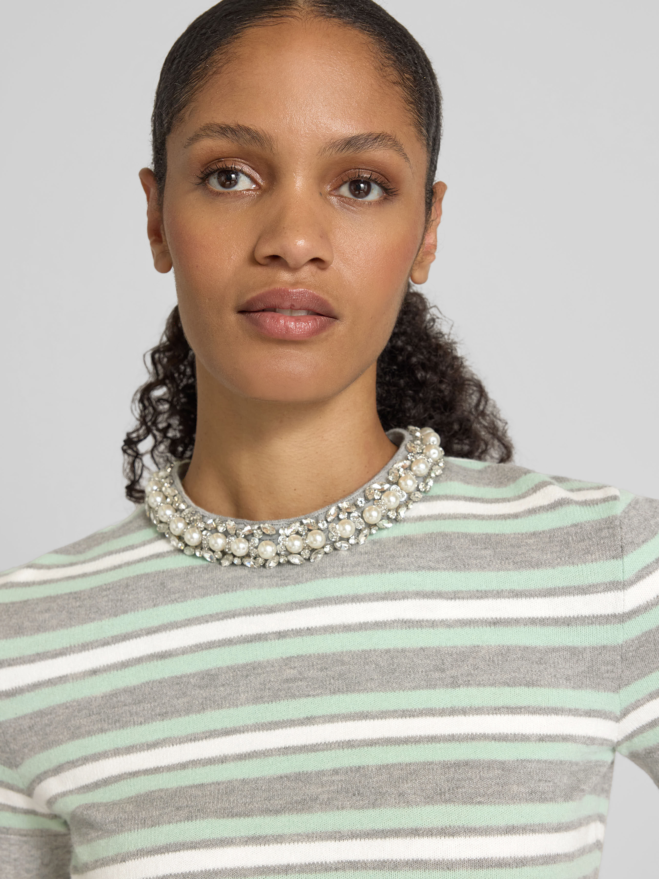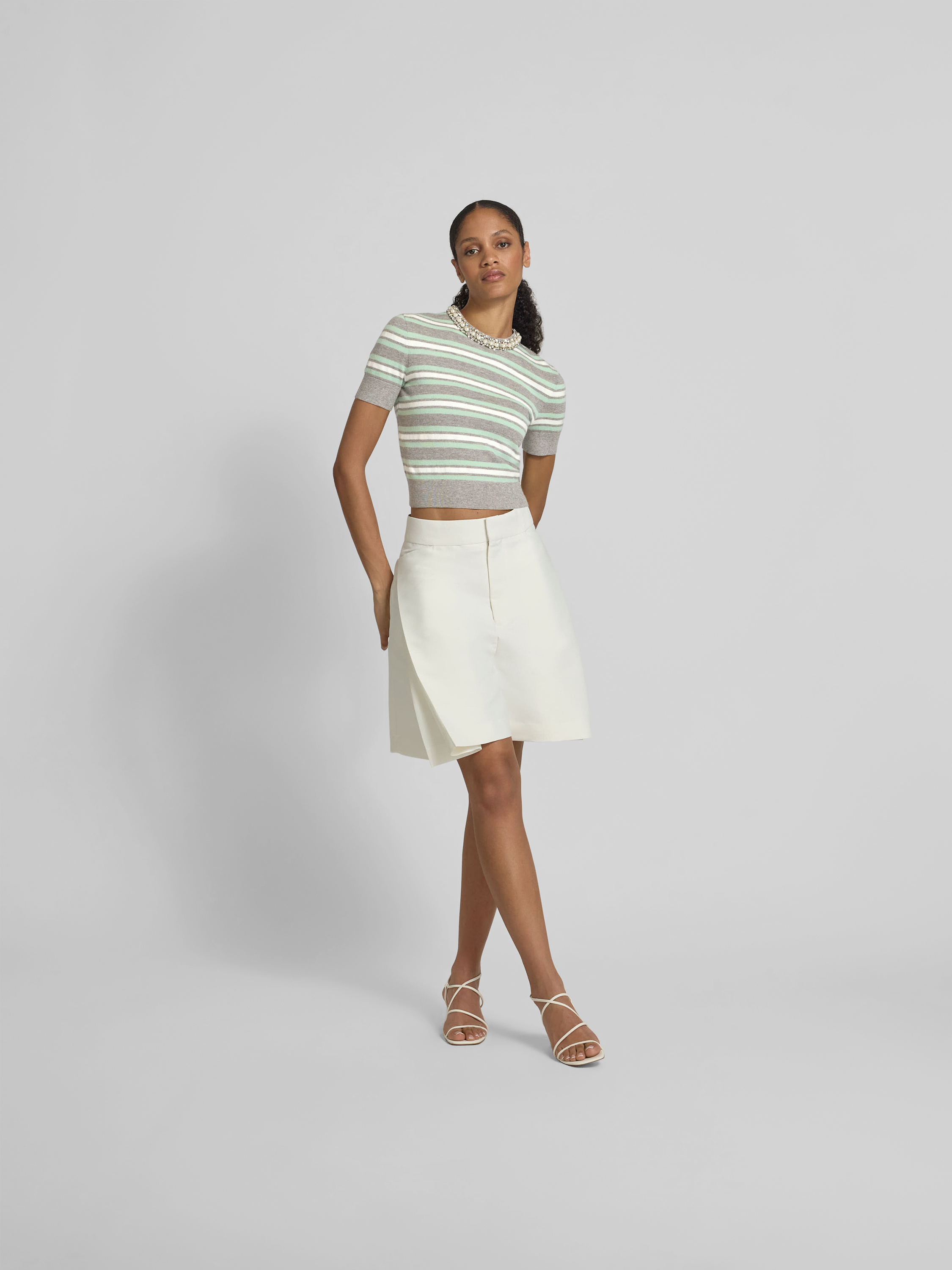 Das Damen T-Shirt von Self-Portrait aus reiner Baumwolle kombiniert eine lockere Passform mit einer stilvollen Strick-Optik. Der Rundhalsausschnitt wird durch einen dezenten Strasssteinbesatz veredelt, während das kurzärmelige Design vielseitig einsetzbar ist. Ideal für entspannte Tage.