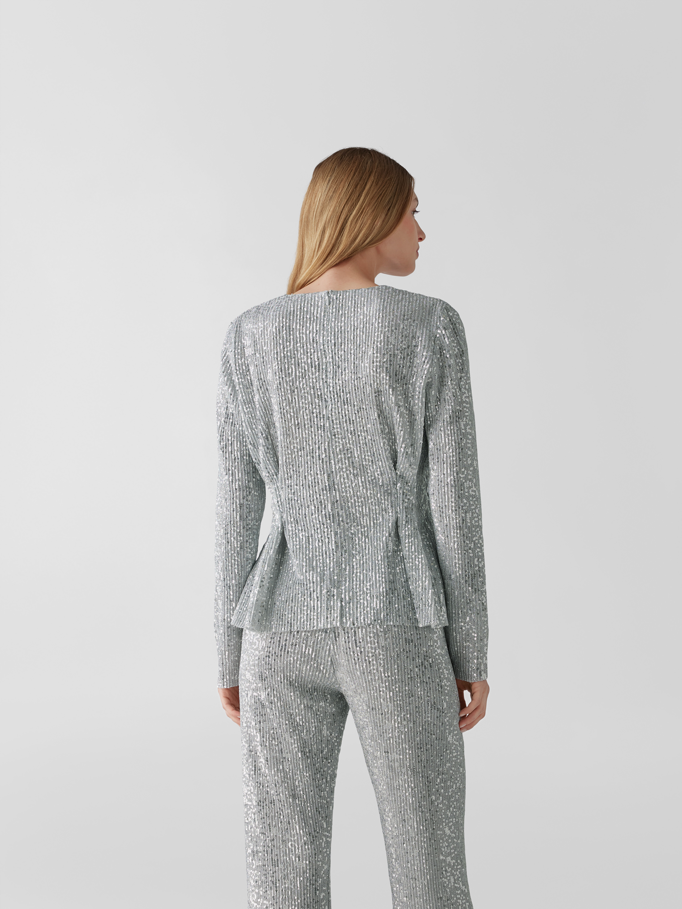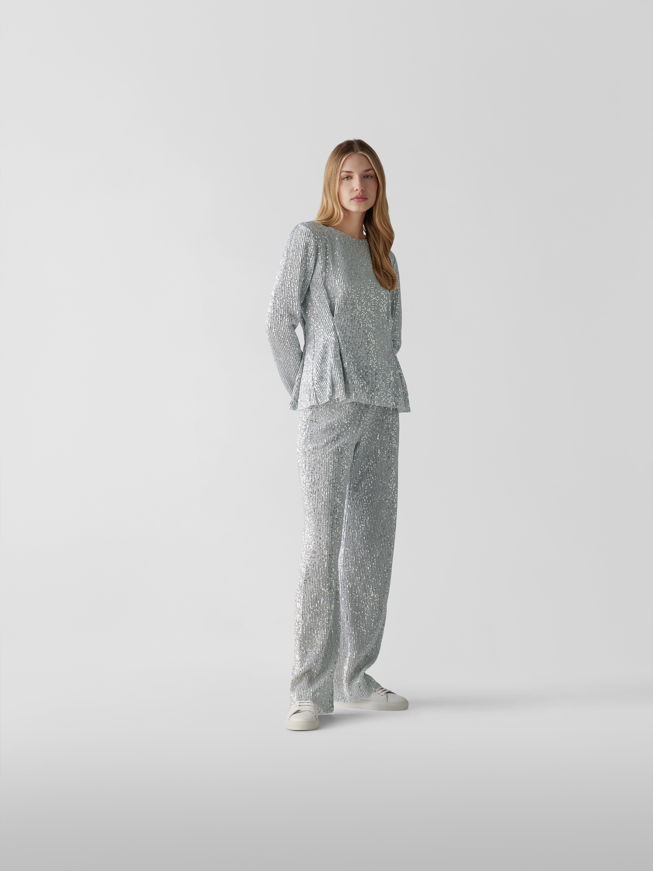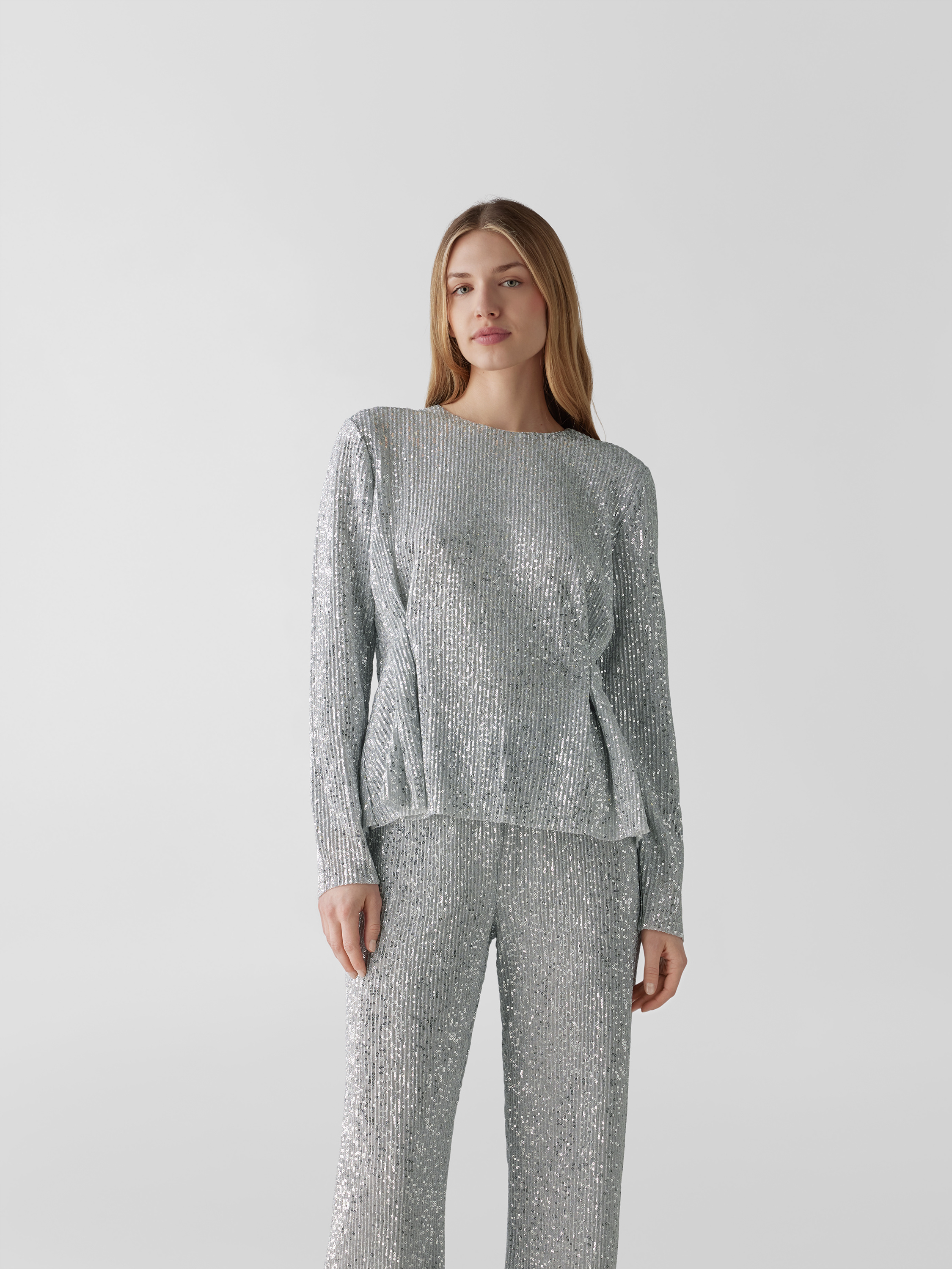 Das Damen Longsleeve von Stine Goya fällt durch das glänzende Material und den auffälligen Paillettenbesatz ins Auge. Die taillierte Form betont die Silhouette, während gelegte Falten und ein Rundhalsausschnitt für eine angenehm feminine Ausstrahlung sorgen. So entsteht ein vielseitig kombinierbares Kleidungsstück.