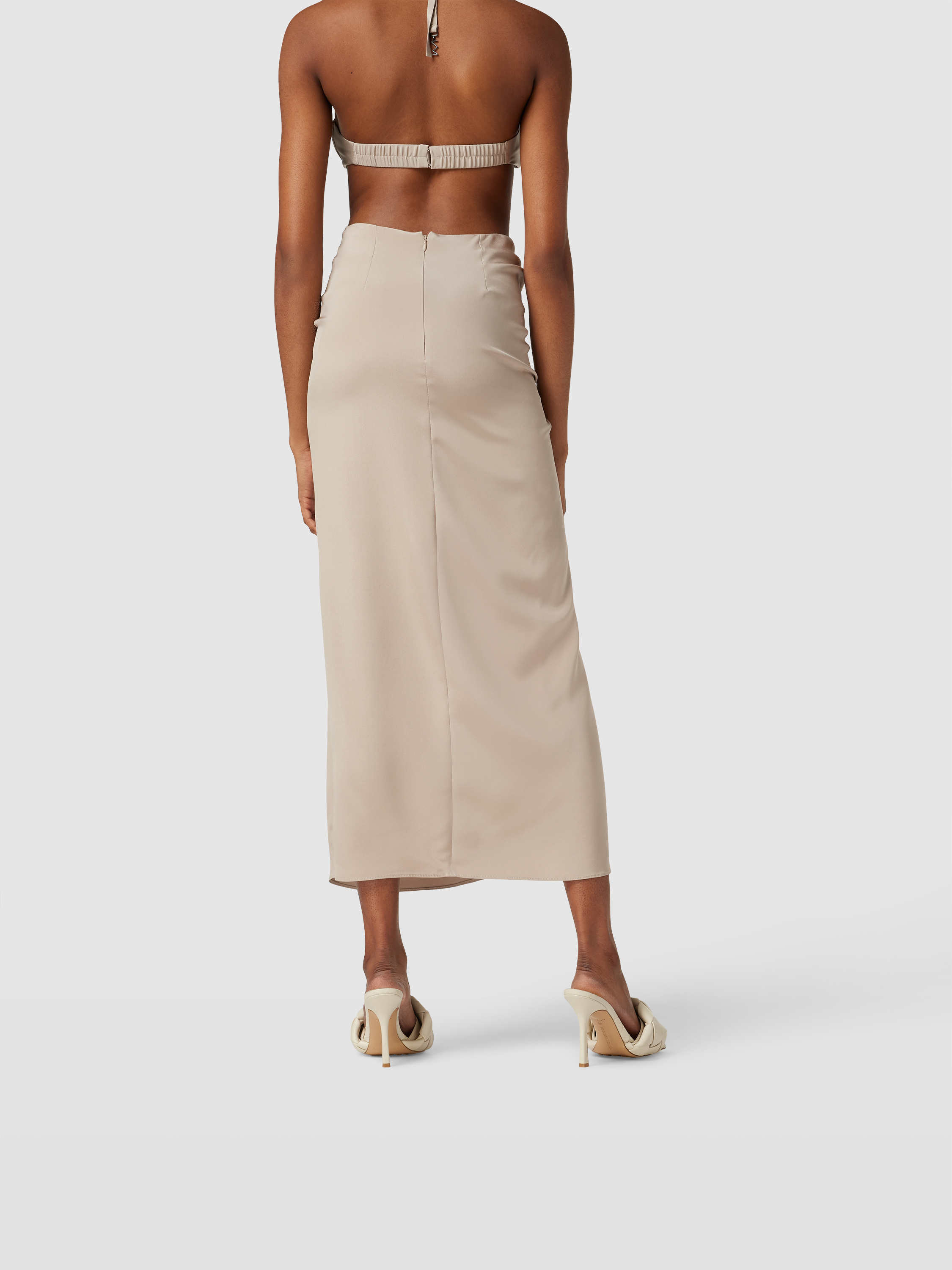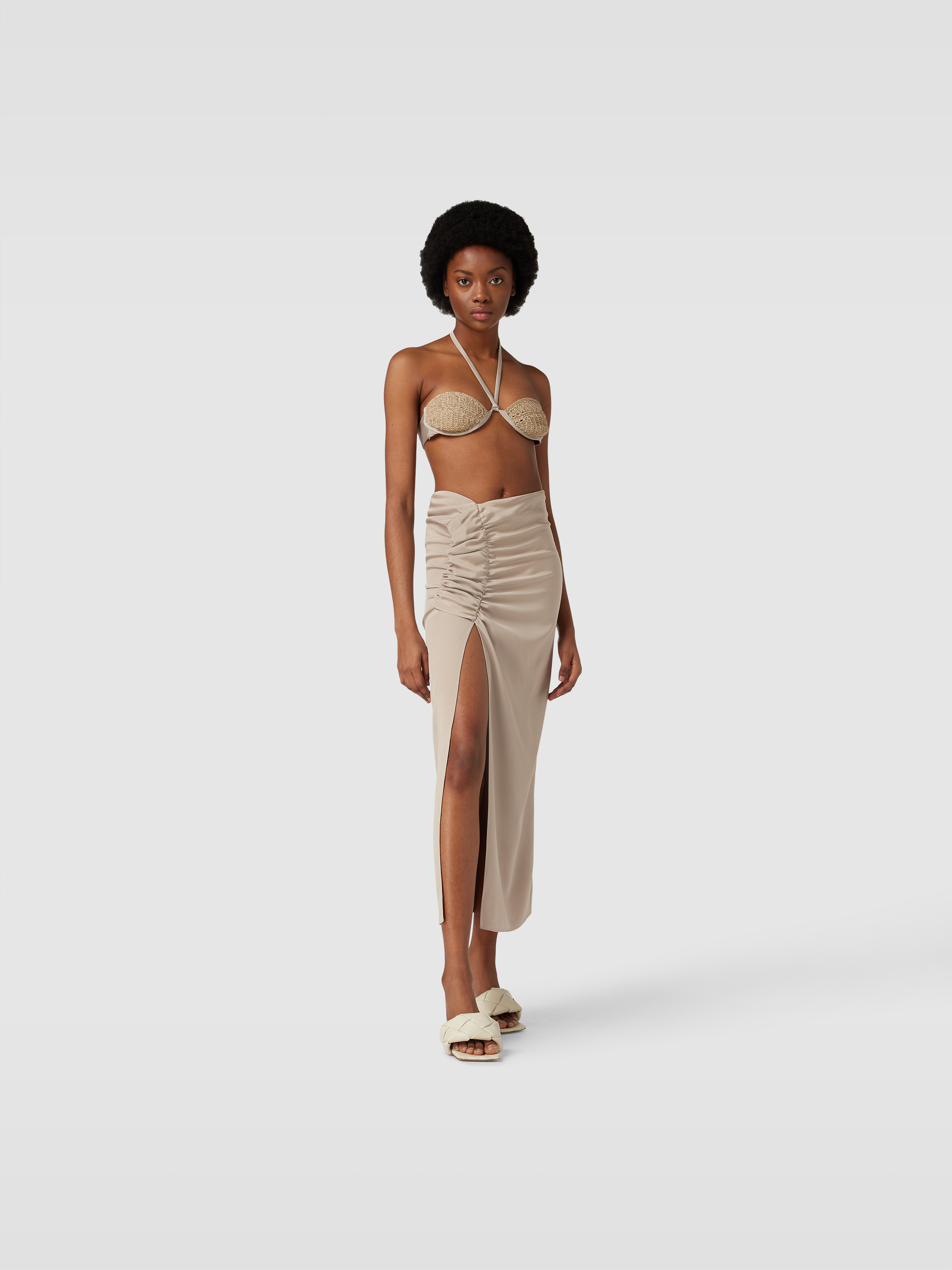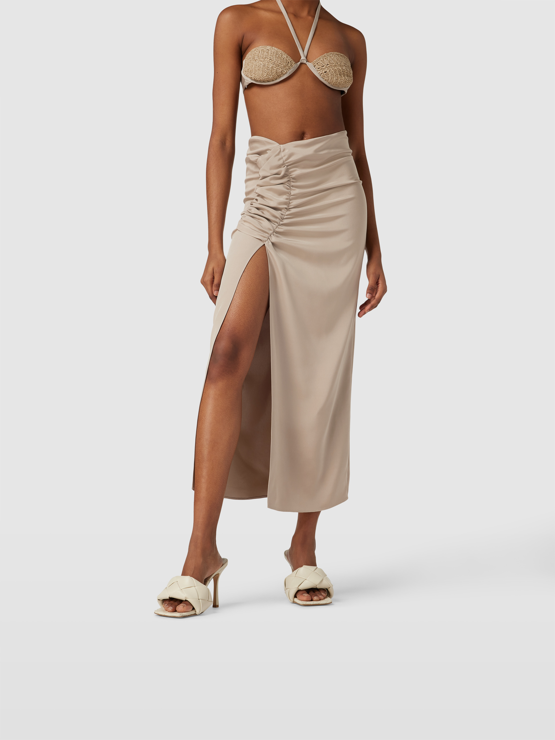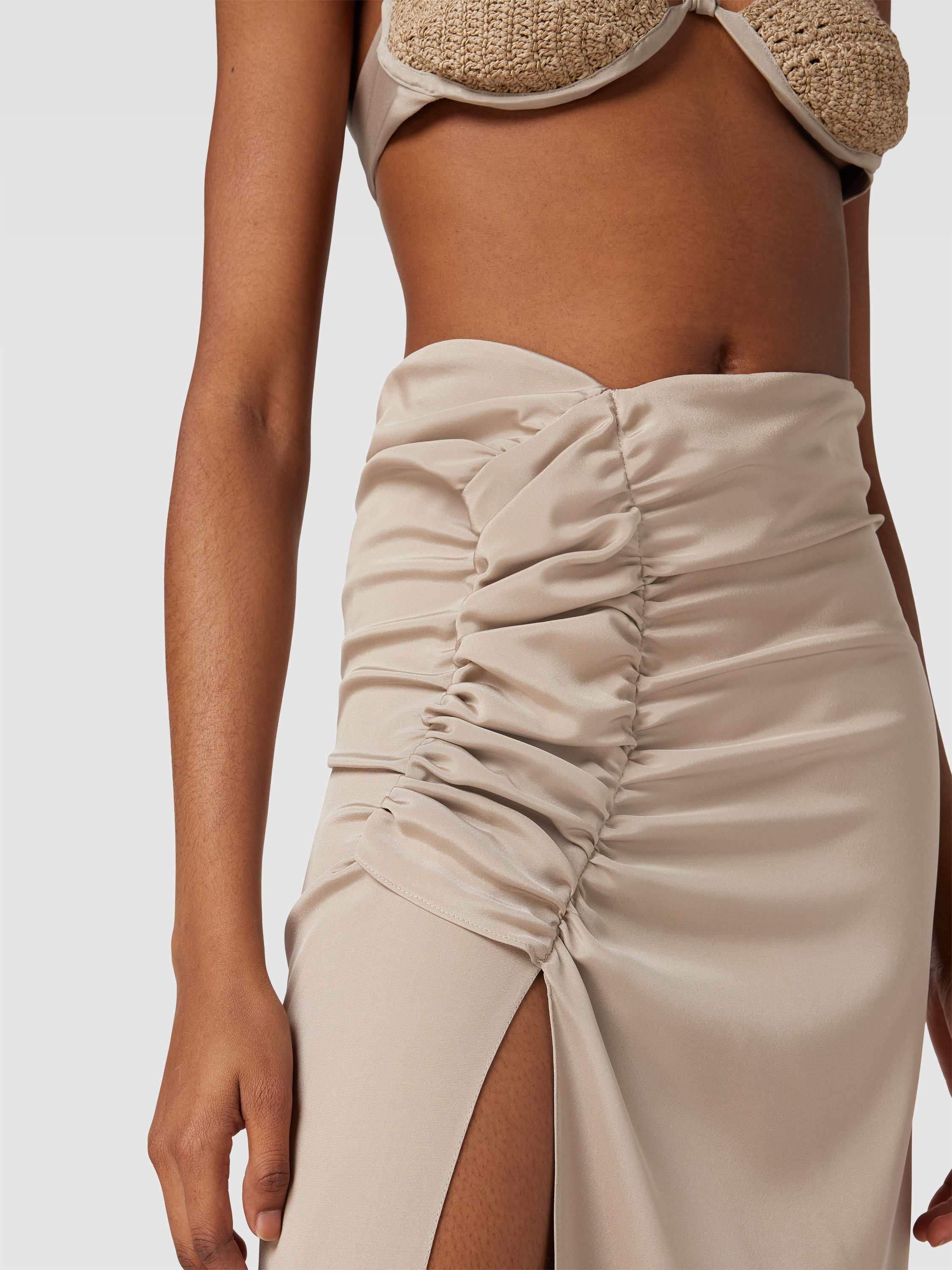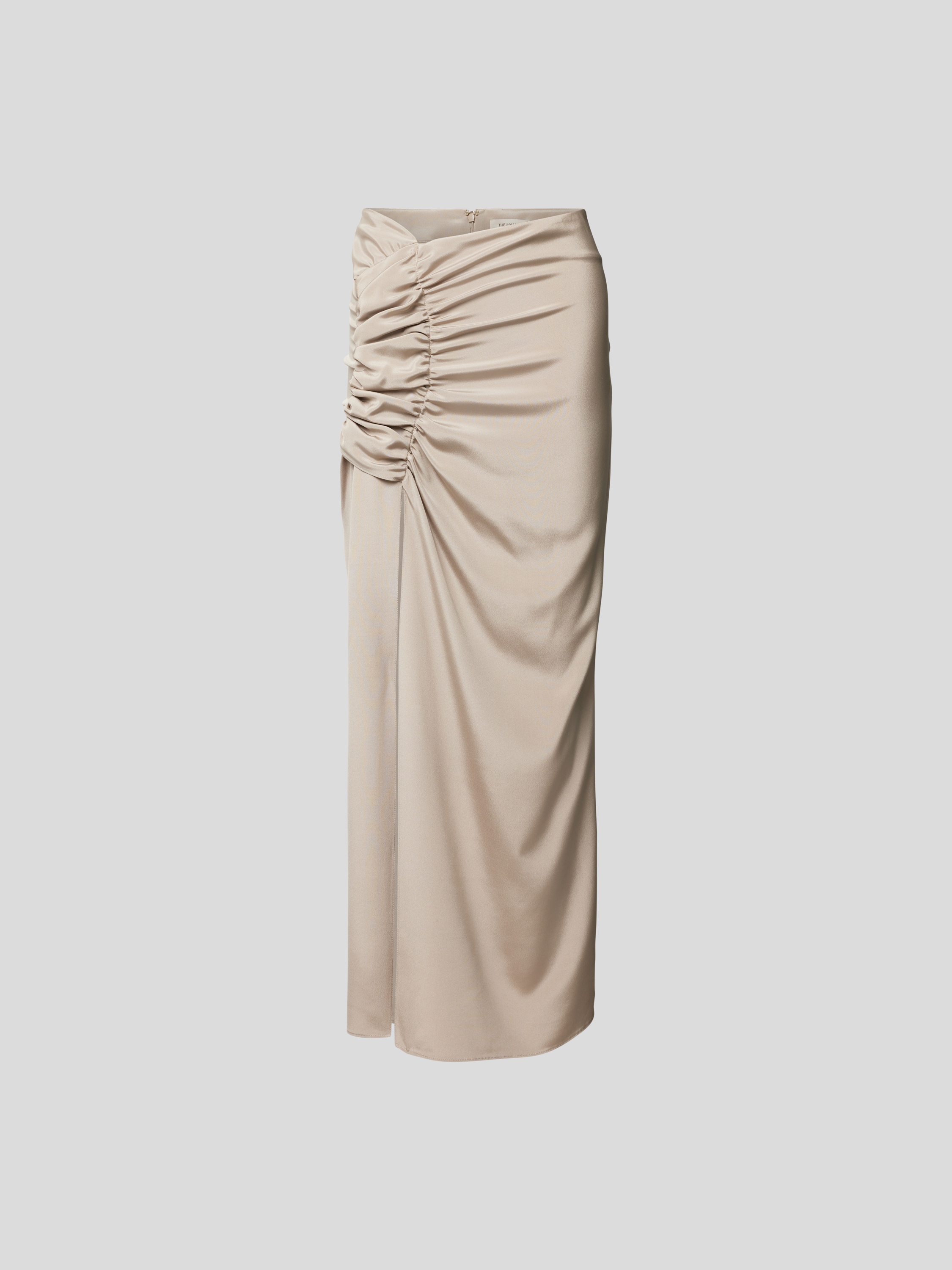 Der Maxirock mit Raffungen von The Mannei legt sich sanft an die Figur und sorgt durch seine Drapierung für eine fließende Silhouette. Das unifarbene Design harmoniert mit verschiedenen Outfits, während die Raffungen feine Akzente setzen. So eignet sich dieses Modell vielseitig für unterschiedliche Anlässe.