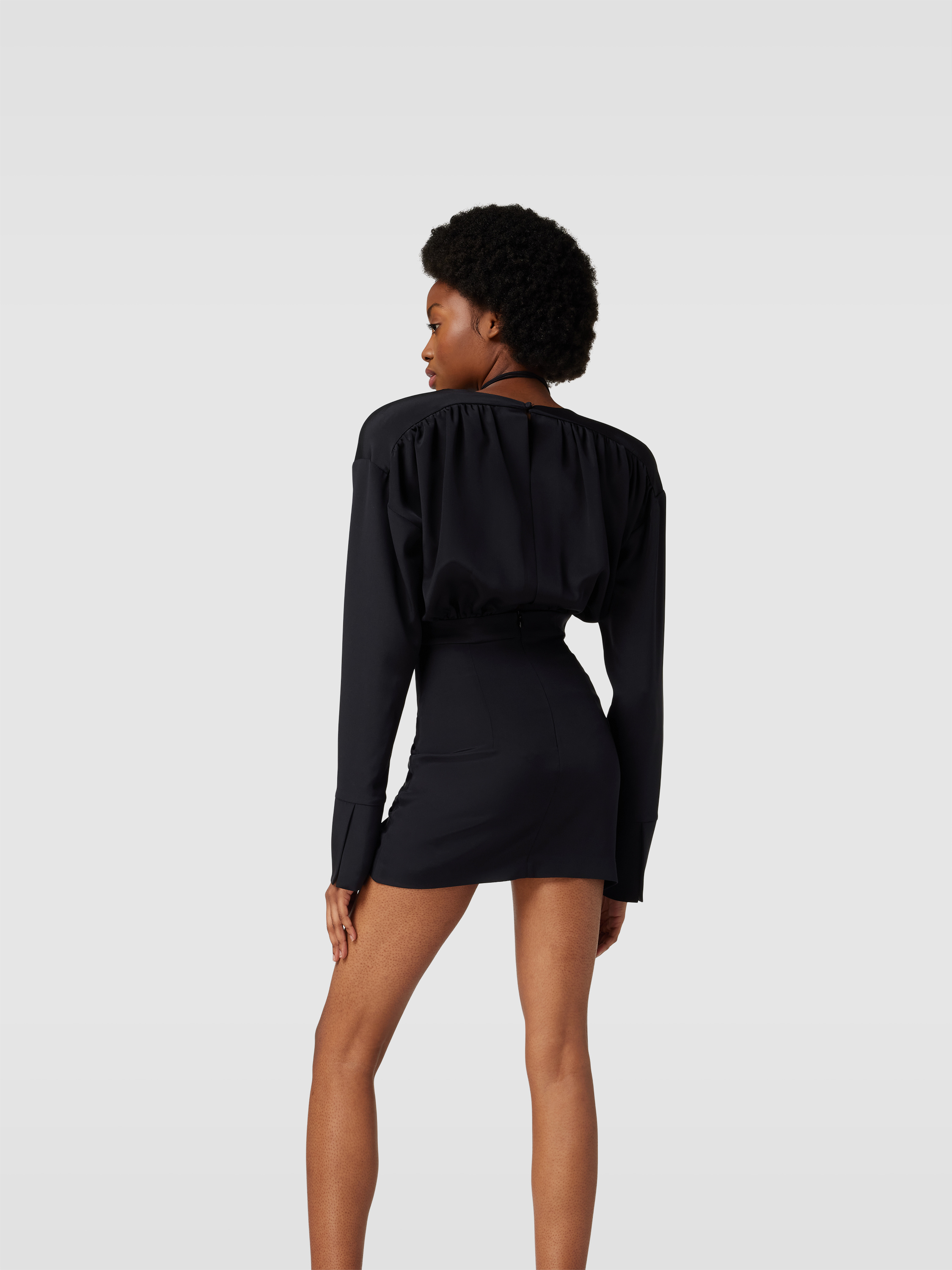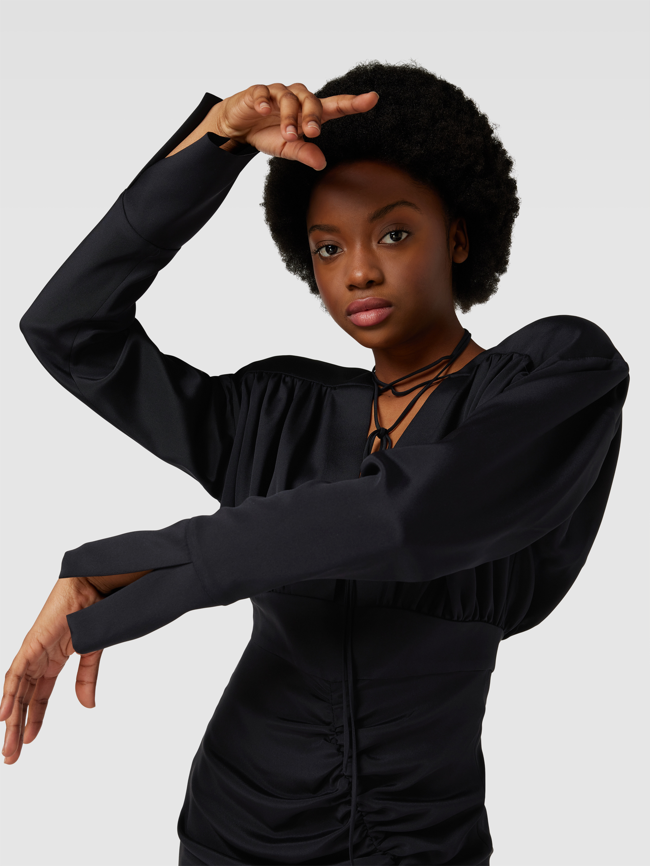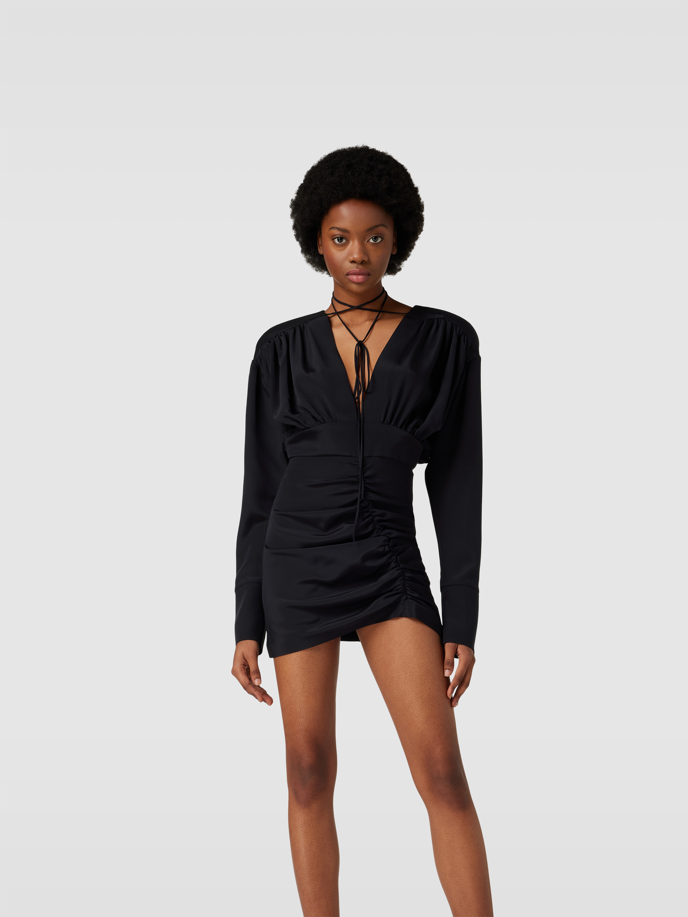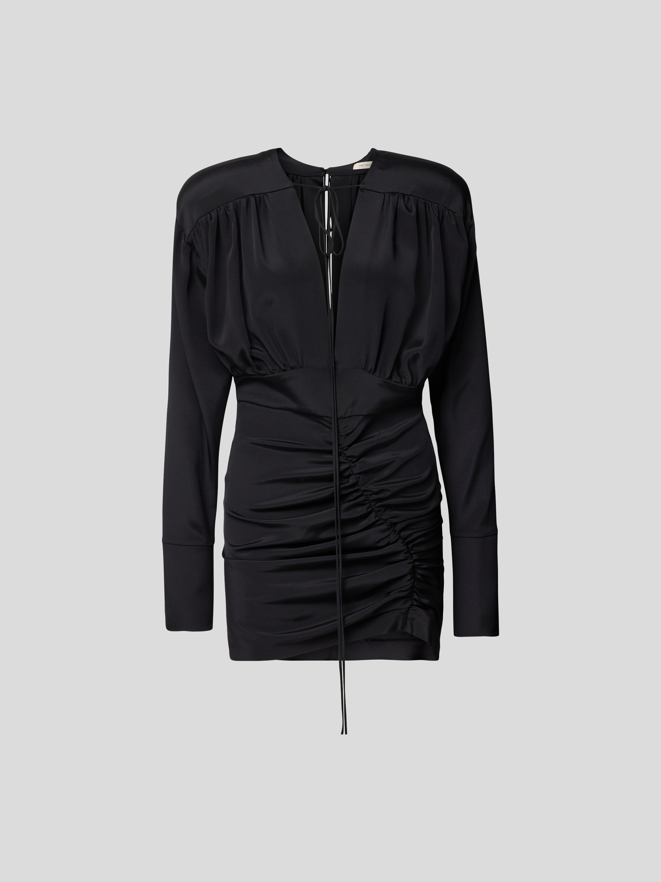 Das Minikleid mit Raffungen von The Mannei kombiniert eine taillierte Silhouette mit weichen Raffungen und einem eleganten V-Ausschnitt. Durch den feinen Seide-Elasthan-Mix fühlt sich das Material angenehm auf der Haut an. Das langärmelige Design eignet sich sowohl für besondere Anlässe als auch für den Alltag.