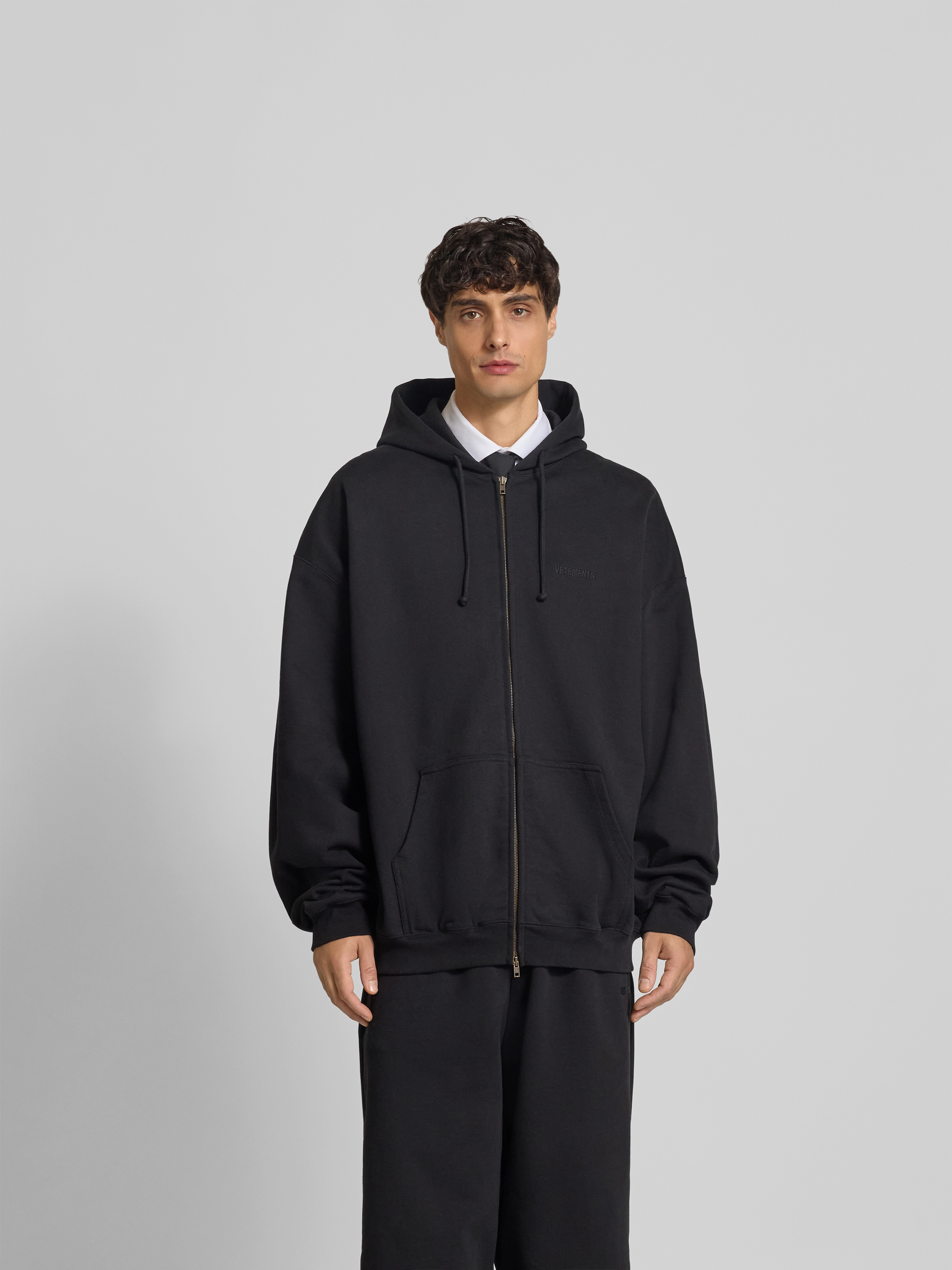 Die Herrenjacke von VETEMENTS fällt durch ihren lockeren Schnitt angenehm auf und eignet sich für entspannte Outfits im Alltag. Dank des Baumwoll-Mix fühlt sie sich weich an und sorgt für ein angenehmes Tragegefühl. Die Oversized Sweatjacke mit Kapuze lässt sich vielseitig kombinieren.
