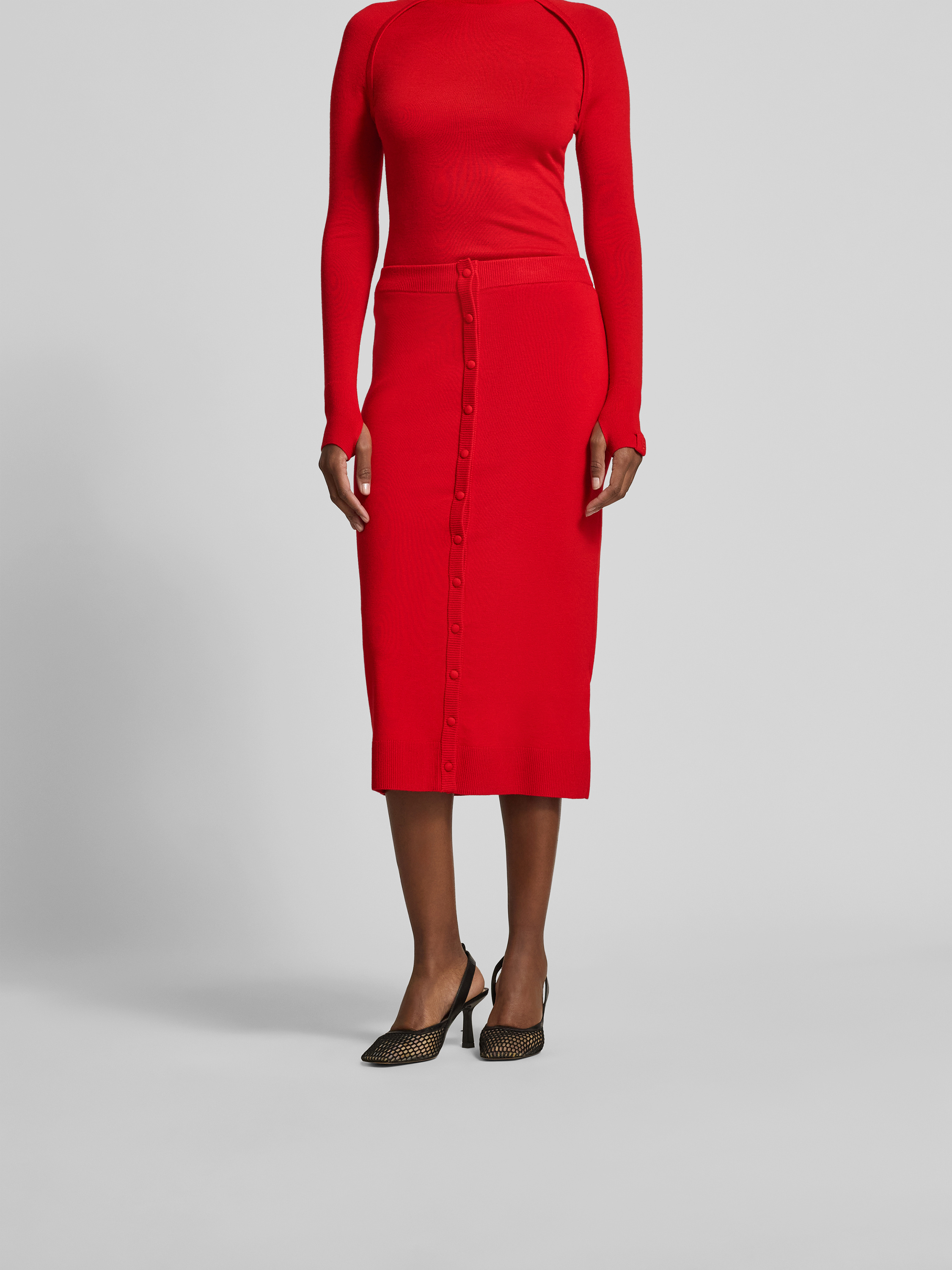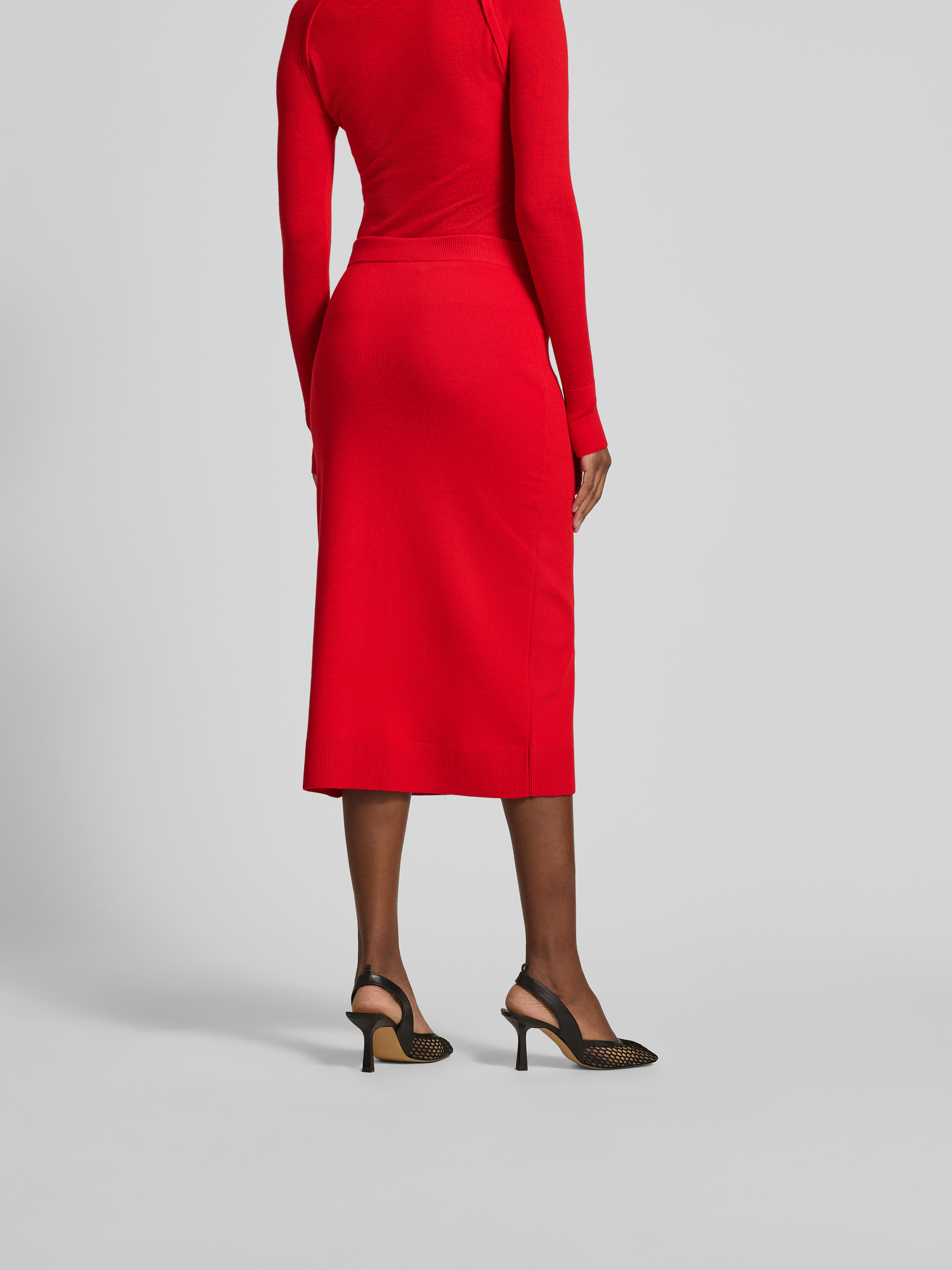 Der Midirock in Strick-Optik von Victoria Beckham aus einem Woll-Mix mit Stretch-Anteil passt sich angenehm der Silhouette an. Durch den lockeren Schnitt entsteht Bewegungsfreiheit, während die charakteristische Strickstruktur für eine moderne Note sorgt. So eignet sich das Modell für vielseitige Kombinationen im Alltag.